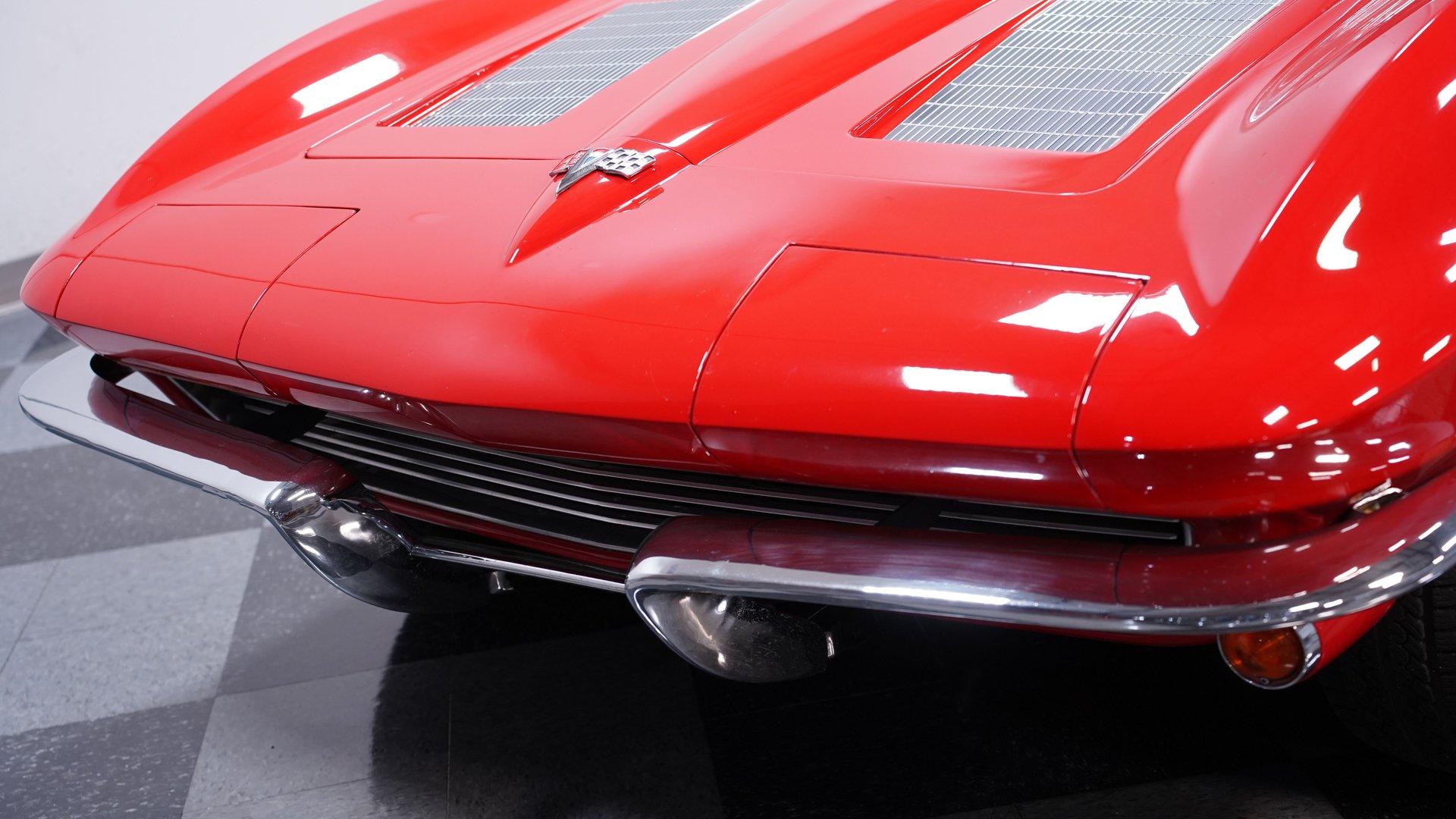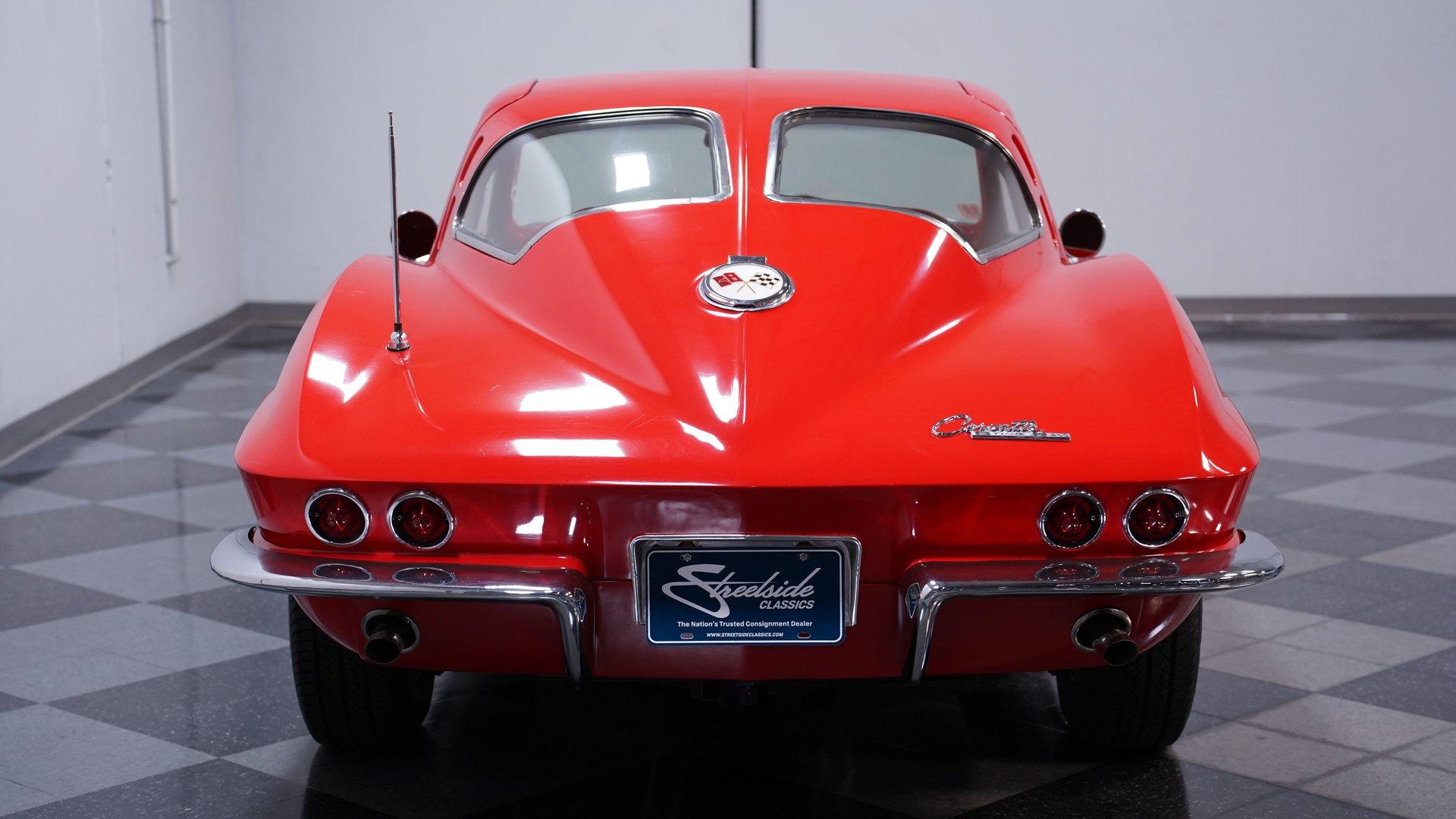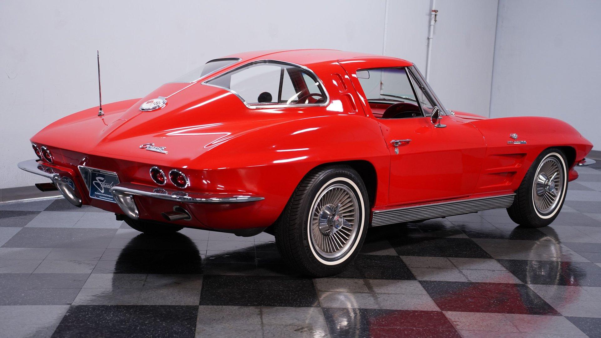 Few cars personify the automotive spirit of the 1960s quite like this numbers-matching 1963 Chevrolet Corvette Fuel Injected Split-Window. Fully repainted in this head-turning Riverside Red, this one-year wonder showcases its sleek hardtop coupe body style like no other C2 in history. Originally born as a carbureted L76, this Split-Window was converted to a fuel-injected L84 using period-correct parts from a donor Fuelie. Inside, we find a fully restored red vinyl interior. A center console separates the dual bucket seats, while a three-spoke steering wheel sits just ahead of the C2 six-pod gauge cluster, featuring a 7,000 rpm tachometer and a 150 mph speedometer. A large analog clock sits high atop the center stack, while an AM/FM head unit handles soundtrack duties. Thanks to the coupe setup, this 'Vette also sports a sizeable cargo area behind the seats, making road trips equal parts practical and fun. Even has a signature on the driver's side visor of famous auto designer, Larry Shinoda. Under that front-hinged hood, we find a clean engine bay housing a numbers-matching 327 cubic-inch V-8. Built by the legendary Jerry Bramlett, this small block features redone heads and a new DeWitt radiator, along with its Fuelie conversion. Also available with the purchase of the car is the original GM Snowflake intake manifold, carburetor, distributor, air cleaner, and hardware. Power is routed through a tried-and-true four-speed manual transmission before heading to the Corvette rear end, which transfers those ponies to the pavement. HIGHLIGHTS: Numbers Matching 327 CID V8 Jerry Bramlett Built Motor Converted L84 Rochester Fuel Injection Redone Heads DeWitt Radiator Dual Exhaust Four Speed Manual Red Vinyl Interior AM/FM Radio Power Windows Heat Original Carb Setup Included GM Snowflake Intake Included Driver's Side Visor Signed by Larry Shinoda This 1963 Chevrolet Corvette Fuel Injected Split-Window rides on a factory-style suspension, while classic drum brakes stand ready to rein in speed whenever called upon. If you've been looking for one of the most sought-after C2 models in history, then this numbers-matching Split-Window is exactly what you've been waiting for. But don't wait, call today!