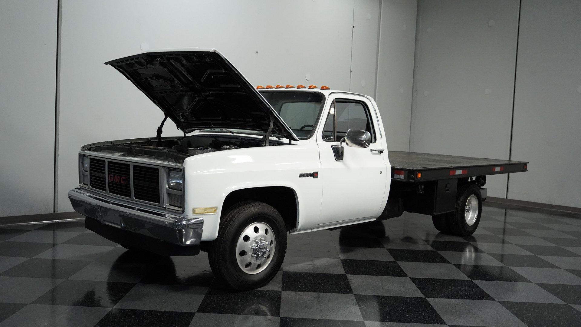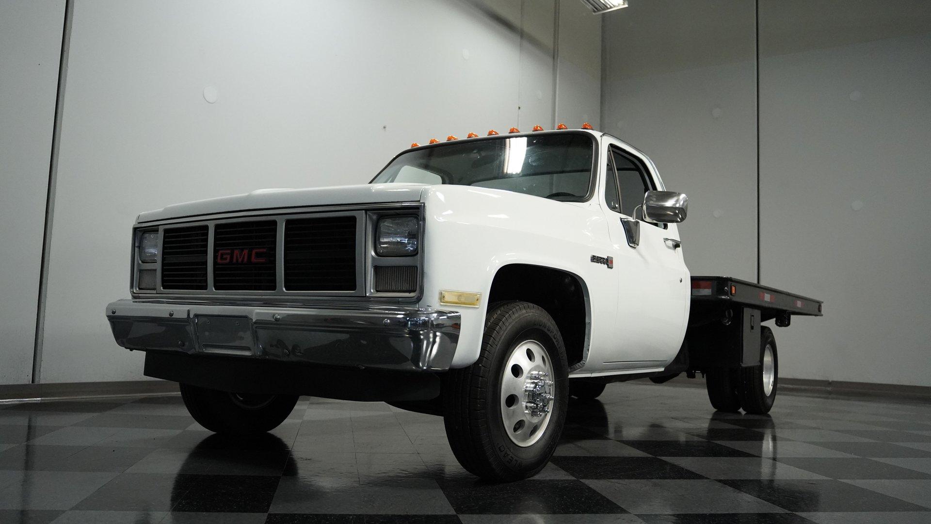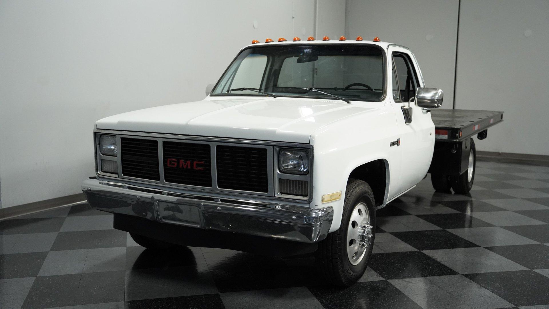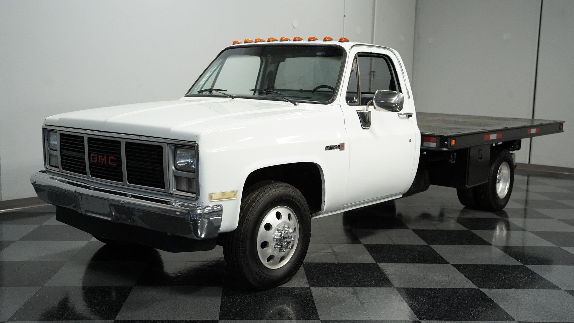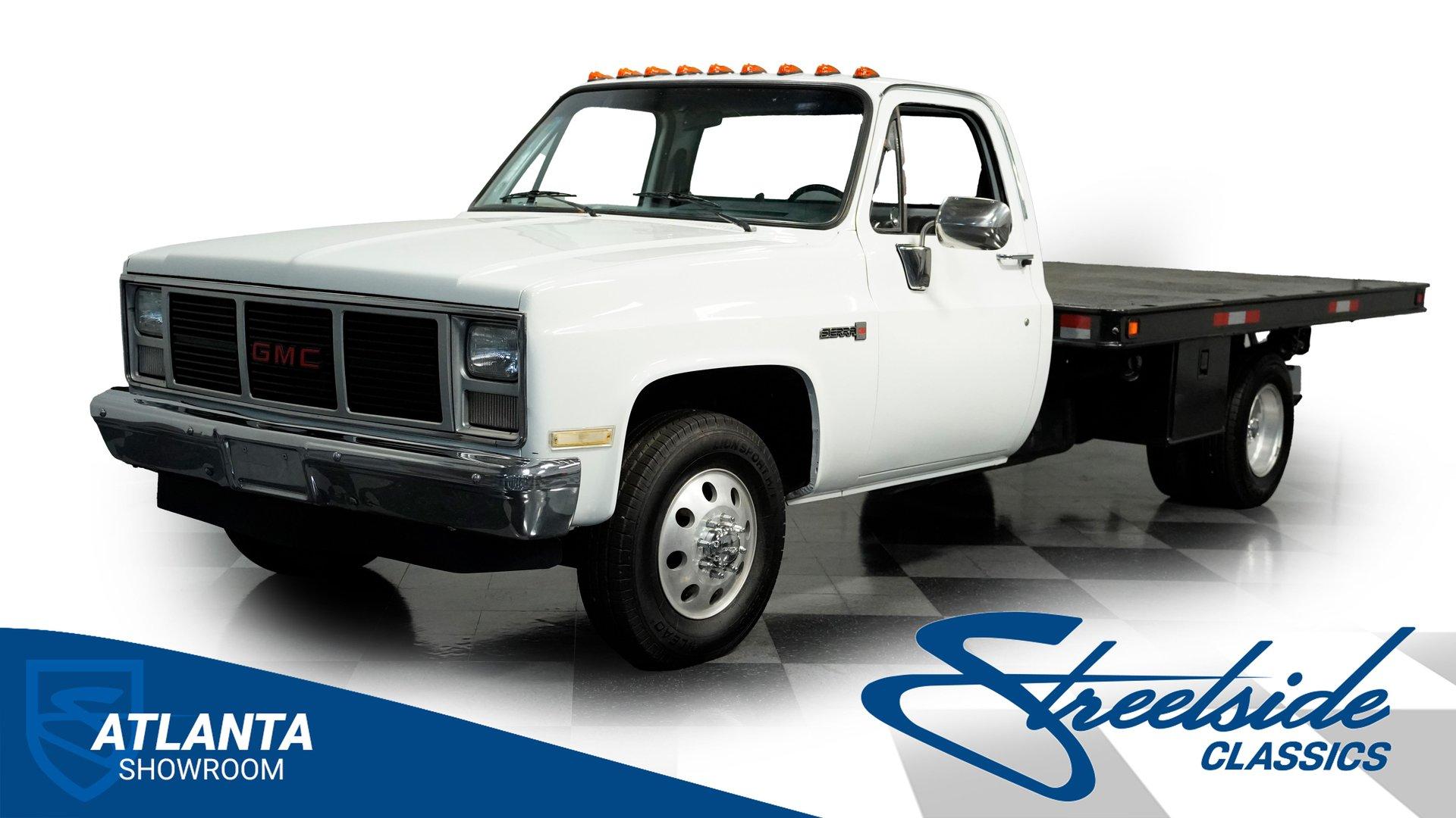Engineered for serious work capacity, this 1985 GMC 3500 Flatbed Dually stands ready in clean white paint that accentuates its muscular stance. This commercial hauler has been repainted white, giving it a classic, utilitarian appearance. The flatbed configuration maximizes cargo space while the dual rear wheels provide superior load stability. Chrome and brightwork remain in excellent condition throughout, complementing the no-nonsense exterior aesthetics. The 16-inch wheels maintain the truck's heavy-duty character, wrapped in 215/85R16 tires that support its substantial hauling capabilities. Inside the cabin, the charcoal vinyl interior offers straightforward functionality with a column-shifted layout. The bench seat provides ample space for occupants while maintaining easy access to all controls. Door panels display good condition throughout, matched by clear, functional gauges across the dash. The steering wheel shows minimal signs of use consistent with its age. This truck prioritizes utility with its stripped-down approach - no radio distractions, just the essential controls for the job at hand. Power steering adds crucial maneuverability to this substantial work vehicle. Mechanical prowess comes from the factory-optioned 5.7 Liter V8 engine, delivering reliable power through a TH400 3-speed automatic transmission. The powertrain benefits from an Edelbrock single 4-barrel carburetor for improved performance and throttle response. Front power disc brakes provide solid stopping ability, working in conjunction with power brakes for confident operation under load. The suspension utilizes coil springs with shocks up front and heavy-duty leaf springs with shocks in the rear, perfectly tuned for maintaining stability when carrying significant payloads. HIGHLIGHTS: 5.7 Liter V8 Engine 3 Speed Automatic Transmission (TH400) 4 Barrel Edelbrock Carburetor Front Power Disc Brakes Dual to Single Exhaust Aftermarket Muffler Stock Style Manifold 14 Bolt Dually Rear End Coil Spring Front Suspension with Shocks Leaf Spring Rear Suspension with Shocks White Paint 16" Wheels in 215/85R16 Tires Dual Rear Wheels Flatbed Configuration Good Condition Chrome & Brightwork Charcoal Interior with Bench Seat Column Shift Power Steering 5-Digit Odometer Good Condition Door Panels Clear, Functional Gauges Built for real-world capability, this 1985 GMC 3500 Flatbed combines the legendary reliability of its 5.7 Liter V8 with the practical versatility of a flatbed design. The dually configuration amplifies hauling potential while the white exterior presents a clean, professional appearance. Call today!