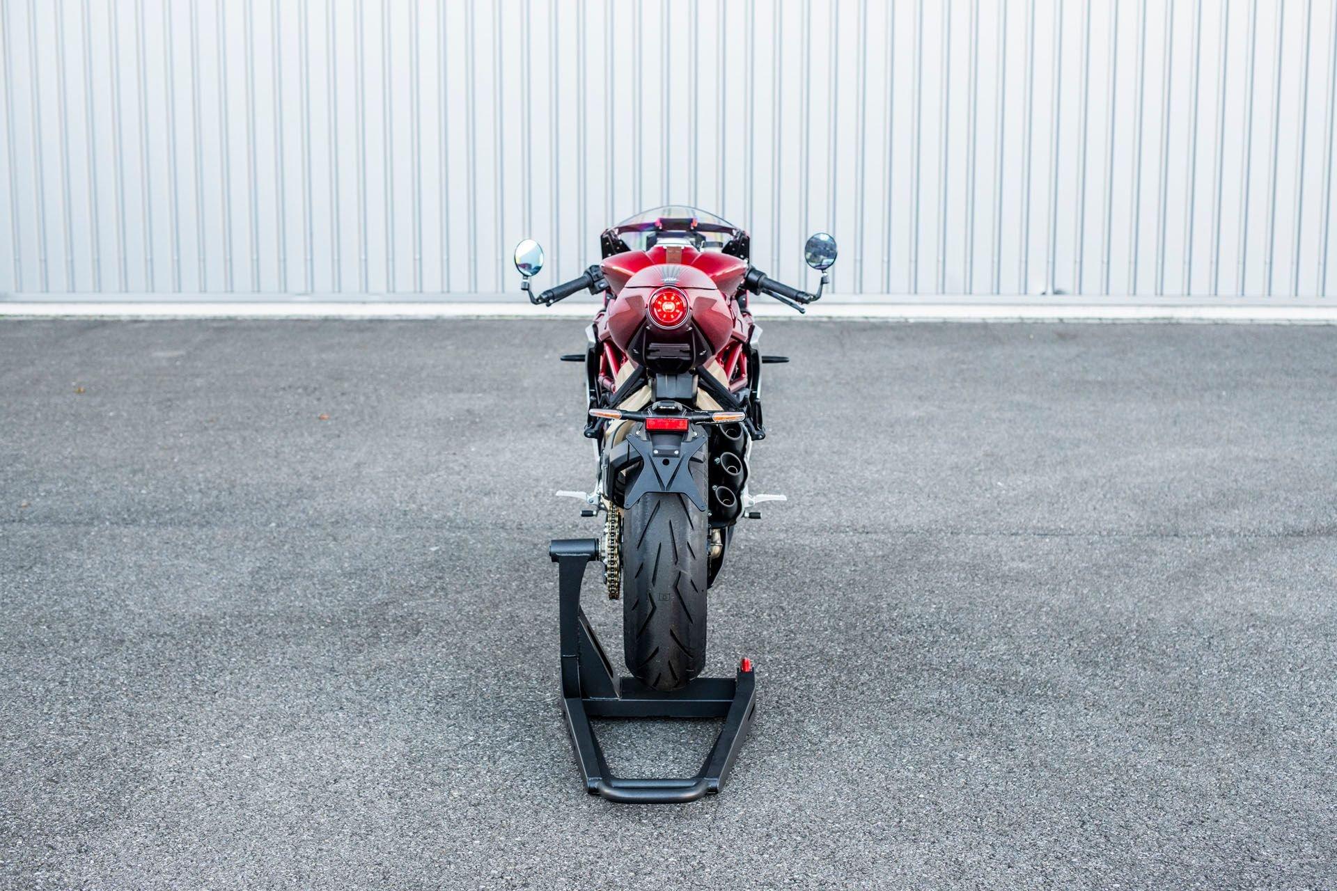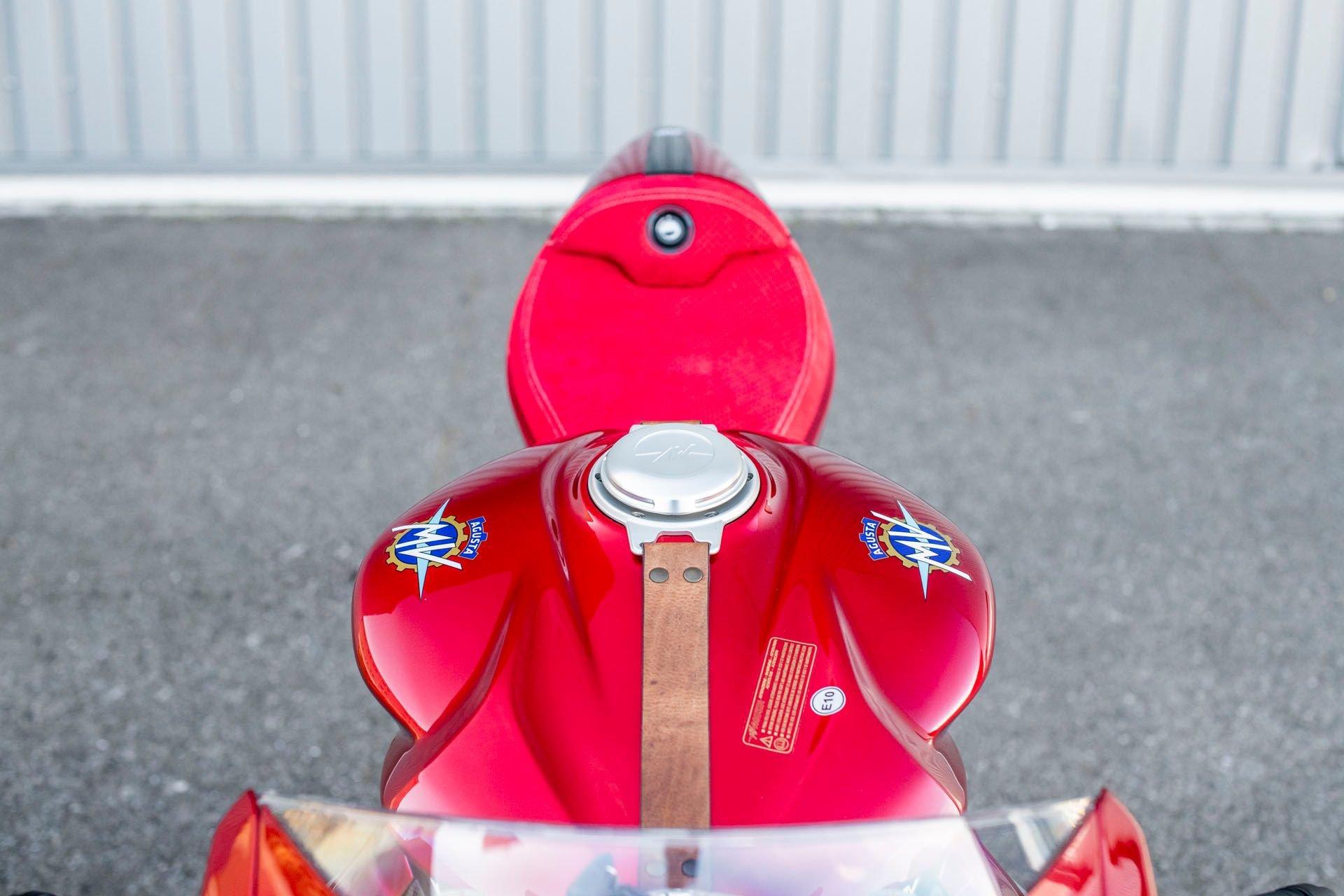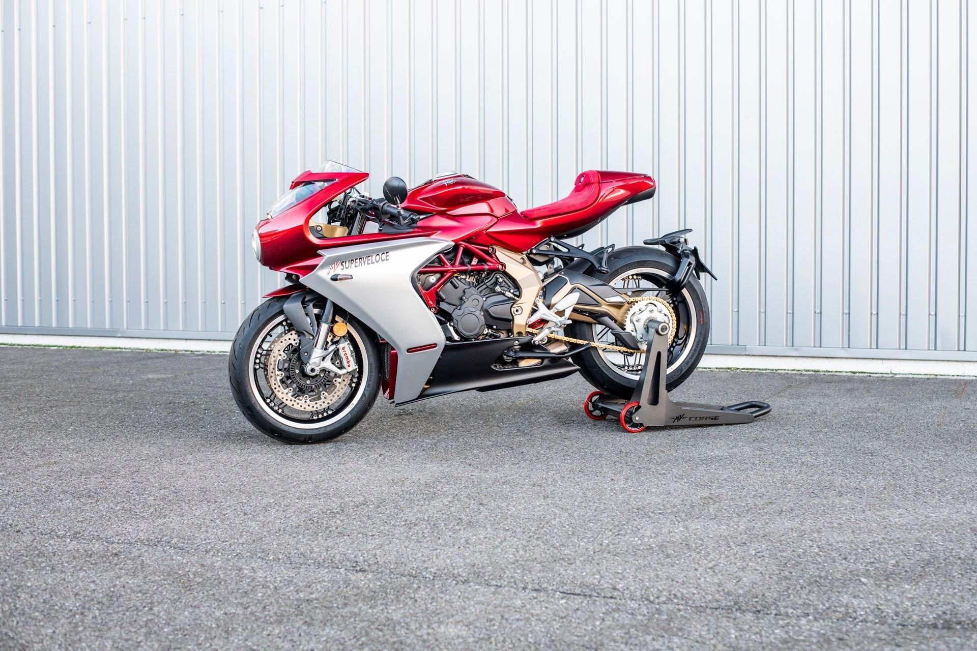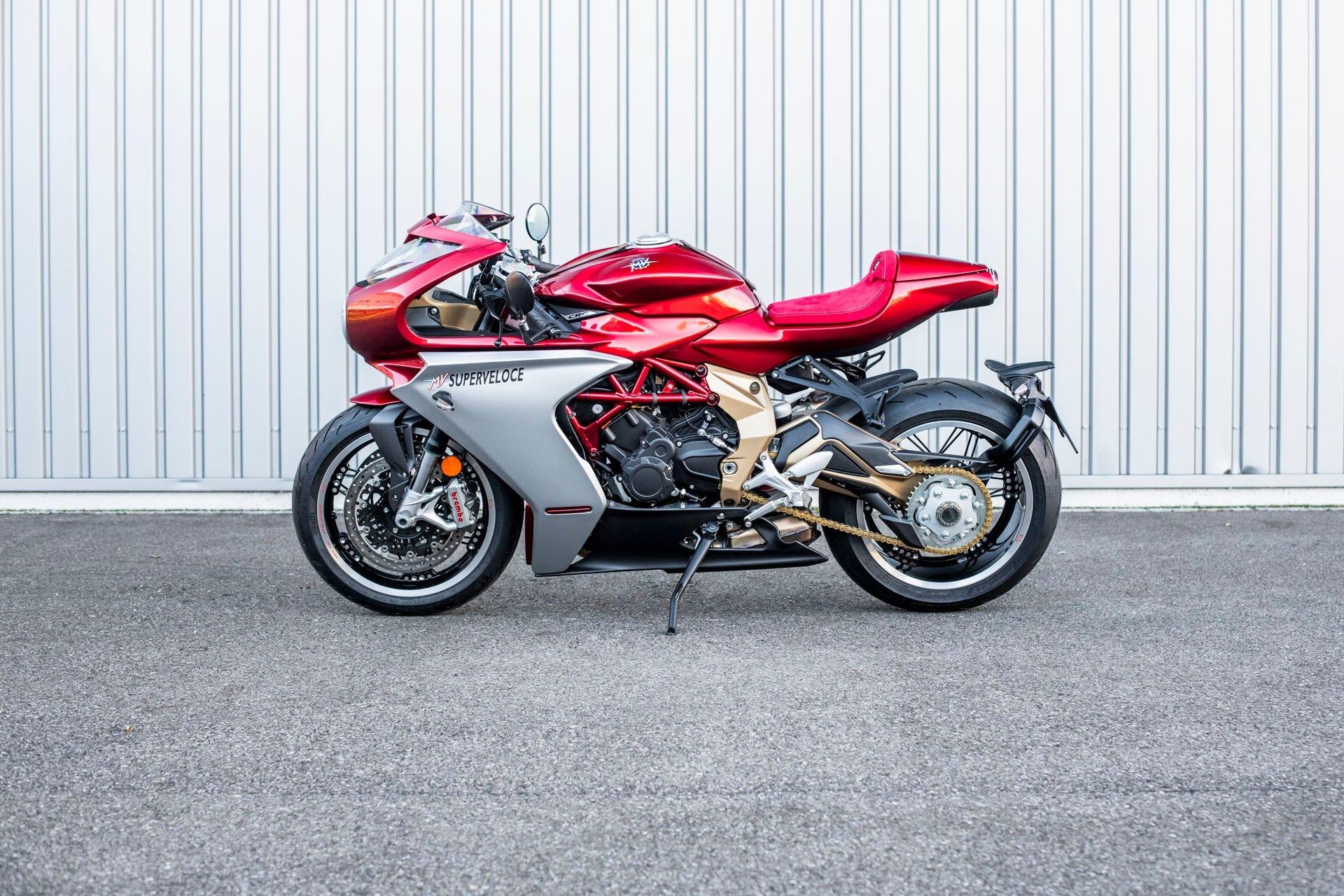 Serie Oro No. 118/300 Unveiled at the Esposizione Internazionale Ciclo Motociclo e Accessori (EICMA) in 2018 as a prototype, the MV Agusta Superveloce 800, inspired by the world of racing, embodied pure technology and elegance, igniting passion among enthusiasts. Few concessions were made to the prototype in order to create a road-legal version—fewer still for the exclusive Serie Oro edition. With a heritage spanning over a century, MV Agusta draws on its extensive experience in world championship racing, where it has secured numerous victories and podium finishes. The brand continues to produce premium sport bikes dubbed “Motorcycle Art,” maintaining a relentless focus on innovation and craftsmanship. Technically derived from the F3 800, MV Agusta’s most competitive model for the 2020 model year, the Superveloce 800 retains the F3’s single-sided swingarm, suspension, and engine, while asserting a distinct identity through its evocative design. Its chassis is composed of a steel tubular trellis frame elegantly paired with two aluminum side plates. It features a 43- mm inverted front fork and monobloc radial brake calipers. At its heart lies a three-cylinder, four-stroke, 800-cc fuel-injected engine delivering 148 horsepower, mated to a six-speed manual gearbox with a quickshifter. Already exceptional in its standard form, the Superveloce 800 is elevated even further by the highly exclusive Serie Oro edition, limited to just 300 units. This particular example, number 118, delivered new in November 2020, in Switzerland through Shamal Garage in Münchenstein, is finished in Ago Red over Ago Silver and presented in near-new condition with only 22 km on the odometer. Its original warranty booklet, which accompanies the bike, shows that it was acquired by the current owner in July 2022 from Niki Hasler AG. It underwent servicing in 2023 by Shamal Garage, when it already showed its current mileage of 22 km, and again in October 2025 by Möri Sport AG before being exhibited at the Zurich Auto Show. The Oro distinguishes itself through a series of refined and distinctive details: beautiful wire-spoke wheels, gold-finished aluminum frame plates and single-sided swingarm, and a striking SC Project exhaust system. The fuel tank is elegantly crossed by a leather strap, while the seat is trimmed in perforated Alcantara. Extensive use of carbon fiber underscores its exclusivity, with components such as the fairing side panels, front and rear mudguards, undertray, windscreen mount, chain guards, engine sump guard, air intake ducts, and belt covers all crafted from the lightweight material. In terms of instrumentation and rider aids, the Superveloce 800 Oro features a five-inch full-color TFT display with Bluetooth connectivity. This allows the rider to pair a smartphone and manage calls, messages, and music directly via the MV Ride app. The app also provides access to adjust the electronic riding aids from the smartphone itself. A built-in GPS module is included as well, offering both navigation and additional control functionalities. As for rider assistance systems, the bike offers four riding modes, one of which is fully customizable. An eight-level traction control system, fully disengageable, is included, along with a bidirectional quickshifter (Up & Down), cruise control, and a two-mode ABS system featuring rear-wheel lift mitigation. The model stays true to the very spirit of MV Agusta, embodying the key features of its most competitive editions while boasting a timeless yet distinctly unique retro racer aesthetic. Presented as nearly new, with only 22 kilometers on the odometer, accompanied by Swiss registration and numerous delivery items, this highly collectible piece of Motorcycle Art from MV Agusta is ready to find its place with the most discerning enthusiast—whether to be ridden or preserved in pristine condition.