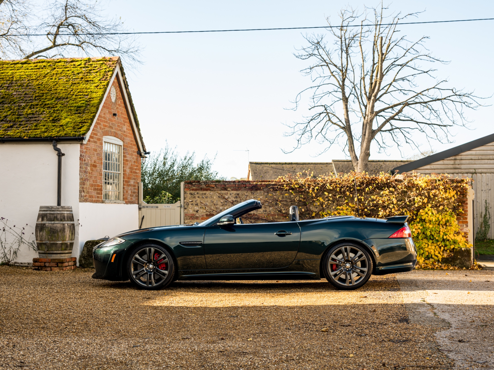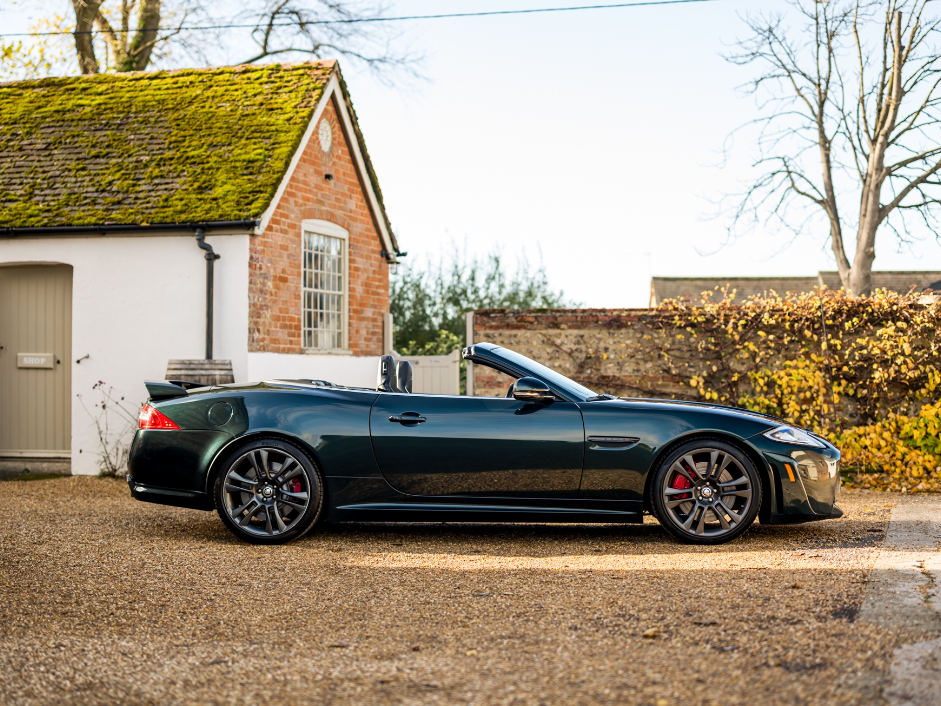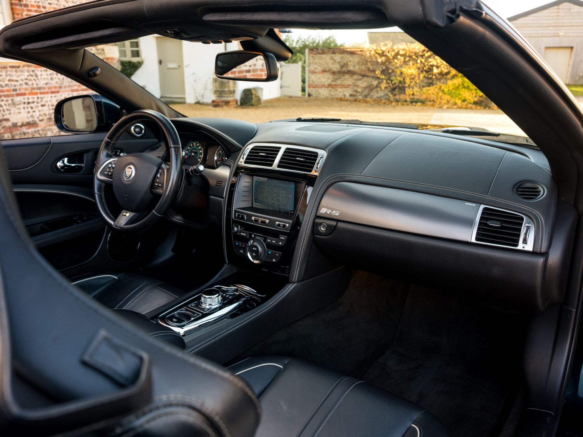 Jaguar XK R-S Cabriolet, Supercharged 5L V8, LHD, first delivered by Jaguar Land Rover North America in June 2012 and recently registered in the UK. Presented in the iconic colour combination of British Racing Green over Warm Charcoal. Features include carbon fibre/leather seats, R-S spoiler & body kit, red brake callipers, R performance brakes, rear view camera, performance active exhaust, heated front seats and R-S body styling throughout. Currently showing 21,381 miles and last serviced in September 2024 to include a major service with all new brake discs. This car has been extremely well maintained throughout its life and is presented in wonderful condition, ready to be enjoyed by its new owner.