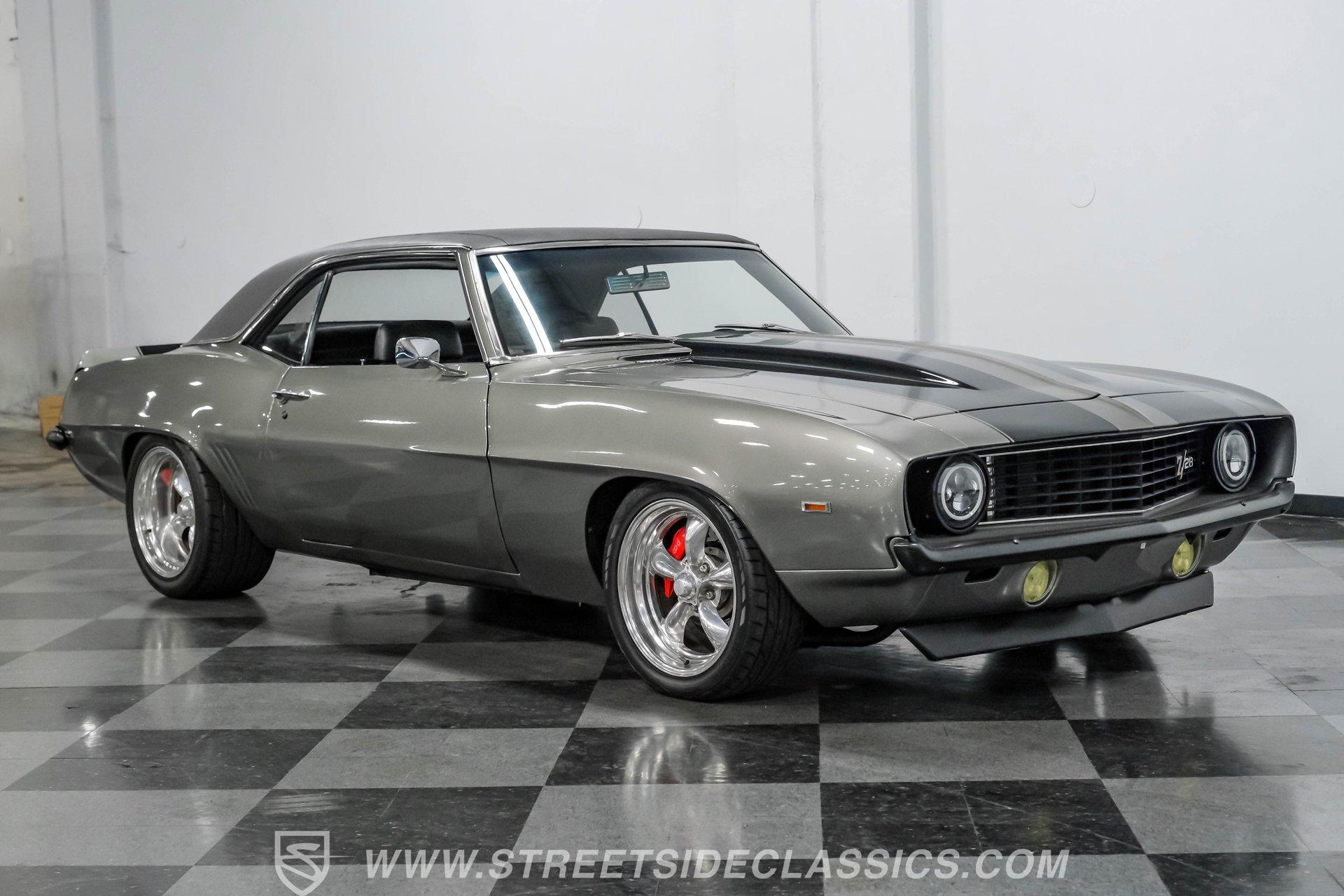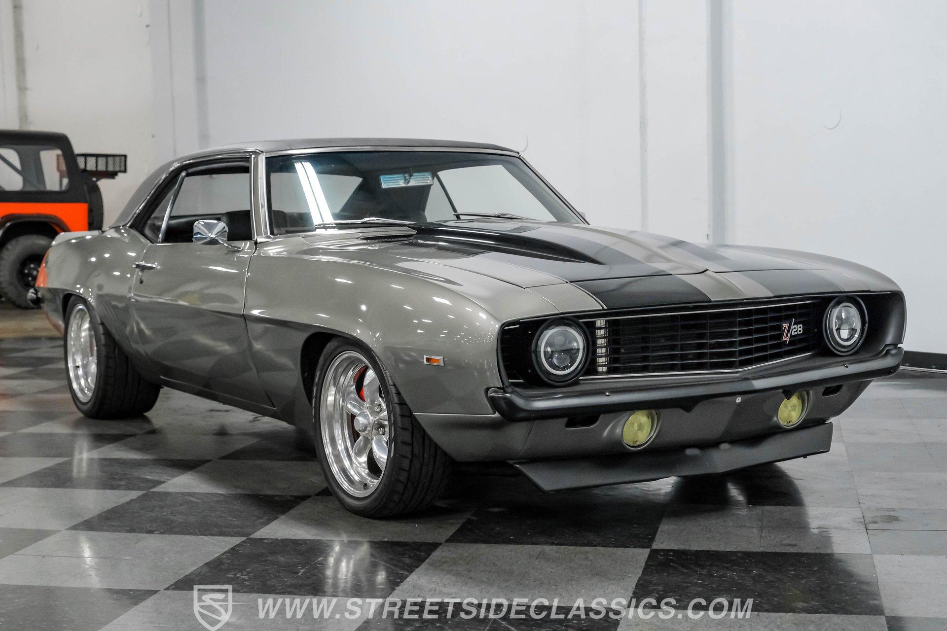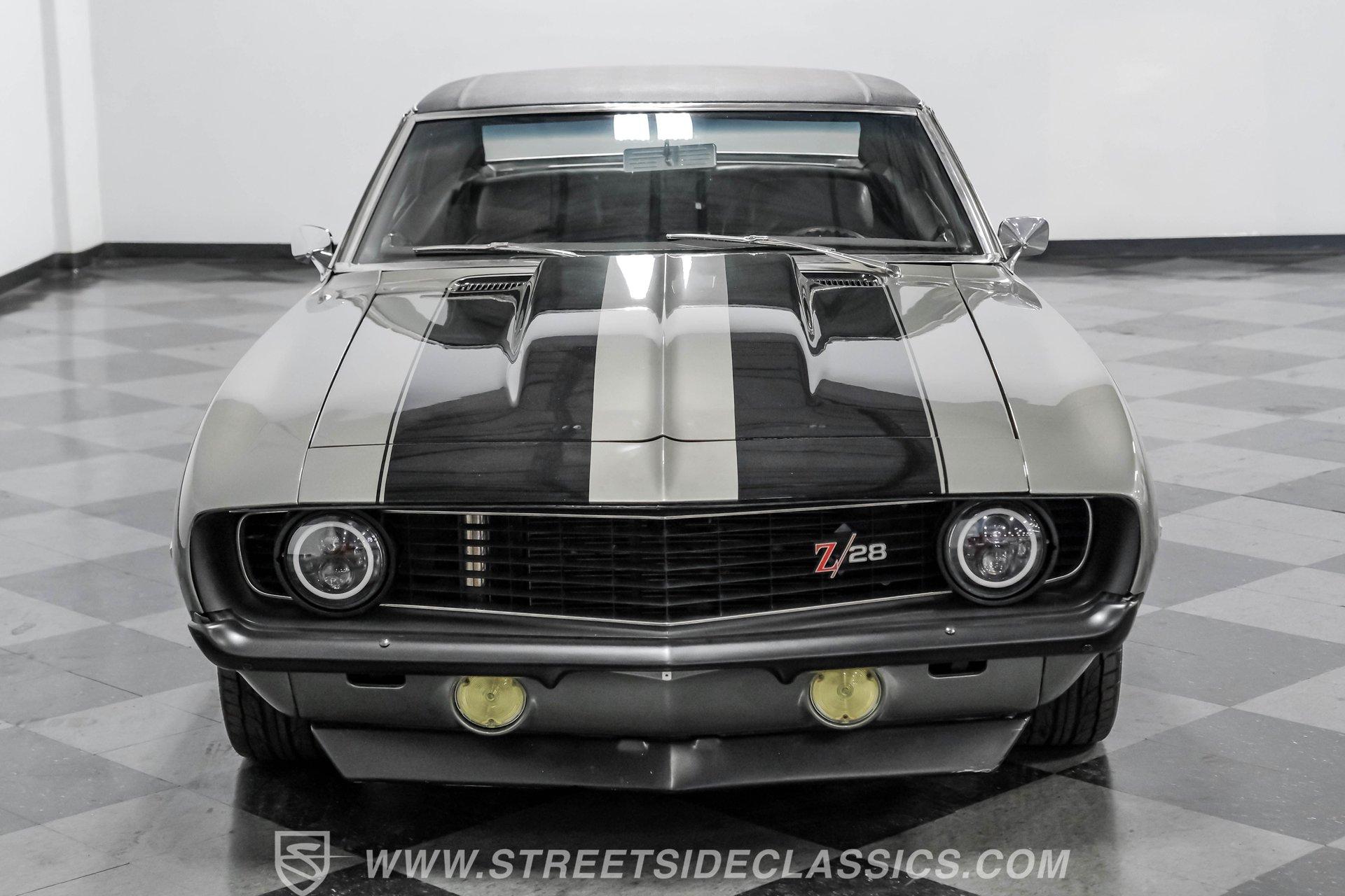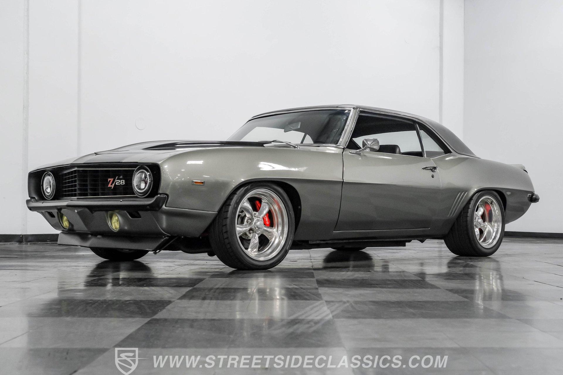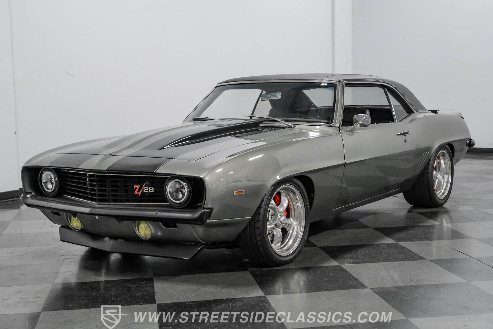 In terms of banner years, 1969 stands out as one of the most exciting in American history. The moon landing, Woodstock, and cars like this 1969 Chevrolet Camaro Z/28 Restomod Tribute all serve as proof of just how memorable this year was. This Camaro is nothing short of stunning in its gray-and-black motif. With its cowl-induction hood, Z/28 badging, and decklid spoiler, this pony car looks ready to gallop from any angle. Inside, we find a nicely redone black vinyl interior. A center console separates a pair of bucket seats equipped with headrests. A beautiful Custom Billet woodgrain steering wheel and matching console trim add the perfect amount of contrast, while ahead of the wheel sits a set of AutoMeter Super-Comp gauges featuring a 120 mph speedometer and 8,000 rpm tachometer mounted in a custom housing. A Sniper EFI controller/monitor fills the entertainment hole left by the radio delete, along with the Billet cueball-style shifter. Under the hood, despite the 427 Chevrolet valve covers, we actually find a larger 454 cubic-inch overhead-valve V-8 engine. Topped with lightweight Brodix aluminum heads and outfitted with a performance camshaft, this big block expels spent gases through a set of long-tube headers and ultimately out through an H-pipe dual exhaust. Power is routed through a modern Tremec T56 six-speed manual transmission before being sent out to the stout nine-inch rear end. HIGHLIGHTS: Z28 Tribute Full Gray Repaint w/ Black Painted Racing Stripes Front Lip and Rear Deck Spoilers Cowl Induction Hood 454 Big Block V8 Brodix Aluminum Heads Performance Cam Sniper EFI Long Tubes H-Pipe Exhaust Black Widow Mufflers Tremec T56 Six Speed Manual Nine Inch Rear Tubular Front Control Arms Upgraded Rear Trailing Arms Adjustable Coilovers Subframe Connectors Wilwood Power Disc Brakes Cross Drilled and Slotted Rotors Power Steering Redone Black Vinyl Interior Sniper EFI Controller Bucket Seats with Headrests Billet Shifter AutoMeter Super Comp Gauges Custom Gauge Cluster Custom Billet Woodgrain Wheel Service Manuals Receipts This 1969 Chevrolet Camaro Z/28 Restomod Tribute rides on a tubular A-arm front suspension with upgraded trailing arms in the rear. Subframe connectors and adjustable coilovers at all four corners ensure this throwback muscle car will handle far better than the day it rolled off the assembly line. Seventeen-inch American Racing Torq Thrust II polished wheels are shod in staggered sticky Nitto rubber. Power steering and four-wheel Wilwood power disc brakes add a nice touch of modern convenience, making any road trip more fun than work. In terms of great years, 1969 is undoubtedly a one-seed in the tournament of time. Don't miss your chance to own a beautiful piece of rolling history, upgraded by a bit of modern technology, with this head-turning Camaro. Call today!