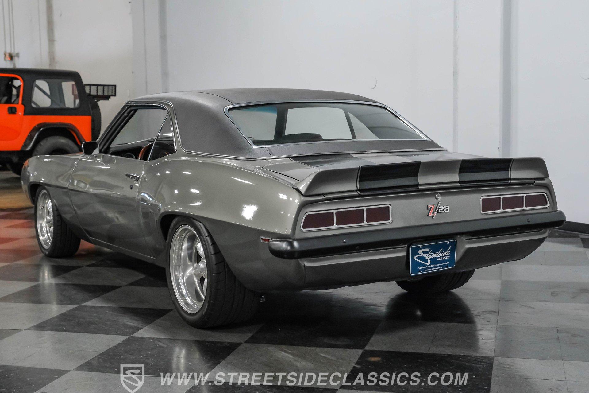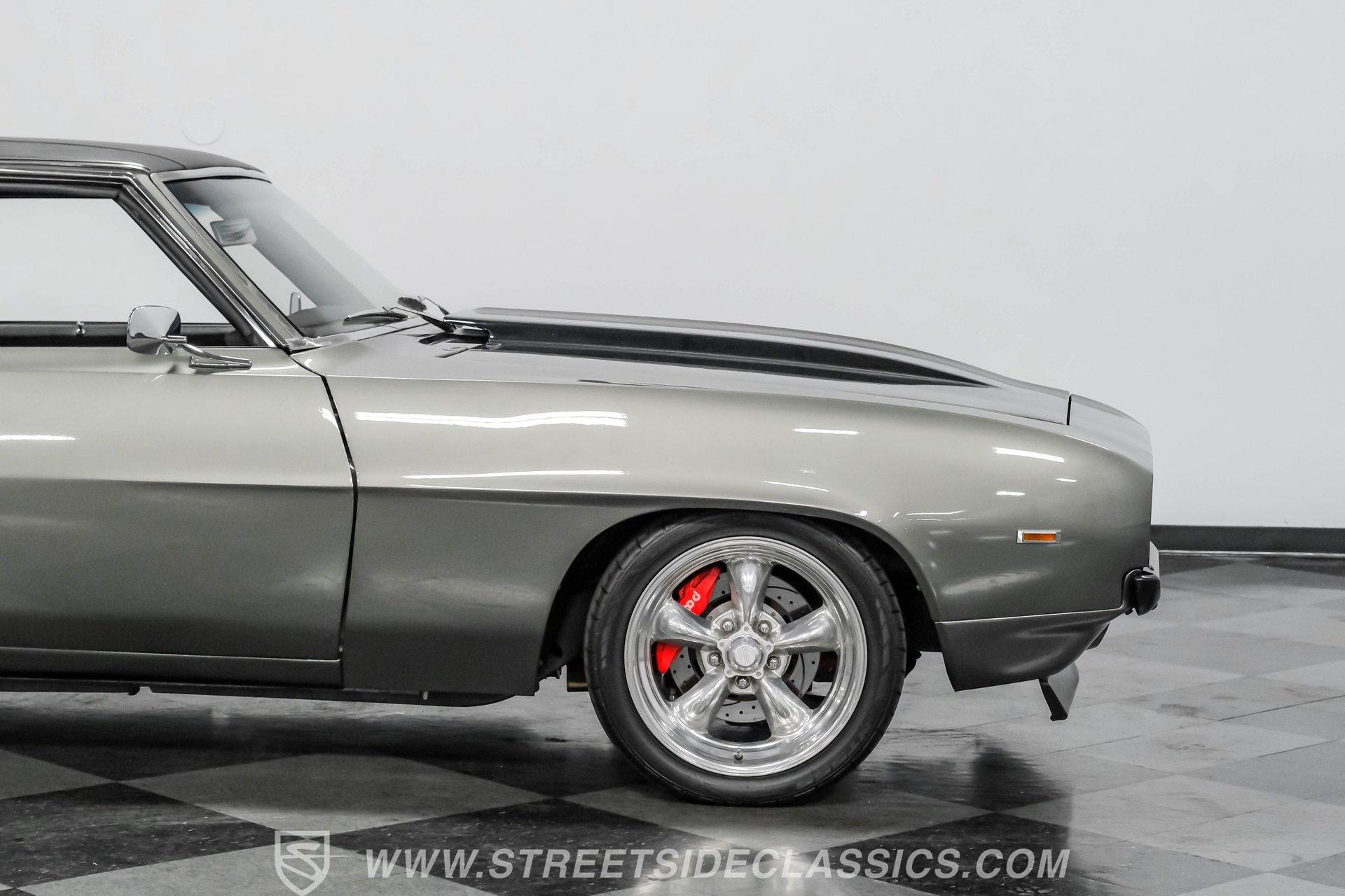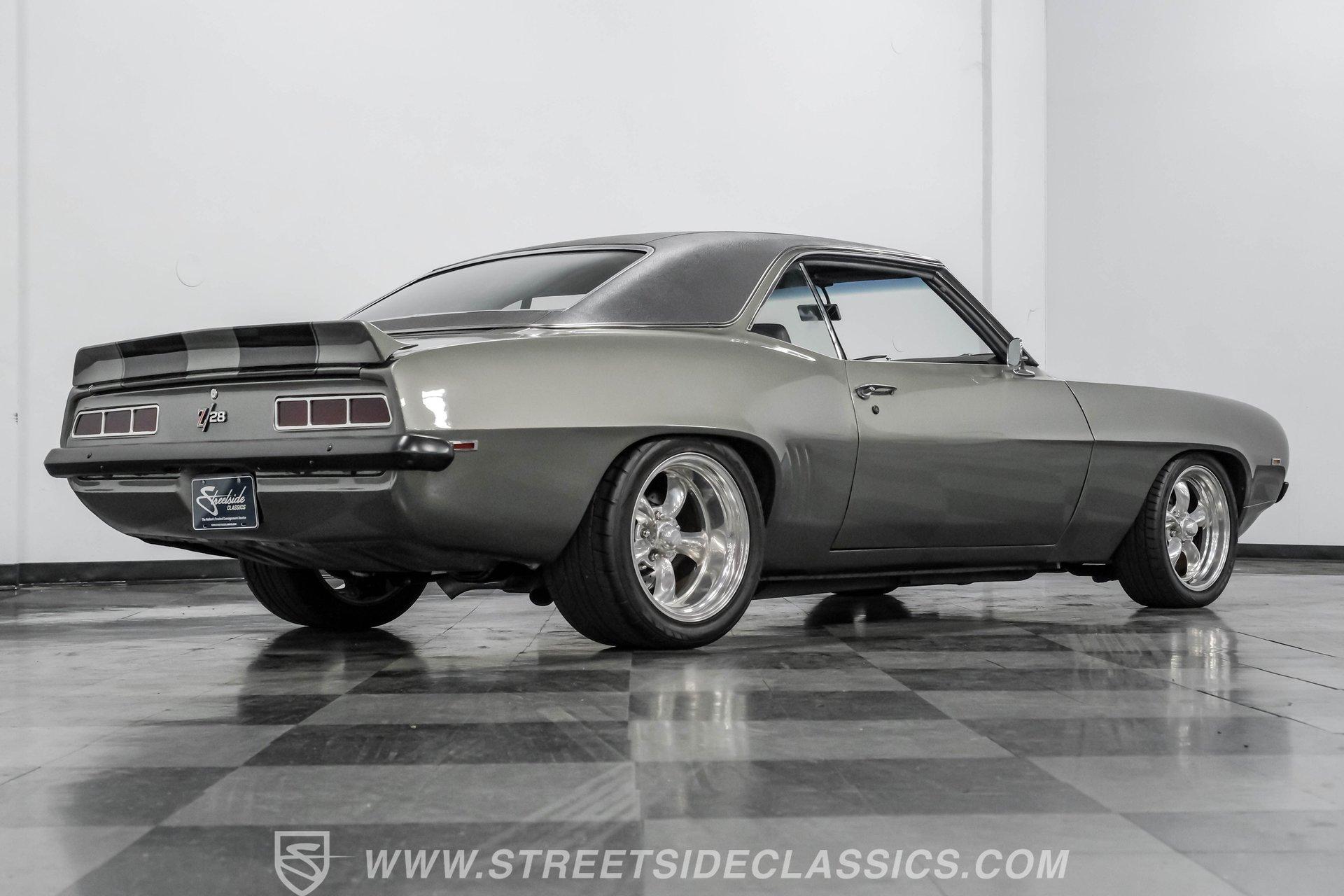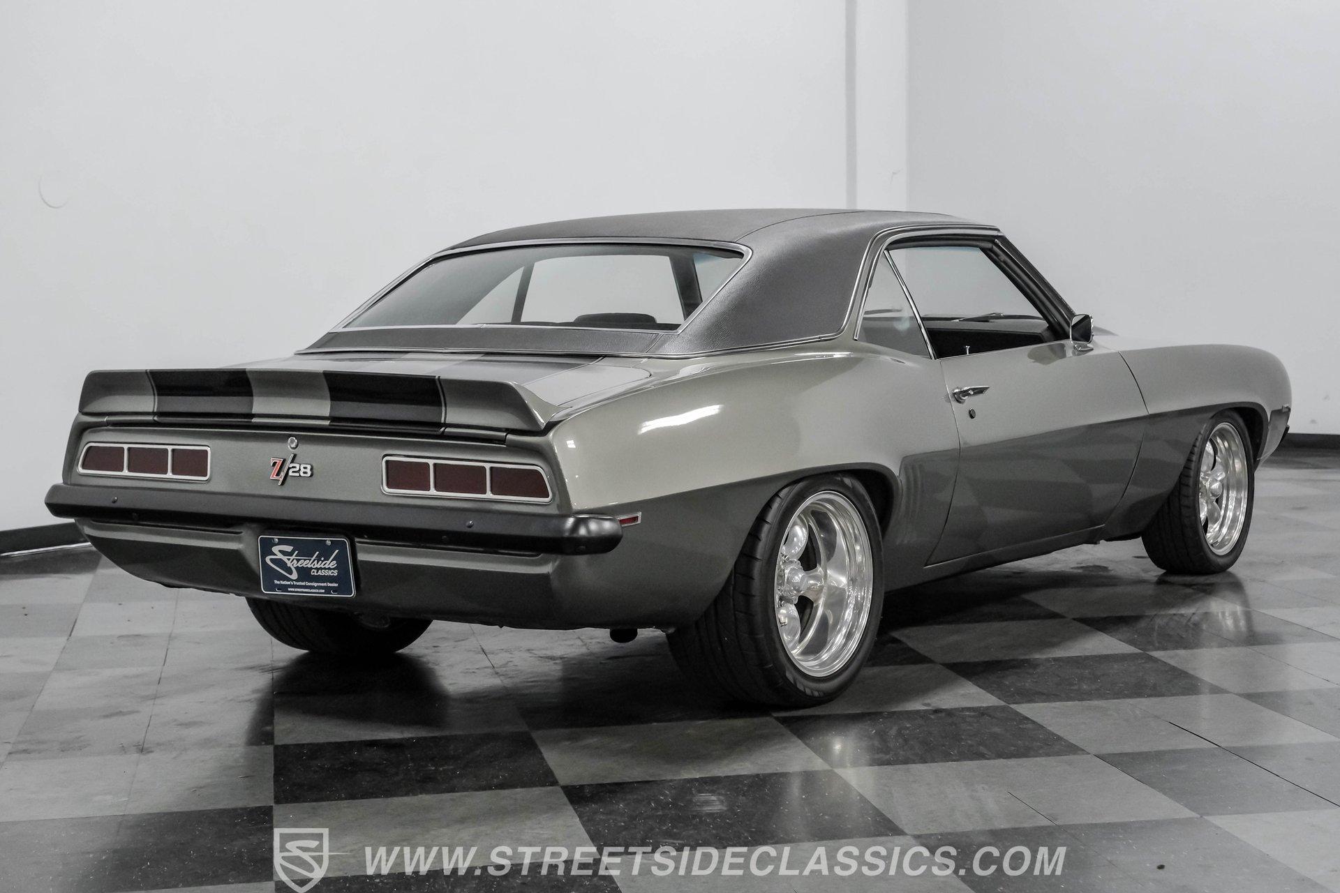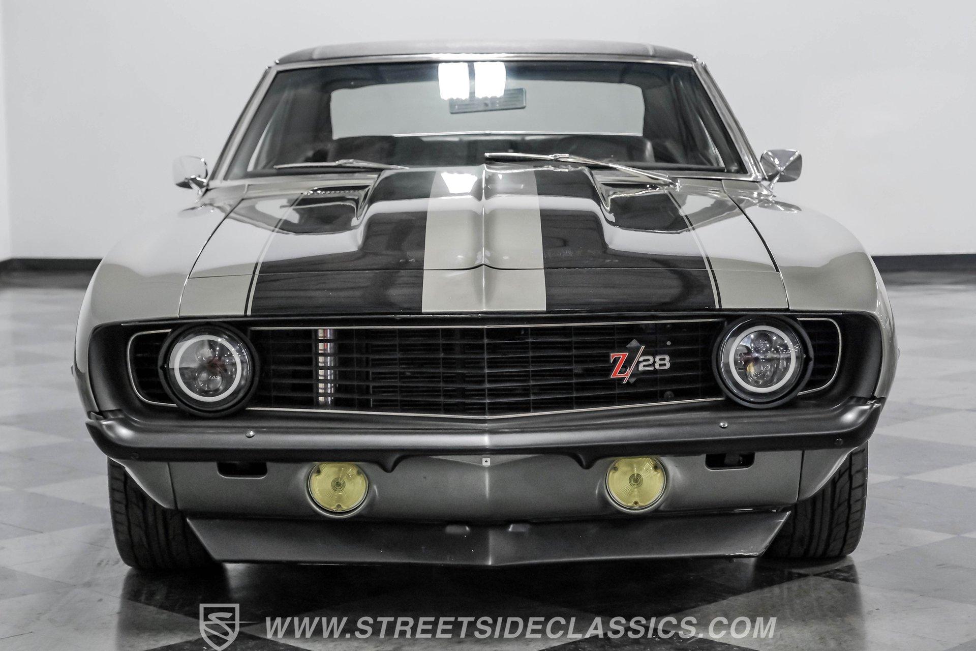 In terms of banner years, 1969 stands out as one of the most exciting in American history. The moon landing, Woodstock, and cars like this 1969 Chevrolet Camaro Z/28 Restomod Tribute all serve as proof of just how memorable this year was. This Camaro is nothing short of stunning in its gray-and-black motif. With its cowl-induction hood, Z/28 badging, and decklid spoiler, this pony car looks ready to gallop from any angle. Inside, we find a nicely redone black vinyl interior. A center console separates a pair of bucket seats equipped with headrests. A beautiful Custom Billet woodgrain steering wheel and matching console trim add the perfect amount of contrast, while ahead of the wheel sits a set of AutoMeter Super-Comp gauges featuring a 120 mph speedometer and 8,000 rpm tachometer mounted in a custom housing. A Sniper EFI controller/monitor fills the entertainment hole left by the radio delete, along with the Billet cueball-style shifter. Under the hood, despite the 427 Chevrolet valve covers, we actually find a larger 454 cubic-inch overhead-valve V-8 engine. Topped with lightweight Brodix aluminum heads and outfitted with a performance camshaft, this big block expels spent gases through a set of long-tube headers and ultimately out through an H-pipe dual exhaust. Power is routed through a modern Tremec T56 six-speed manual transmission before being sent out to the stout nine-inch rear end. HIGHLIGHTS: Z28 Tribute Full Gray Repaint w/ Black Painted Racing Stripes Front Lip and Rear Deck Spoilers Cowl Induction Hood 454 Big Block V8 Brodix Aluminum Heads Performance Cam Sniper EFI Long Tubes H-Pipe Exhaust Black Widow Mufflers Tremec T56 Six Speed Manual Nine Inch Rear Tubular Front Control Arms Upgraded Rear Trailing Arms Adjustable Coilovers Subframe Connectors Wilwood Power Disc Brakes Cross Drilled and Slotted Rotors Power Steering Redone Black Vinyl Interior Sniper EFI Controller Bucket Seats with Headrests Billet Shifter AutoMeter Super Comp Gauges Custom Gauge Cluster Custom Billet Woodgrain Wheel Service Manuals Receipts This 1969 Chevrolet Camaro Z/28 Restomod Tribute rides on a tubular A-arm front suspension with upgraded trailing arms in the rear. Subframe connectors and adjustable coilovers at all four corners ensure this throwback muscle car will handle far better than the day it rolled off the assembly line. Seventeen-inch American Racing Torq Thrust II polished wheels are shod in staggered sticky Nitto rubber. Power steering and four-wheel Wilwood power disc brakes add a nice touch of modern convenience, making any road trip more fun than work. In terms of great years, 1969 is undoubtedly a one-seed in the tournament of time. Don't miss your chance to own a beautiful piece of rolling history, upgraded by a bit of modern technology, with this head-turning Camaro. Call today!