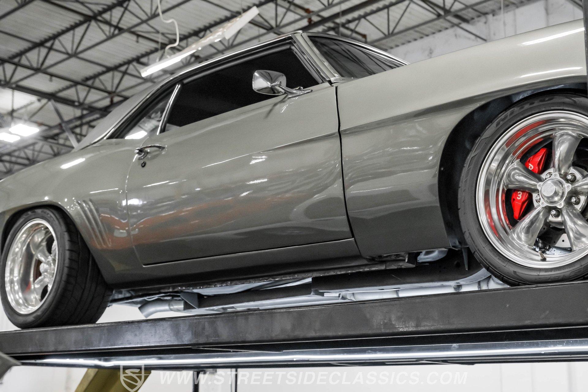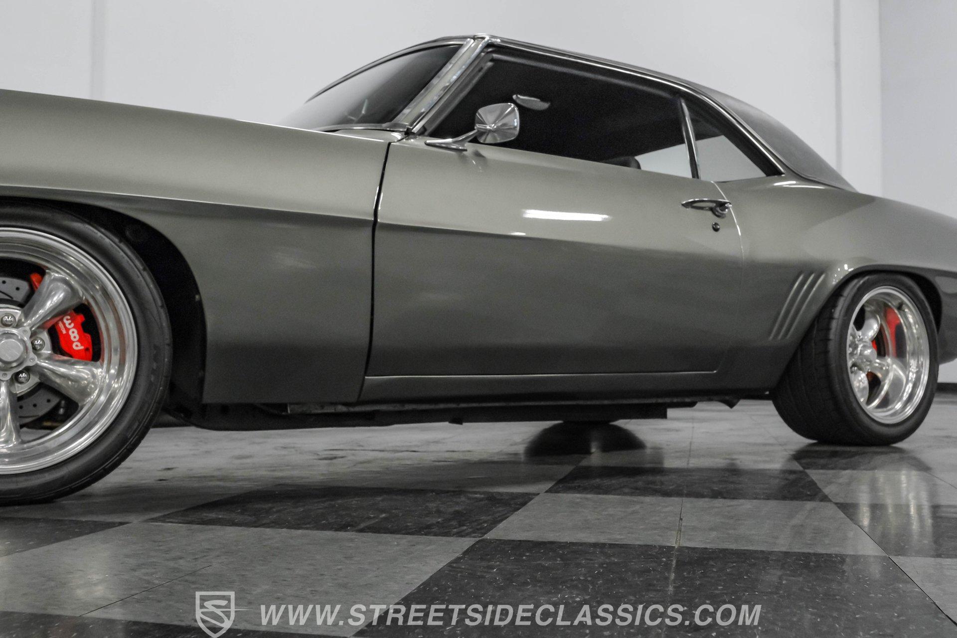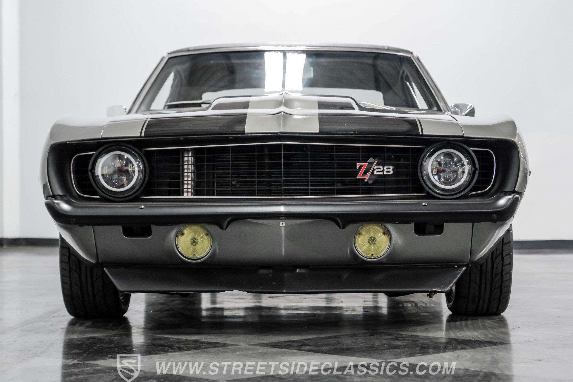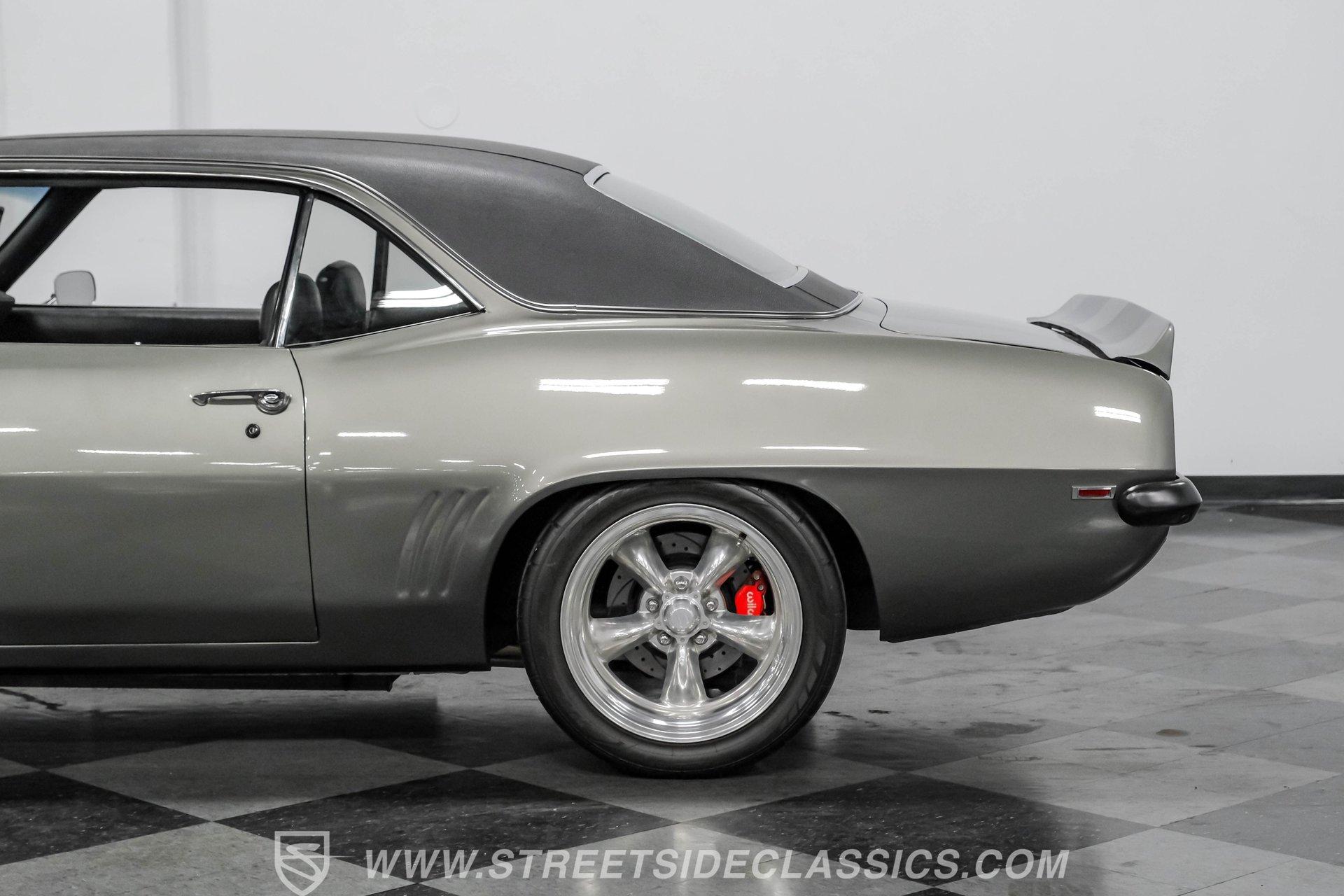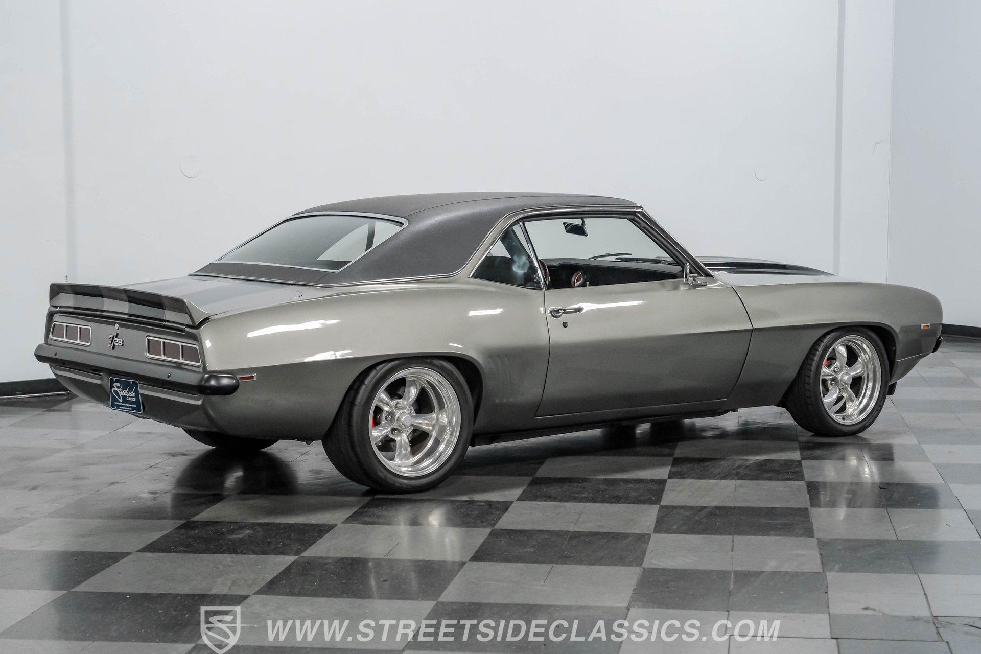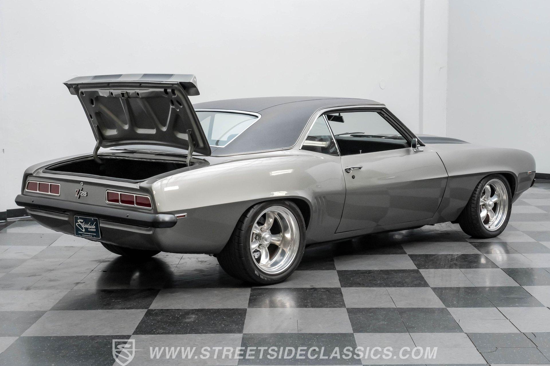 In terms of banner years, 1969 stands out as one of the most exciting in American history. The moon landing, Woodstock, and cars like this 1969 Chevrolet Camaro Z/28 Restomod Tribute all serve as proof of just how memorable this year was. This Camaro is nothing short of stunning in its gray-and-black motif. With its cowl-induction hood, Z/28 badging, and decklid spoiler, this pony car looks ready to gallop from any angle. Inside, we find a nicely redone black vinyl interior. A center console separates a pair of bucket seats equipped with headrests. A beautiful Custom Billet woodgrain steering wheel and matching console trim add the perfect amount of contrast, while ahead of the wheel sits a set of AutoMeter Super-Comp gauges featuring a 120 mph speedometer and 8,000 rpm tachometer mounted in a custom housing. A Sniper EFI controller/monitor fills the entertainment hole left by the radio delete, along with the Billet cueball-style shifter. Under the hood, despite the 427 Chevrolet valve covers, we actually find a larger 454 cubic-inch overhead-valve V-8 engine. Topped with lightweight Brodix aluminum heads and outfitted with a performance camshaft, this big block expels spent gases through a set of long-tube headers and ultimately out through an H-pipe dual exhaust. Power is routed through a modern Tremec T56 six-speed manual transmission before being sent out to the stout nine-inch rear end. HIGHLIGHTS: Z28 Tribute Full Gray Repaint w/ Black Painted Racing Stripes Front Lip and Rear Deck Spoilers Cowl Induction Hood 454 Big Block V8 Brodix Aluminum Heads Performance Cam Sniper EFI Long Tubes H-Pipe Exhaust Black Widow Mufflers Tremec T56 Six Speed Manual Nine Inch Rear Tubular Front Control Arms Upgraded Rear Trailing Arms Adjustable Coilovers Subframe Connectors Wilwood Power Disc Brakes Cross Drilled and Slotted Rotors Power Steering Redone Black Vinyl Interior Sniper EFI Controller Bucket Seats with Headrests Billet Shifter AutoMeter Super Comp Gauges Custom Gauge Cluster Custom Billet Woodgrain Wheel Service Manuals Receipts This 1969 Chevrolet Camaro Z/28 Restomod Tribute rides on a tubular A-arm front suspension with upgraded trailing arms in the rear. Subframe connectors and adjustable coilovers at all four corners ensure this throwback muscle car will handle far better than the day it rolled off the assembly line. Seventeen-inch American Racing Torq Thrust II polished wheels are shod in staggered sticky Nitto rubber. Power steering and four-wheel Wilwood power disc brakes add a nice touch of modern convenience, making any road trip more fun than work. In terms of great years, 1969 is undoubtedly a one-seed in the tournament of time. Don't miss your chance to own a beautiful piece of rolling history, upgraded by a bit of modern technology, with this head-turning Camaro. Call today!