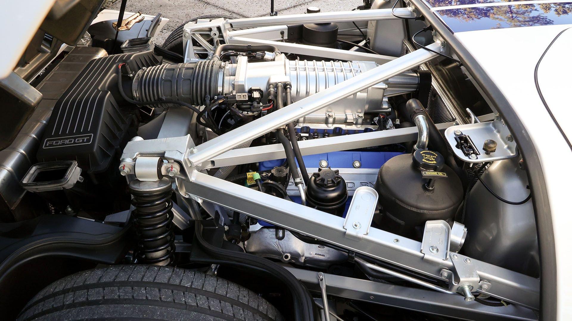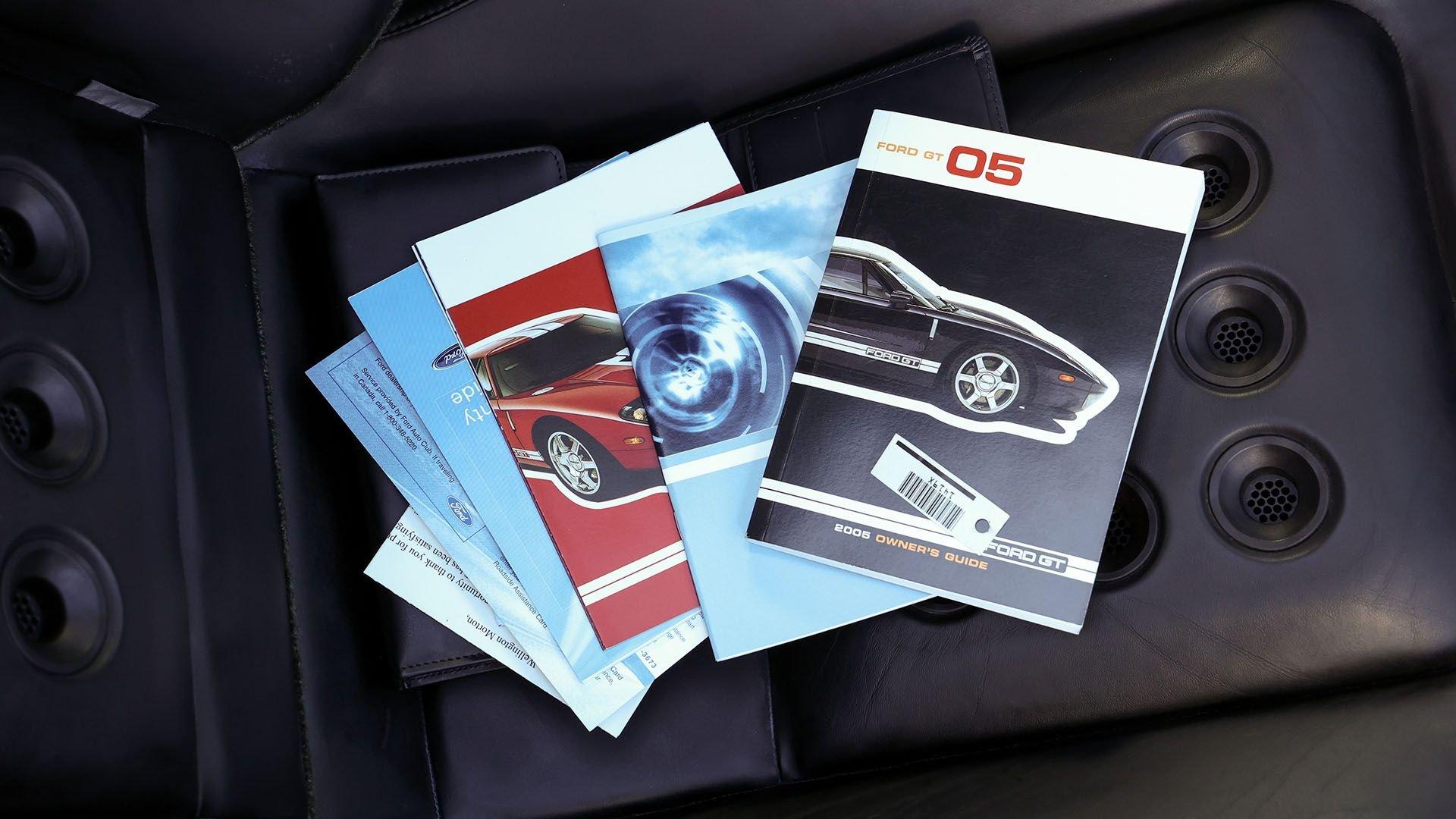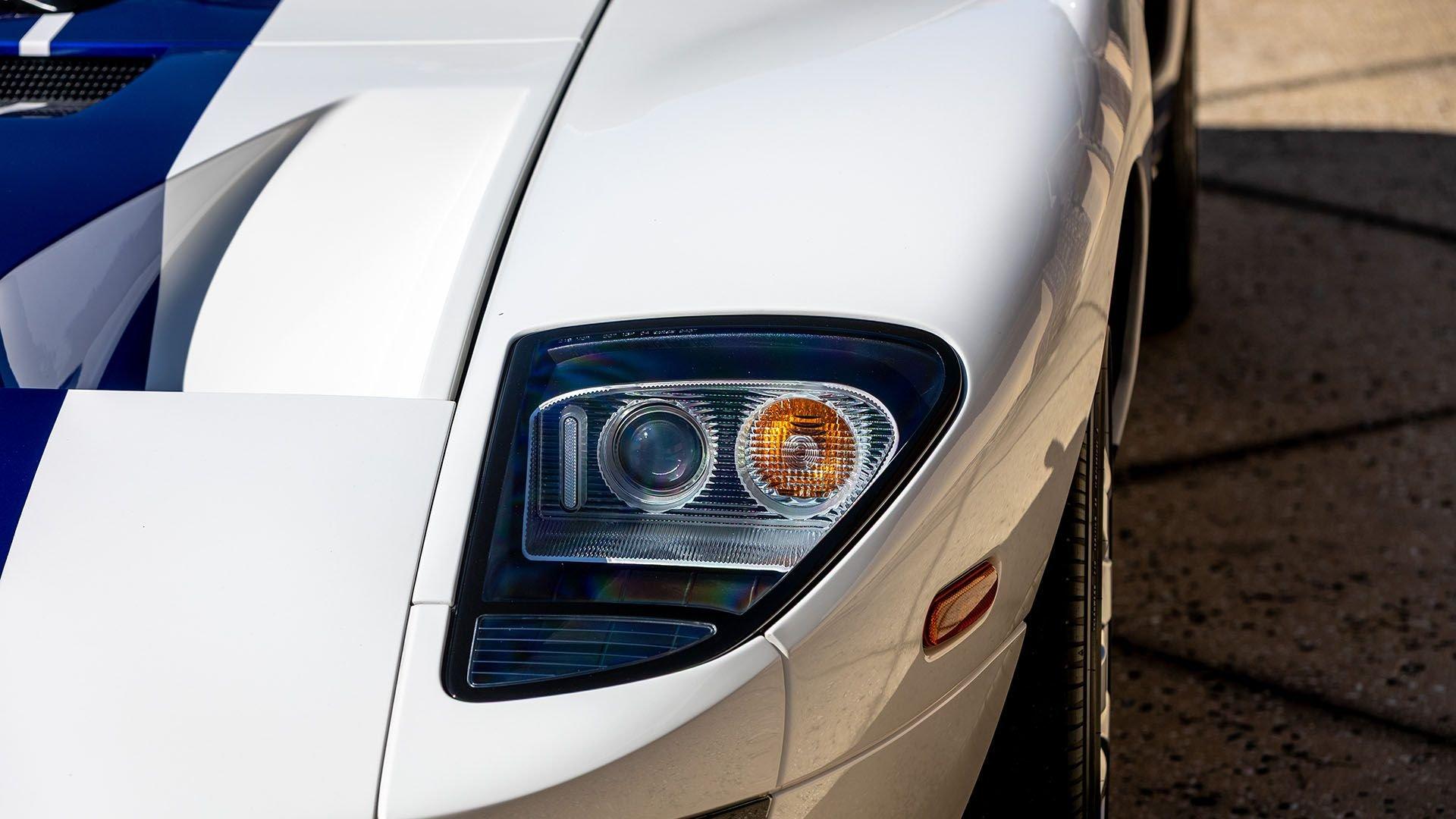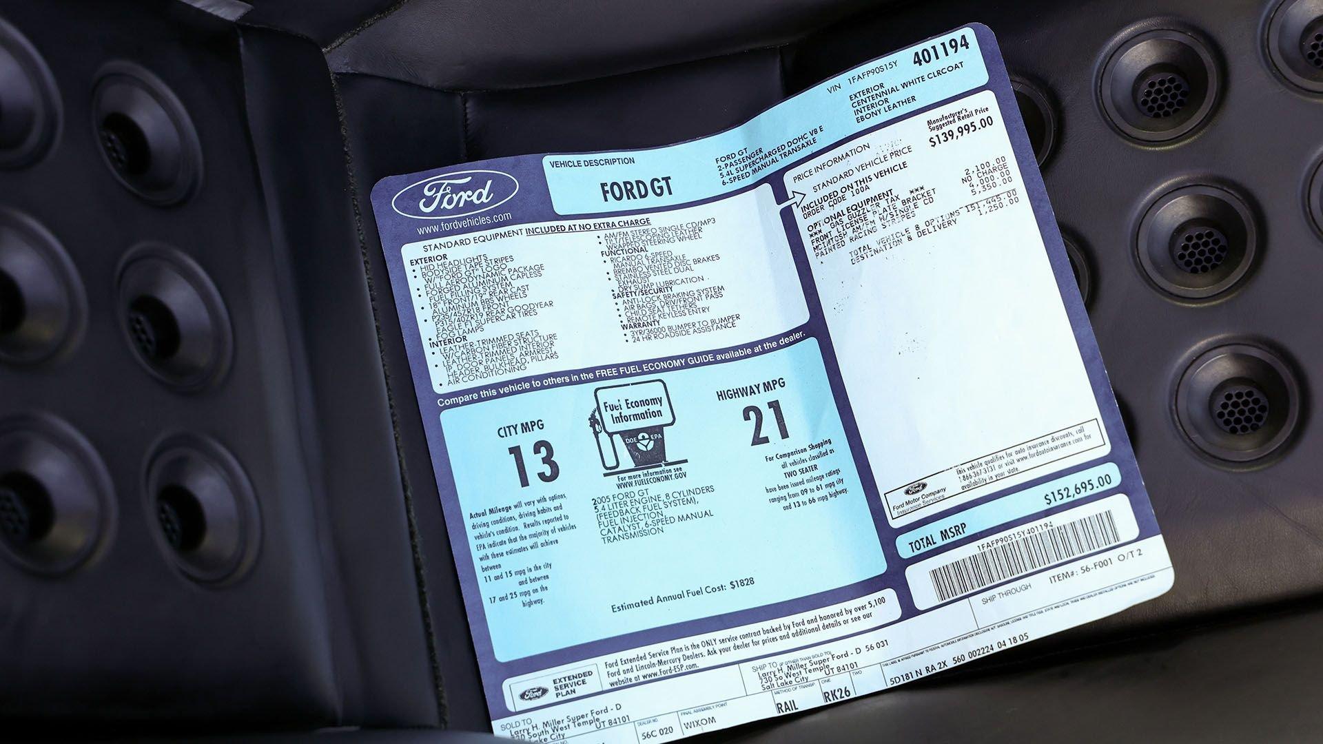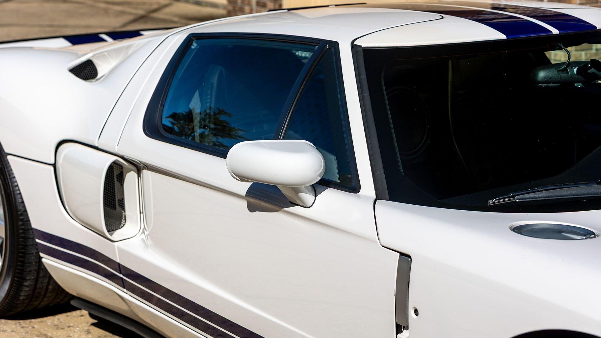 Chassis No. 1FAFP90S15Y401194 The Ford GT was a bold reawakening of the marque’s supercar era in the form of the reimagined Le Mans-conquering GT40. Conceived in concept form to celebrate Ford Motor Company’s centennial anniversary in 2003, the new-age GT debuted several unique features all together in a retro package with an unmistakable silhouette designed by Camilo Pardo. Carroll Shelby was also brought back to serve as technical advisor on the production of the GT40’s successor. Although lacking a Le Mans counterpart at the time, the new Ford GT quickly cemented itself as an unparalleled driver’s car, offering a mix of analog-style controls and modern performance. Power came from a supercharged 5.4-liter V8 with DOHC four-valves-per-cylinder, producing 550 horsepower and 500 lb-ft of torque through a Ricardo six-speed manual transmission and a limited-slip differential. As a result, the Ford GT sprinted from zero to 60 mph in 3.3 seconds and on to a top speed of 205 mph. This 2005 Ford GT, serial number 1194, is finished in Centennial White with Sonic Blue Le Mans racing stripes adorning the hood, roof, rear hatch, and flanks over an Ebony Black leather-trimmed interior. It is further equipped with black-painted brake calipers, cast aluminum wheels, and the premium McIntosh Audiophile stereo with CD player, as confirmed by the included Marti Report and original window sticker. Chassis 1194 was completed in May 2005 and was first offered for sale by Larry H. Miller Super Ford in Salt Lake City, Utah, that August according to its clean CARFAX Vehicle History Report. The car was sold to its sole private owner in Florida that same year and was regularly serviced through Ford dealerships in Jacksonville and Saint Augustine for the next 10 years. It was recently comprehensively serviced by the consignor’s in-house mechanic, which included an oil change, belt replacement, brake refresh, four new Bridgestone tires, and more. It is now offered with 7,700 miles as well as its owner’s manuals in their case, battery charger, two sets of keys, air pump, window sticker, and tote bag with car cover still in their plastic. With a nearly full roster of options, single ownership, and low mileage, chassis 1194 is an investment-grade GT that exemplifies the purity and performance of Ford’s celebrated supercar.
