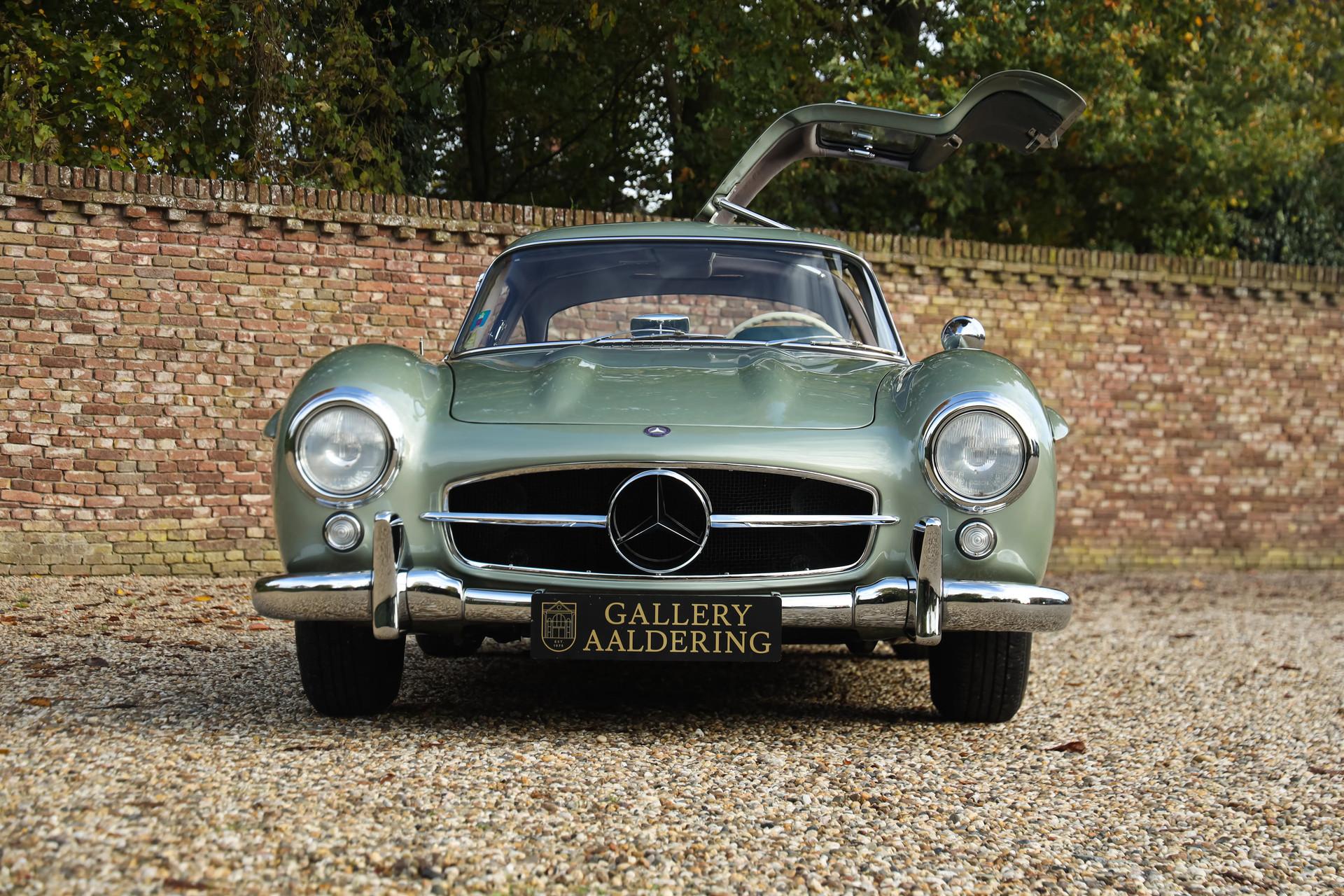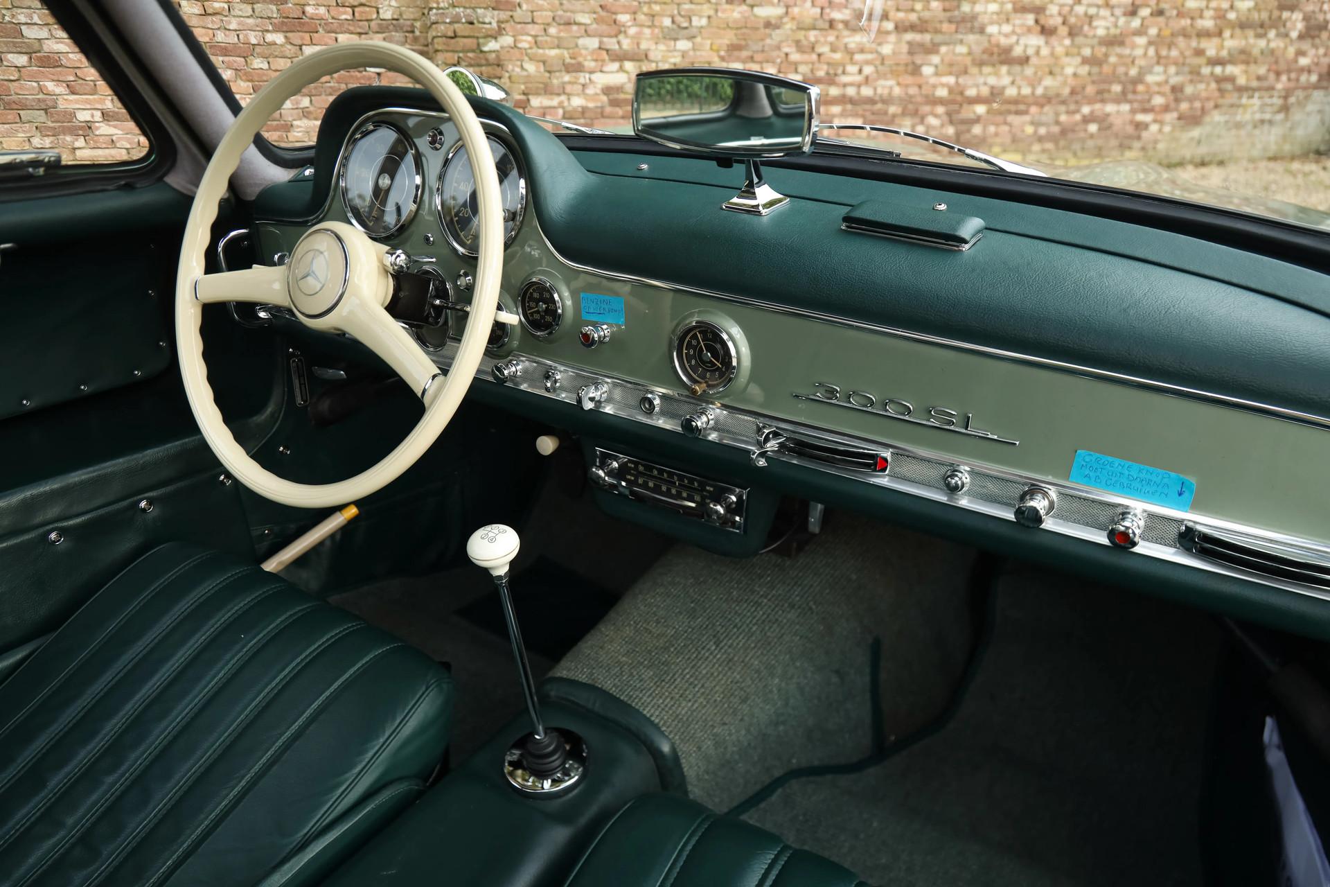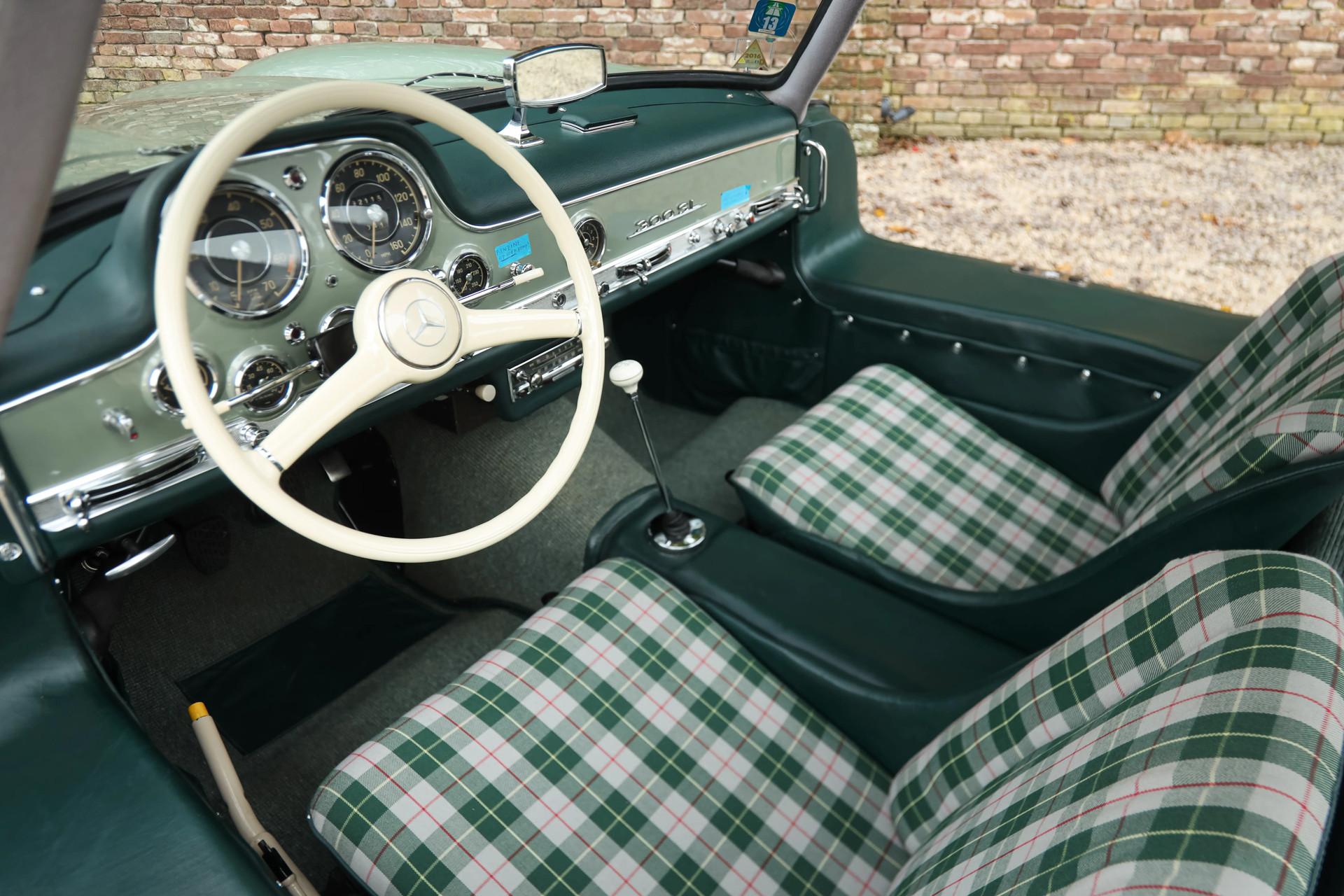 This Gullwing is a matching-numbers, matching colours masterpiece, specified in one of the most elusive factory combinations ever delivered: Hellgrün exterior over chequered green-beige “L3” upholstery. It is a colour scheme whispered about among marque specialists and seldom seen, almost never offered, and breathtaking in person.
