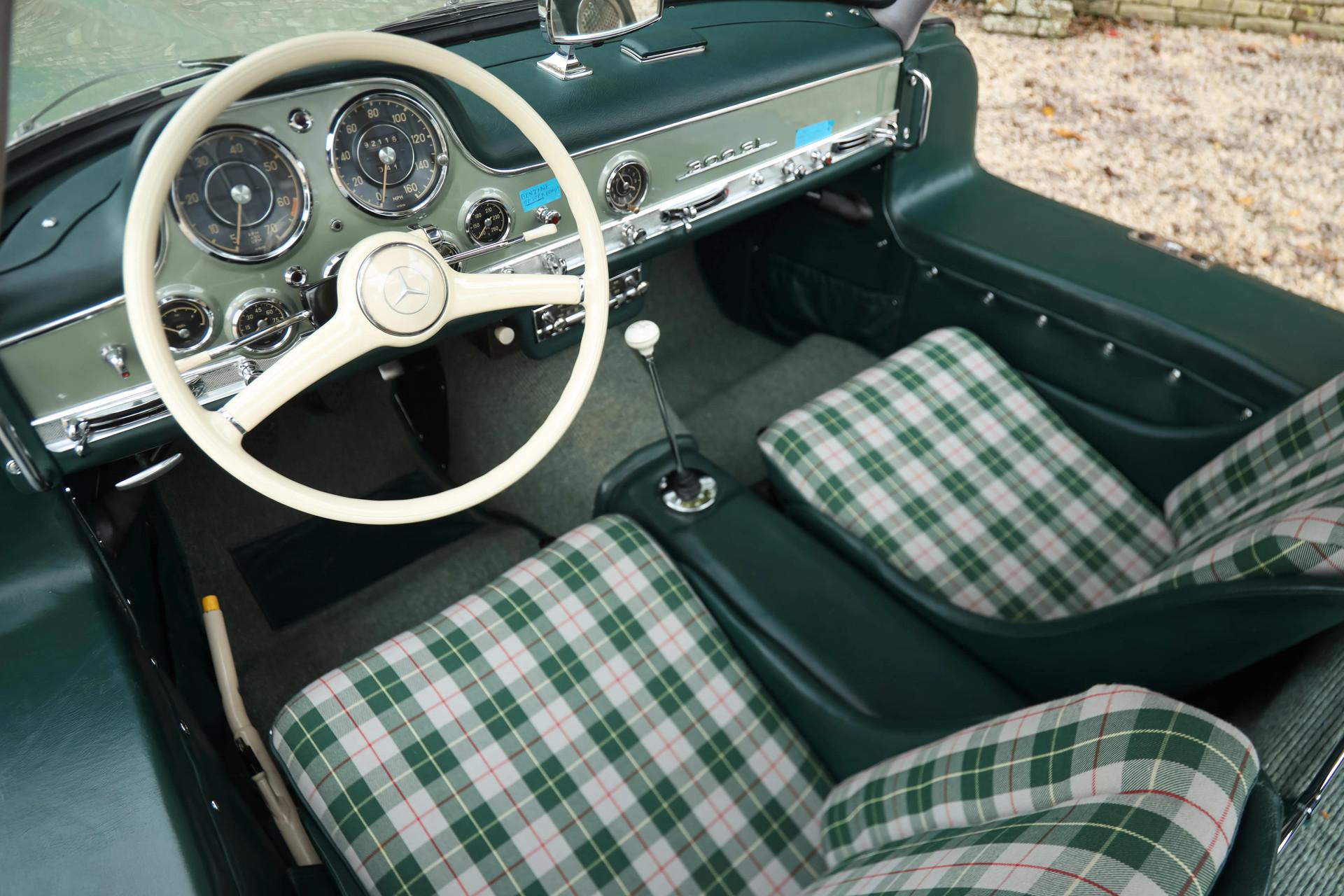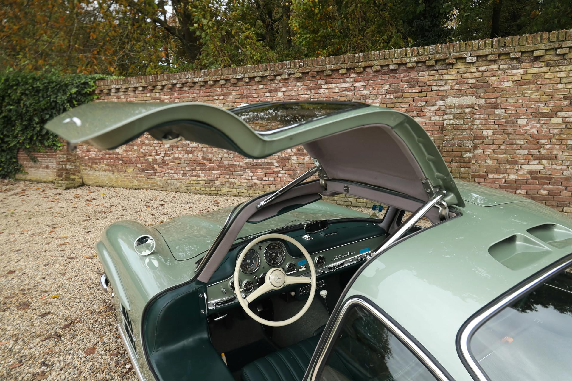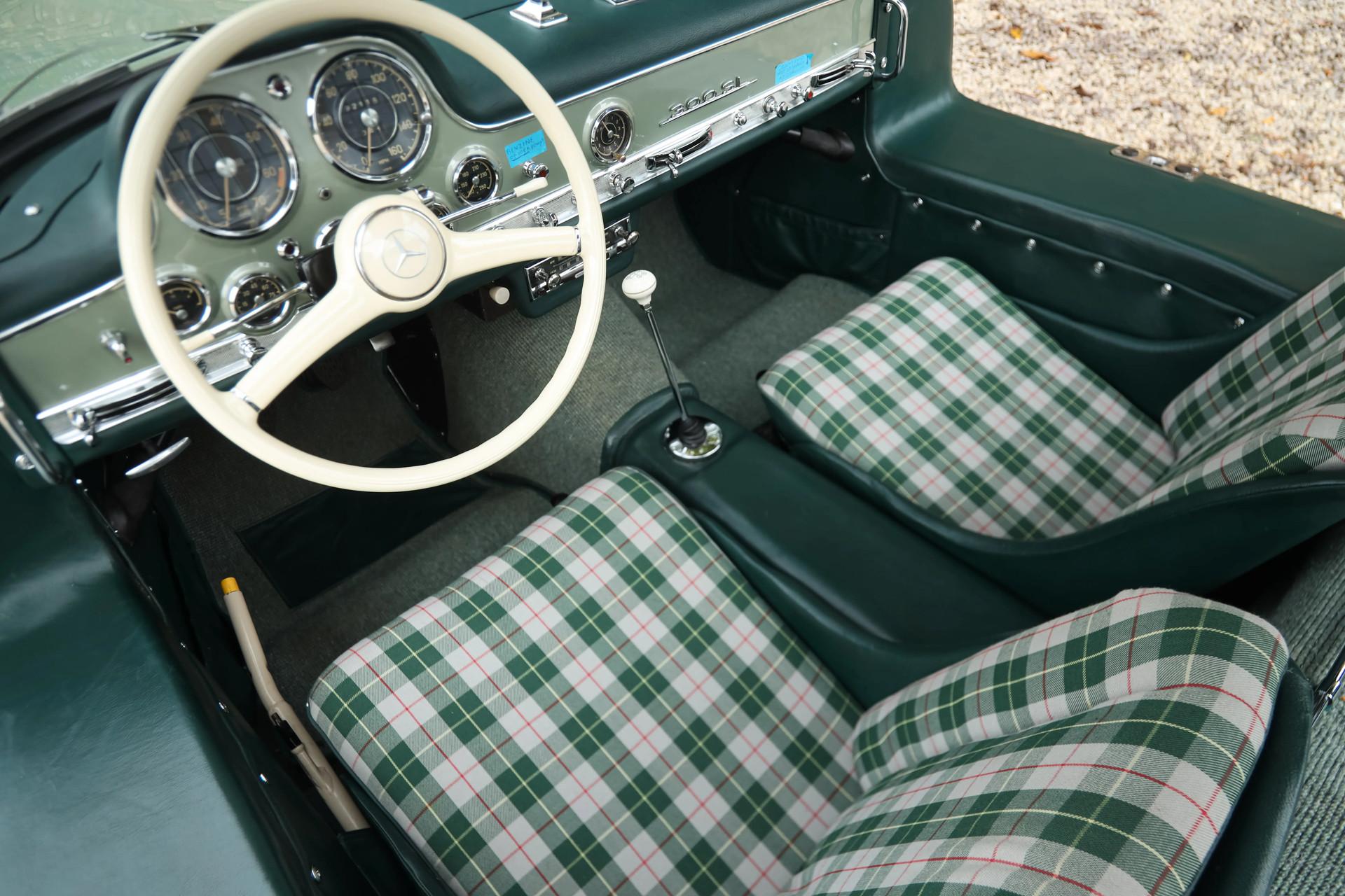 This Gullwing is a matching-numbers, matching colours masterpiece, specified in one of the most elusive factory combinations ever delivered: Hellgrün exterior over chequered green-beige “L3” upholstery. It is a colour scheme whispered about among marque specialists and seldom seen, almost never offered, and breathtaking in person.