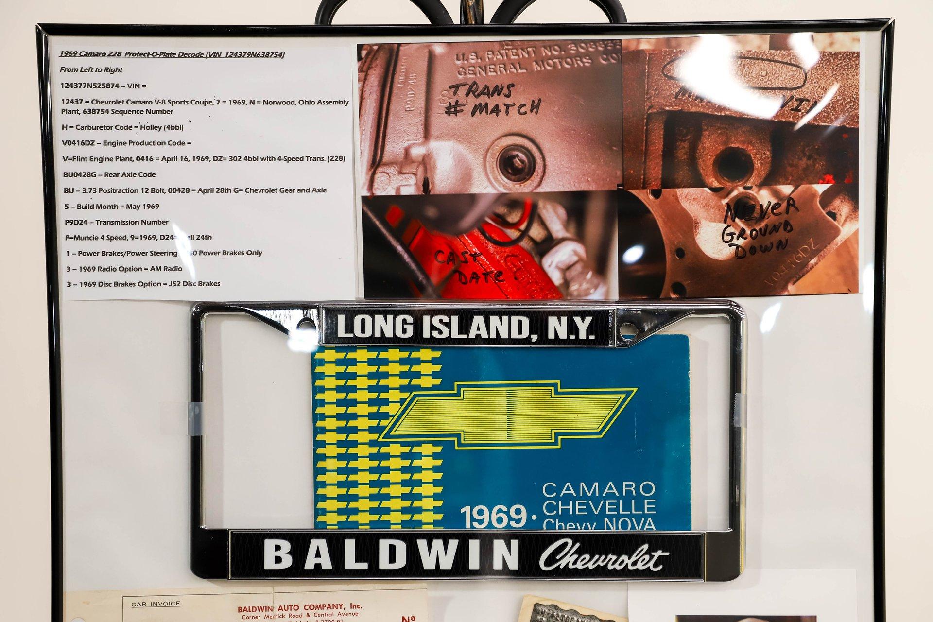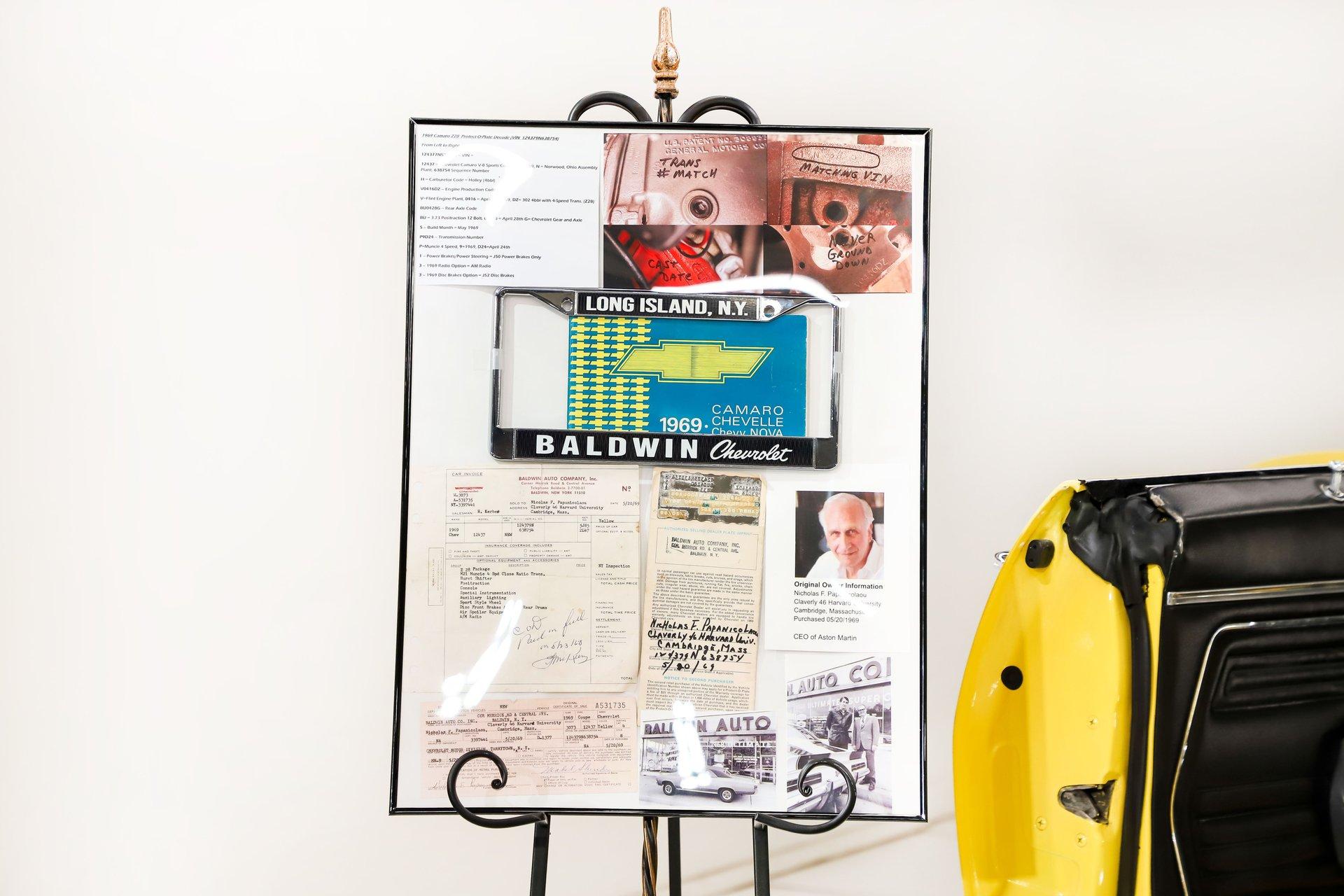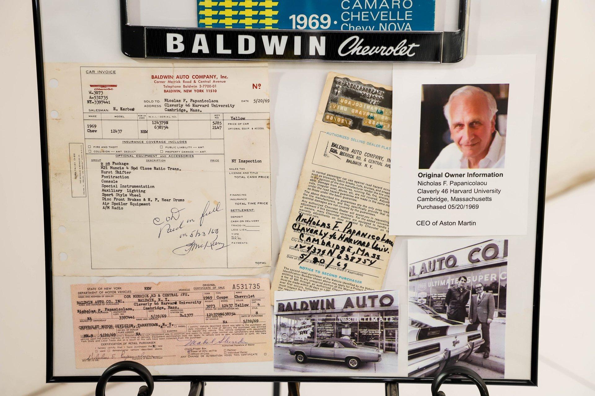 Celebrating our 65 year anniversary! This family owned and operated business was established in 1960, making us the oldest classic car dealership in America. Special thank you to all our customers for entrusting us to park the car of your dreams in your driveway while preserving automotive history for future generations to embrace and enjoy. -Grams family & Volo Museum staff INTRODUCTION: Documented, real deal and true #s matching! Sold new at the legendary high performance dealer: Baldwin Chevrolet. It has its original protect-o-plate and invoice, not fakes. Both verify the car was born as you see it. The numbers on the motor, transmission and colors are authentic. INTERESTING SIDE NOTE: Sold new to Nicholas Papanicolaou, he paid cash for the car while attending Harvard University. His address on the documents is where the wealthy students lived. He must have done his studying because he went on to do many notable and great things including being CEO of Aston Martin. EXTERIOR: Factory code 76-76 Daytona Yellow without a vinyl top. Clean straight body, dry metal even along the bottom. Aggressively dressed with a cowl hood and spoilers. Repainted and polished smooth and glossy, you can't feel the stripes! The chrome and trim looks great, it has correct antenna and rear bumper guards. The windshield and rear window were replaced. Only Z-28s had 15 inch wheels which this has, and the trim sparkles! It's even wearing reproduction GoodYear Wide Tread GT tires. The finishing touches are the Baldwin dealer sticker and license plate frame! INTERIOR: Completely restored to its original glory! Reproduction cushions, upholstery, door panels, armrests etc. fresh looking carpet on the floor with Z28 mats. Overhead is a tight headliner with working dome light. The entire dash area is very clean and it has an optional eight grand tachometer, clock with quartz movement, new heater control panel, and the original AM radio is still in place. Down in the console it has the gauge cluster and Hurst shifter. It also has a deluxe rosewood steering wheel. ENGINE COMPARTMENT: The very spirited, high revving DZ 302! It was blatantly underrated at 290hp, it was actually closer to 375hp. This motor is original to this car with correct casting code and date, proper stamp code and date along with matching VIN stamped by oil filter which is virtually impossible to tamper with. It also has correct double hump heads, aluminum intake and matching numbers Holley dual feed carb. It has stock exhaust manifolds, finned aluminum valve covers and on top is a complete functional cowl induction system! It is upgraded with electronic ignition under the stock cap. Because it is a high revving motor they came with deep groove pulleys which this has. It even has a complete and correct smog system! The cooling system is proper with correct hoses, clamps, shroud and even its original dated fan. They all come equipped with power brakes, this one has the correct cadmium plated booster. Other details include the PBT markings on the firewall, correct horns, spark plug shields, fuel line, hood insulation, spring clamp battery cables etc. It's like we're in 1969 looking at it in the showroom! TRUNK COMPARTMENT: Under the trunk lid and jamb are painted slick. Inside is clean metal with a neatly painted spatter finish. It is complete with the jack and 15 inch rally wheel with a BFG tire. UNDERSIDE: The Z-28 package included performance suspension, brakes, exhaust, steering and rear end. This one has been body off frame restored, everything was removed from under the car. The steering and suspension was gone through, it was upgraded with Koni gas shocks. features under the car as well. The brake system was restored to original with disc brakes in front, drum in back. The lines, hoses and e-brake cables were replaced. The dual exhaust is correct running into a transverse muffler and back into 2 pipes. The fuel system was replaced. Looking up at the engine it is clean Chevy orange, the starter looks fresh. The original, # matching Muncie 4-speed and linkage look fresh too. A rebuilt driveshaft leads back to a 12 bolt posi rear end. The floors look clean and are painted satin black. SERVICE: We take pride in our cars and reputation. Therefore, we built a 2 million dollar, 10,000 square ft service center, and hired a team of technicians to service the essentials on every car we sell. CONCLUSION: The Z-28 was built to compete in Trans Am racing which had a 305 cubic inch limit, the DZ 302 is a legendary performer! At 7,000 rpm they are still pulling. This Z is worthy of any collection because it is the real deal! Not to mention restored beautifully and has a great history. There's others, they aren't this one! For nearly 30 years, I, Jay Grams, have personally written the highlights for almost every car in our collection. What I provide is my professional opinion based on my experience with these vehicles. However, opinions can vary, and I strongly recommend a personal inspection to form your own view. Our sales team is always available to answer any questions you may have. One great option is to request a personalized walk-around video, where we can showcase the car and share our team’s insights. **Our cars are displayed within a museum setting. If you are interested in a specific vehicle, please schedule an appointment with a salesperson to view it. Without an appointment, there is an admission fee to enter the showroom. If you decide to purchase a car, your admission will be refunded, and you'll receive a one-year museum membership. ☎️ 815 385 3644 9-5 central 📧 Sales@volocars.com Answered ASAP Cowl induction Power disc brakes Smog equipment Console Factory gauges 8 grand tach Quartz clock Deluxe wheel Spoilers 15” rally wheels Reproduction tires Protect-o-plate Original invoice