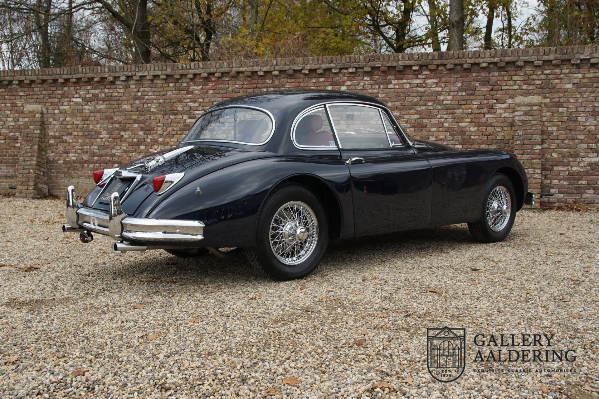 This particular Jaguar XK150 Fixed Head Coupe Special Equipment from 1959 was originally delivered on January 29, 1959, to Jaguar New York in the United States. This example, an original Special Equipment version, was factory-fitted with a range of high-quality options, including chrome wire wheels, fog lamps, dual exhausts, overdrive, and the sought-after B-type cylinder head, which adds 20 extra horsepower to the XK's power. The car is matching numbers, meaning it still has the original engine.