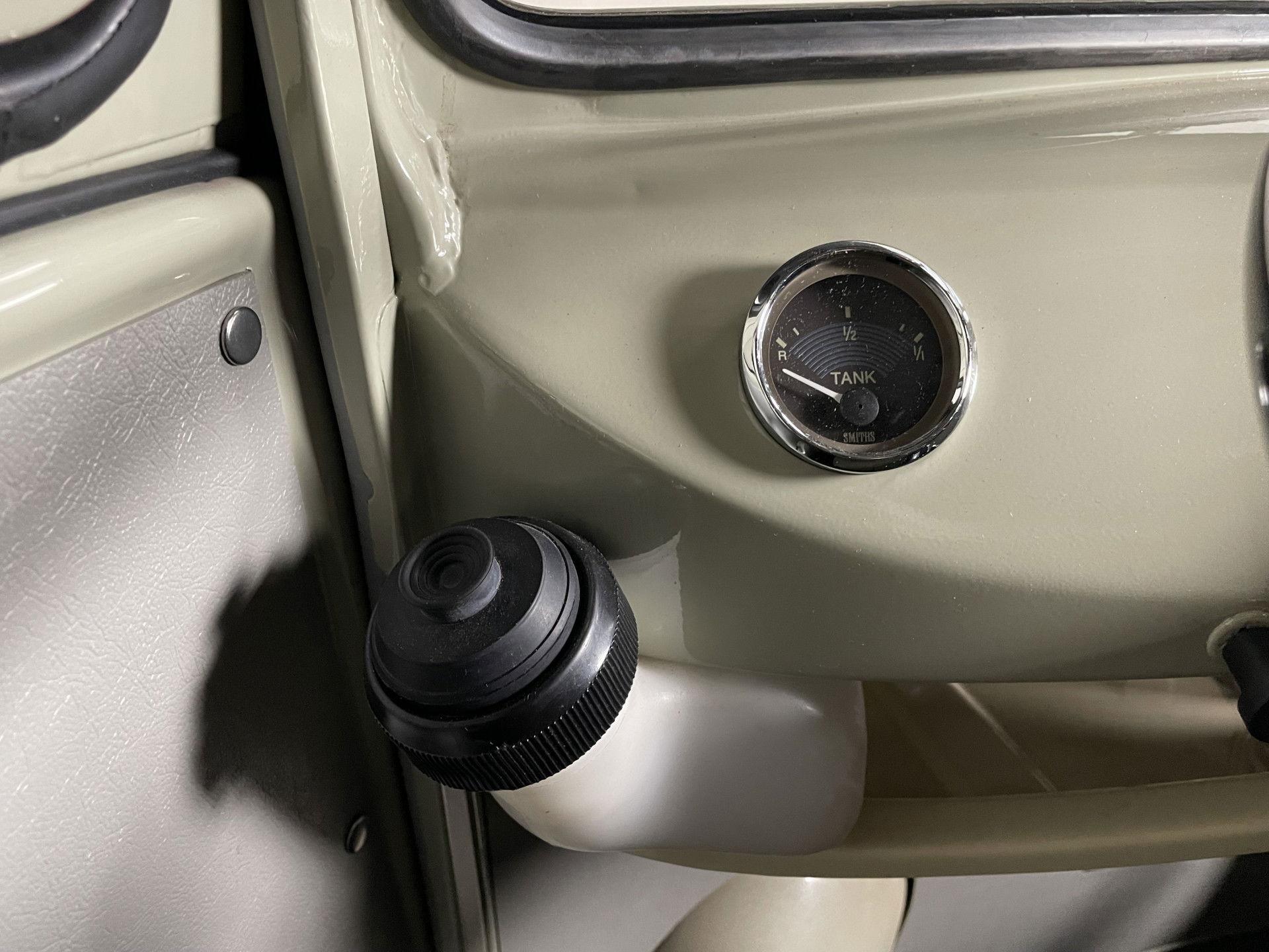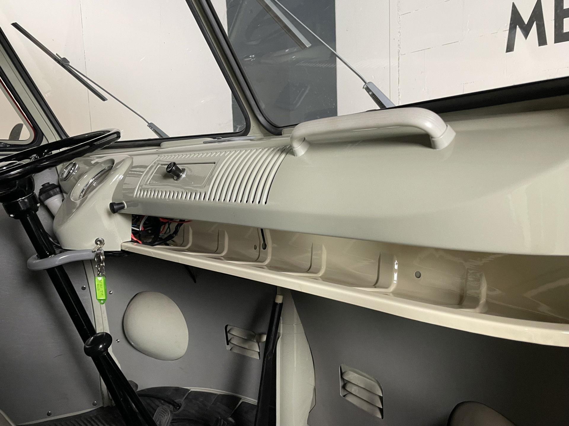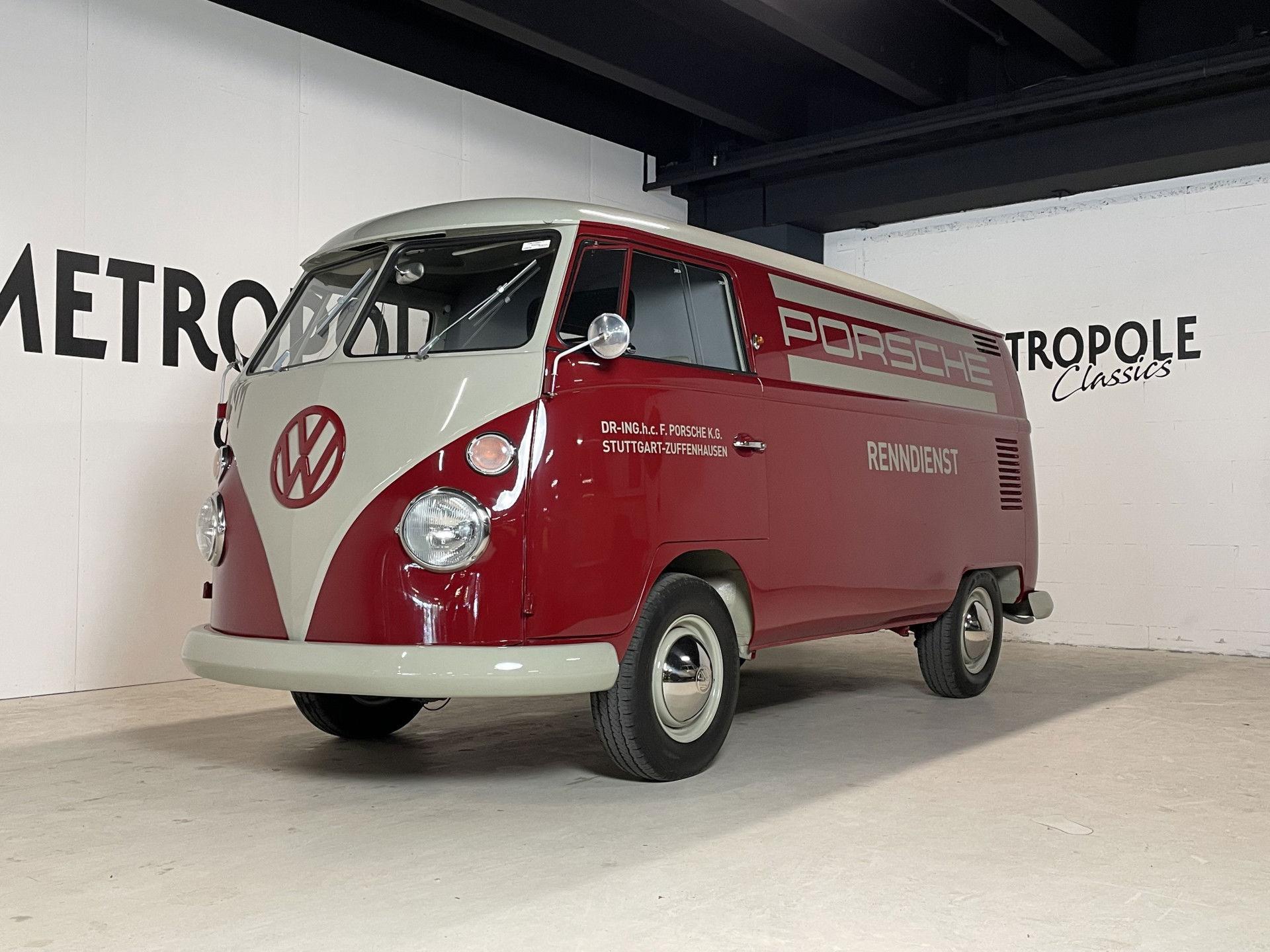 This van here has been completely restored to concours level. It also drives perfectly. Made in red with a beige interior. We have decorated the bus with the logos of Porsche Renndienst. A beautiful bus for enthusiasts.