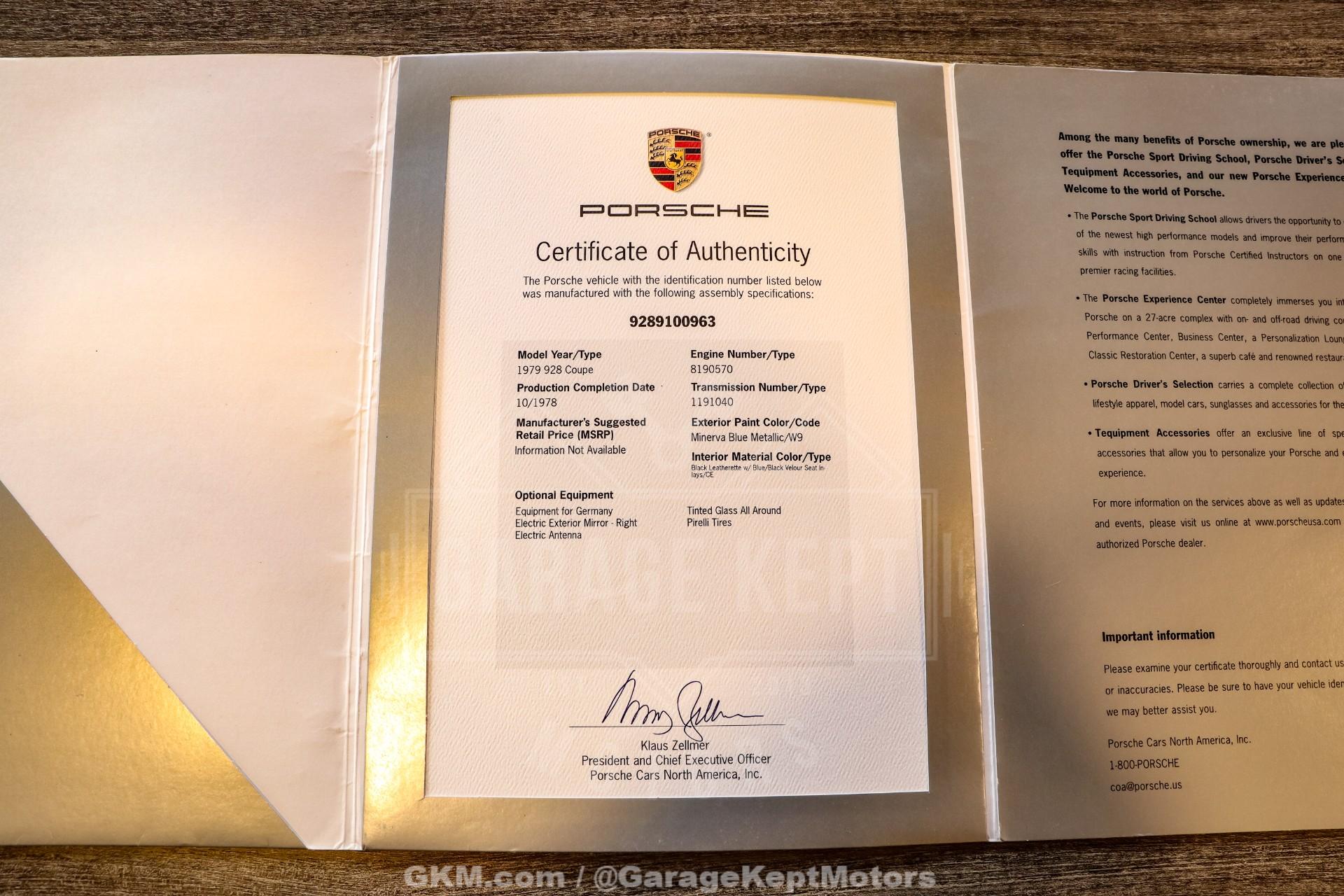 Currently for sale on Bring A Trailer Online Auctions, ending Wednesday, December 3. Go to the BaT website to follow and/or bid!1979 Porsche 928- 2 Door Euro Spec Coupe- Minerva Blue Metallic- Grey/Black Pascha Interior- 4.5L Front Engine V8- 5 Speed Manual- Extensive Service History- Porsche Certificate of Authenticity - 18k MilesA true icon of German automotive history, this 1979 Porsche 928 embodies the perfect fusion of performance, luxury, and innovation that redefined what a grand touring car could be. Finished in the striking and highly desirable Minerva Blue Metallic over a rare Grey and Black Pascha interior, this Euro-spec 928 exudes 1970s style and sophistication. As Porsche's first-ever production V8 model, it marked a bold departure from the marque's traditional air-cooled, rear-engine formula and established a new era of front-engine, water-cooled power. With only 18,050 miles since new, this example remains in remarkable condition.Under the hood lies the legendary 4.5-liter front-mounted V8 engine, a technological milestone for Porsche when it debuted. Producing ample power and torque, it provided effortless high-speed cruising, while the highly sought-after 5-speed manual transmission offered drivers a deeply engaging experience behind the wheel. Capable of reaching speeds up to 171 mph, the 928 was one of the fastest and most refined grand tourers of its era, earning it acclaim as one of the world's premier luxury performance cars.This particular example comes with an impressive provenance, including a Porsche Certificate of Authenticity (#9289100963), EPA import documentation dated November 1984, and approximately $16,000 in recent service receipts. Inside, the cabin is an artful blend of luxury and bold design. The Grey and Black Pascha interiora visual icon of late-1970s Porsche style, complements the Minerva Blue exterior perfectly. Ergonomically designed seats, advanced instrumentation, and high-quality materials reflect Porsche's dedication to creating a driver-focused environment that balances comfort with control. The 928's interior remains one of the most memorable of any car from its time, and this example's originality only heightens its appeal.Completed in October 1978 as part of the first generation of 928 models, this car stands today as a superbly preserved, unmodified example of Porsche's groundbreaking GT. With its rare color combination, low mileage, Euro-spec pedigree, and documented history, this 1979 Porsche 928 represents not only a pivotal moment in Porsche's evolution but also a rapidly appreciating collectible among enthusiasts. It's a car that continues to gain recognition as one of the most significant grand tourers ever builta timeless blend of power, prestige, and Porsche engineering excellence.