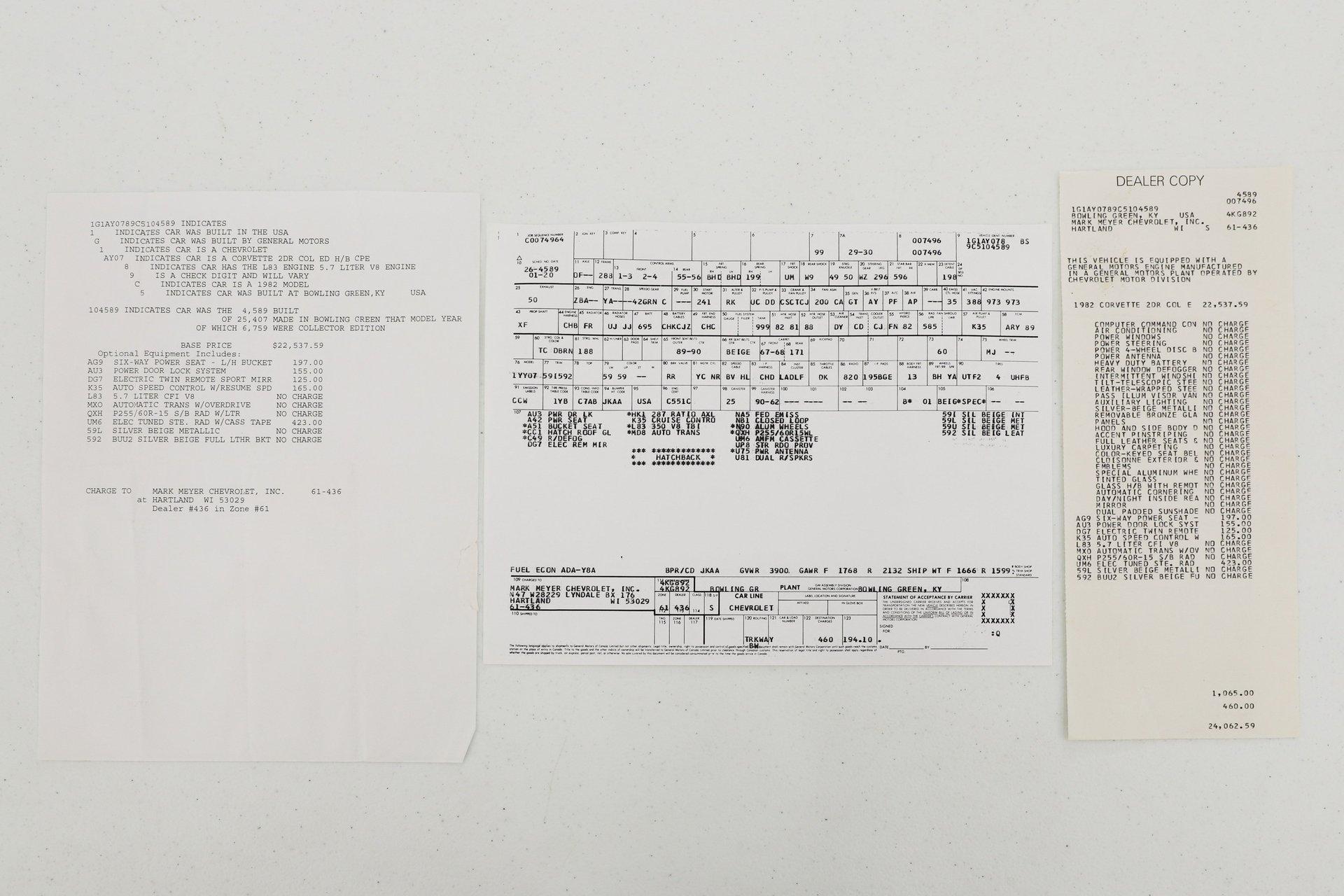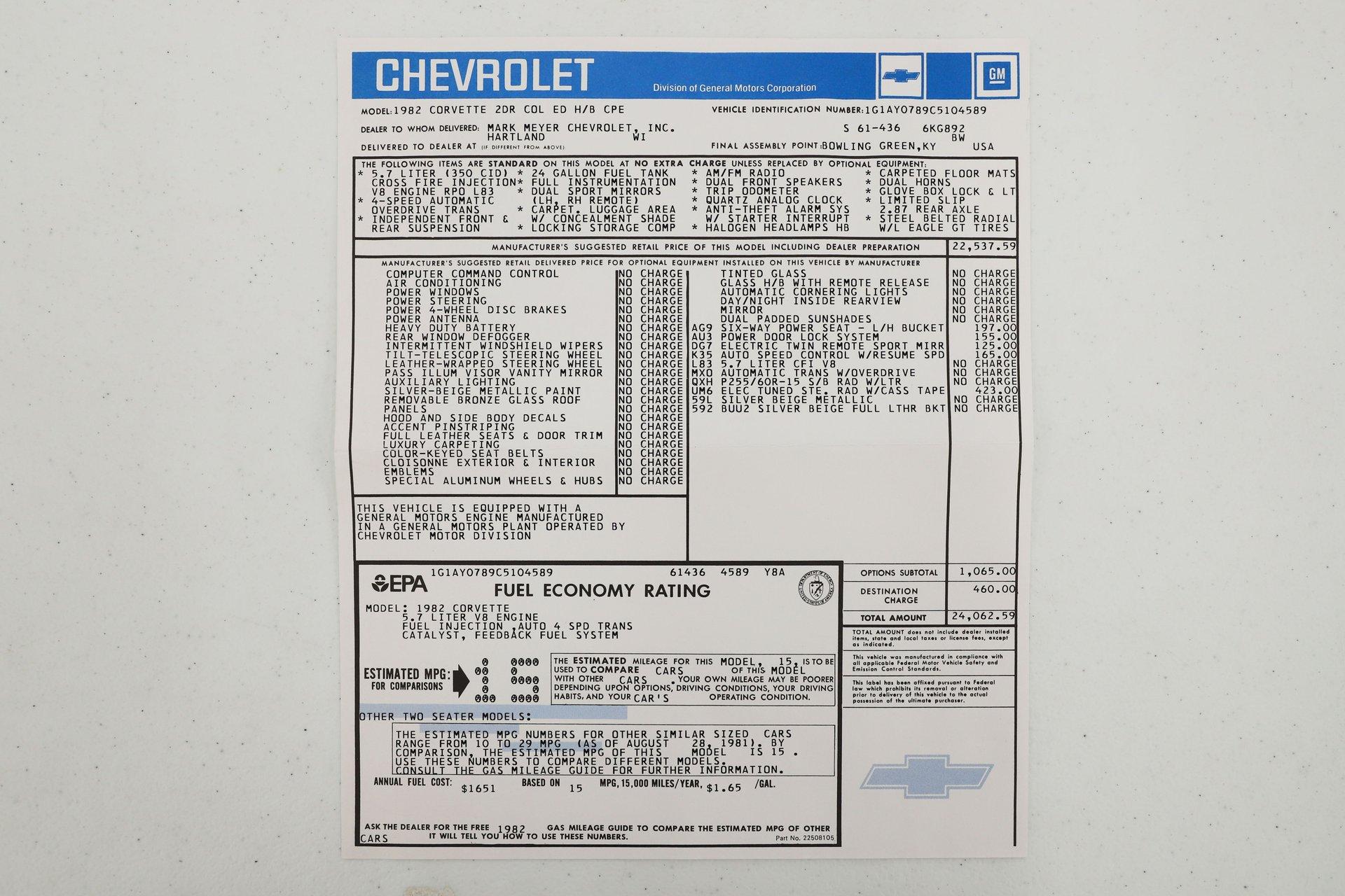 Celebrating our 65 year anniversary! This family owned and operated business was established in 1960, making us the oldest classic car dealership in America. Special thank you to all our customers for entrusting us to park the car of your dreams in your driveway while preserving automotive history for future generations to embrace and enjoy. -Grams family & Volo Museum staff INTRODUCTION: This collector Edition has only 9,512 actual miles. It has been judged with the highest honors a survivor can get. It won Bloomington Gold, Bloomington Survivor, and the coveted Bloomington Benchmark. It has also earned an NCRS Top Flight and the Triple Crown awards. Along with original documentation, the award certificates and judging sheets are included. The Collector Edition: Not only is it loaded with options, it also has several features not available on any other Corvette. The color scheme, wheels, bronze tops, opening hatch window, upgraded carpet and much more is available only on this car. EXTERIOR: Very handsome car, I've always loved the lines on the 80- 82. Unique colors and fade away stripes were only available on the Collector Edition. The body is mint, the original paint still looks practically new. It also has unique bronze tinted glass tops. Unique wheels are made similar to the 1967 optional aluminum wheel. The glass, weatherstrips, bumpers, wheels all look practically new. The power antenna works. The tires are original, if you plan on driving the car they should be replaced. INTERIOR: All original and practically like new. The same color scheme continues inside, multi color seats and door panels. All leather seats, not just the centers like other Vettes. It also has a leather wheel and unique leather horn button. The thicker premium carpet continues on the lower door panels and center console. The console trim is a smokey bronze to match. It's loaded with options and they all appear to be functional. Some features include power seat, windows, locks and mirrors. The digital stereo is another option. It is practically like new inside. ENGINE COMPARTMENT: The first fuel injected Vette since 1965 and the first ever electronic fuel injection. The 350 motor is # matching and completely stock. The smog pump, decals, and finned valve covers are all original. The air cleaner is complete and features cold air induction. It is exceptionally clean, proper and original. Features include air conditioning, cruise control, power steering and power brakes. It is exceptionally clean, proper and original. TRUNK COMPARTMENT: The rear window pops open from inside, this is a first for a Corvette. It has wall to wall thick carpet and has a retractable sunshade. The t-top bags are in the compartment. UNDERSIDE: It's a very well preserved survivor undercarriage. Actually, it's one of the cleaner ones I've seen. It was maintained as needed. It still has its original exhaust with catalytic converter and GM date coded mufflers. Independent suspension front and back, disc brakes at all four wheels. The fiberglass floors are excellent, the spare tire carrier is complete. The bottom of the motor looks clean. It was the first year for the 700R4 overdrive automatic trans. SERVICE: We take pride in our cars and reputation. Therefore, we built a 2 million dollar, 10,000 square ft service center, and hired a team of technicians to service the essentials on every car we sell. CONCLUSION: Here is your chance to own one of the highest honored Collector Edition Corvettes in the country. The awards were achieved in 2005-2008, only 25 miles have been put on since! 10 years from now look in your garage and be happy with your investment, don't look back and think “I should have bought it”! For nearly 30 years, I, Jay Grams, have personally written the highlights for almost every car in our collection. What I provide is my professional opinion based on my experience with these vehicles. However, opinions can vary, and I strongly recommend a personal inspection to form your own view. Our sales team is always available to answer any questions you may have. One great option is to request a personalized walk-around video, where we can showcase the car and share our team’s insights. **Our cars are displayed within a museum setting. If you are interested in a specific vehicle, please schedule an appointment with a salesperson to view it. Without an appointment, there is an admission fee to enter the showroom. If you decide to purchase a car, your admission will be refunded, and you'll receive a one-year museum membership. ☎️ 815 385 3644 9-5 central 📧 Sales@volocars.com Answered ASAP Air conditioning Cruise control Power mirrors Power seat Power windows Power antenna Power locks Digital cassette Tilt-telescopic Bronze glass tops Rear defrost Rear hatch window Aluminum wheels Window sticker Bloomington Gold Bloomington Benchmark Bloomington Survivor NCRS Top Flight Triple Crown