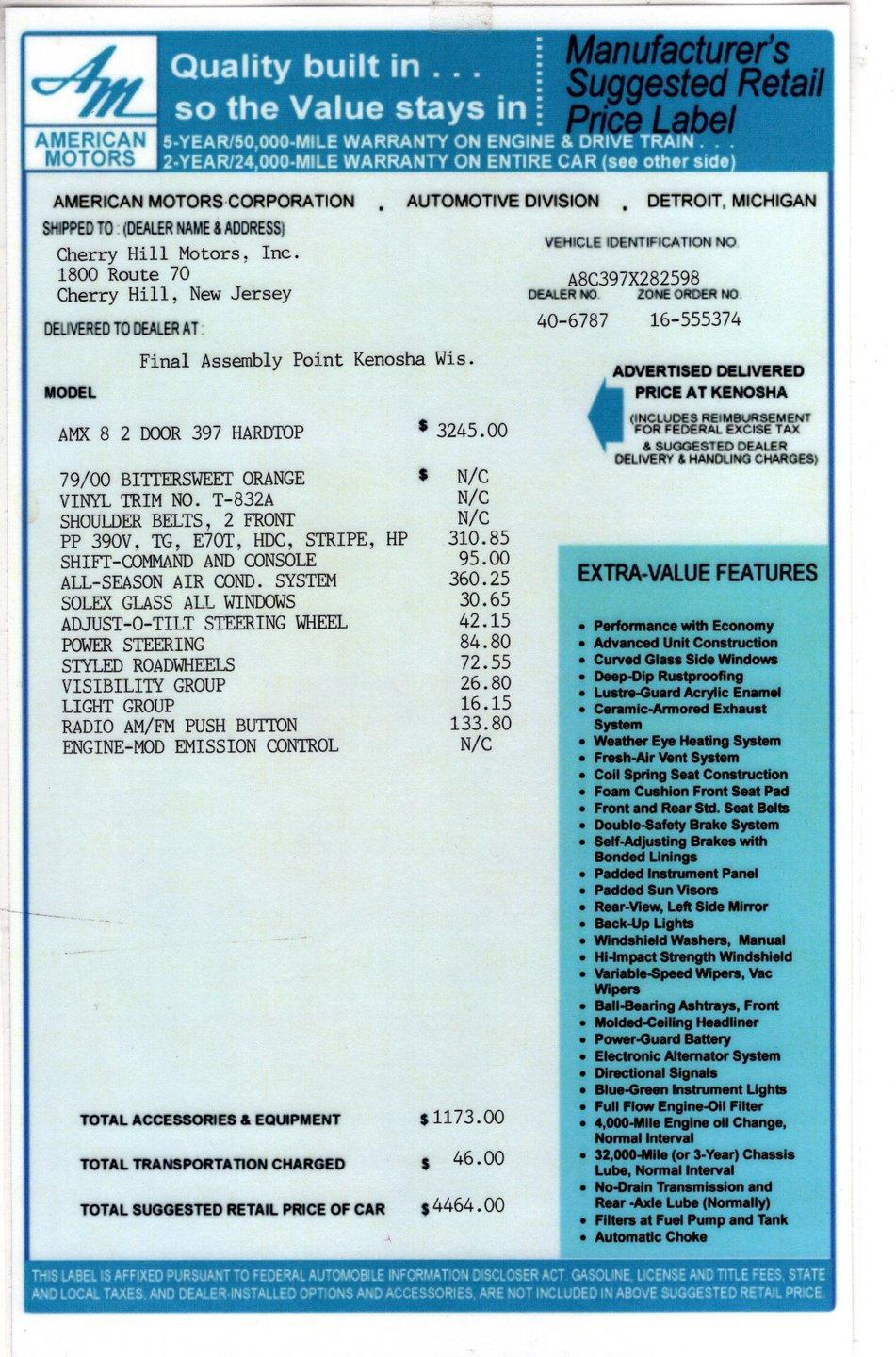 Celebrating our 65 year anniversary! This family owned and operated business was established in 1960, making us the oldest classic car dealership in America. Special thank you to all our customers for entrusting us to park the car of your dreams in your driveway while preserving automotive history for future generations to embrace and enjoy. -Grams family & Volo Museum staff INTRODUCTION: One of the nicest AMXs I've seen! Everyone has been talking about how great this car is. They started with a great car: It was claimed to be a 1 owner from 1976 until recently and garage kept with only 50,000 original miles. Then it was treated to a meticulous restoration. It's also loaded up with options. EXTERIOR: The design is aggressive with its long hood, short sunken trunk and multiple shapes and contours. The body is pristine on this one, it's absolutely straight and fits right. The doors shut like a new car. Repainted its original Bittersweet color, except I bet it didn't look this good when it was new! It is polished like glass and has racing stripes over the top. The chrome and trim looks great including the grille. The Magnum 500 wheels really shine and are wrapped in reproduction redline tires. INTERIOR: I sat in this car and immediately thought, Wow! It is pretty immaculate inside. It has a premium Legendary Interior, it even came with a certificate saying it is concours quality. The door panels, armrests, cushions and upholstery were replaced. The dash area is mint including the gauges, knobs, bezels, heater control panel etc. It features a tachometer, and original Am-Fm stereo. The steering wheel is mint and on a tilt column. Fresh carpet front to back and embroidered mats. The center console is home to the Shift Command shifter. ENGINE COMPARTMENT: It is restored and detailed like new in here too! There are great features in here aside from the 390-315hp motor. It also has power steering, power brakes and factory air conditioning! The manifolds, carb, valve covers and air cleaner is stock. It's complete with the washer fluid bag, battery hold down, heat riser tube, hood insulation, reproduction hoses and clamps. The metal surfaces are painted slick, it's show quality. TRUNK COMPARTMENT: Under the trunk lid and jamb are painted slick. Inside is clean metal with gray spatter finish. The weatherstrip and trunk mat were replaced. It has optional trunk light. Complete with restored collapsible spare with air bottle and jack assembly. UNDERSIDE: The suspension and steering was completely rebuilt and detailed. It has a great sounding dual exhaust with Flowmaster mufflers. The brakes were redone, e-brake is hooked up. Looking up at the motor it is spotless! The Shift Command automatic sends the power through the rebuilt driveshaft to the rear end. The floors look rock solid and are undercoated. It's fresh and proper under this car. SERVICE: We take pride in our cars and reputation. Therefore, we built a 2 million dollar, 10,000 square ft service center, and hired a team of technicians to service the essentials on every car we sell. CONCLUSION: If you are meticulous, this car is for you. Not just compared to AMXs, but compared to any collector car this one is exceptional. Loaded with options, this 2 seat sports car is going to be a pleasure to drive! For nearly 30 years, I, Jay Grams, have personally written the highlights for almost every car in our collection. What I provide is my professional opinion based on my experience with these vehicles. However, opinions can vary, and I strongly recommend a personal inspection to form your own view. Our sales team is always available to answer any questions you may have. One great option is to request a personalized walk-around video, where we can showcase the car and share our team’s insights. **Our cars are displayed within a museum setting. If you are interested in a specific vehicle, please schedule an appointment with a salesperson to view it. Without an appointment, there is an admission fee to enter the showroom. If you decide to purchase a car, your admission will be refunded, and you'll receive a one-year museum membership. ☎️ 815 385 3644 9-5 central 📧 Sales@volocars.com Answered ASAP Air conditioning Power steering Power brakes Console Tilt wheel Visibility group Light group Tachometer Am-Fm Remote mirror Styled wheels Redline tires