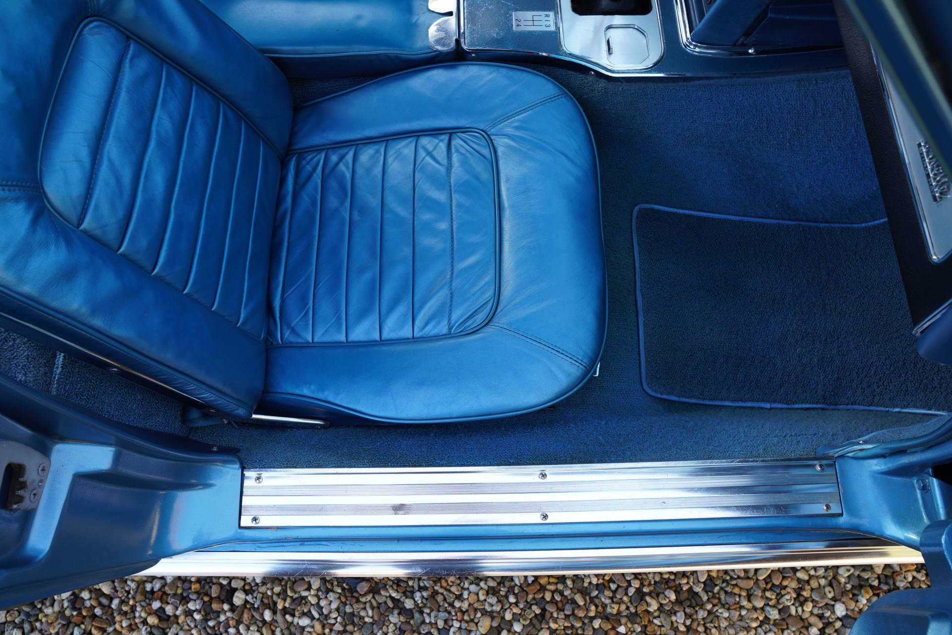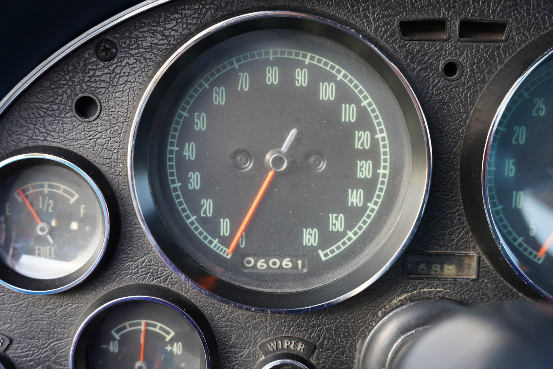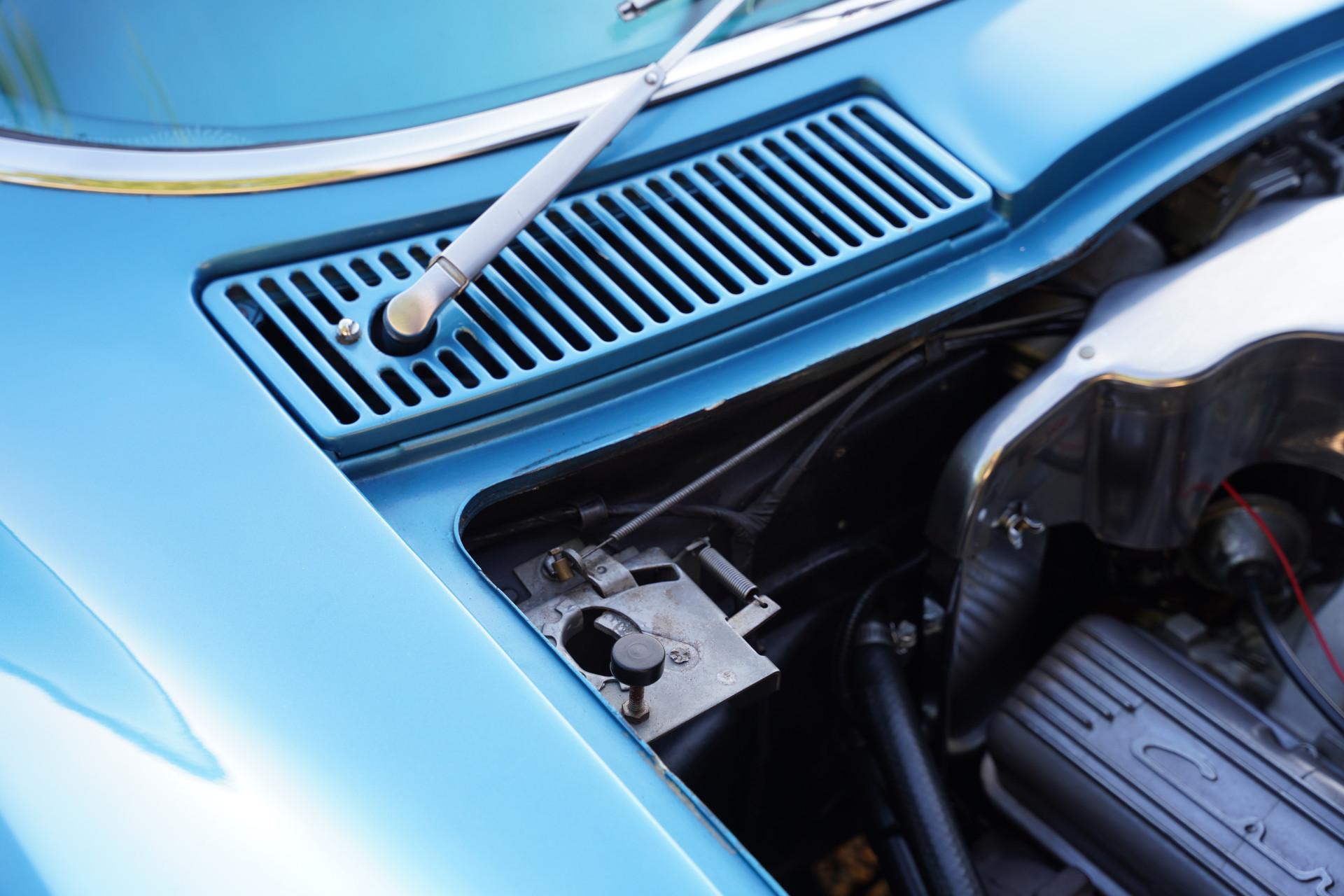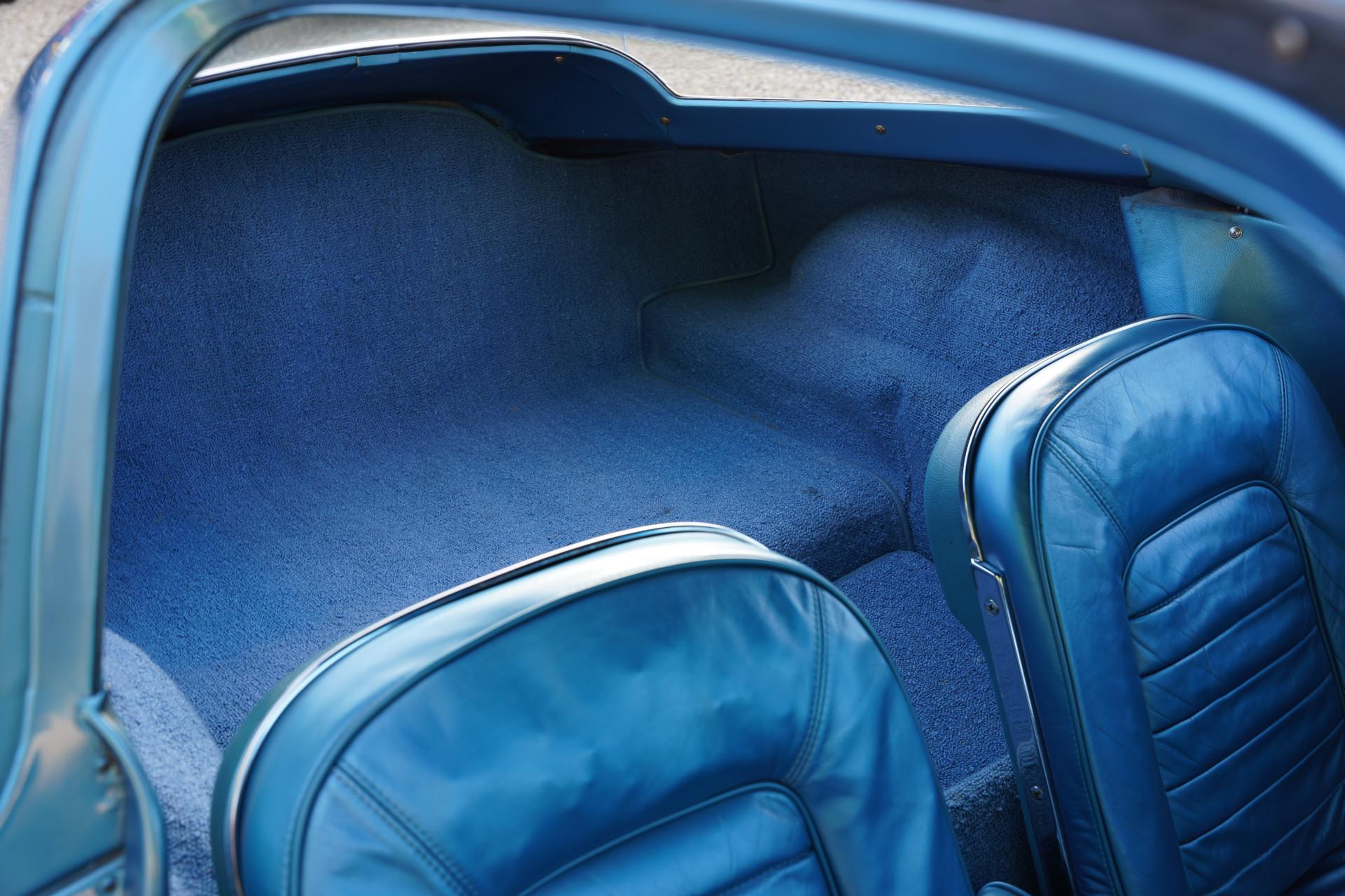 Our car is a bright-blue 1966 coupe and therefore one with a single piece rear window. A beautifully sculpted coupe with its finish complimenting the fresh gleaming brightwork. The fibreglass bodywork is in excellent condition with straight panels, flush closing doors and every detail in its right place. The car has been resprayed in its original colour. Certainly a car that sticks on ones retina.
