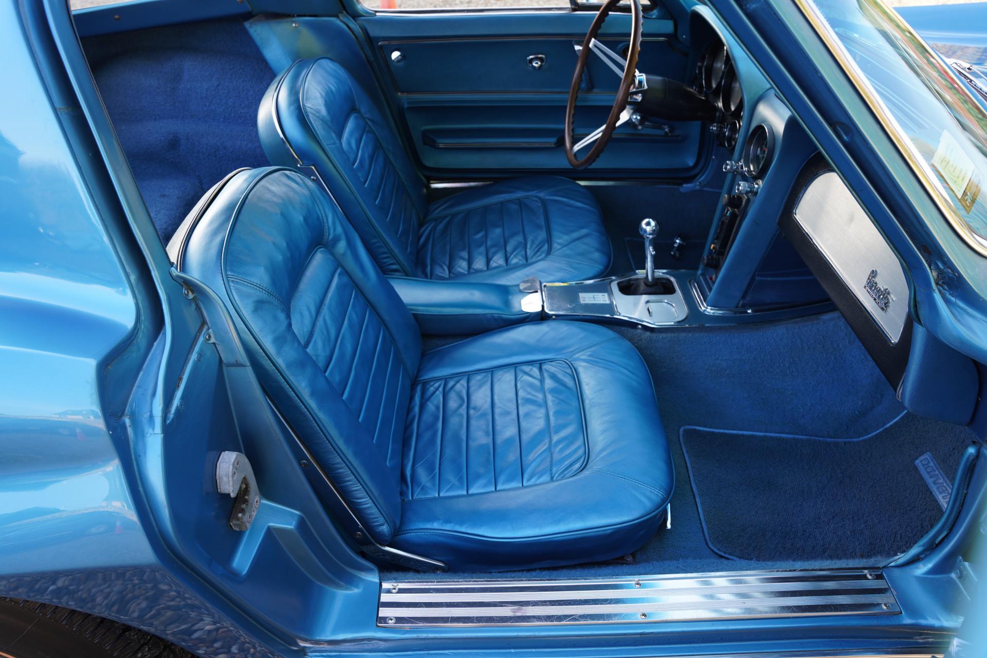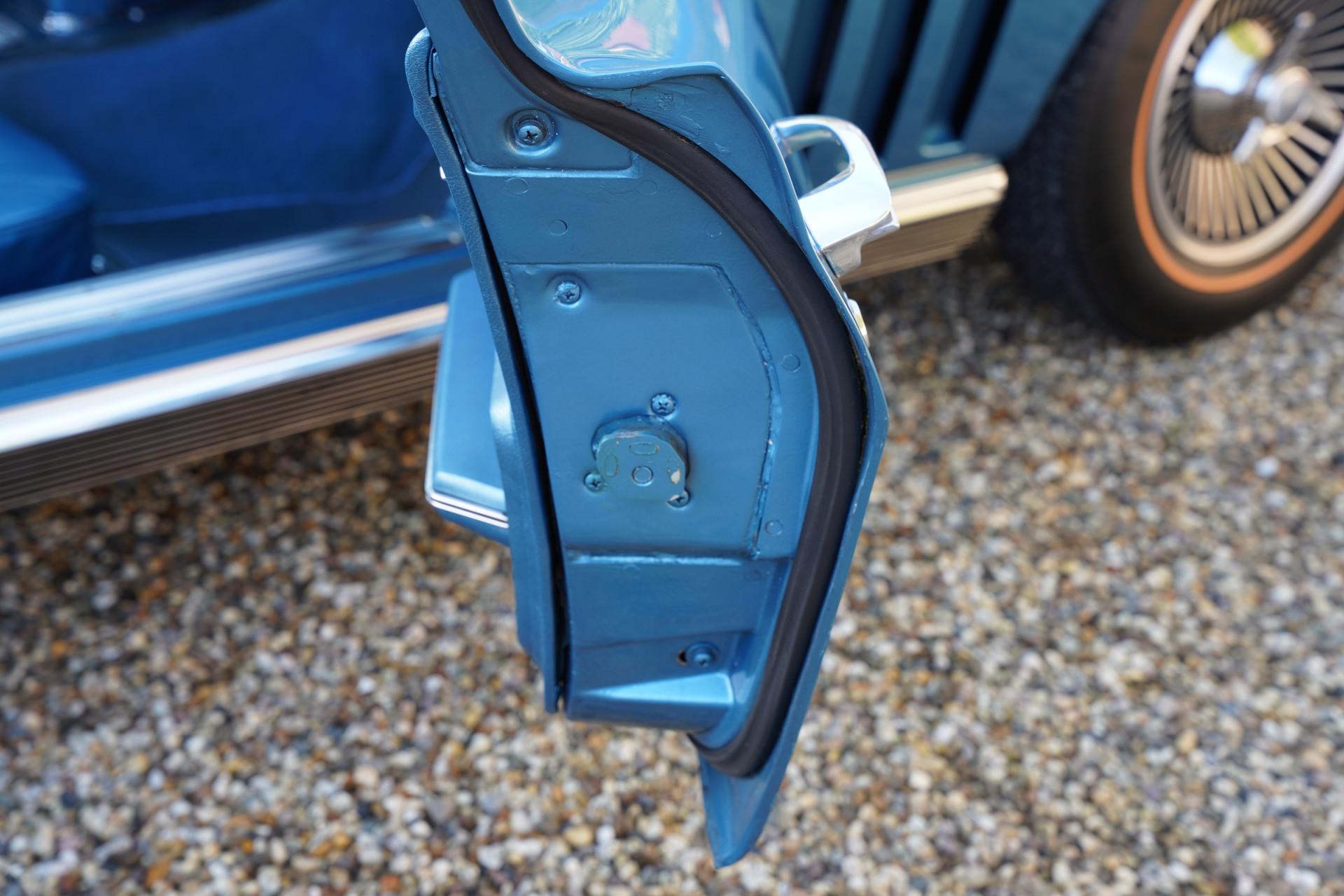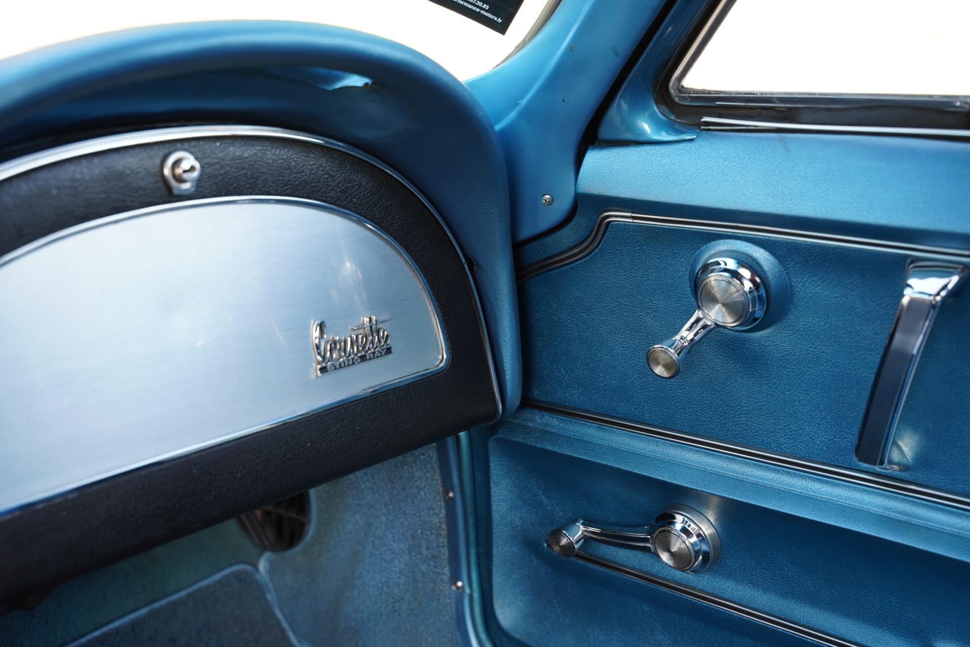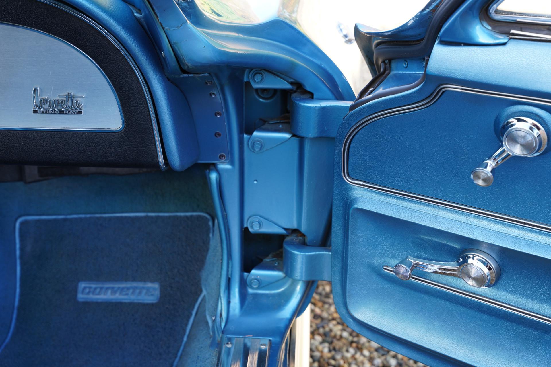 A characteristic features of this generation of Corvette's is the colourful interiors. They were either colour-coded or decked out in a big contrasting trim., This Nassau Blue Sting Ray the choice was clearly in favour of matching metallic blue interior trim. The blue on blue theme is to use one word fantastic! The contrast of a few bits of black and aluminium trim provide a great cabin space to be in, especially with that large wooden steering wheel and you right foot firmly in charge of huge 304 hp 327 V8.