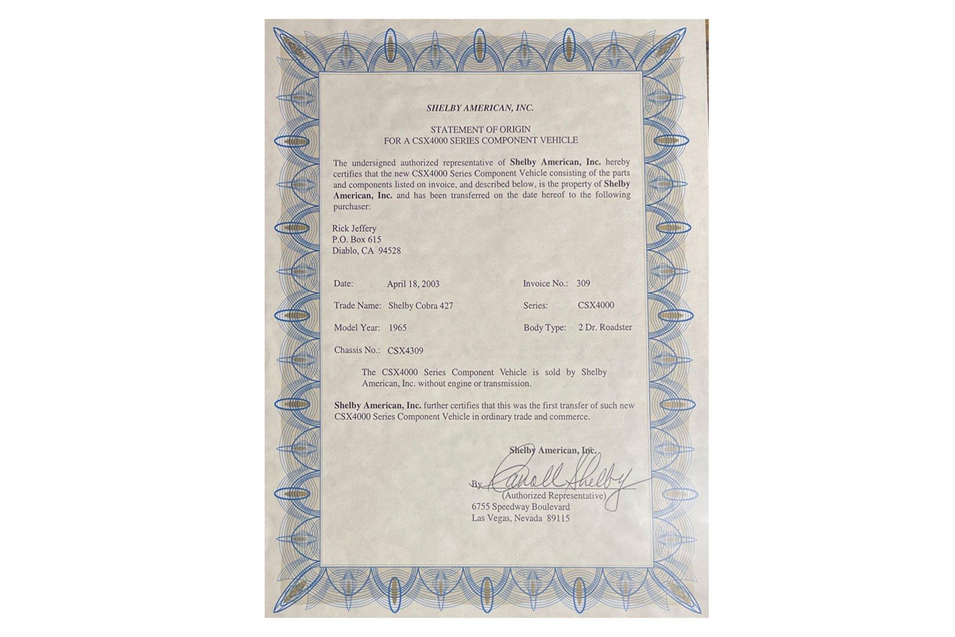Click here to view high resolution photos 1965 Shelby 427 Cobra SC VIN: CSX4309 Genuine factory Shelby Cobra CSX4000 continuation car Rare aluminum-bodied example 6,814 original miles 427 side-oiler aluminum V8 engine Tremec 5-speed manual transmission Regularly maintained by Canepa Titled and registered in California for many years Powerful, lightweight, and an American icon, the Shelby 427 Cobra was the brainchild of sports car builder Carroll Shelby. While the original CSX3000 series of 427 Cobras ended production in 1967, the insatiable appetite for Cobras from the public around the world did not. During this time, many companies tried to make similar examples using Shelby's tried-and-true formula of lightweight cars with massively powerful engines, but they were never true Shelby Cobras. Then in 1996, almost three decades after the last original 427 Cobra rolled off the production line, the new CSX4000 series was born. Now offered by Shelby American, Inc., no Cobra kit or replica manufacturer could offer what the American company now produced: true Shelby authenticity. CSX4000 series cars were offered in both fiberglass and aluminum-bodied forms with the aluminum examples being rare, almost doubling the purchase price of the car due to their labor-intensive hand-formed panels. These Shelby Cobras were delivered to authorized dealers as rolling chassis for final fitment of the engine and transmission, allowing the new owner to choose a power plant and transmission of their choice. This 1965 Shelby 427 Cobra S/C was purchased by its original owner, Rick Jeffery of Diablo, CA, from Shelby American on April 18th, 2003. CSX4309 was specified with the rare and labor-intensive all-aluminum body, high-performance 427 aluminum engine, paired with a 5-speed Tremec manual transmission. With the upgraded 5-speed, highway driving is far more enjoyable and makes this Cobra the perfect road car. In 2008 it was acquired by its second and longest caretaker, retired Chief Judge of Pebble Beach Concours d’Elegance, Ed Gilbertson. Ed Gilbertson has been a major contributor and been invaluable to the car community, and continues to share his immense knowledge through different publications across several car marques including Ferrari and Shelby. After years of looking for the right Shelby Cobra, Gilbertson found the perfect car just a few miles away from his hometown of San Francisco in the form of CSX4309. A fastidious owner, he ensured that his Cobra was maintained at the highest level at all times, and charged the Canepa team with ensuring the correct care throughout his ownership of 13 years. Driving the car regularly, he enjoyed the performance and handling on many of California’s backroads. When it was time for Gilbertson to hand the keys to the next caretaker, he immediately turned to Bruce Canepa. Bruce, who is a longtime enthusiast of Shelby Cobras and the owner of CSX3360 which is the last original series Shelby Cobra ever built, was an obvious choice. From enthusiast to enthusiast, Ed Gilbertson knew that Bruce would find someone who would appreciate and enjoy his Cobra as much as he did. Upon arrival at Canepa in 2021, the car was put through the “Canepa Difference” process to ensure everything about the car was in excellent condition. Having performed the service work on the car for the last 13 years under Ed Gilbertson’s ownership, the car was in excellent mechanical condition. The rest of the car was hand cleaned and polished, ensuring all of the period-correct finishes and components were presented in like-new condition. Bruce also added his personal design touch to the 427 Cobra in the form of changing the angle of the windshield 4 degrees similar to race-spec Cobras, and lowering and aligning the suspension to get the perfect stance. It’s not surprising then that shortly after the updates were completed that the Cobra found a new caretaker, who kept the car for a little over 4 years as part of their automotive collection and added only 53 miles. Upon return to Canepa recently, the odometer reads just 6,814 original miles. Legends never die, and nothing more true can be said about the Shelby 427 Cobra S/C. With Shelby American keeping the Cobra alive and well with updated mechanicals but accurate visuals, this is one of the most enjoyable ways to experience the Shelby Cobra. With just 6,814 miles, the rare all-aluminum body, 427 side-oiler aluminum V8 engine, and a 5-speed manual transmission, this 1965 Shelby 427 Cobra S/C has plenty of power and personality to get into whatever kind of trouble you want to be in.