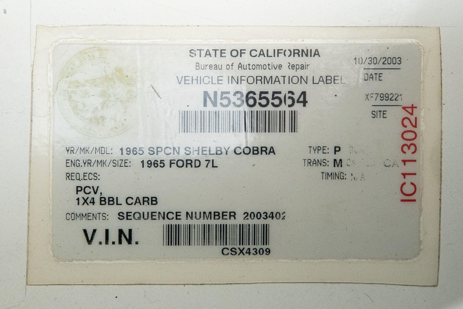 Click here to view high resolution photos 1965 Shelby 427 Cobra SC VIN: CSX4309 Genuine factory Shelby Cobra CSX4000 continuation car Rare aluminum-bodied example 6,814 original miles 427 side-oiler aluminum V8 engine Tremec 5-speed manual transmission Regularly maintained by Canepa Titled and registered in California for many years Powerful, lightweight, and an American icon, the Shelby 427 Cobra was the brainchild of sports car builder Carroll Shelby. While the original CSX3000 series of 427 Cobras ended production in 1967, the insatiable appetite for Cobras from the public around the world did not. During this time, many companies tried to make similar examples using Shelby's tried-and-true formula of lightweight cars with massively powerful engines, but they were never true Shelby Cobras. Then in 1996, almost three decades after the last original 427 Cobra rolled off the production line, the new CSX4000 series was born. Now offered by Shelby American, Inc., no Cobra kit or replica manufacturer could offer what the American company now produced: true Shelby authenticity. CSX4000 series cars were offered in both fiberglass and aluminum-bodied forms with the aluminum examples being rare, almost doubling the purchase price of the car due to their labor-intensive hand-formed panels. These Shelby Cobras were delivered to authorized dealers as rolling chassis for final fitment of the engine and transmission, allowing the new owner to choose a power plant and transmission of their choice. This 1965 Shelby 427 Cobra S/C was purchased by its original owner, Rick Jeffery of Diablo, CA, from Shelby American on April 18th, 2003. CSX4309 was specified with the rare and labor-intensive all-aluminum body, high-performance 427 aluminum engine, paired with a 5-speed Tremec manual transmission. With the upgraded 5-speed, highway driving is far more enjoyable and makes this Cobra the perfect road car. In 2008 it was acquired by its second and longest caretaker, retired Chief Judge of Pebble Beach Concours d’Elegance, Ed Gilbertson. Ed Gilbertson has been a major contributor and been invaluable to the car community, and continues to share his immense knowledge through different publications across several car marques including Ferrari and Shelby. After years of looking for the right Shelby Cobra, Gilbertson found the perfect car just a few miles away from his hometown of San Francisco in the form of CSX4309. A fastidious owner, he ensured that his Cobra was maintained at the highest level at all times, and charged the Canepa team with ensuring the correct care throughout his ownership of 13 years. Driving the car regularly, he enjoyed the performance and handling on many of California’s backroads. When it was time for Gilbertson to hand the keys to the next caretaker, he immediately turned to Bruce Canepa. Bruce, who is a longtime enthusiast of Shelby Cobras and the owner of CSX3360 which is the last original series Shelby Cobra ever built, was an obvious choice. From enthusiast to enthusiast, Ed Gilbertson knew that Bruce would find someone who would appreciate and enjoy his Cobra as much as he did. Upon arrival at Canepa in 2021, the car was put through the “Canepa Difference” process to ensure everything about the car was in excellent condition. Having performed the service work on the car for the last 13 years under Ed Gilbertson’s ownership, the car was in excellent mechanical condition. The rest of the car was hand cleaned and polished, ensuring all of the period-correct finishes and components were presented in like-new condition. Bruce also added his personal design touch to the 427 Cobra in the form of changing the angle of the windshield 4 degrees similar to race-spec Cobras, and lowering and aligning the suspension to get the perfect stance. It’s not surprising then that shortly after the updates were completed that the Cobra found a new caretaker, who kept the car for a little over 4 years as part of their automotive collection and added only 53 miles. Upon return to Canepa recently, the odometer reads just 6,814 original miles. Legends never die, and nothing more true can be said about the Shelby 427 Cobra S/C. With Shelby American keeping the Cobra alive and well with updated mechanicals but accurate visuals, this is one of the most enjoyable ways to experience the Shelby Cobra. With just 6,814 miles, the rare all-aluminum body, 427 side-oiler aluminum V8 engine, and a 5-speed manual transmission, this 1965 Shelby 427 Cobra S/C has plenty of power and personality to get into whatever kind of trouble you want to be in.