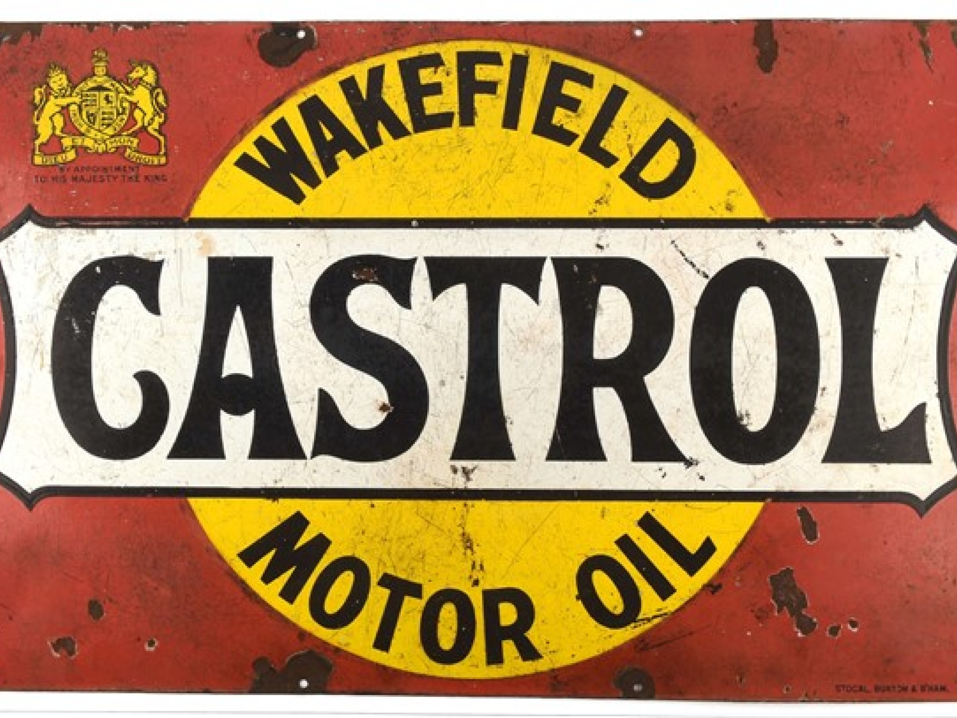 Original Wakefield Castrol Motor Oil Enamel Sign "By Appointment to his Majesty The King" Circa 1920's. Highly collectible vintage advertising sign. 76cms x 51cms.