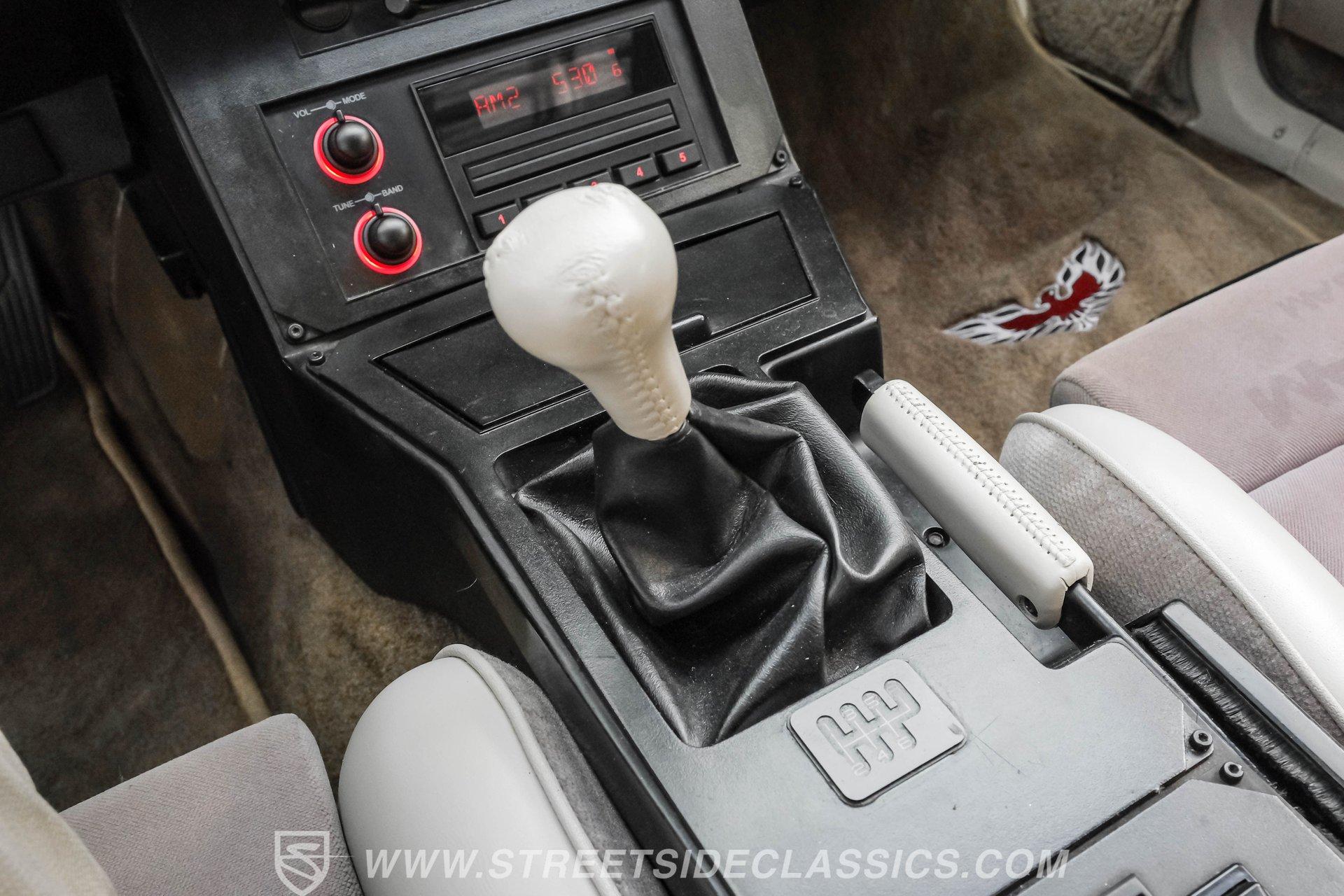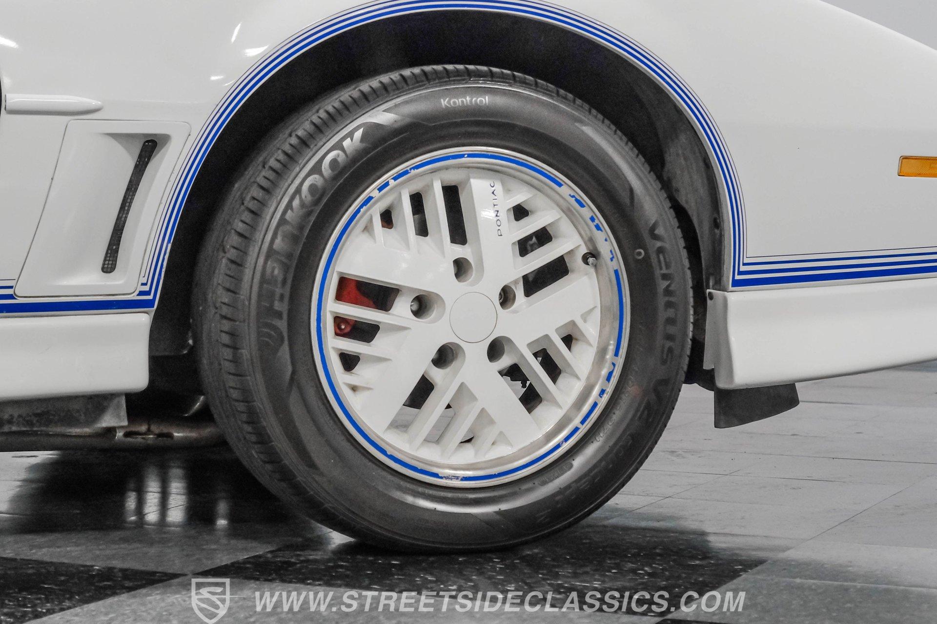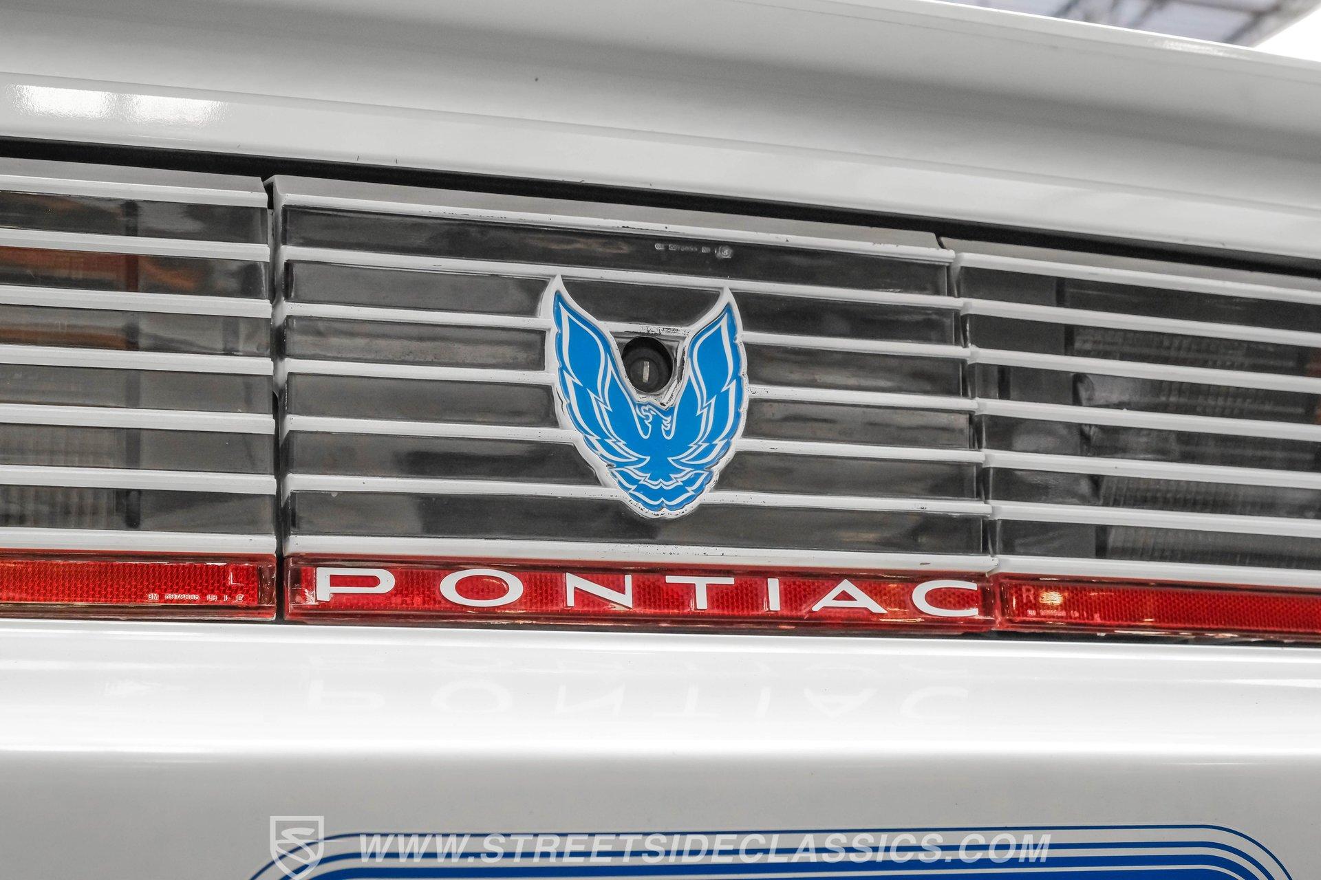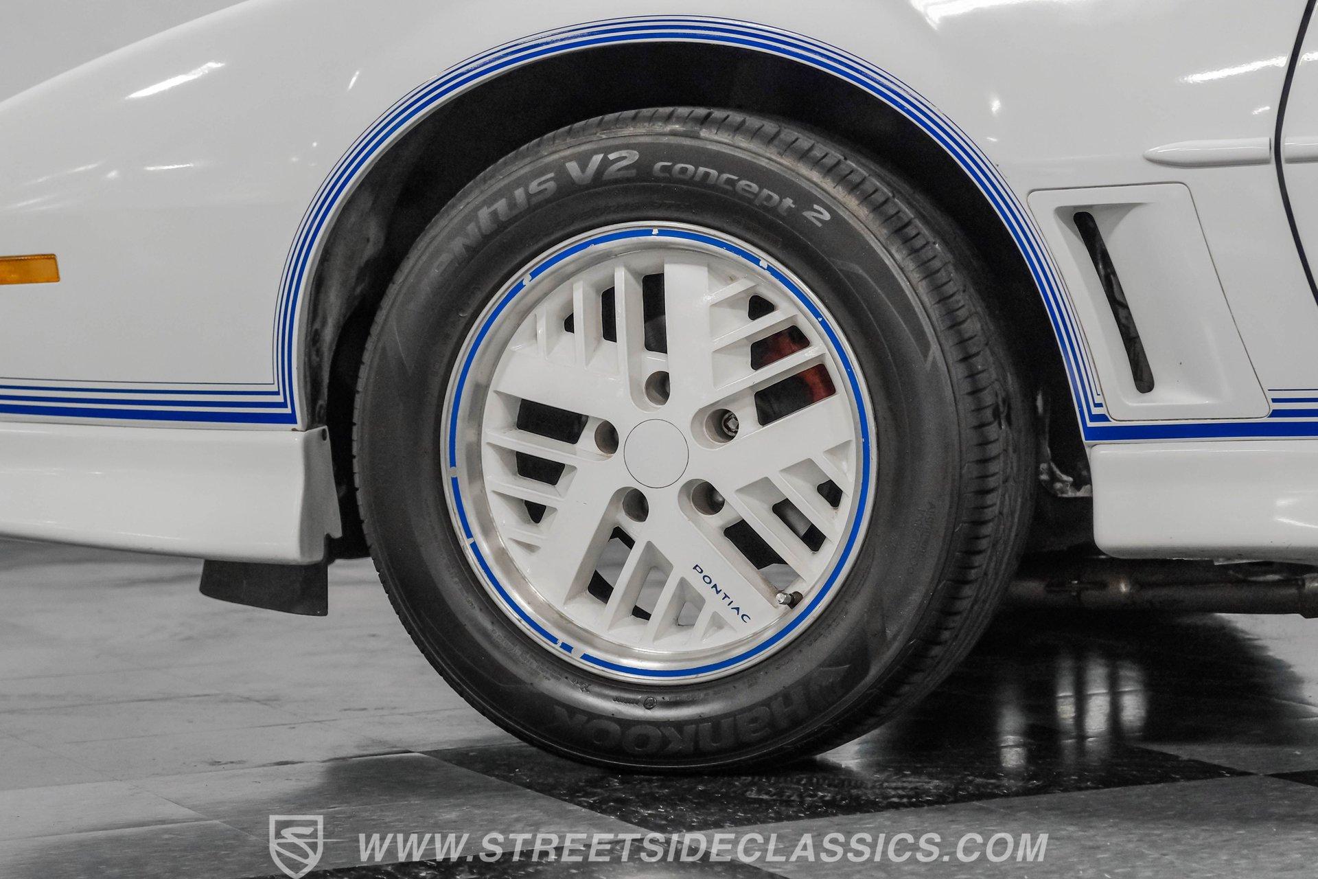 Let's face it: so many of us fell in love with the Pontiac Firebird because of the show Knight Rider. Though the legendary David Hasselhoff will always be beloved, for us car enthusiasts, K.I.T.T. was the real star of that show. One look at this 1984 Pontiac Firebird Trans Am 15th Anniversary Restomod should make it easy to understand why we were so obsessed. With its full factory-correct Cotillion White repaint, light blue accent decals, and always-cool T-top configuration, this one of only 1,500 Anniversary Editions has Hollywood exceptional good looks and plenty of star power to make it stand out wherever it goes. Inside, a factory console separates a pair of genuine replacement Anniversary Edition Recaro bucket seats, wrapped in leather with cloth inserts. A three-spoke, power-assisted tilt wheel sits just ahead of an 80 mph speedometer and an 8,000 rpm tachometer. At the same time, a pair of auxiliary gauges each pulls double duty with their driver feedback. Power windows, locks, and mirrors, along with air conditioning, provide all the modern amenities anyone could want in the mid-1980s. A Newport retro-style AM/FM/AUX Bluetooth head unit powers dual Infinity subwoofers and a Rockford Fosgate amplifier. Under that expansive hood, we find a naturally aspirated 5.3-liter overhead valve V-8 engine. This Gen IV block is topped with high-flow 243 aluminum heads and a TSP performance camshaft. Spent gases are disposed of through a set of Hedman long-tube headers, while MagnaFlow mufflers give this Firebird a sound like a real mythological creature. Power from that small block is funneled through a Tremec T56 six-speed manual transmission before being sent out to a 3.73-geared rear end. HIGHLIGHTS: One of 1500 Made Full Factory Correct Cotillion White Repaint Blue Decals T-Tops 5.3-Liter V8 243 Heads TSP Performance Cam Long Tubes MagnaFlow Mufflers Tremec T56 Six Speed 3.73 Rear Four Wheel Power Discs Power Steering Replacement Anniversary Recaro Seats Factory Console Tilt Wheel Power Windows Power Locks Power Mirrors Retro Style Radio Bluetooth Dual Infinity Subs Rockford Fosgate Amp Receipts Owner's Manual This 1984 Pontiac Firebird Trans Am 15th Anniversary Restomod rides on a factory-style suspension, while four-wheel power disc brakes stand ready to scrub off speed at a moment's notice. If your love for K.I.T.T. still fuels your passion for a third-gen Firebird, this is your chance to own a car that even Michael Knight would envy. Don't wait, call today!