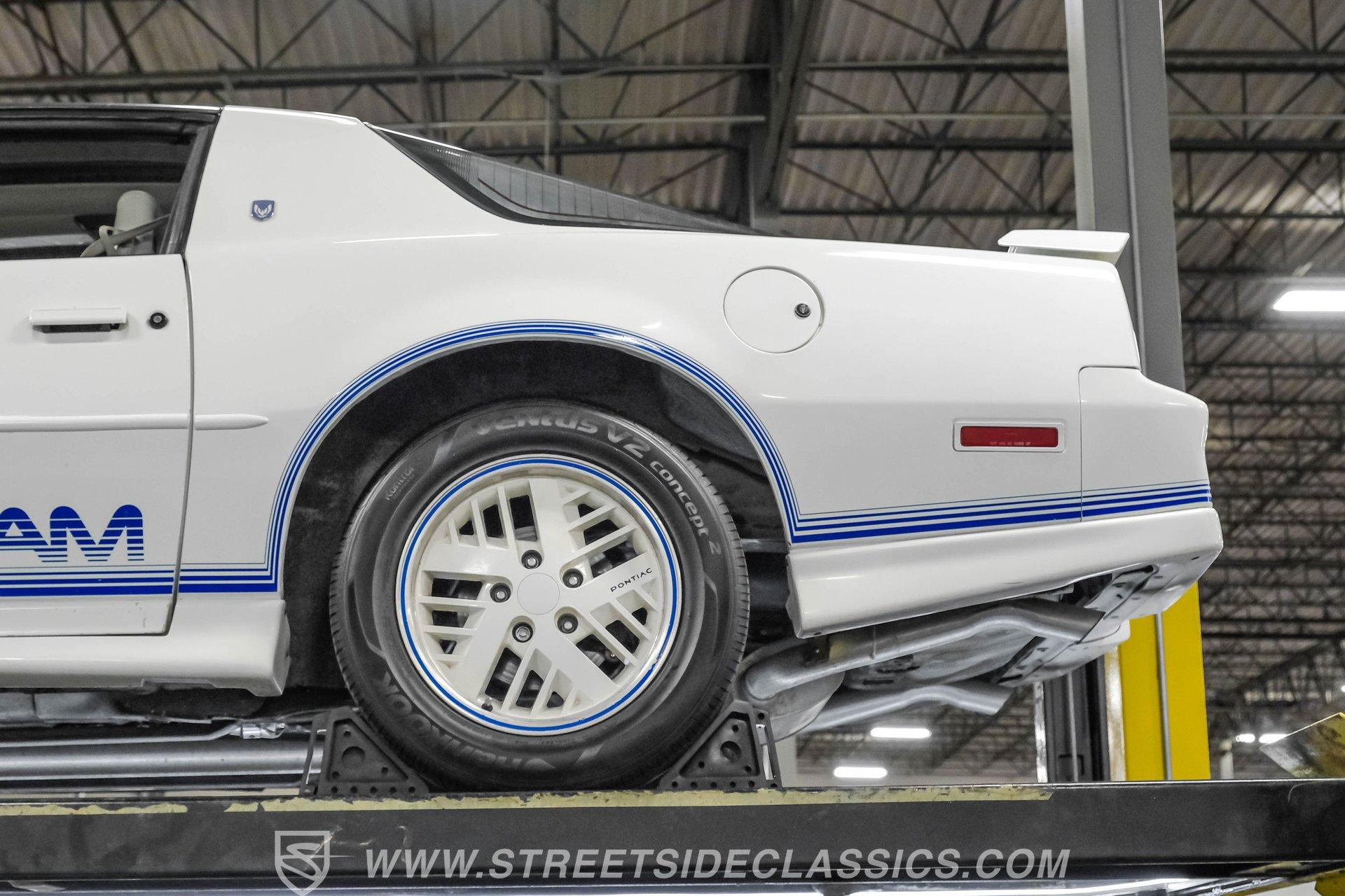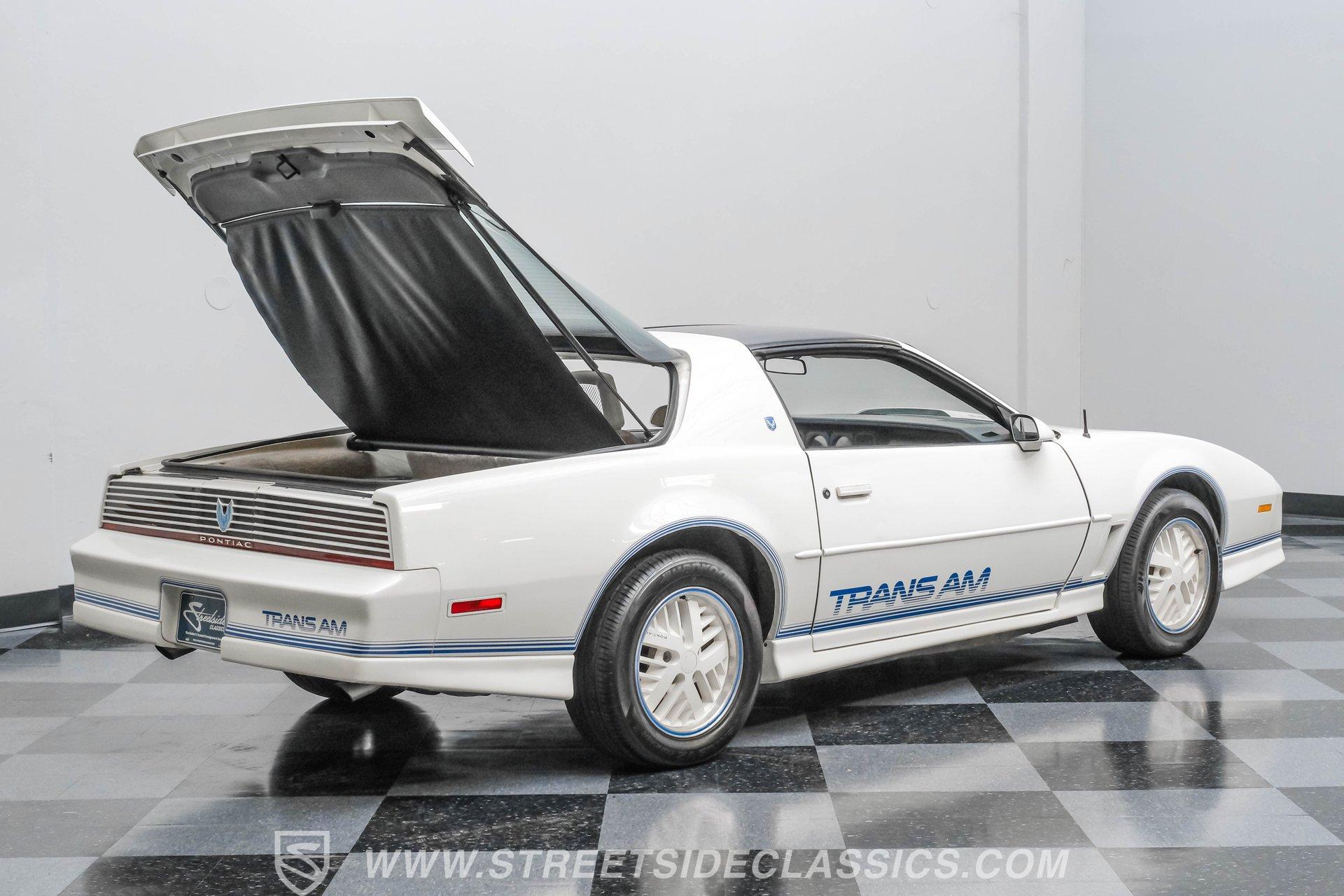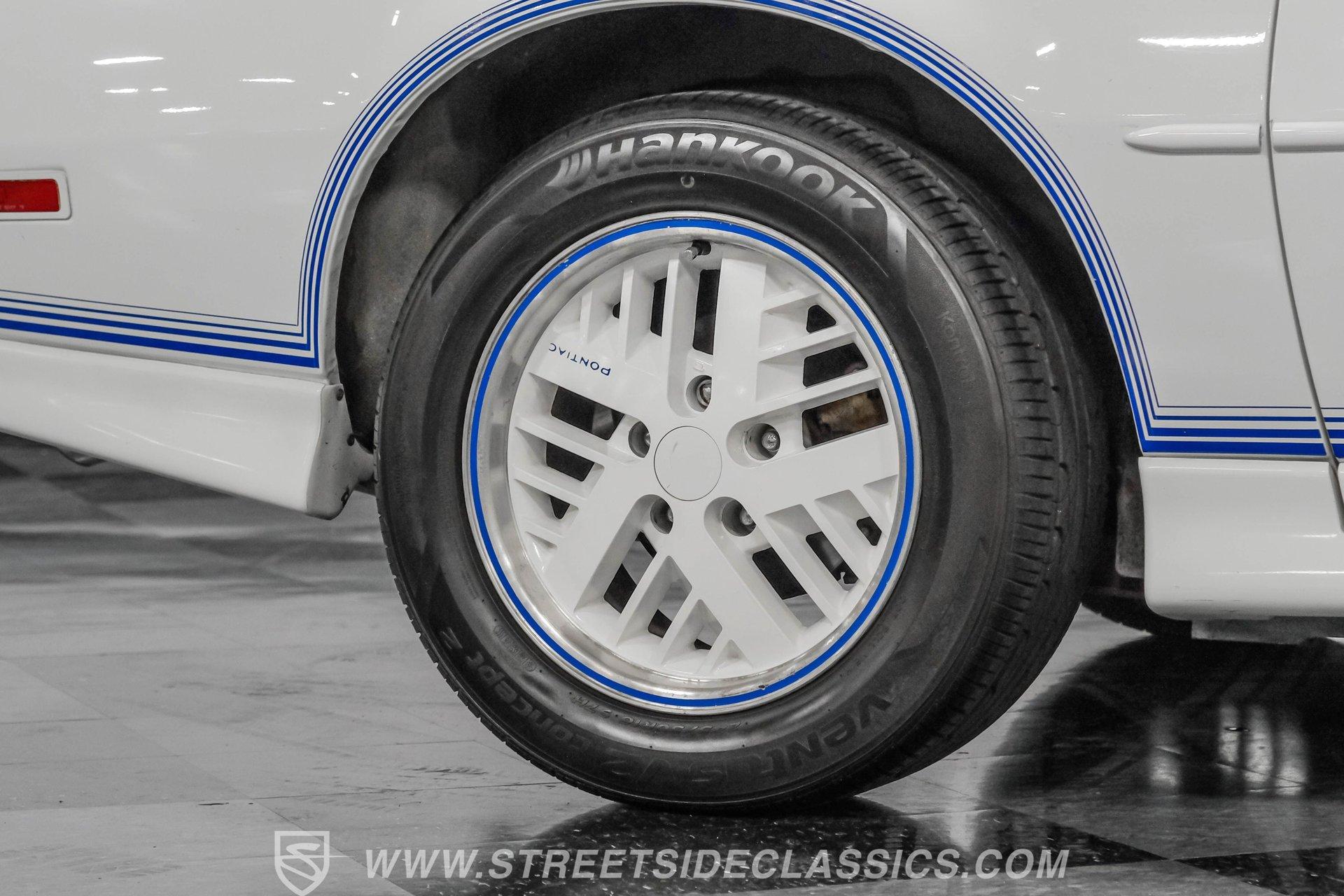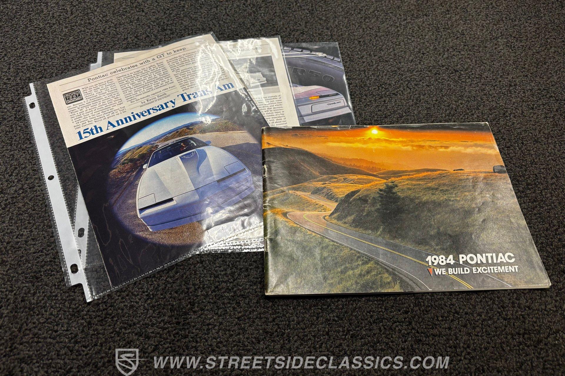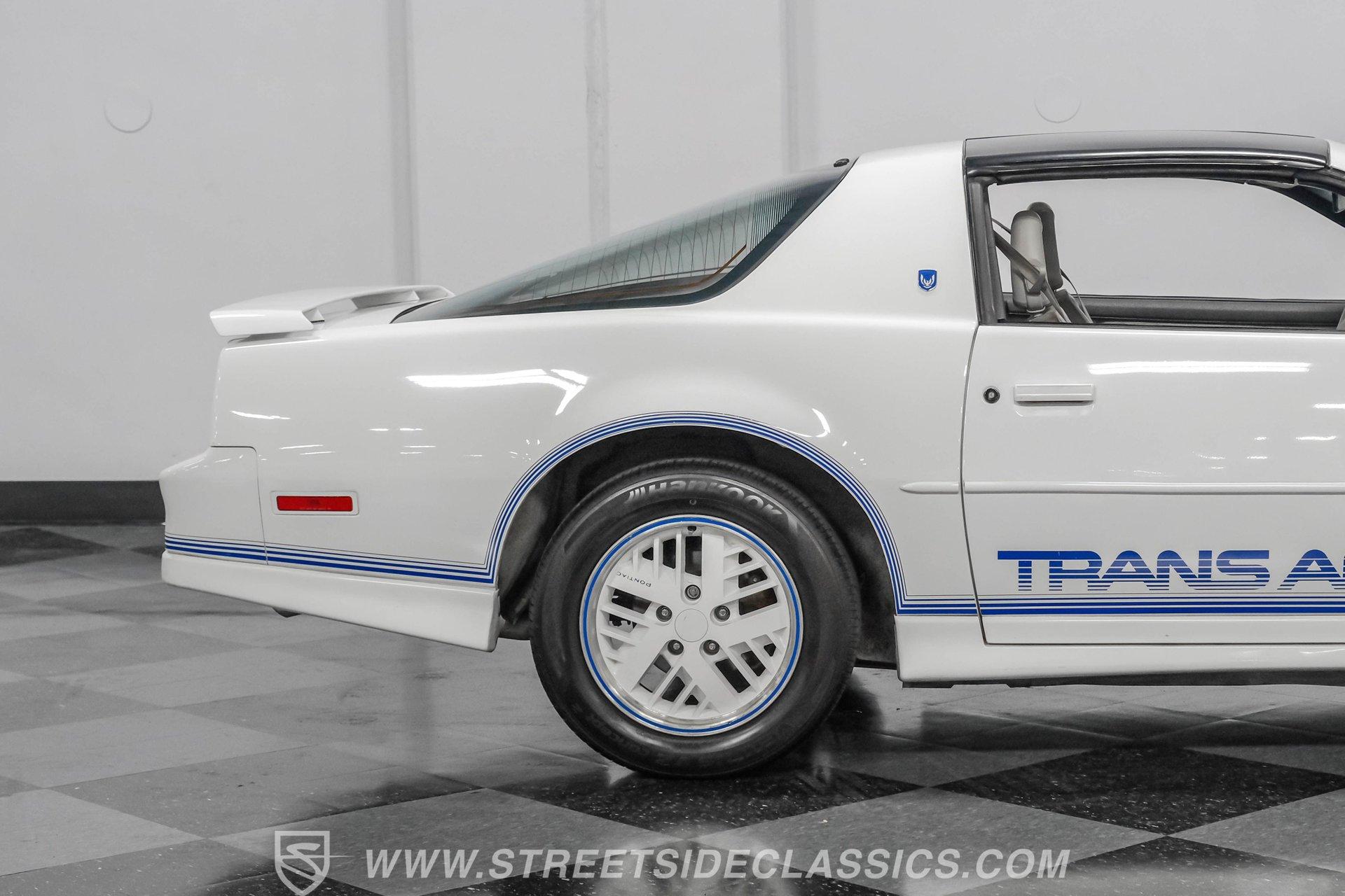 Let's face it: so many of us fell in love with the Pontiac Firebird because of the show Knight Rider. Though the legendary David Hasselhoff will always be beloved, for us car enthusiasts, K.I.T.T. was the real star of that show. One look at this 1984 Pontiac Firebird Trans Am 15th Anniversary Restomod should make it easy to understand why we were so obsessed. With its full factory-correct Cotillion White repaint, light blue accent decals, and always-cool T-top configuration, this one of only 1,500 Anniversary Editions has Hollywood exceptional good looks and plenty of star power to make it stand out wherever it goes. Inside, a factory console separates a pair of genuine replacement Anniversary Edition Recaro bucket seats, wrapped in leather with cloth inserts. A three-spoke, power-assisted tilt wheel sits just ahead of an 80 mph speedometer and an 8,000 rpm tachometer. At the same time, a pair of auxiliary gauges each pulls double duty with their driver feedback. Power windows, locks, and mirrors, along with air conditioning, provide all the modern amenities anyone could want in the mid-1980s. A Newport retro-style AM/FM/AUX Bluetooth head unit powers dual Infinity subwoofers and a Rockford Fosgate amplifier. Under that expansive hood, we find a naturally aspirated 5.3-liter overhead valve V-8 engine. This Gen IV block is topped with high-flow 243 aluminum heads and a TSP performance camshaft. Spent gases are disposed of through a set of Hedman long-tube headers, while MagnaFlow mufflers give this Firebird a sound like a real mythological creature. Power from that small block is funneled through a Tremec T56 six-speed manual transmission before being sent out to a 3.73-geared rear end. HIGHLIGHTS: One of 1500 Made Full Factory Correct Cotillion White Repaint Blue Decals T-Tops 5.3-Liter V8 243 Heads TSP Performance Cam Long Tubes MagnaFlow Mufflers Tremec T56 Six Speed 3.73 Rear Four Wheel Power Discs Power Steering Replacement Anniversary Recaro Seats Factory Console Tilt Wheel Power Windows Power Locks Power Mirrors Retro Style Radio Bluetooth Dual Infinity Subs Rockford Fosgate Amp Receipts Owner's Manual This 1984 Pontiac Firebird Trans Am 15th Anniversary Restomod rides on a factory-style suspension, while four-wheel power disc brakes stand ready to scrub off speed at a moment's notice. If your love for K.I.T.T. still fuels your passion for a third-gen Firebird, this is your chance to own a car that even Michael Knight would envy. Don't wait, call today!