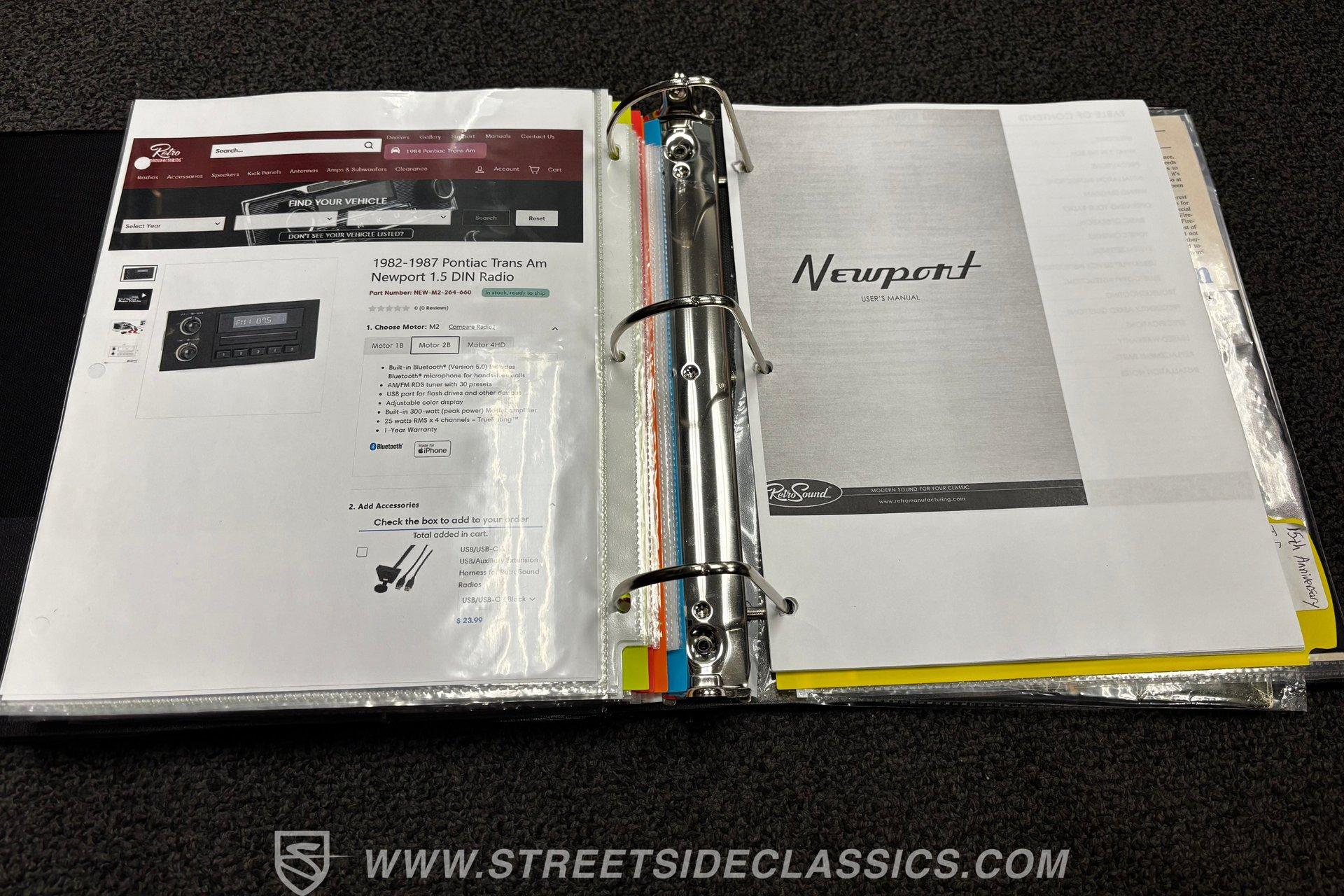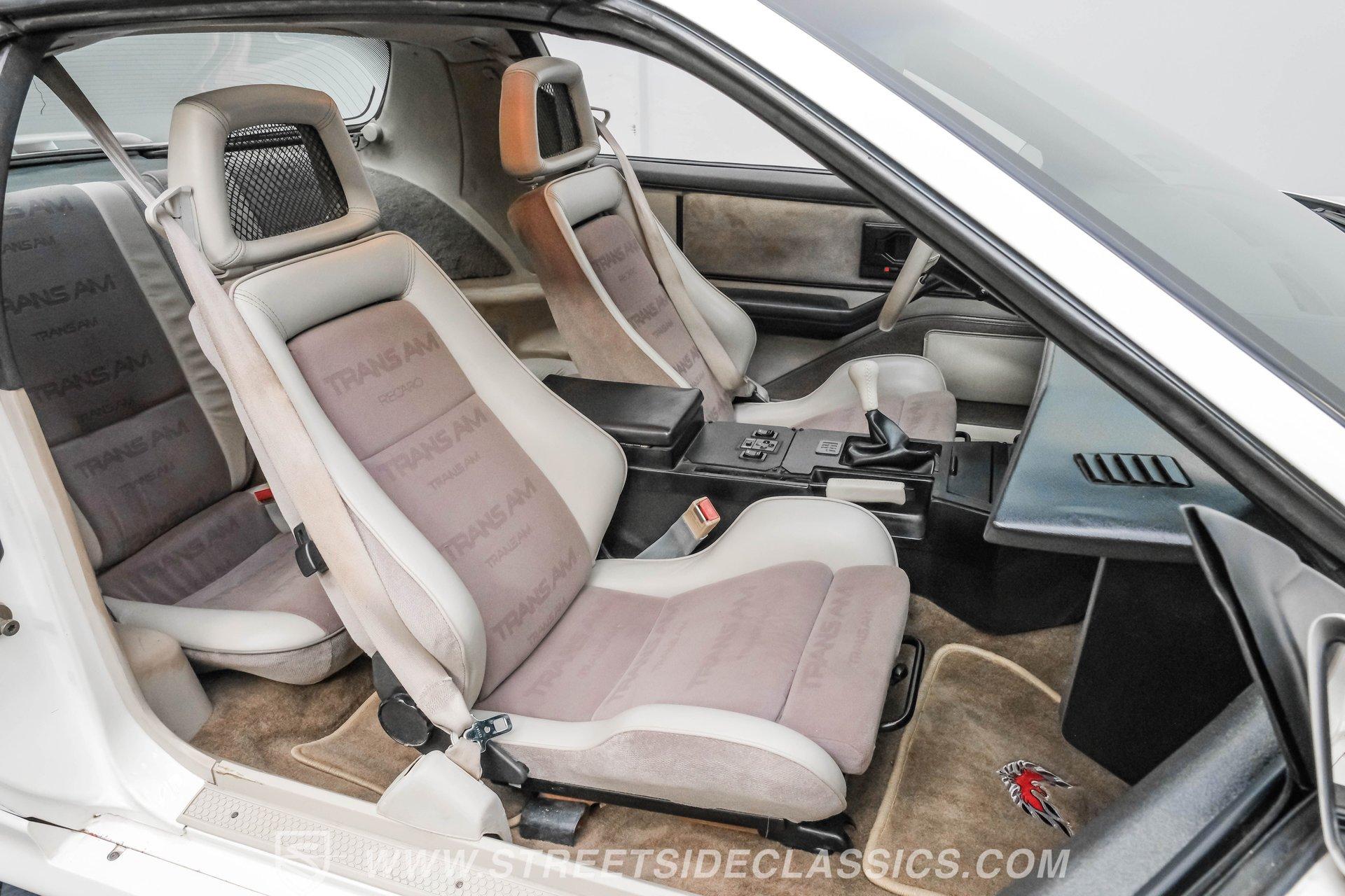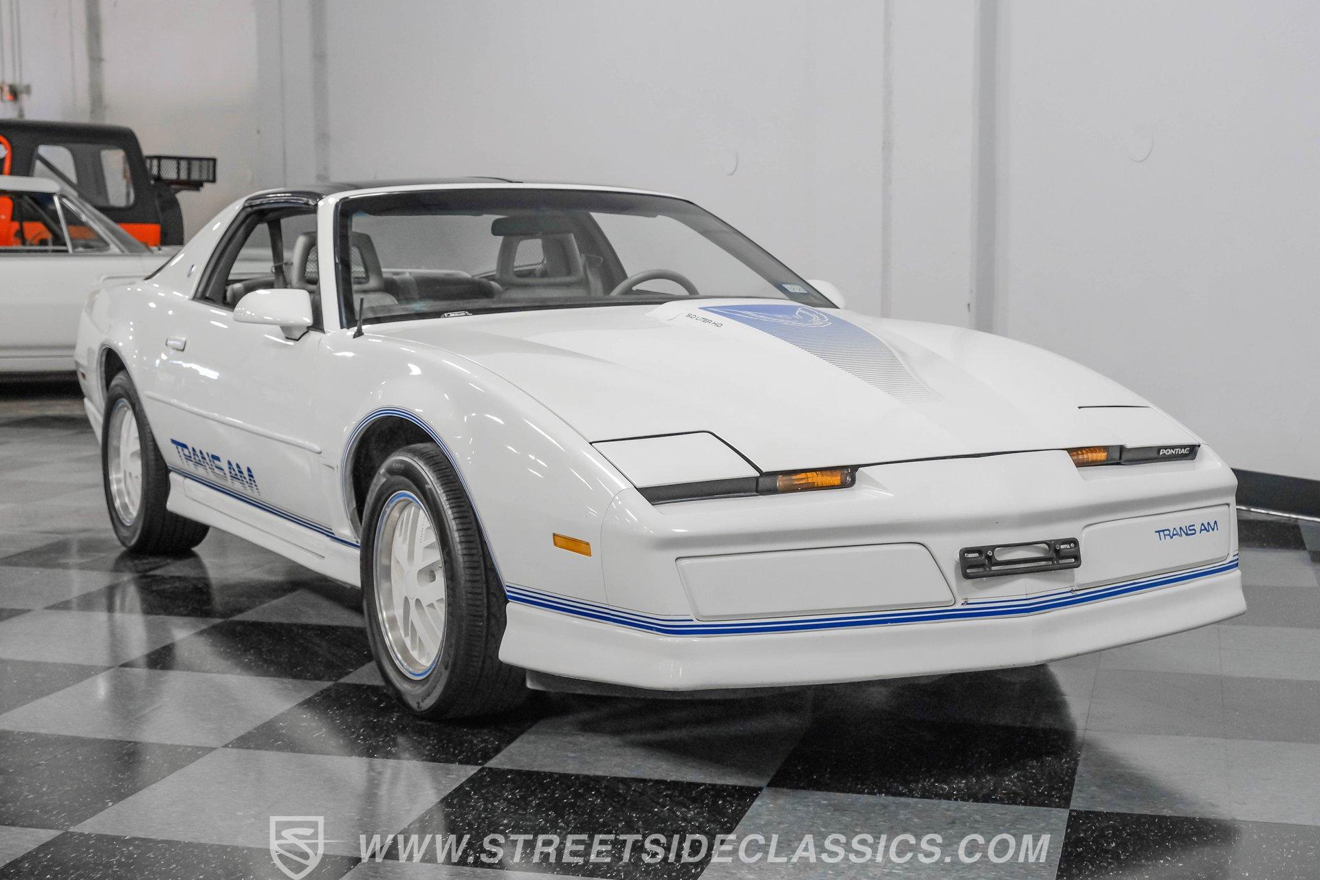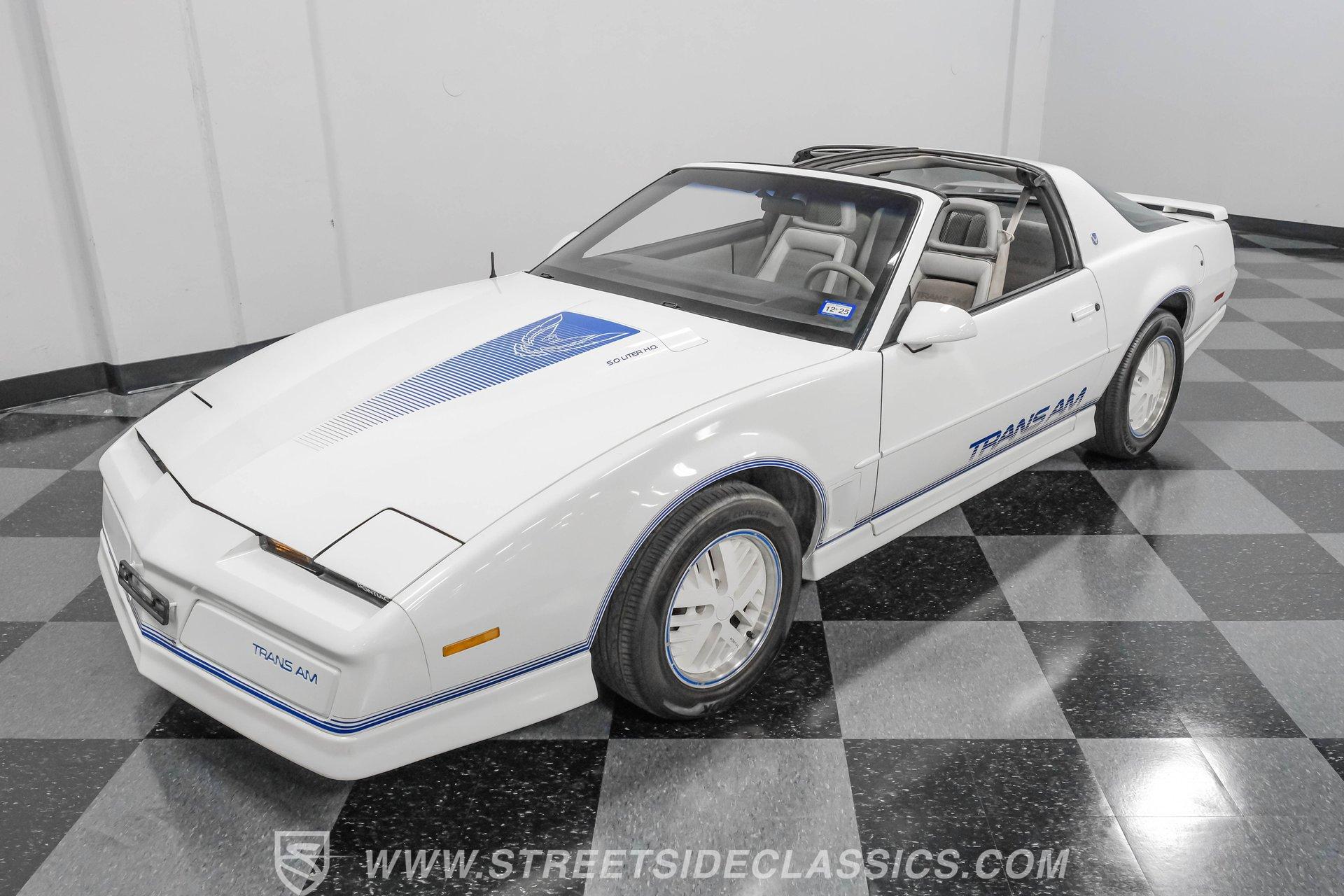 Let's face it: so many of us fell in love with the Pontiac Firebird because of the show Knight Rider. Though the legendary David Hasselhoff will always be beloved, for us car enthusiasts, K.I.T.T. was the real star of that show. One look at this 1984 Pontiac Firebird Trans Am 15th Anniversary Restomod should make it easy to understand why we were so obsessed. With its full factory-correct Cotillion White repaint, light blue accent decals, and always-cool T-top configuration, this one of only 1,500 Anniversary Editions has Hollywood exceptional good looks and plenty of star power to make it stand out wherever it goes. Inside, a factory console separates a pair of genuine replacement Anniversary Edition Recaro bucket seats, wrapped in leather with cloth inserts. A three-spoke, power-assisted tilt wheel sits just ahead of an 80 mph speedometer and an 8,000 rpm tachometer. At the same time, a pair of auxiliary gauges each pulls double duty with their driver feedback. Power windows, locks, and mirrors, along with air conditioning, provide all the modern amenities anyone could want in the mid-1980s. A Newport retro-style AM/FM/AUX Bluetooth head unit powers dual Infinity subwoofers and a Rockford Fosgate amplifier. Under that expansive hood, we find a naturally aspirated 5.3-liter overhead valve V-8 engine. This Gen IV block is topped with high-flow 243 aluminum heads and a TSP performance camshaft. Spent gases are disposed of through a set of Hedman long-tube headers, while MagnaFlow mufflers give this Firebird a sound like a real mythological creature. Power from that small block is funneled through a Tremec T56 six-speed manual transmission before being sent out to a 3.73-geared rear end. HIGHLIGHTS: One of 1500 Made Full Factory Correct Cotillion White Repaint Blue Decals T-Tops 5.3-Liter V8 243 Heads TSP Performance Cam Long Tubes MagnaFlow Mufflers Tremec T56 Six Speed 3.73 Rear Four Wheel Power Discs Power Steering Replacement Anniversary Recaro Seats Factory Console Tilt Wheel Power Windows Power Locks Power Mirrors Retro Style Radio Bluetooth Dual Infinity Subs Rockford Fosgate Amp Receipts Owner's Manual This 1984 Pontiac Firebird Trans Am 15th Anniversary Restomod rides on a factory-style suspension, while four-wheel power disc brakes stand ready to scrub off speed at a moment's notice. If your love for K.I.T.T. still fuels your passion for a third-gen Firebird, this is your chance to own a car that even Michael Knight would envy. Don't wait, call today!