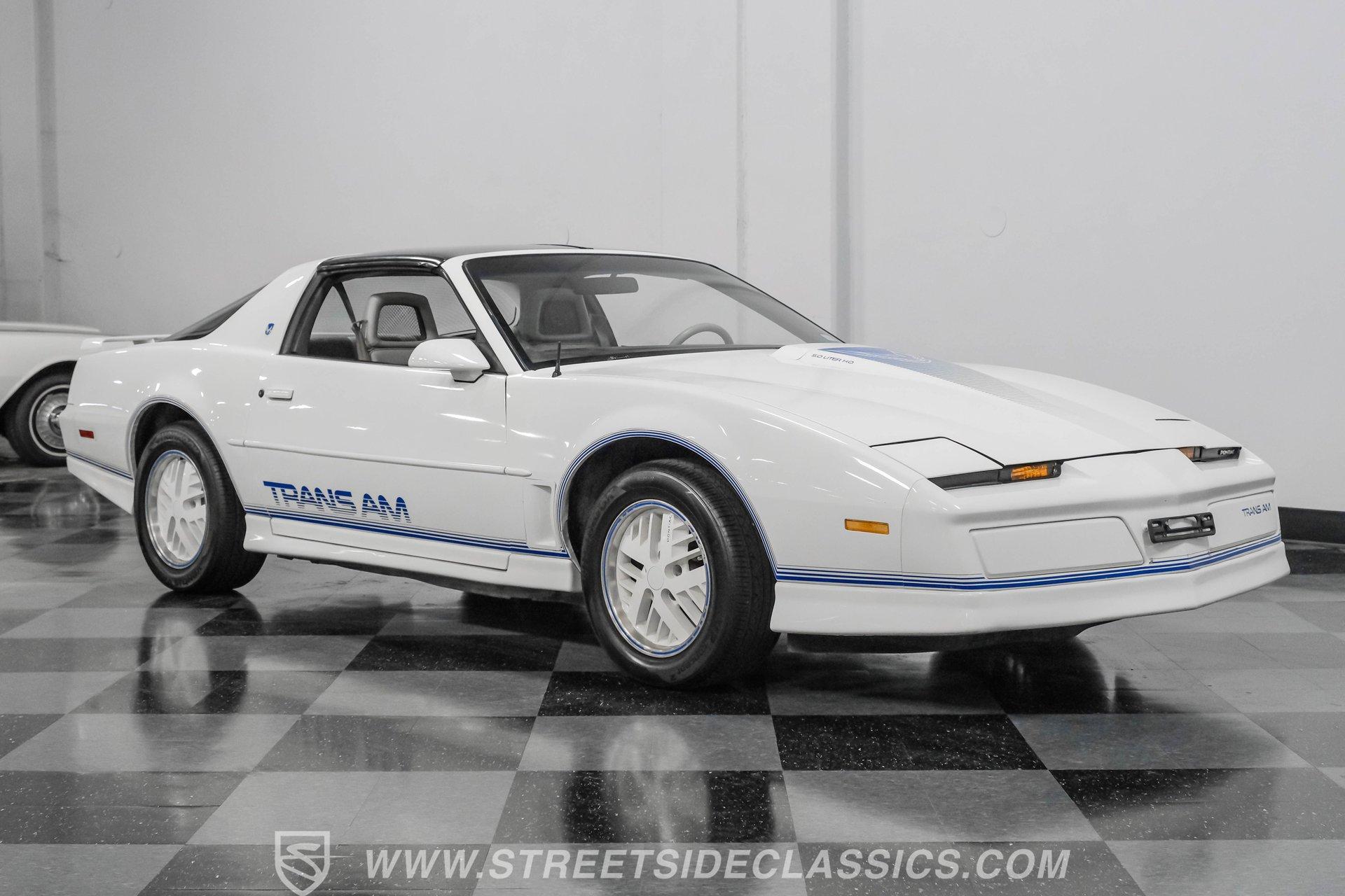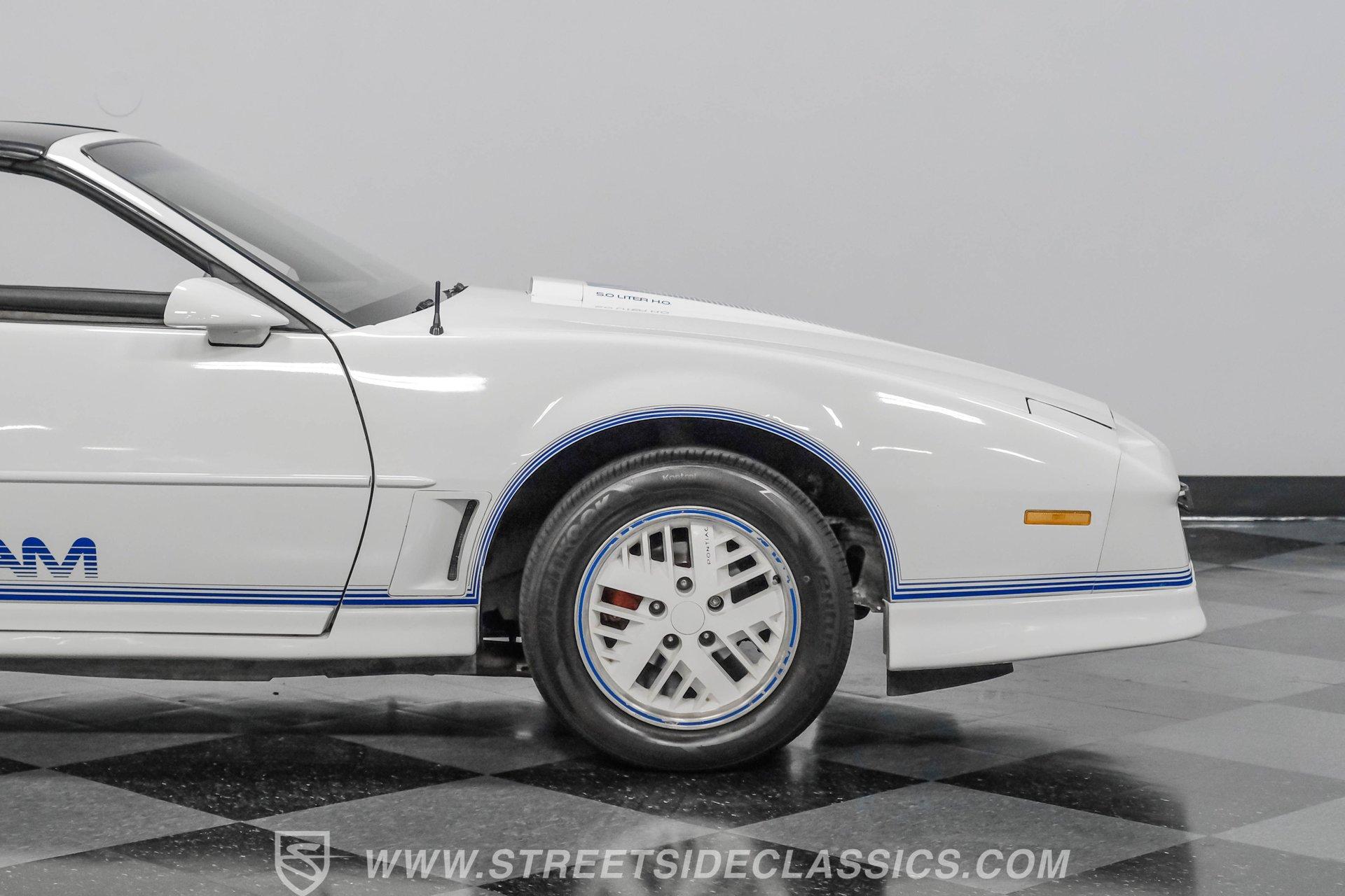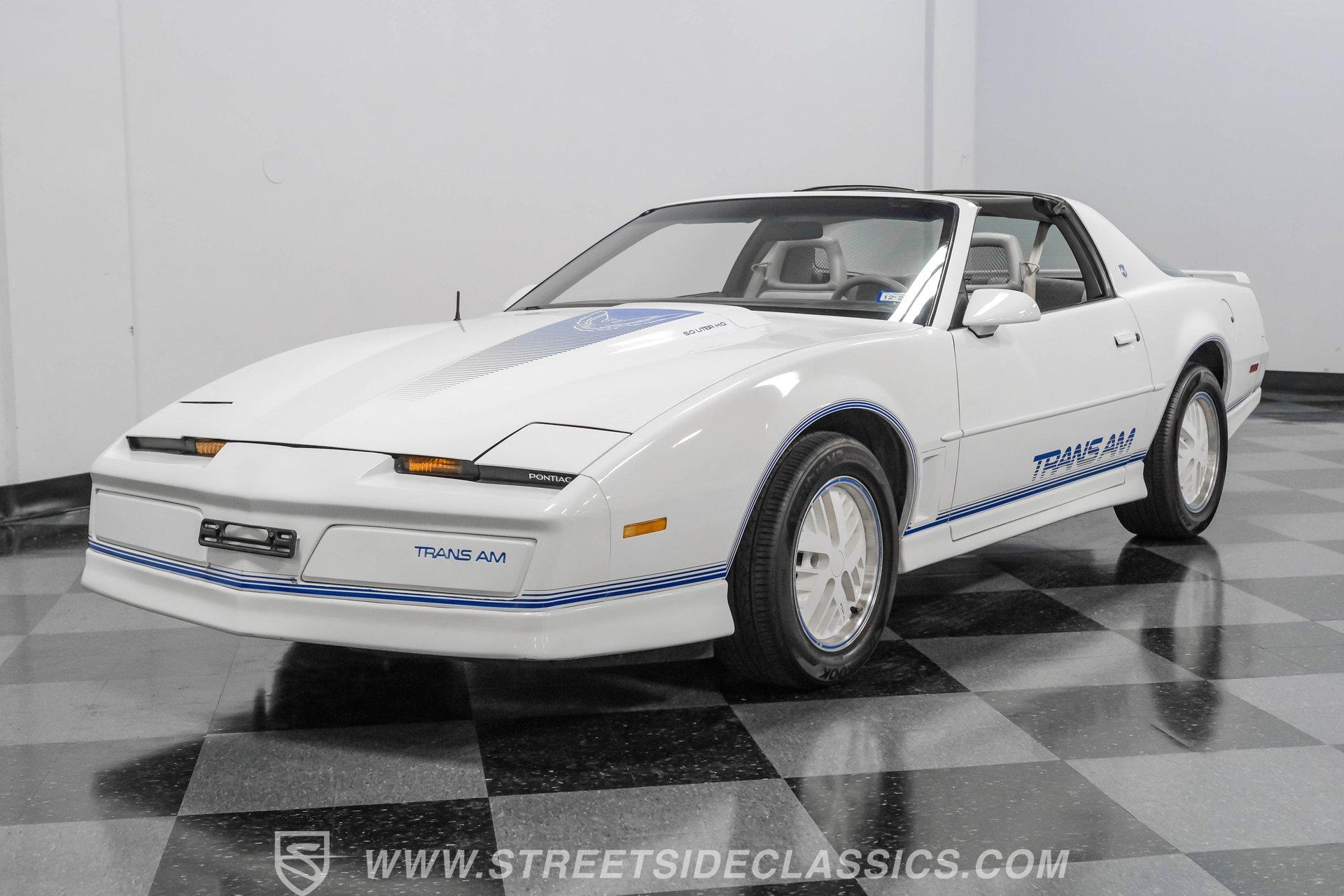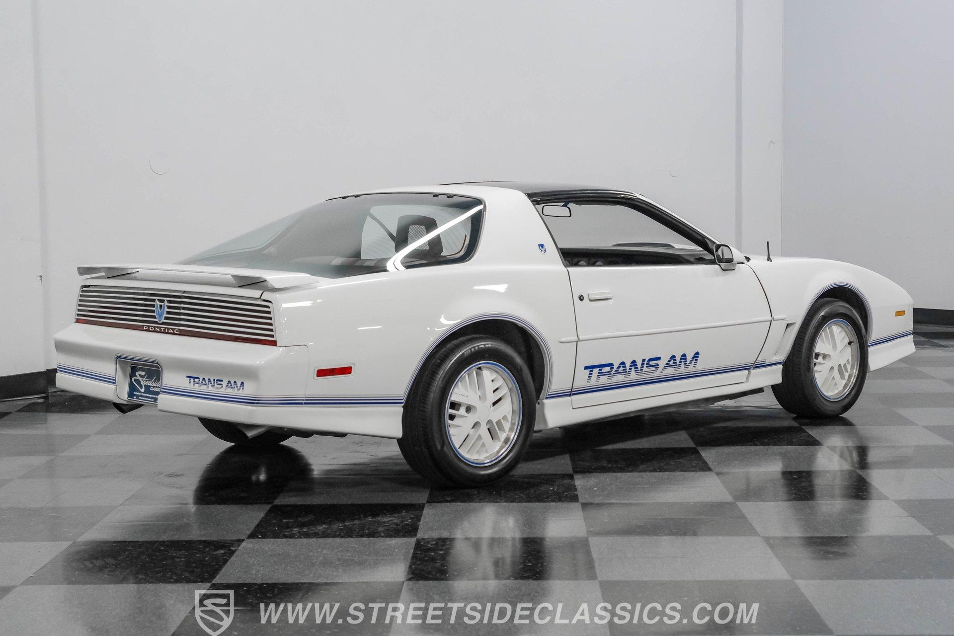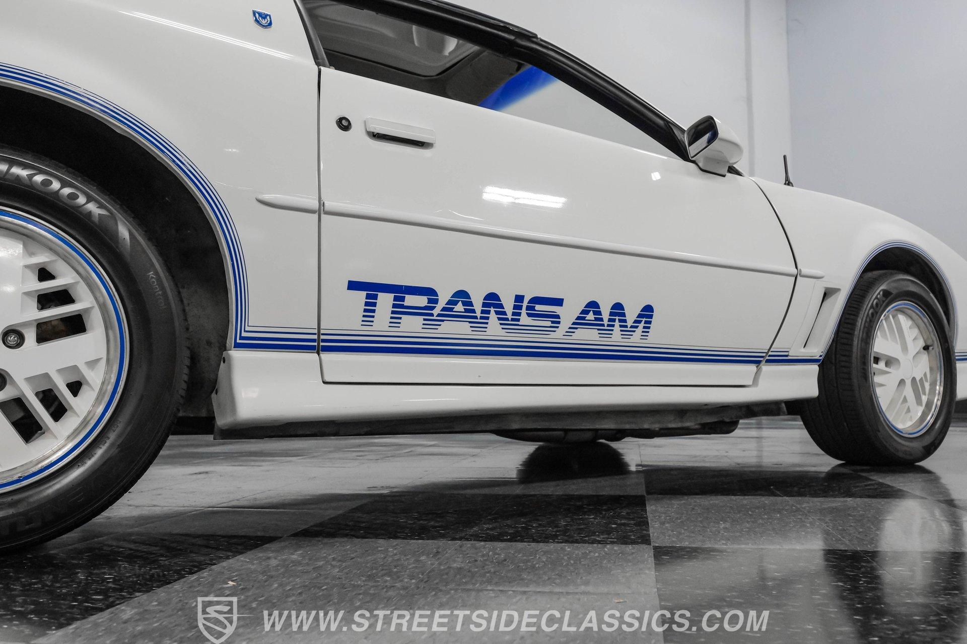 Let's face it: so many of us fell in love with the Pontiac Firebird because of the show Knight Rider. Though the legendary David Hasselhoff will always be beloved, for us car enthusiasts, K.I.T.T. was the real star of that show. One look at this 1984 Pontiac Firebird Trans Am 15th Anniversary Restomod should make it easy to understand why we were so obsessed. With its full factory-correct Cotillion White repaint, light blue accent decals, and always-cool T-top configuration, this one of only 1,500 Anniversary Editions has Hollywood exceptional good looks and plenty of star power to make it stand out wherever it goes. Inside, a factory console separates a pair of genuine replacement Anniversary Edition Recaro bucket seats, wrapped in leather with cloth inserts. A three-spoke, power-assisted tilt wheel sits just ahead of an 80 mph speedometer and an 8,000 rpm tachometer. At the same time, a pair of auxiliary gauges each pulls double duty with their driver feedback. Power windows, locks, and mirrors, along with air conditioning, provide all the modern amenities anyone could want in the mid-1980s. A Newport retro-style AM/FM/AUX Bluetooth head unit powers dual Infinity subwoofers and a Rockford Fosgate amplifier. Under that expansive hood, we find a naturally aspirated 5.3-liter overhead valve V-8 engine. This Gen IV block is topped with high-flow 243 aluminum heads and a TSP performance camshaft. Spent gases are disposed of through a set of Hedman long-tube headers, while MagnaFlow mufflers give this Firebird a sound like a real mythological creature. Power from that small block is funneled through a Tremec T56 six-speed manual transmission before being sent out to a 3.73-geared rear end. HIGHLIGHTS: One of 1500 Made Full Factory Correct Cotillion White Repaint Blue Decals T-Tops 5.3-Liter V8 243 Heads TSP Performance Cam Long Tubes MagnaFlow Mufflers Tremec T56 Six Speed 3.73 Rear Four Wheel Power Discs Power Steering Replacement Anniversary Recaro Seats Factory Console Tilt Wheel Power Windows Power Locks Power Mirrors Retro Style Radio Bluetooth Dual Infinity Subs Rockford Fosgate Amp Receipts Owner's Manual This 1984 Pontiac Firebird Trans Am 15th Anniversary Restomod rides on a factory-style suspension, while four-wheel power disc brakes stand ready to scrub off speed at a moment's notice. If your love for K.I.T.T. still fuels your passion for a third-gen Firebird, this is your chance to own a car that even Michael Knight would envy. Don't wait, call today!