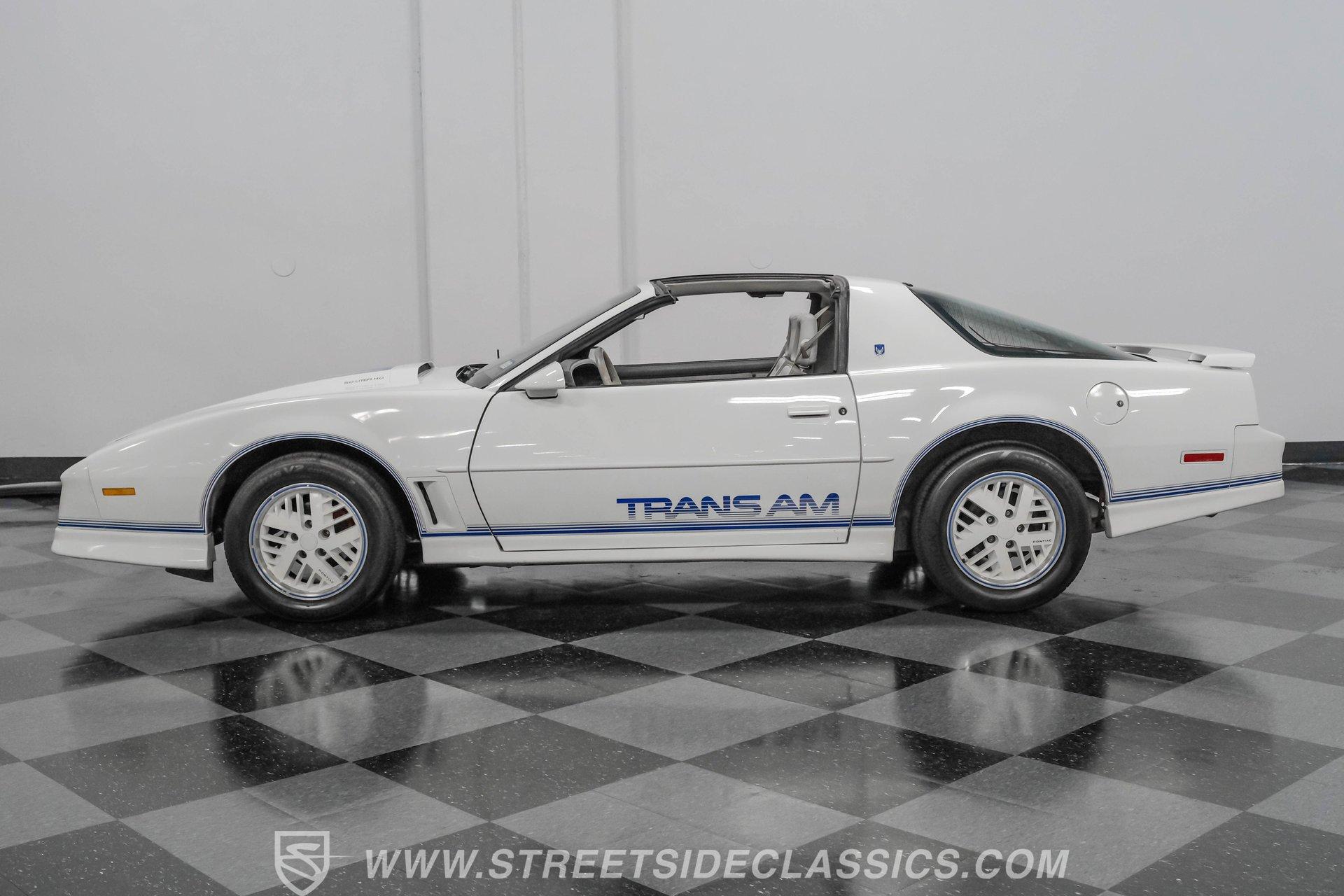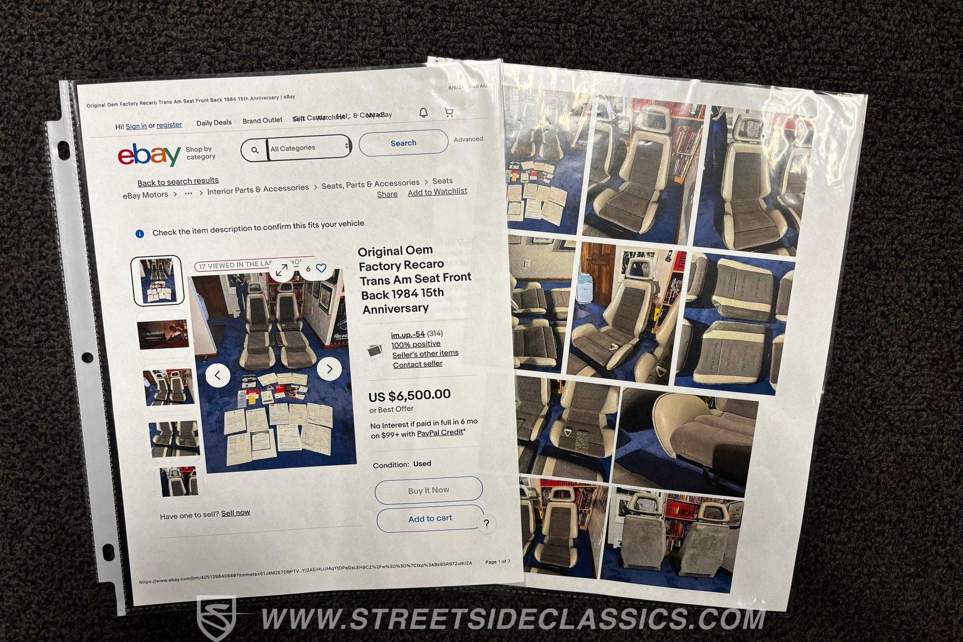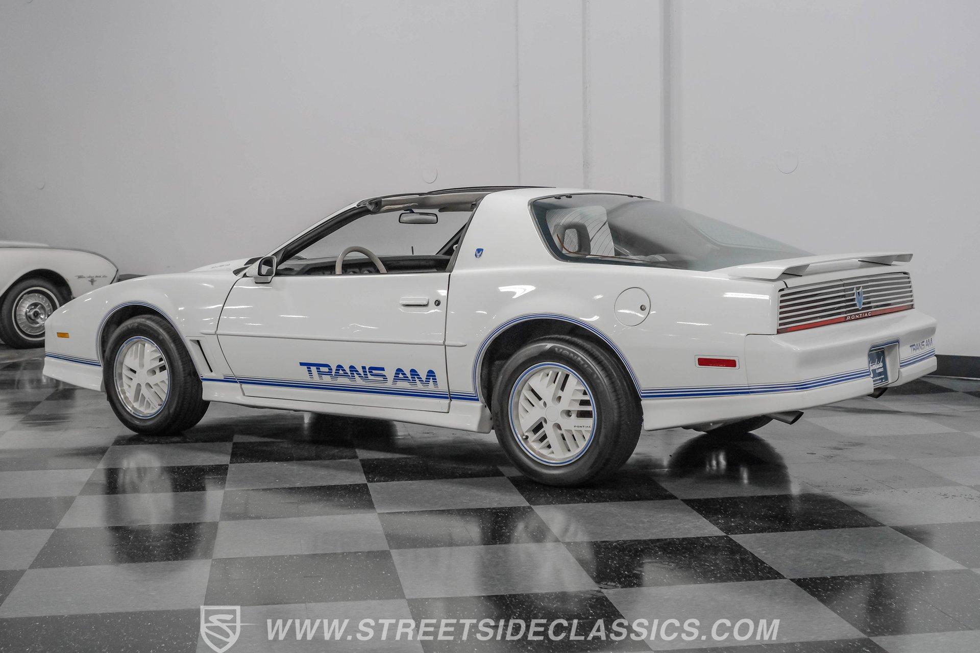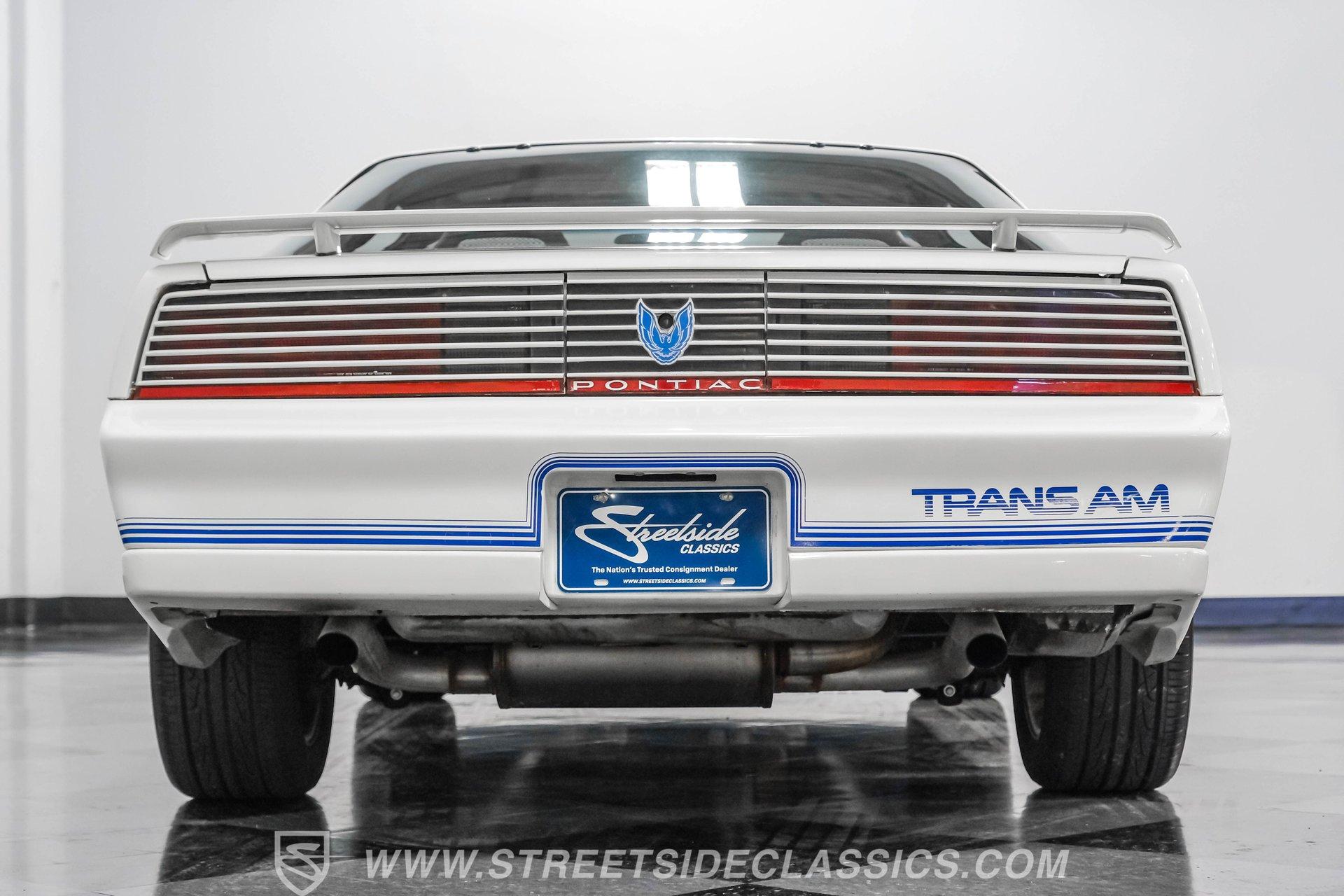 Let's face it: so many of us fell in love with the Pontiac Firebird because of the show Knight Rider. Though the legendary David Hasselhoff will always be beloved, for us car enthusiasts, K.I.T.T. was the real star of that show. One look at this 1984 Pontiac Firebird Trans Am 15th Anniversary Restomod should make it easy to understand why we were so obsessed. With its full factory-correct Cotillion White repaint, light blue accent decals, and always-cool T-top configuration, this one of only 1,500 Anniversary Editions has Hollywood exceptional good looks and plenty of star power to make it stand out wherever it goes. Inside, a factory console separates a pair of genuine replacement Anniversary Edition Recaro bucket seats, wrapped in leather with cloth inserts. A three-spoke, power-assisted tilt wheel sits just ahead of an 80 mph speedometer and an 8,000 rpm tachometer. At the same time, a pair of auxiliary gauges each pulls double duty with their driver feedback. Power windows, locks, and mirrors, along with air conditioning, provide all the modern amenities anyone could want in the mid-1980s. A Newport retro-style AM/FM/AUX Bluetooth head unit powers dual Infinity subwoofers and a Rockford Fosgate amplifier. Under that expansive hood, we find a naturally aspirated 5.3-liter overhead valve V-8 engine. This Gen IV block is topped with high-flow 243 aluminum heads and a TSP performance camshaft. Spent gases are disposed of through a set of Hedman long-tube headers, while MagnaFlow mufflers give this Firebird a sound like a real mythological creature. Power from that small block is funneled through a Tremec T56 six-speed manual transmission before being sent out to a 3.73-geared rear end. HIGHLIGHTS: One of 1500 Made Full Factory Correct Cotillion White Repaint Blue Decals T-Tops 5.3-Liter V8 243 Heads TSP Performance Cam Long Tubes MagnaFlow Mufflers Tremec T56 Six Speed 3.73 Rear Four Wheel Power Discs Power Steering Replacement Anniversary Recaro Seats Factory Console Tilt Wheel Power Windows Power Locks Power Mirrors Retro Style Radio Bluetooth Dual Infinity Subs Rockford Fosgate Amp Receipts Owner's Manual This 1984 Pontiac Firebird Trans Am 15th Anniversary Restomod rides on a factory-style suspension, while four-wheel power disc brakes stand ready to scrub off speed at a moment's notice. If your love for K.I.T.T. still fuels your passion for a third-gen Firebird, this is your chance to own a car that even Michael Knight would envy. Don't wait, call today!