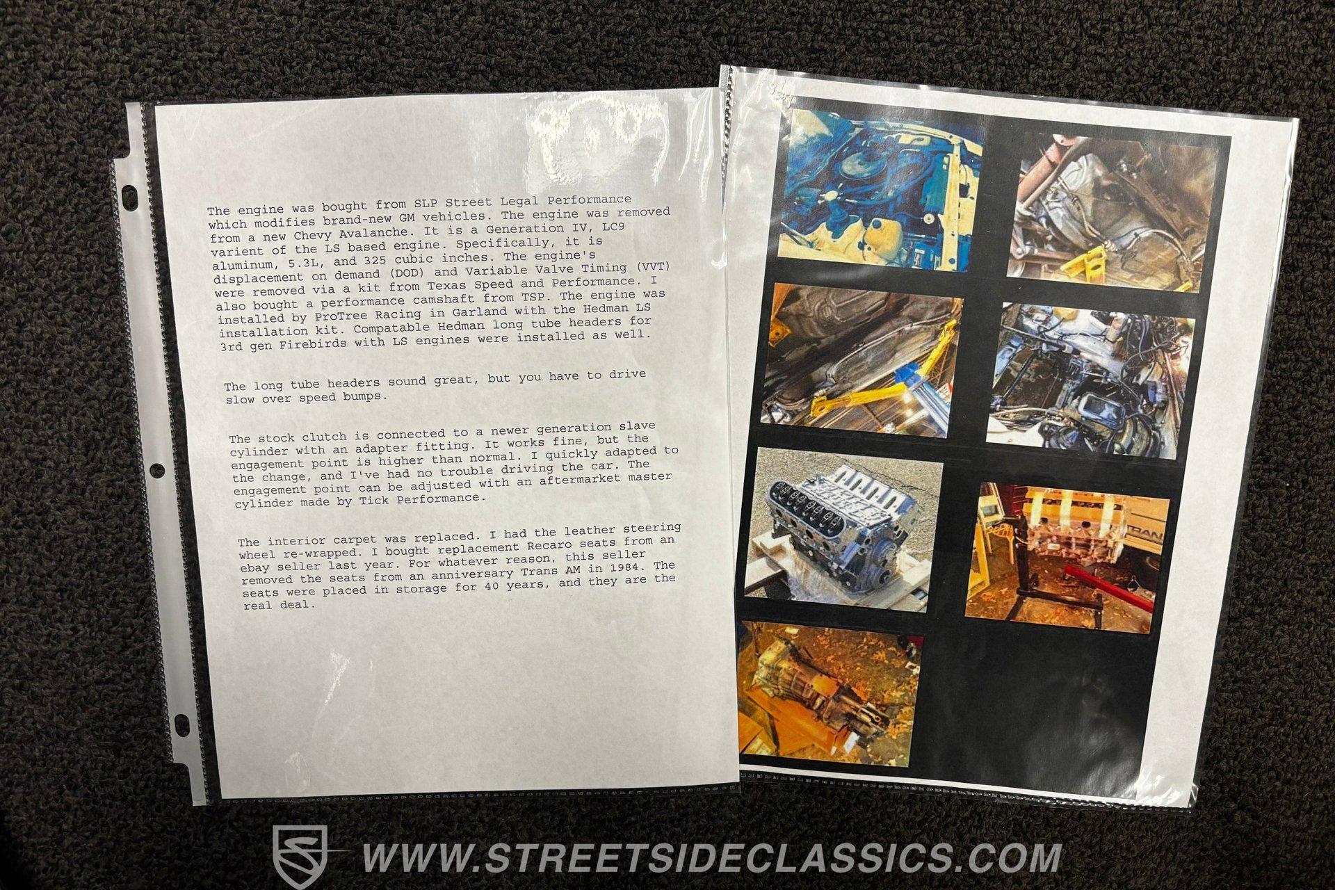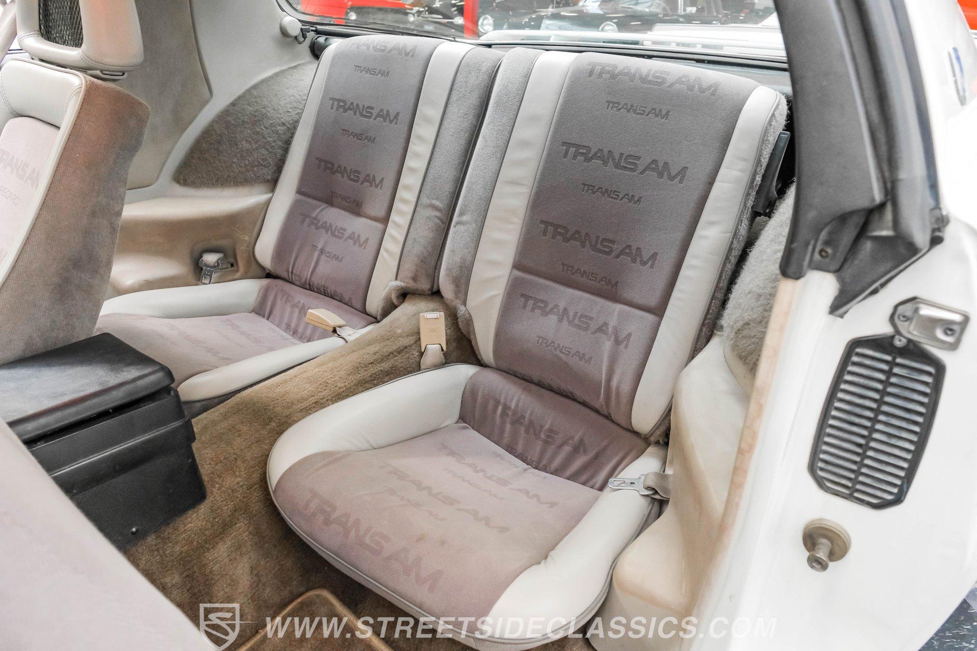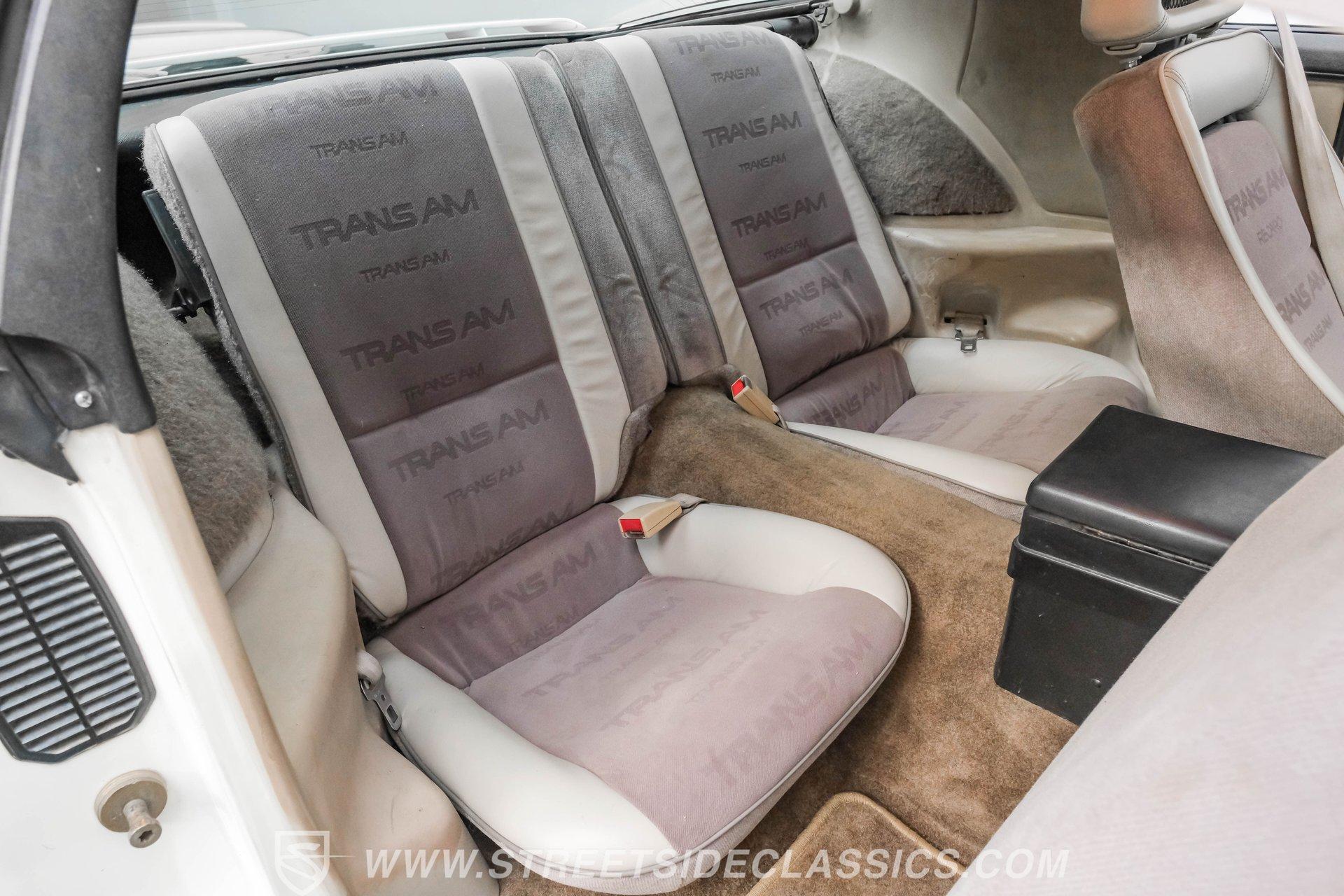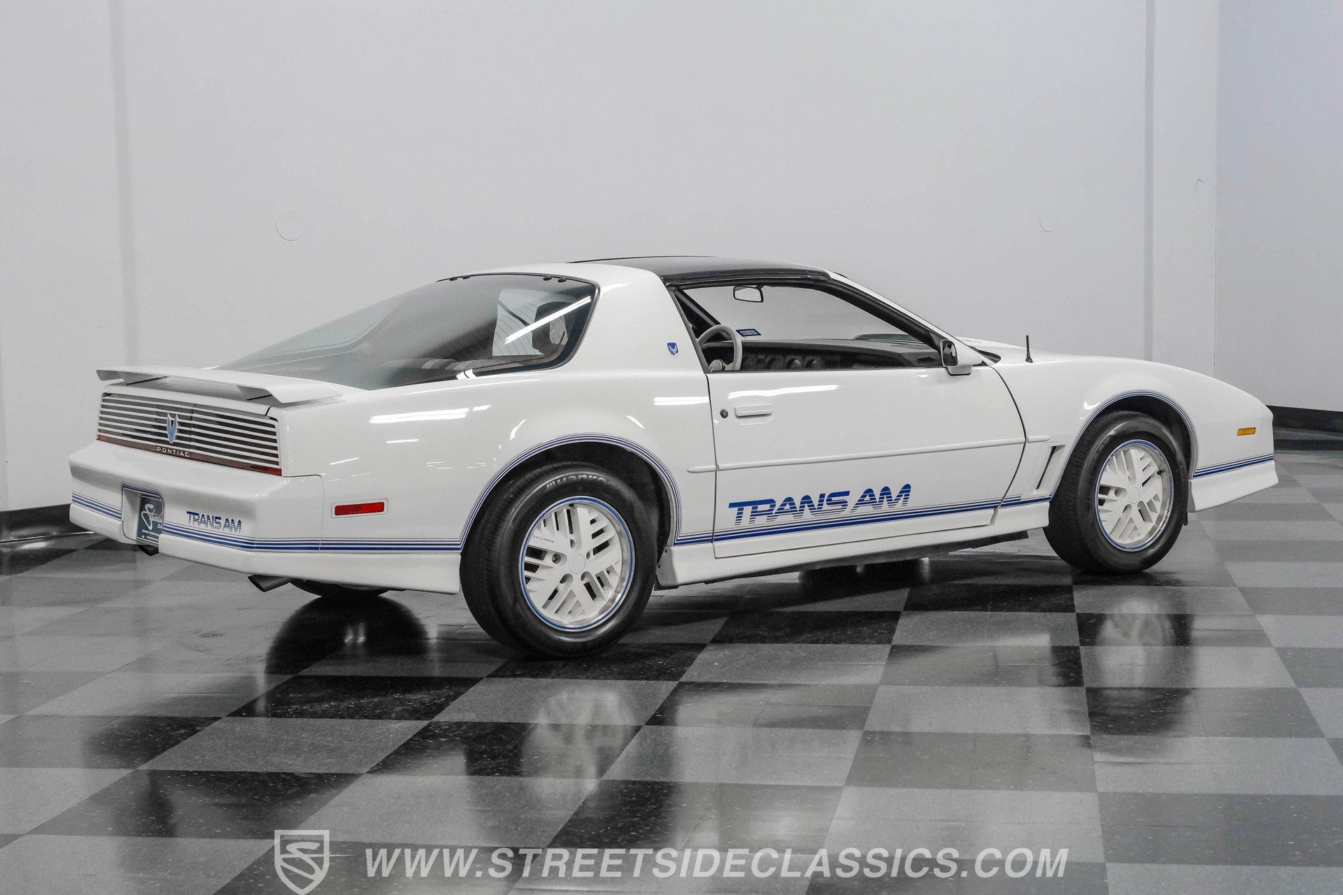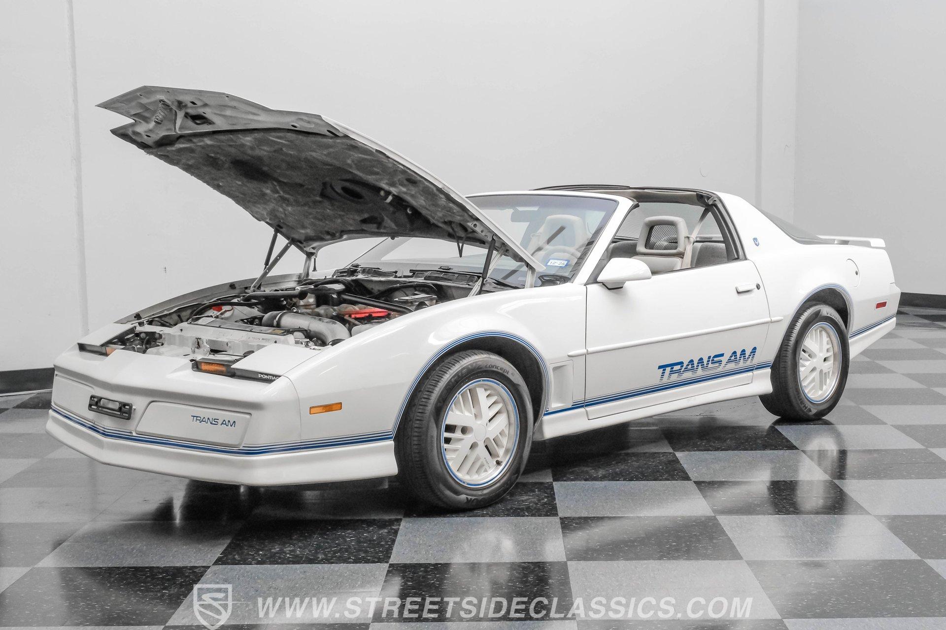Let's face it: so many of us fell in love with the Pontiac Firebird because of the show Knight Rider. Though the legendary David Hasselhoff will always be beloved, for us car enthusiasts, K.I.T.T. was the real star of that show. One look at this 1984 Pontiac Firebird Trans Am 15th Anniversary Restomod should make it easy to understand why we were so obsessed. With its full factory-correct Cotillion White repaint, light blue accent decals, and always-cool T-top configuration, this one of only 1,500 Anniversary Editions has Hollywood exceptional good looks and plenty of star power to make it stand out wherever it goes. Inside, a factory console separates a pair of genuine replacement Anniversary Edition Recaro bucket seats, wrapped in leather with cloth inserts. A three-spoke, power-assisted tilt wheel sits just ahead of an 80 mph speedometer and an 8,000 rpm tachometer. At the same time, a pair of auxiliary gauges each pulls double duty with their driver feedback. Power windows, locks, and mirrors, along with air conditioning, provide all the modern amenities anyone could want in the mid-1980s. A Newport retro-style AM/FM/AUX Bluetooth head unit powers dual Infinity subwoofers and a Rockford Fosgate amplifier. Under that expansive hood, we find a naturally aspirated 5.3-liter overhead valve V-8 engine. This Gen IV block is topped with high-flow 243 aluminum heads and a TSP performance camshaft. Spent gases are disposed of through a set of Hedman long-tube headers, while MagnaFlow mufflers give this Firebird a sound like a real mythological creature. Power from that small block is funneled through a Tremec T56 six-speed manual transmission before being sent out to a 3.73-geared rear end. HIGHLIGHTS: One of 1500 Made Full Factory Correct Cotillion White Repaint Blue Decals T-Tops 5.3-Liter V8 243 Heads TSP Performance Cam Long Tubes MagnaFlow Mufflers Tremec T56 Six Speed 3.73 Rear Four Wheel Power Discs Power Steering Replacement Anniversary Recaro Seats Factory Console Tilt Wheel Power Windows Power Locks Power Mirrors Retro Style Radio Bluetooth Dual Infinity Subs Rockford Fosgate Amp Receipts Owner's Manual This 1984 Pontiac Firebird Trans Am 15th Anniversary Restomod rides on a factory-style suspension, while four-wheel power disc brakes stand ready to scrub off speed at a moment's notice. If your love for K.I.T.T. still fuels your passion for a third-gen Firebird, this is your chance to own a car that even Michael Knight would envy. Don't wait, call today!