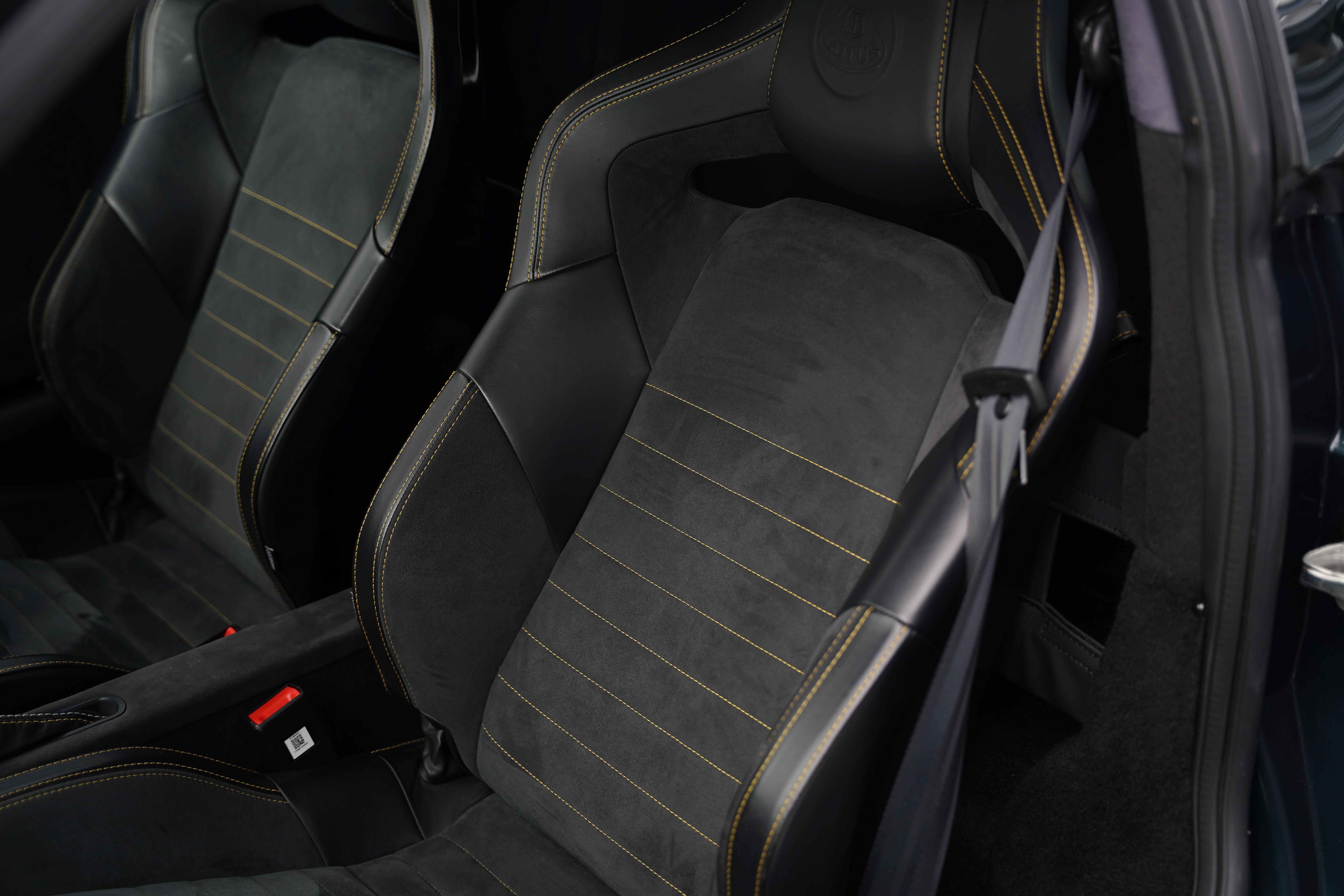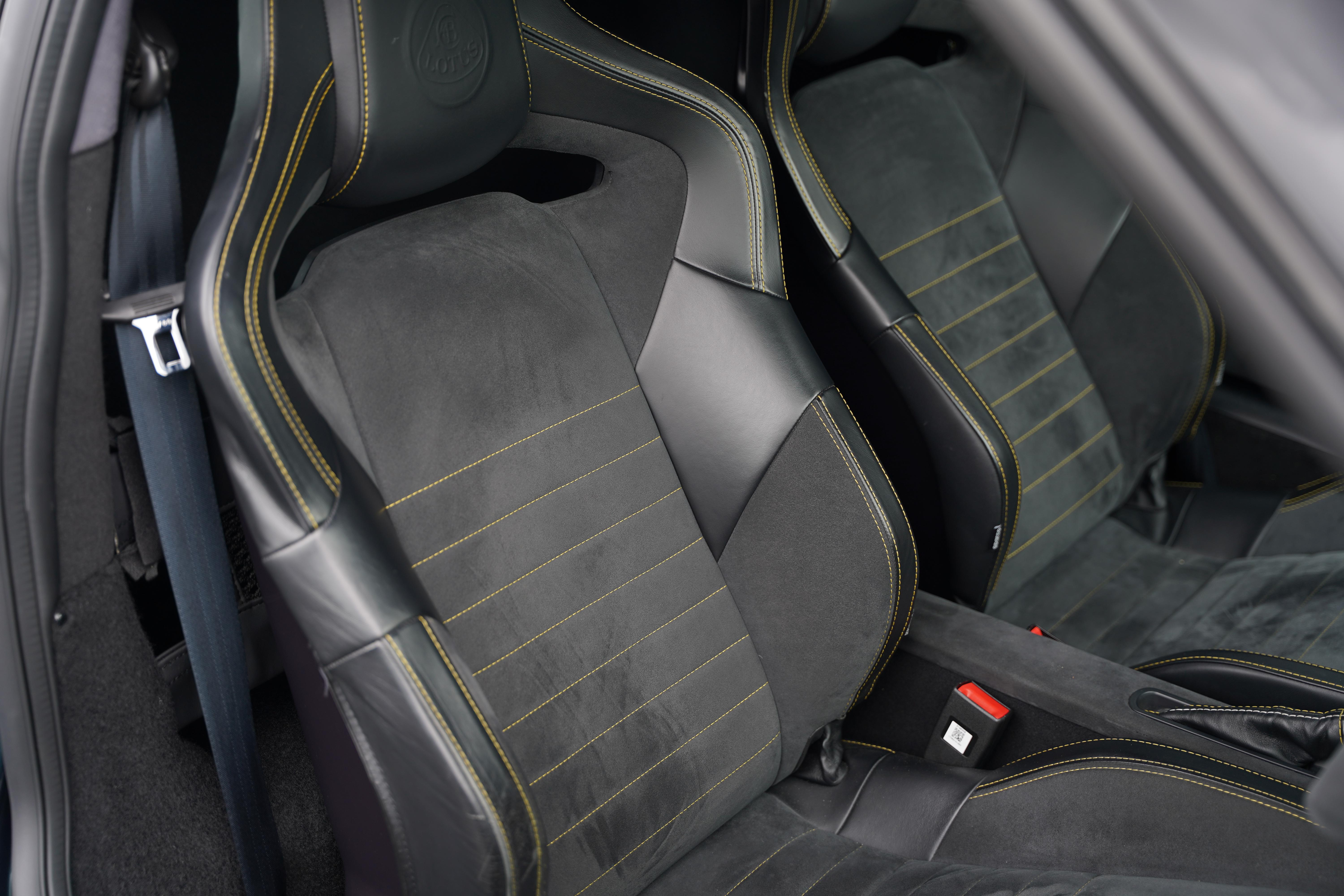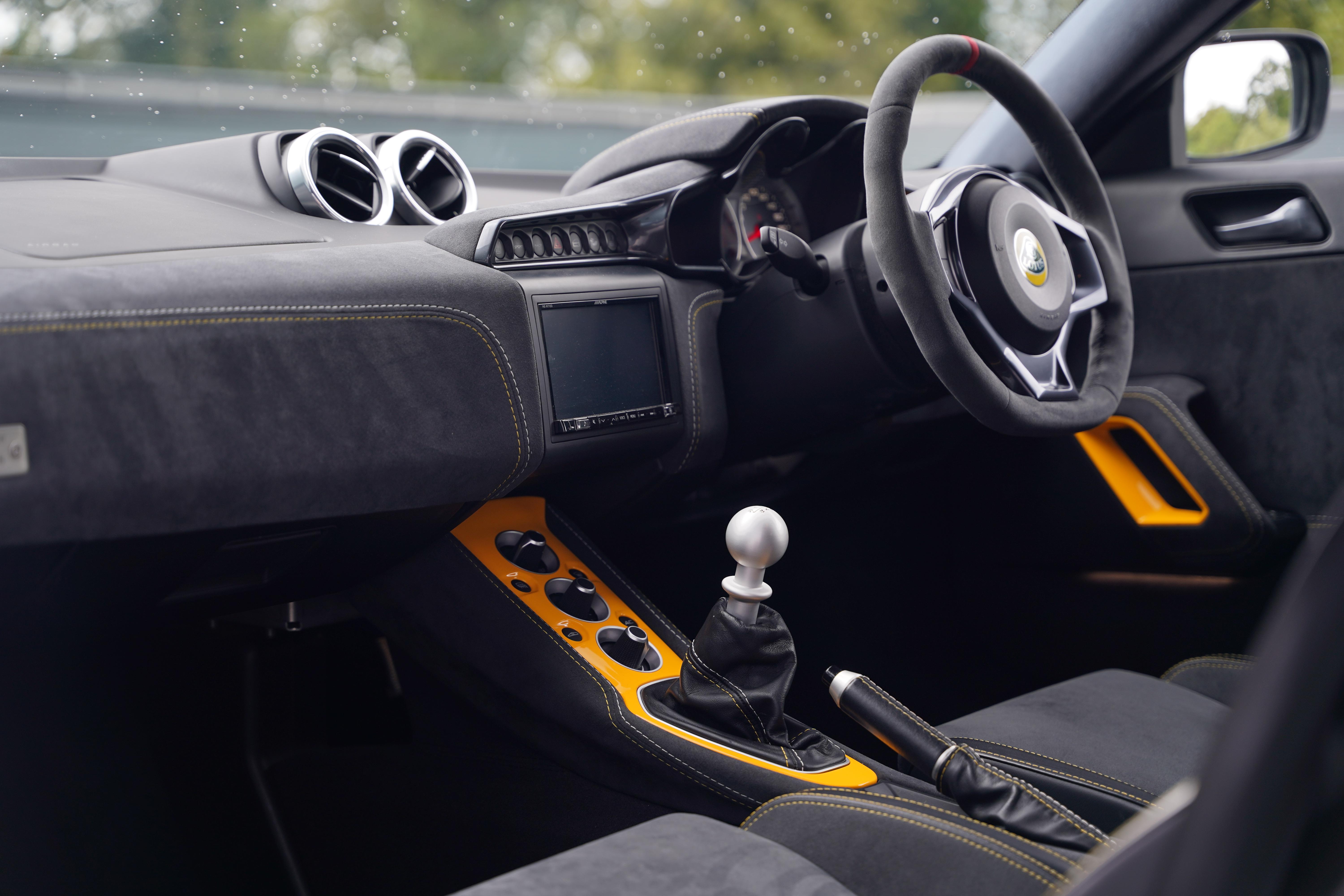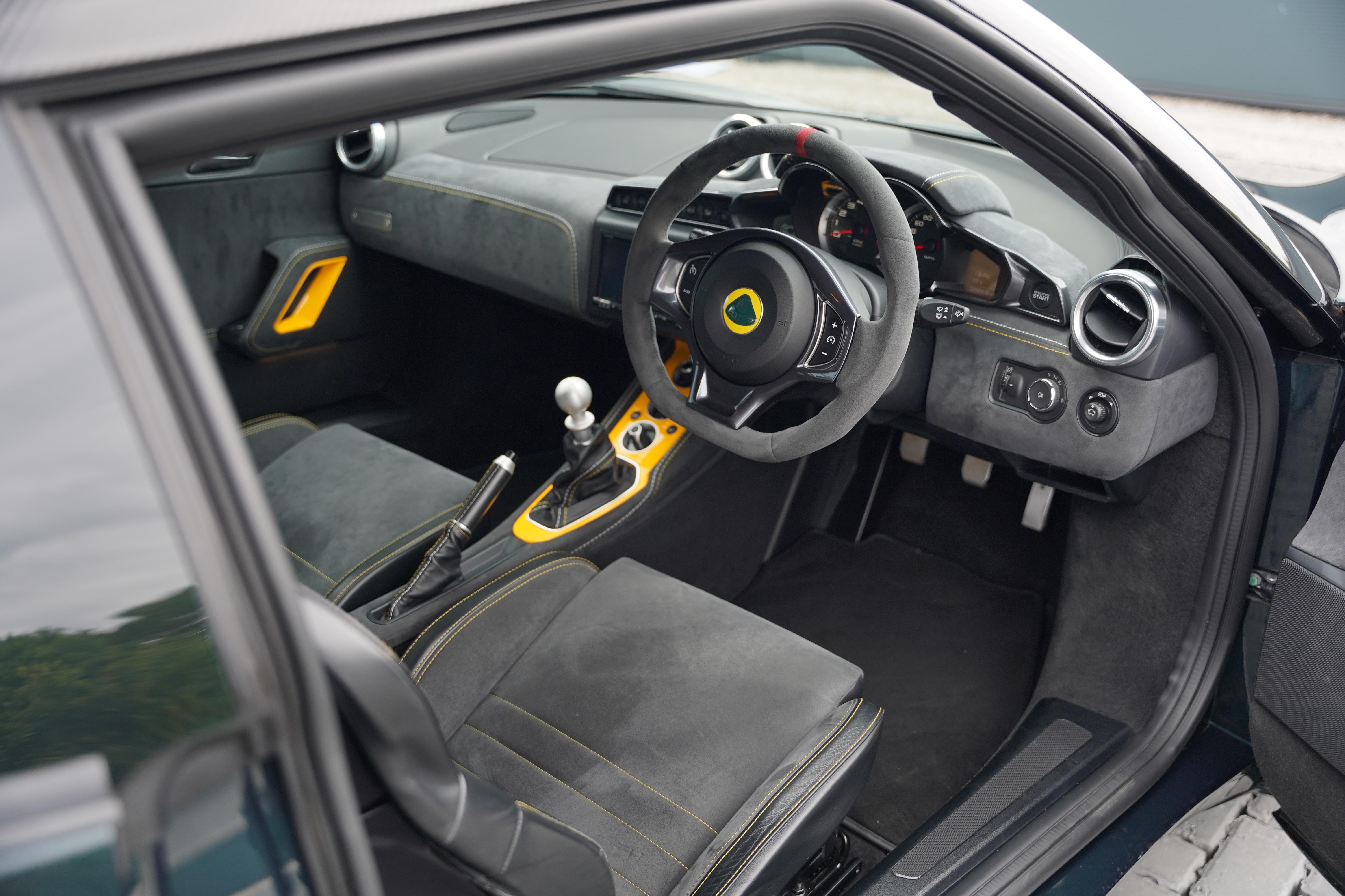 The interior is completed in black alcantara, with yellow and silver contrasting twin stitch, as well as leather bolsters to the seats. An alcantara steering wheel continues the theme. The yellow highlights continue with a full yellow interior colour pack. The seating configuration in this Evora is 2+0. Standard specification includes cruise control, heated seats, switchable exhaust valve, Sport and Race modes, Alpine touchscreen infotainment system, air conditioning and satelite navigation.