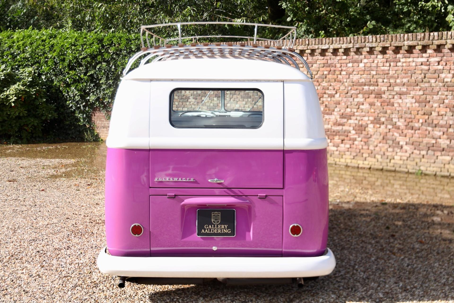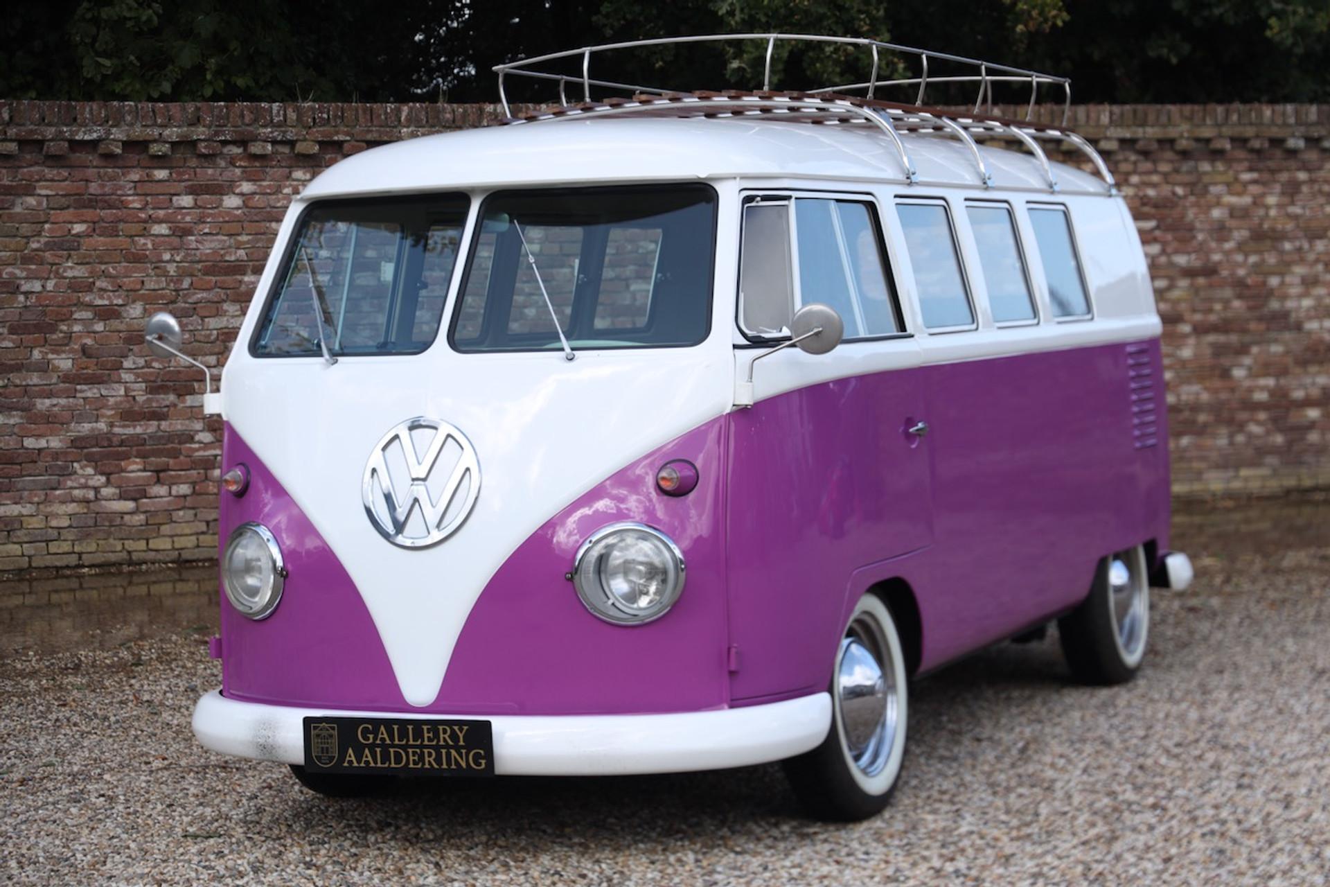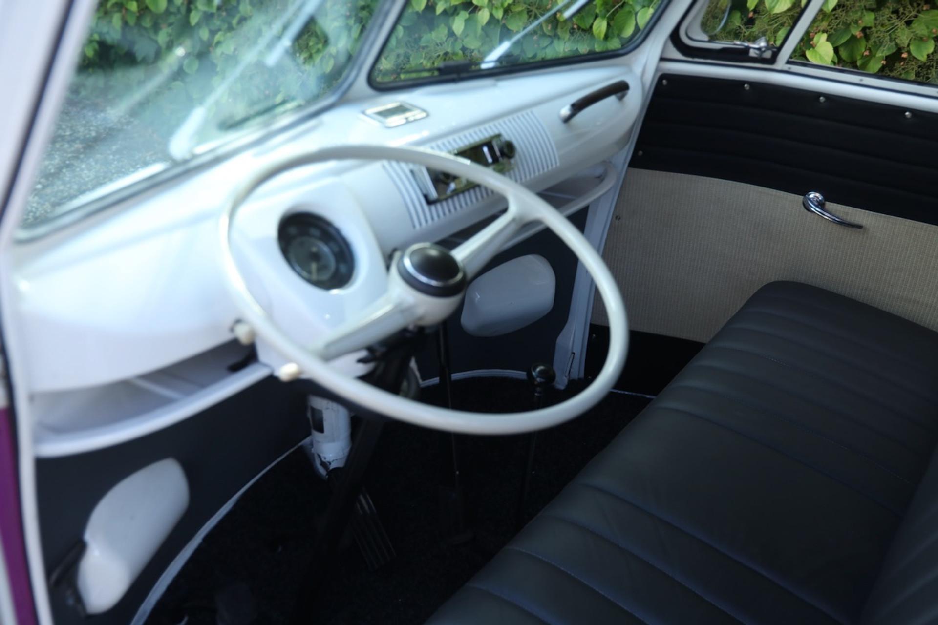 This 1958 example is the result of a carefully executed older restoration. It is an 11-window Combi, restored with meticulous attention to detail and authenticity by a Dutch enthusiast. The result is a bus that fully retains the charm of the classic T1 while standing out with its vibrant and lively appearance: an exterior in white complemented by an amethyst-colored top, a combination that immediately draws attention and perfectly suits the iconic character of this Microbus.