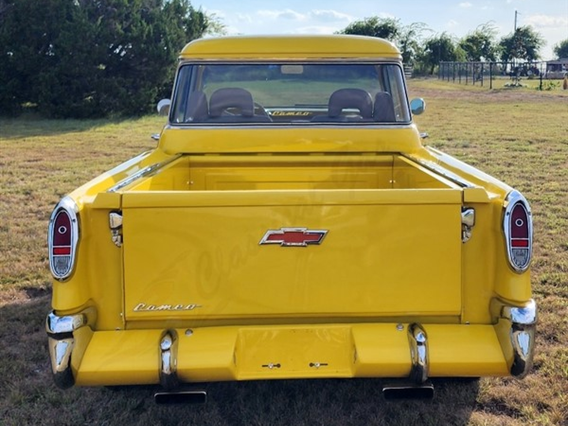 The Chevrolet "Task Force" was a light duty pickup introduced in 1955. This was the first major redesign for the Chevy pickup since 1947. The idea was to have a more modern design than the Advance Design series without sacrificing any ruggedness or durability. Of these the Cameo was king and would eventually pave the way for the Fleetside where the rear fenders continue into the cab's body lines. They were built from 1955-1959 and 5,220 were produced for the 1955 model year. This 1955 Chevy truck is a high end build and has spent a large part of its life in Texas. The builder purchased the truck in February 2001 and invested 8 years into completing it. It is in excellent condition throughout and runs great. The body is very straight and all rust free. It is painted in a 2008 Corvette Velocity Yellow with area around the rear window being a 1982 GM Almond color. It was all professionally done by Accurate Paint & Body out of Burleson, Texas. It really pops out in the sun and will get attention wherever it goes. All of the glass is in good condition and it has the big rear window which is the more desirable body style. Up front is the iconic egg crate grill which has a great shine along with the stock style front bumper. All of the lights work properly and the taillights have the old school blue dots in place. One of the most beautiful features you find on these old trucks is the wood beds. This one is stained nicely and has a gloss finish with stainless runners. The gas tank was relocated to under the bed which is a nice improvement as these often had the tank in the cab behind the seat. The truck has a great stance and rides on a set of 17 inch classic Eagle Alloy wheels wrapped with Sumitomo tires.