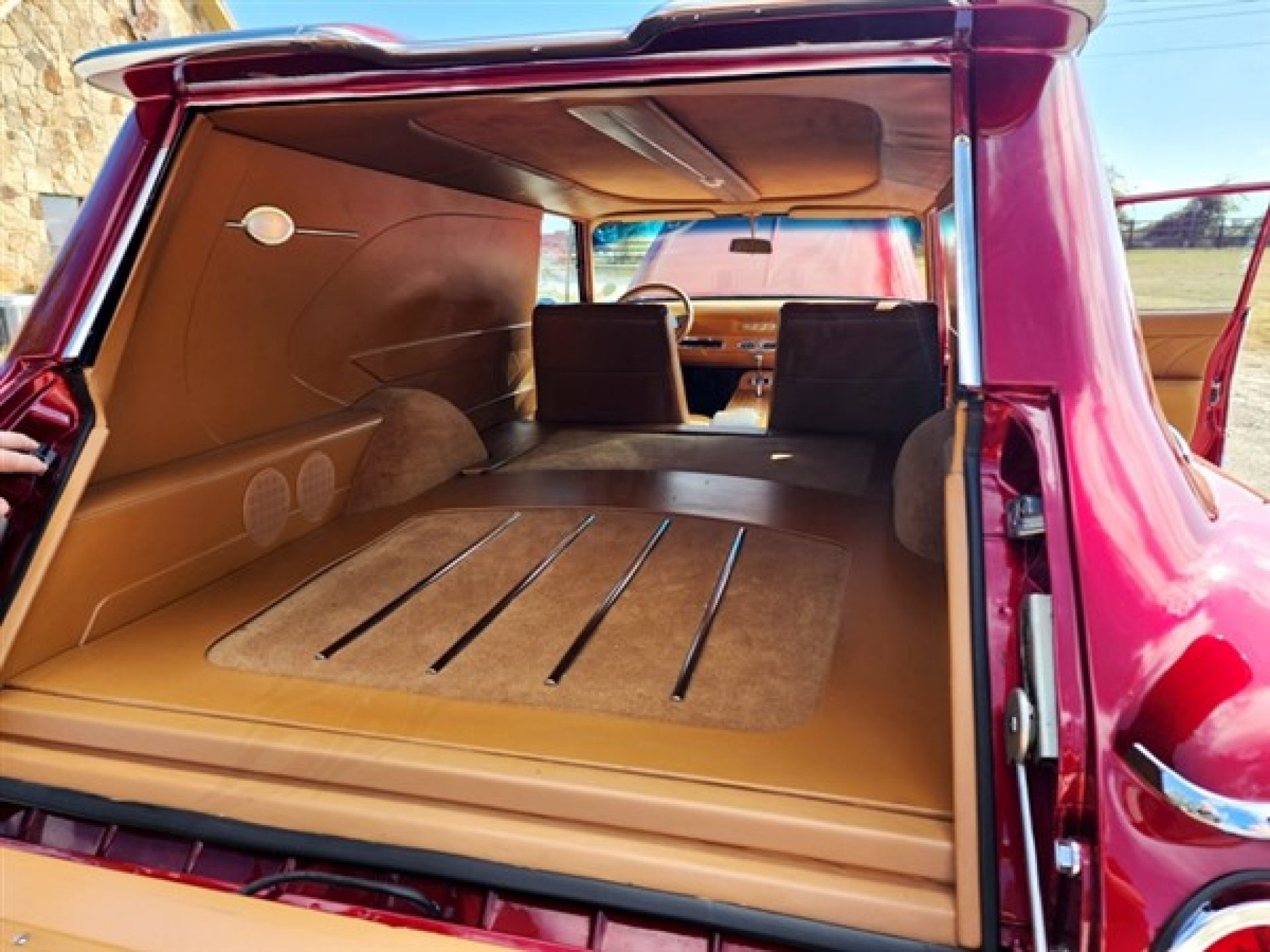 The interior of the car is absolutely gorgeous and done in high quality tan leather. The dash is out of a 1973 Duster and features custom Dakota Digital gauges and custom stainless AC vents. To match the gauge layout a custom trim piece was created for the glove box door. The seats are out of a 1962 Valiant Signet and the upholstery is like new throughout. The custom center console houses the Lokar Gennie short shifter, stainless cupholders, and power window controls. The headliner, the door panels, everything is custom. Open the rear tailgate and you will have full access to the beautifully designed upholstery. The original window control is in place on the tailgate but is purely for looks as it no longer cranks. Custom designed trim pieces can be found throughout and even the interior lighting is custom. In front of the driver sits a painted to match Flaming River waterfall column topped off with a leather wrapped steering wheel. The custom stereo is all bluetooth and it sounds great. All of the electrical work is very cleanly done and hidden out of sight.
