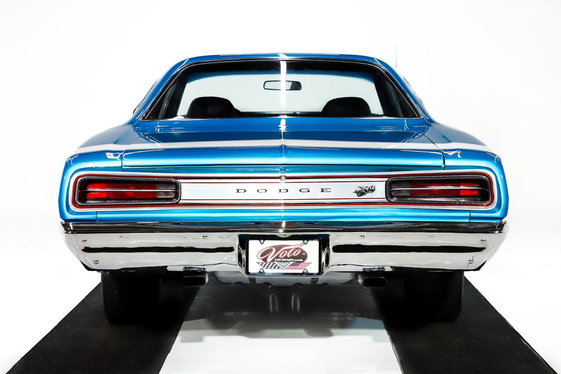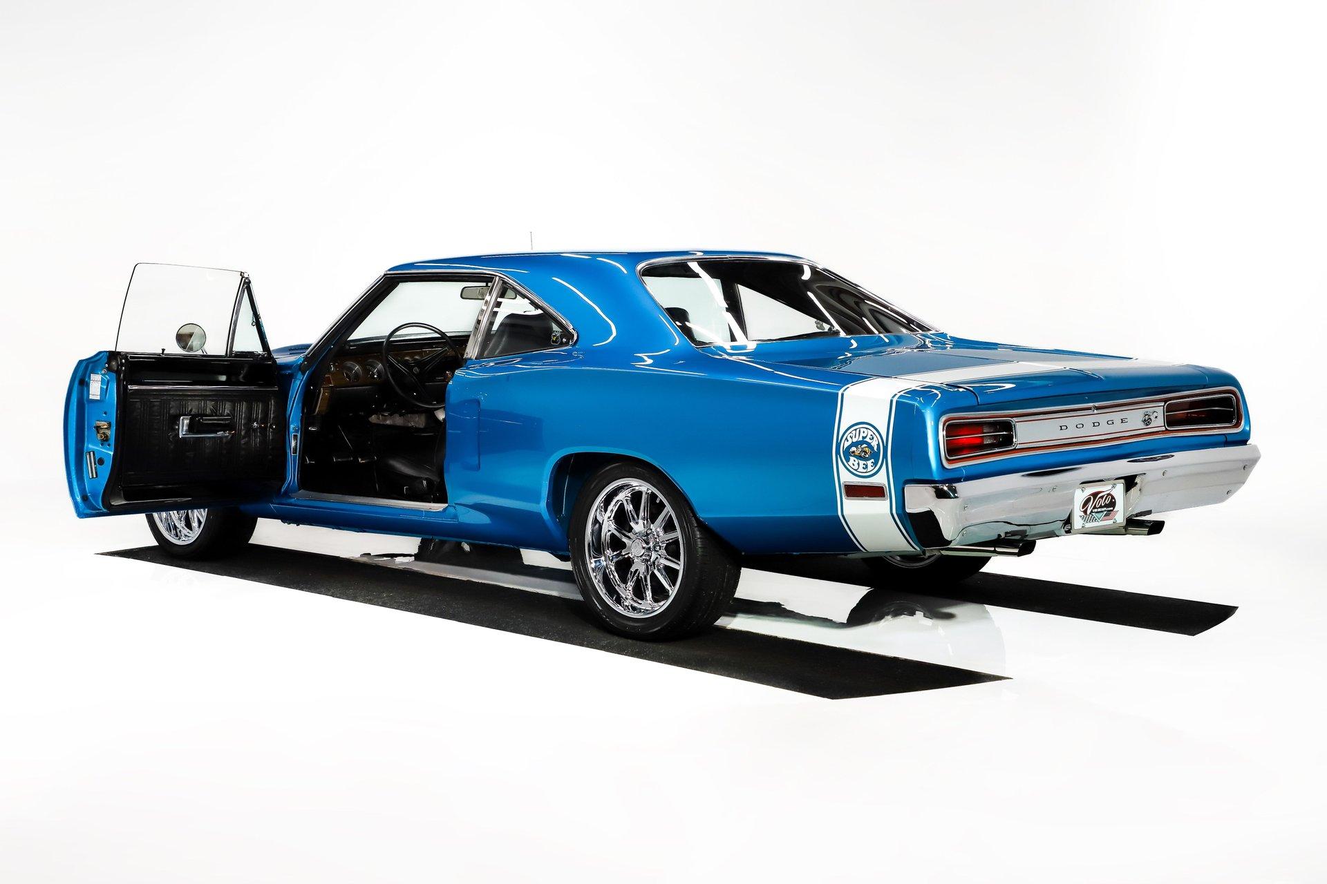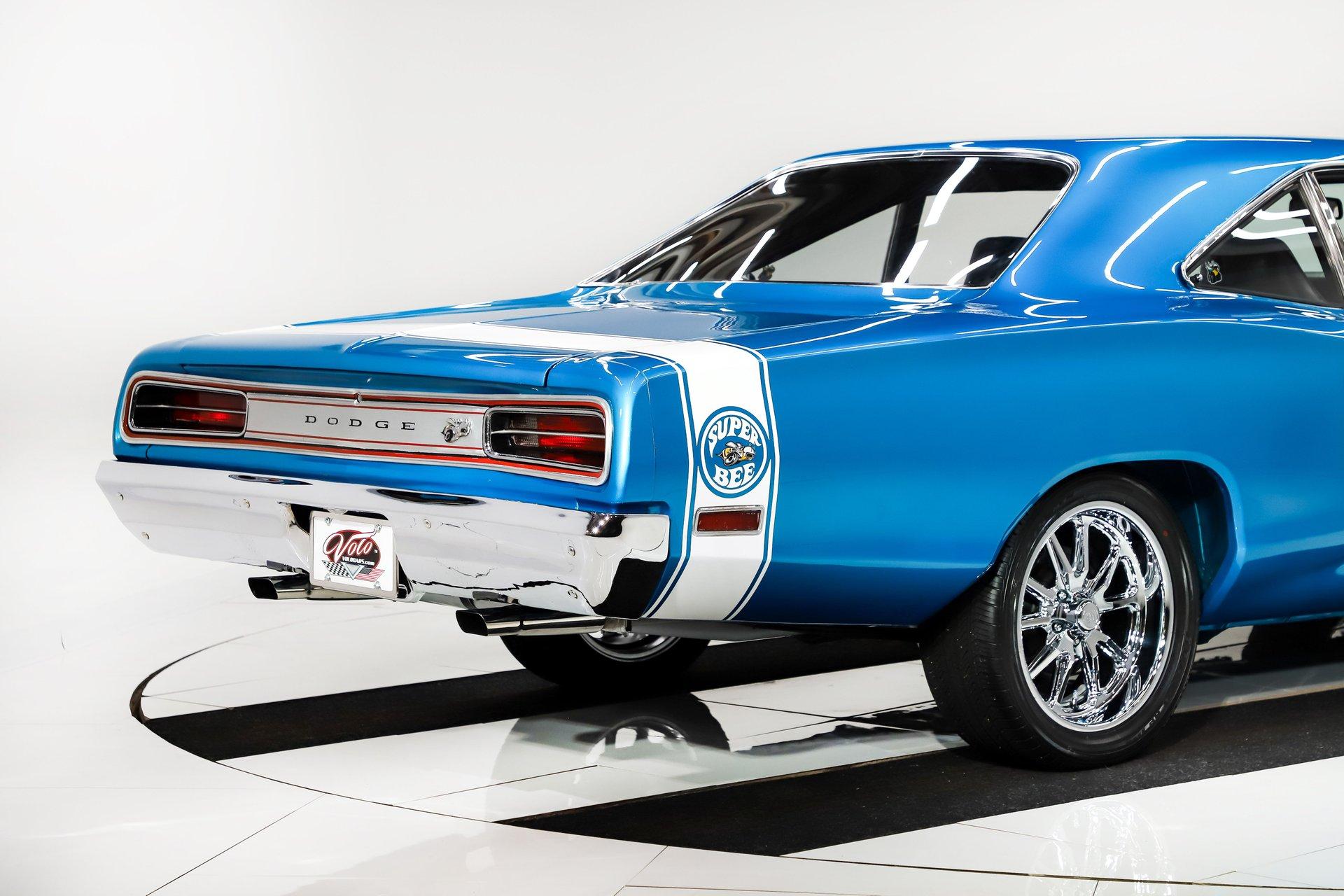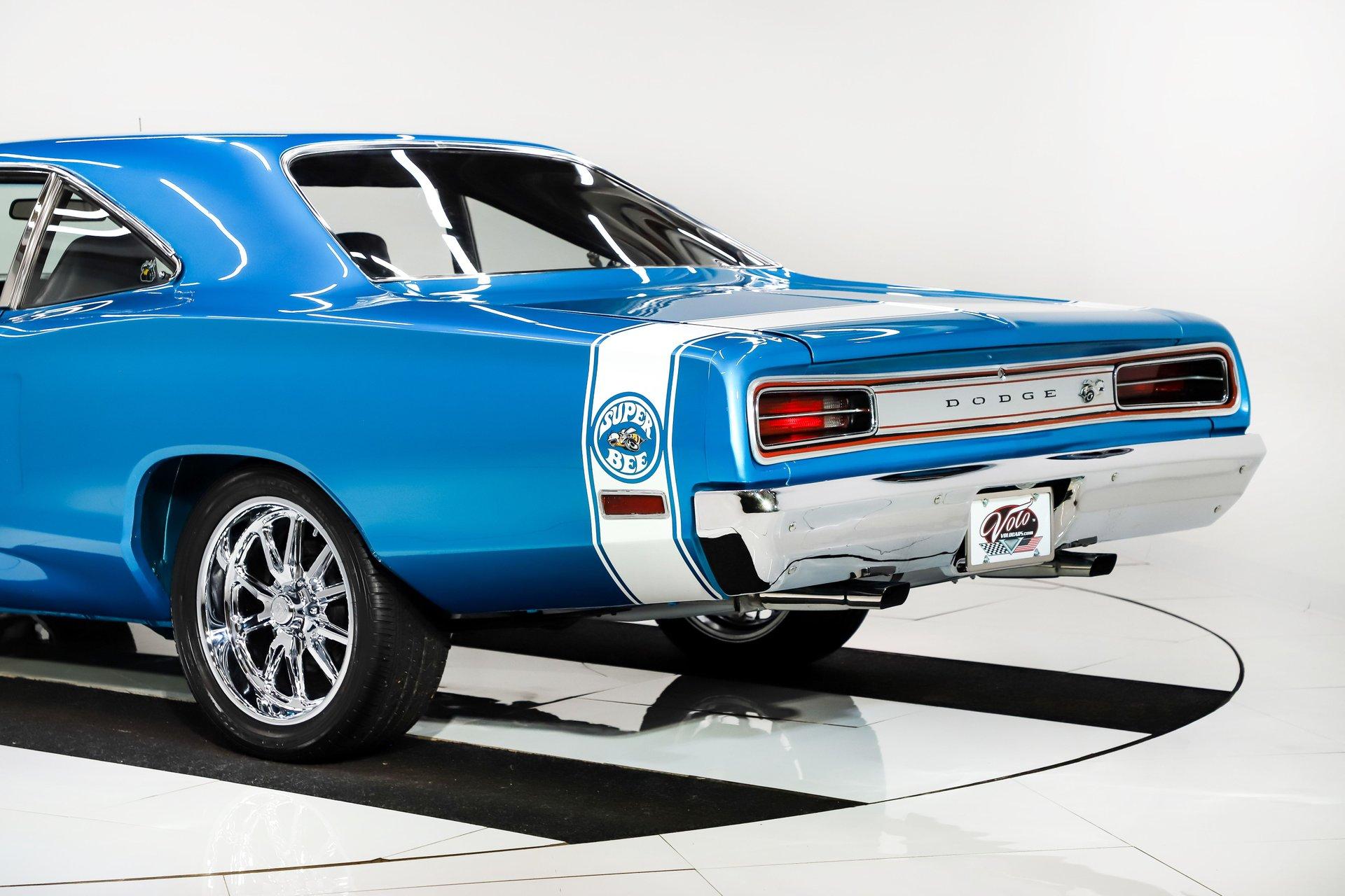 Rotisserie restoration! It is a real Super bee born with a pistol grip 4-speed, upgraded with a 440 6 pack! Not only is it stunning to look at, but it's a blast to drive too! EXTERIOR: Striking colors! The Bright Blue Metallic paint has been applied with great attention to detail. The metal flake is laid out very consistent. Looking down the side of the body it is nice and straight. All the panels have been properly aligned with consistent gaps. The doors close easily with minimal effort. Most of the glass appears to be original. The functioning hood scoops, and bumblebee rear stripe will draw attention everywhere you go. The front grill is virtually a piece of artwork and has been totally refinished. A set of new 18 inch US Mag wheels really look lively on this car, they are wearing new performance tires. INTERIOR: The perfect blend of new and original! Features include bucket seats with a console and the legendary Pistol Grip shifter. The dash features rallye gauges including a tachometer and a factory Am-Fm radio. The headliner, dash pad, door panels, seats, and carpeting have all been replaced. The visors, rear view mirror, gauges, gauge bezel, radio, climate control, steering wheel, door handles, seat belts, center console, and shifter all appear to be original but in remarkable condition. It's a blast stroking through the gears with that long throw Hurst pistol grip shifter. All the interior lights are working. ENGINE COMPARTMENT: Screaming V8 with a 6 pack! The gargantuan 440 cubic inch engine has three 2-barrel carburetors wonderfully tuned and begging to be driven. It's been upgraded with high performance upswept exhaust manifolds and electronic ignition. The horns and squirters are hooked up. The battery is properly secured. All the hoses and wires have been replaced. The original fender tag is still in place. The underside of the hood, fender wells and firewall have all been painted body color with the same shine too. TRUNK COMPARTMENT: The underside of the trunk lid and jamb are painted slick just like the body. A reproduction sticker was added, and the weather stripping was replaced. The trunk pan metal is solid and painted body color, there's a rubber mat protecting the paint. It’s equipped with a full-size spare tire and jack assembly. UNDERSIDE: With a detailed rotisserie restoration this car looks fantastic from any angle! Steering system was completely rebuilt. Suspension also rebuilt and upgraded with Gas-a-Just shocks. The emergency brake is hooked up. The exhaust system was upgraded with a cross over pipe and dual Dynomax mufflers. The gas tank was replaced and has all new lines too. Looking up at the 440 6 pack engine it looks fresh with neatly applied paint. The 4-speed manual transmission is VIN # matching. The floorboards are solid and rust free with body colored paint. It looks new under this Bee! This is just a fun, iconic muscle car! With a rotisserie restoration, 440 six pack engine, and pistol grip shifter this Super Bee checks all the boxes. Not only does it look really good, it drives really nice too. Take this out for a cruise and be proud to show it off. It'll be a conversation starter wherever you take it. The look and the sound, that's why we fell in love with it! I, Jay Grams, take pride in personally writing the descriptions for virtually every car for about the last 30 years now. A significant amount of effort goes into fact checking. What I am offering is my professional impression of the vehicle. Our salesmen are happy to assist with descriptions and making sure your questions are answered. One great suggestion is letting us do a walk around video that explains the car's condition in detail. **These cars are displayed in a museum. If interested in a particular car, make an appointment with a salesman to see that car. Without an appointment there is an admission fee to enter the showroom. If you buy a car, your admission will be refunded, and you will be given a 1 year membership. 815 385 3644 9-5 central Sales@volocars.com Answered ASAP Six pack carbs Bucket seats Center console Pistol grip shifter Rallye gauges embroidered mats Am-Fm radio Hood scoop Rallye wheels Bumblebee stripe Dual exhaust