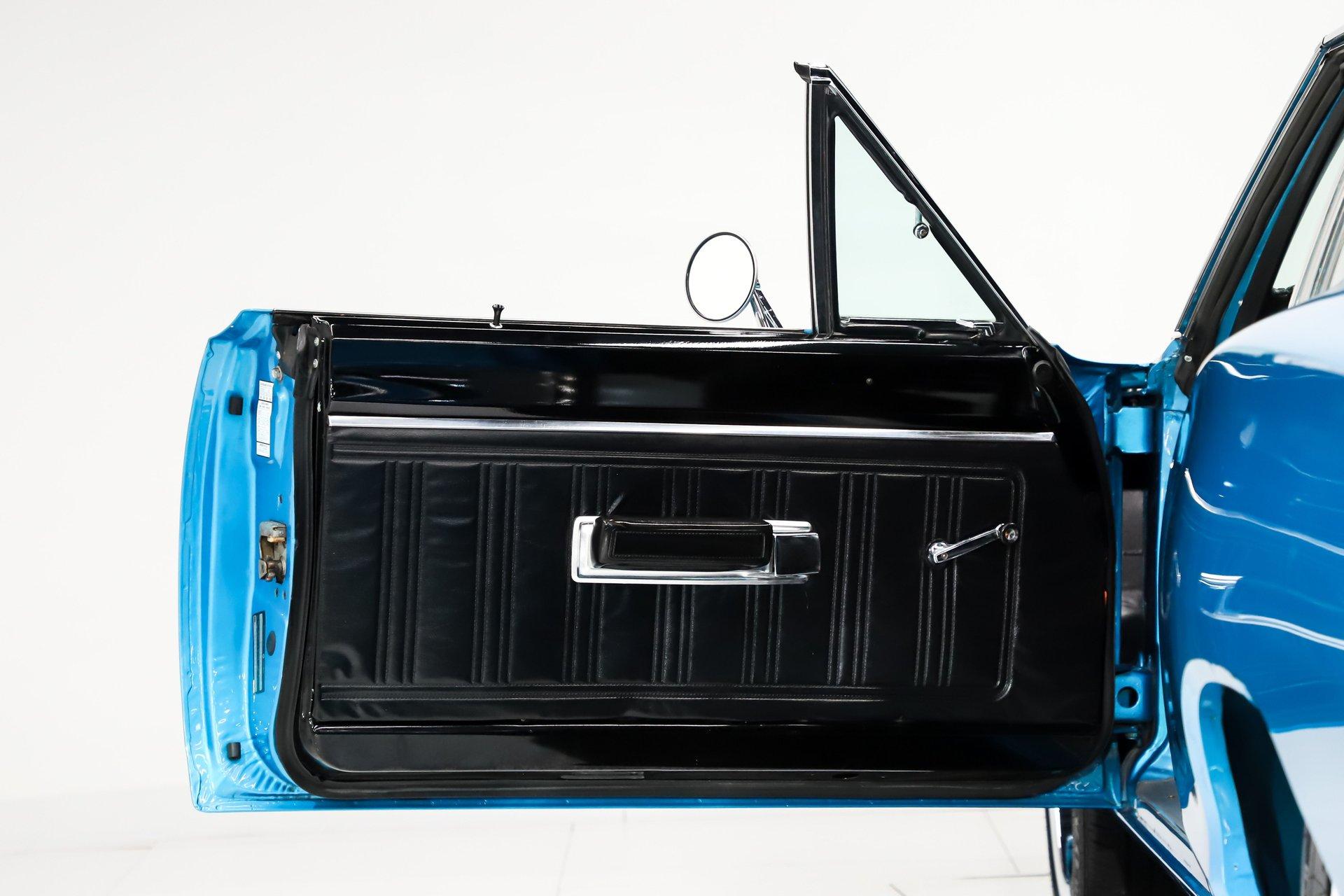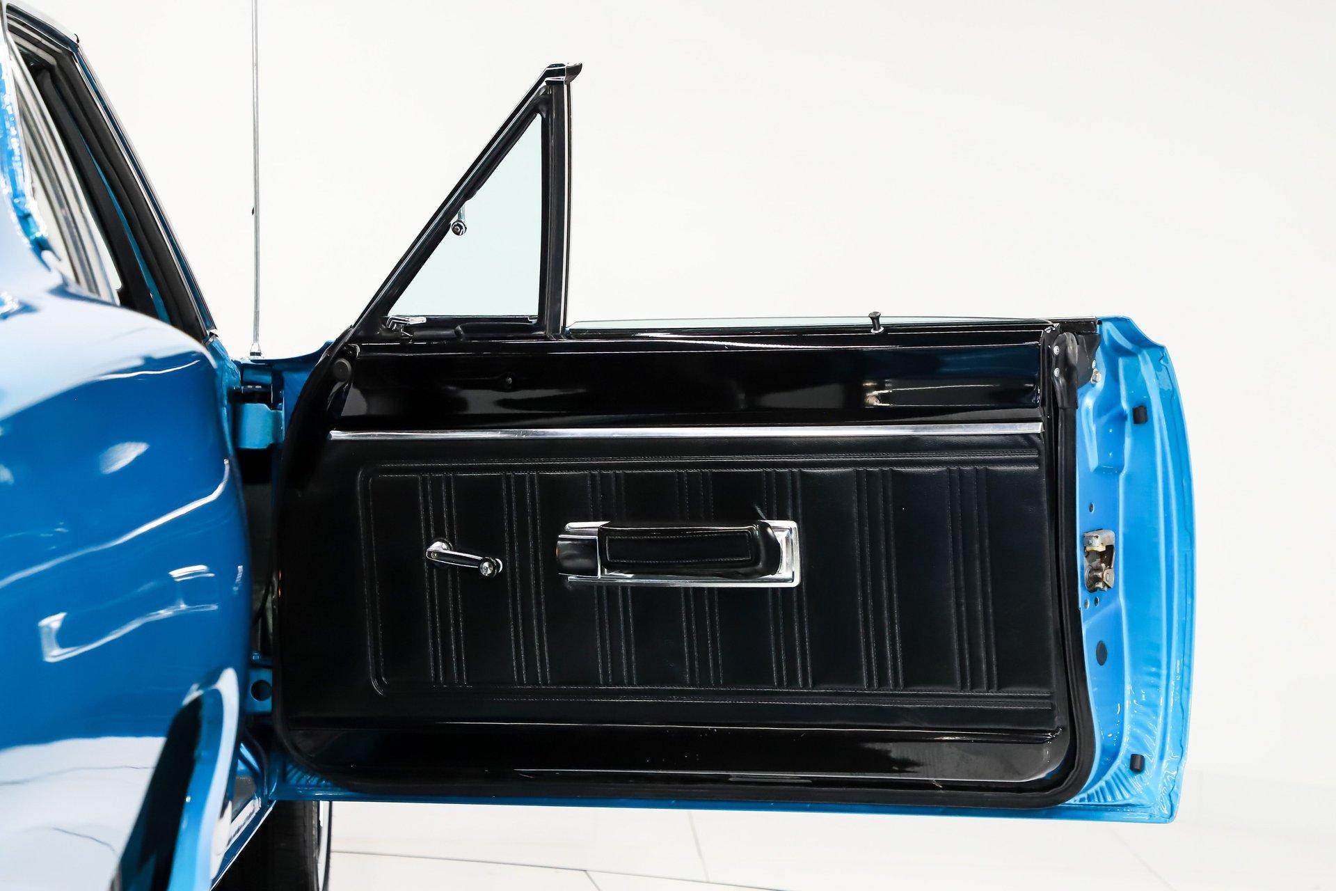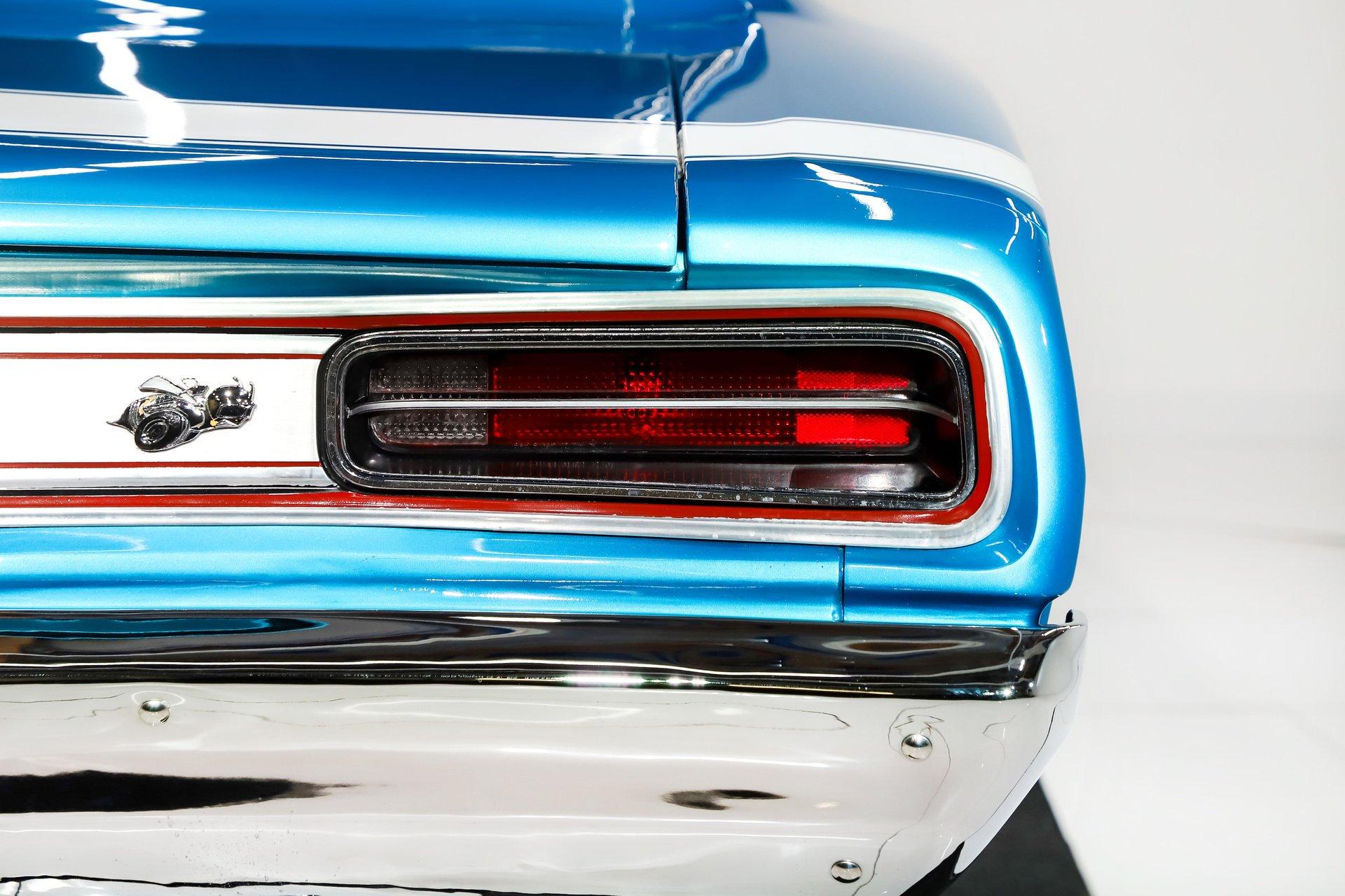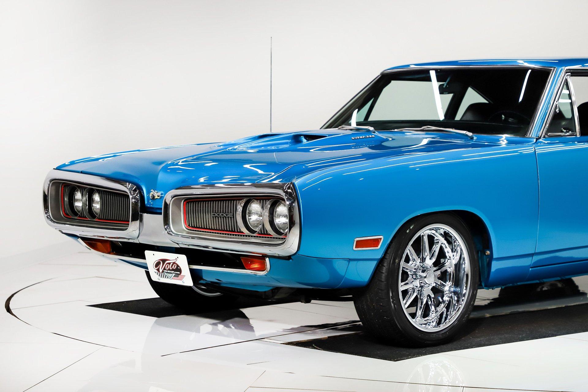 Rotisserie restoration! It is a real Super bee born with a pistol grip 4-speed, upgraded with a 440 6 pack! Not only is it stunning to look at, but it's a blast to drive too! EXTERIOR: Striking colors! The Bright Blue Metallic paint has been applied with great attention to detail. The metal flake is laid out very consistent. Looking down the side of the body it is nice and straight. All the panels have been properly aligned with consistent gaps. The doors close easily with minimal effort. Most of the glass appears to be original. The functioning hood scoops, and bumblebee rear stripe will draw attention everywhere you go. The front grill is virtually a piece of artwork and has been totally refinished. A set of new 18 inch US Mag wheels really look lively on this car, they are wearing new performance tires. INTERIOR: The perfect blend of new and original! Features include bucket seats with a console and the legendary Pistol Grip shifter. The dash features rallye gauges including a tachometer and a factory Am-Fm radio. The headliner, dash pad, door panels, seats, and carpeting have all been replaced. The visors, rear view mirror, gauges, gauge bezel, radio, climate control, steering wheel, door handles, seat belts, center console, and shifter all appear to be original but in remarkable condition. It's a blast stroking through the gears with that long throw Hurst pistol grip shifter. All the interior lights are working. ENGINE COMPARTMENT: Screaming V8 with a 6 pack! The gargantuan 440 cubic inch engine has three 2-barrel carburetors wonderfully tuned and begging to be driven. It's been upgraded with high performance upswept exhaust manifolds and electronic ignition. The horns and squirters are hooked up. The battery is properly secured. All the hoses and wires have been replaced. The original fender tag is still in place. The underside of the hood, fender wells and firewall have all been painted body color with the same shine too. TRUNK COMPARTMENT: The underside of the trunk lid and jamb are painted slick just like the body. A reproduction sticker was added, and the weather stripping was replaced. The trunk pan metal is solid and painted body color, there's a rubber mat protecting the paint. It’s equipped with a full-size spare tire and jack assembly. UNDERSIDE: With a detailed rotisserie restoration this car looks fantastic from any angle! Steering system was completely rebuilt. Suspension also rebuilt and upgraded with Gas-a-Just shocks. The emergency brake is hooked up. The exhaust system was upgraded with a cross over pipe and dual Dynomax mufflers. The gas tank was replaced and has all new lines too. Looking up at the 440 6 pack engine it looks fresh with neatly applied paint. The 4-speed manual transmission is VIN # matching. The floorboards are solid and rust free with body colored paint. It looks new under this Bee! This is just a fun, iconic muscle car! With a rotisserie restoration, 440 six pack engine, and pistol grip shifter this Super Bee checks all the boxes. Not only does it look really good, it drives really nice too. Take this out for a cruise and be proud to show it off. It'll be a conversation starter wherever you take it. The look and the sound, that's why we fell in love with it! I, Jay Grams, take pride in personally writing the descriptions for virtually every car for about the last 30 years now. A significant amount of effort goes into fact checking. What I am offering is my professional impression of the vehicle. Our salesmen are happy to assist with descriptions and making sure your questions are answered. One great suggestion is letting us do a walk around video that explains the car's condition in detail. **These cars are displayed in a museum. If interested in a particular car, make an appointment with a salesman to see that car. Without an appointment there is an admission fee to enter the showroom. If you buy a car, your admission will be refunded, and you will be given a 1 year membership. 815 385 3644 9-5 central Sales@volocars.com Answered ASAP Six pack carbs Bucket seats Center console Pistol grip shifter Rallye gauges embroidered mats Am-Fm radio Hood scoop Rallye wheels Bumblebee stripe Dual exhaust