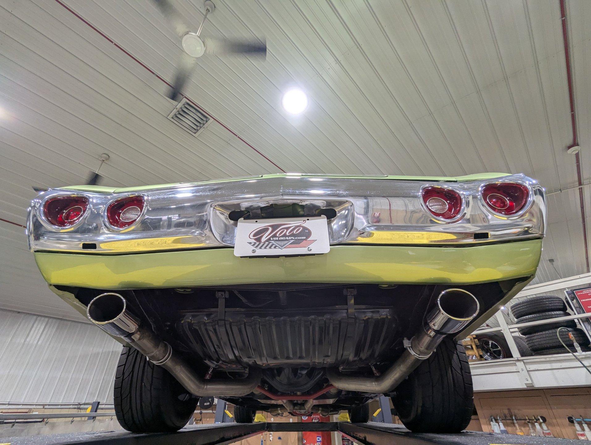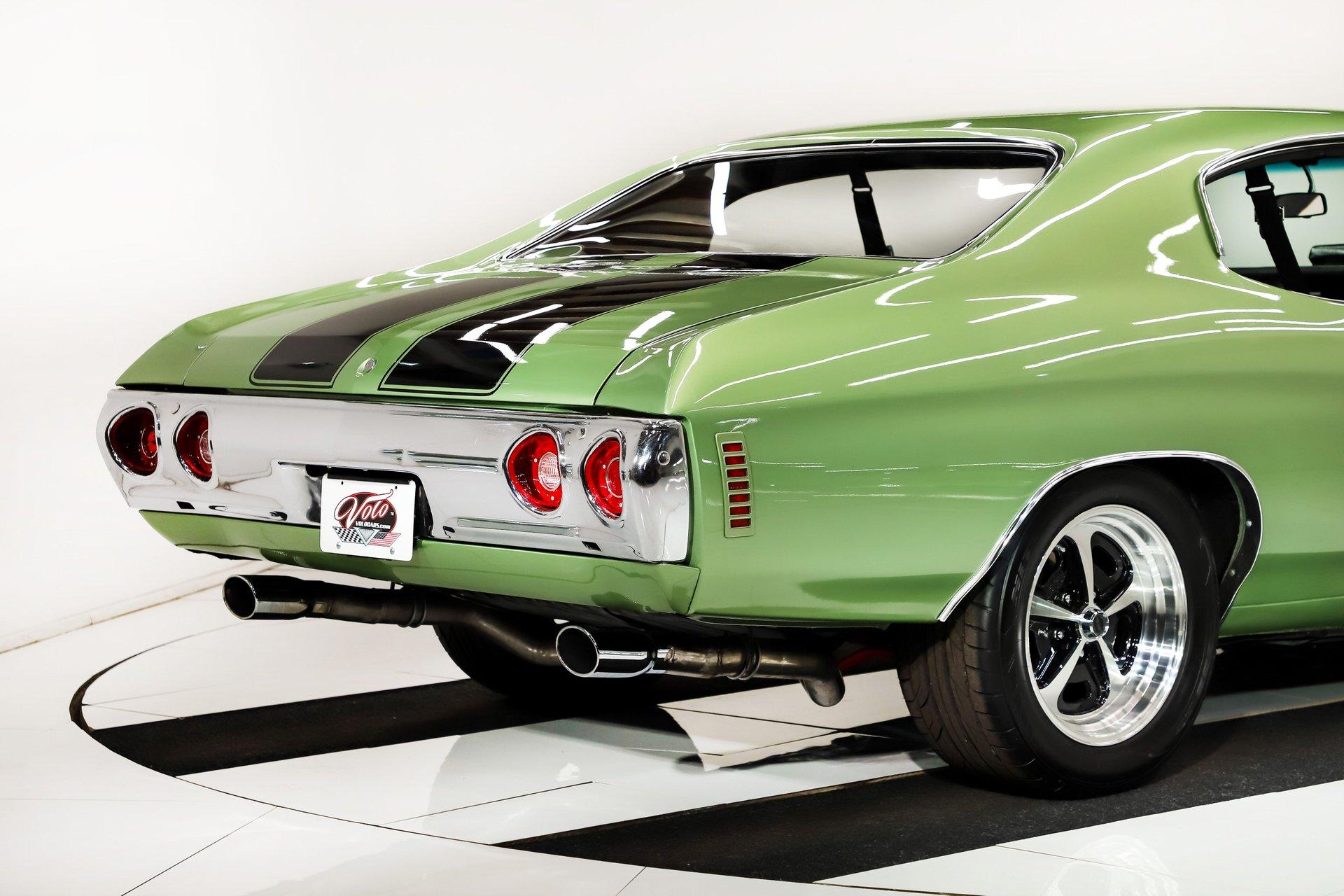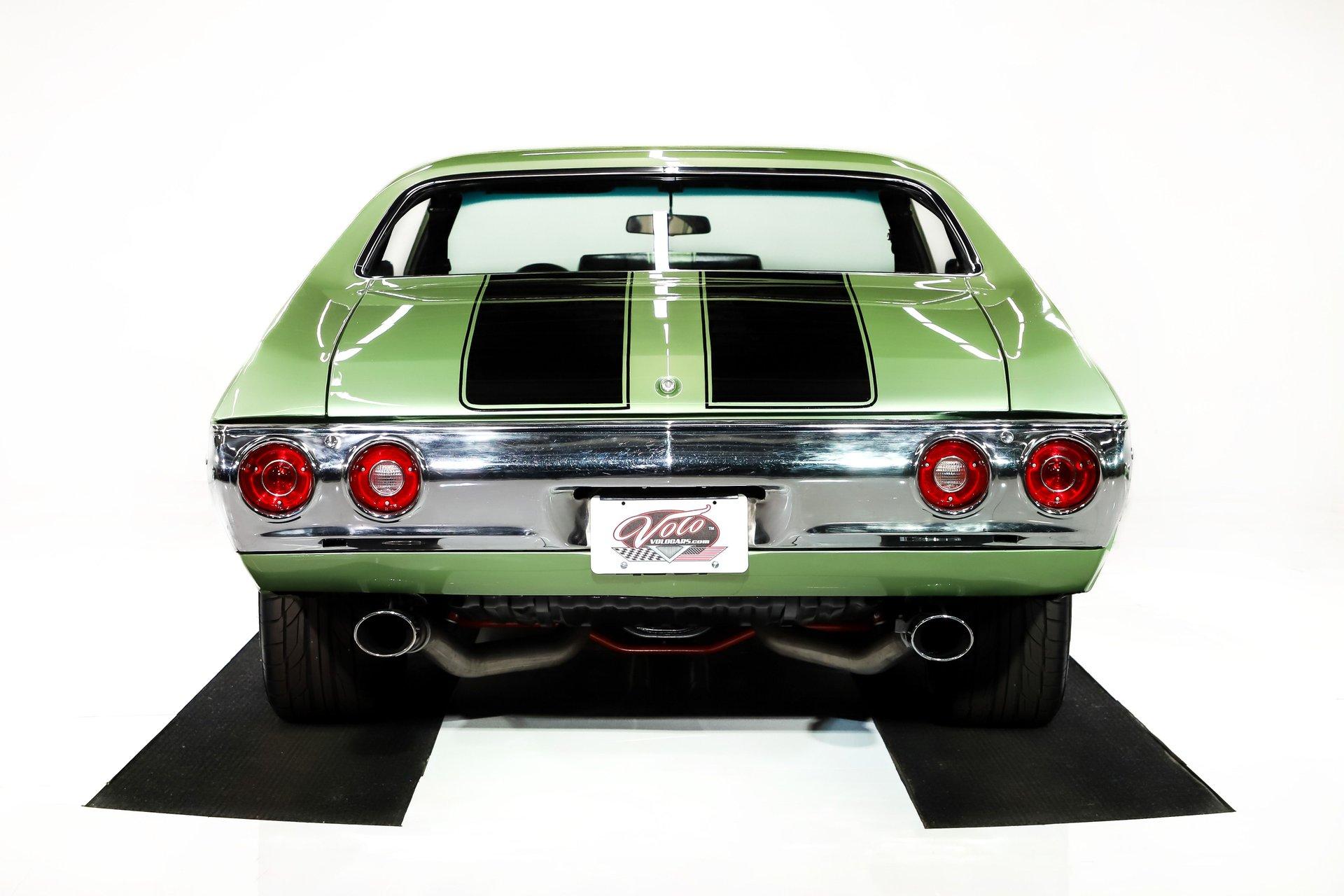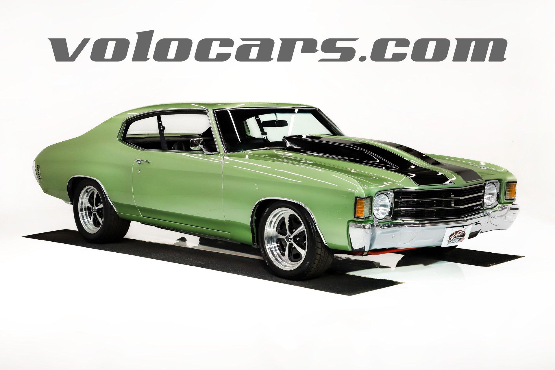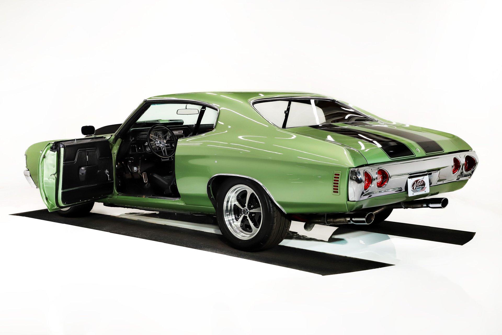 Celebrating our 65 year anniversary! This family owned and operated business was established in 1960, making us the oldest classic car dealership in America. Special thank you to all our customers for entrusting us to park the car of your dreams in your driveway while preserving automotive history for future generations to embrace and enjoy. -Grams family & Volo Museum staff INTRODUCTION: Wicked fast! If a 632 cubic inch, 815 horsepower crate V8 doesn’t get your juices flowing, check your pulse! Frame off restoration with lots of driver friendly upgrades including, fuel injection, air conditioning, Tremec 5 speed, custom interior, and much more. This one is built to the hilt and not for the faint of heart! EXTERIOR: She's got the look! The Gulf Green paint was neatly applied and polished to a reflective finish. The black racing stripes are also painted on and really enhance the overall aesthetic alongside the cowl induction hood. All the panels have been painstakingly aligned and the doors close easily with minimal effort. The bright work has a lustrous shine. All the glass was replaced plus it has new rubber seals and fuzzy strips. LED headlights and dual side view mirrors are much appreciated options. The front grille appears to be brand new. The ensemble is rolling on an attractive set of 17x9 SS billet wheels with Nitto performance tires. INTERIOR: Custom and comfortable! I love the Dakota Digital Retrotech gauges that are backlit and include a very useful tachometer. It also has an upgraded Vintage Air climate control panel with easy to use electric slides. A retro stereo, USB port, and rear JBL speakers keep the good vibes going. I'm sitting on a very comfortable and attractive reclining TMI bucket seat. In back is a matching TMI bench seat. Lots of other brand new parts including side panels, armrests, window cranks, and fresh carpet on the floor with reproduction floor mats. It also has a nice reproduction console with 5 speed manual shifter sticking out of it. The tilt column, cushion group wheel retractable, front retractable seat belts, headliner, and sun visors are all nice and new. The car was rewired including full harness and an updated push-in fuse block. ENGINE COMPARTMENT: Goodness gracious! A BluePrint Crate Pro Series 632 cubic inch big block making 815 hp & 775 lbs of torque steals the show! It has a forged crank, rods & pistons, roller cam, aluminum heads, and high rise intake manifold. Dyno tuned right at the assembly plant. It also has a custom made S3 ECU EFI Harness, Hooker Super Competition coated headers, Accufab throttle body fuel injection, Wilson manifold injectors, MSD ignition system and polished valve covers. The front of the engine has an EM frontrunner system with all polished components including the mini A/C compressor, serpentine pulleys, Powermaster one wire alternator, and modern power steering with remote reservoir. It runs cool with an upgraded aluminum radiator including overflow bottle, water pump, and dual electric fans. The chrome hose clamp covers are a very attractive finishing touch. It also has a Optima red top gel battery and the squirters are hooked up. Upgraded billet aluminum strut assisted hinges help you lift the hood effortlessly. The engine bay is nearly painted body color and has a nice 1972 Chevelle front filler panel. TRUNK COMPARTMENT: Painted and proper! Under the trunk lid, inside the jamb, and the entire compartment has clean rust free metal painted Gulf Green. It has a custom cut carpeted mat with bound edges and a piece of insulation underneath it to keep things dry. The weatherstrip was also replaced. UNDERSIDE: Body off frame restored and highly upgraded! The front steering and suspension was completely replaced with beefy tubular control arms, coil over adjustable gas shocks, and a fat swaybar. In back it has tubular control arms, swaybar, lowering springs, and Fox adjustable gas shocks. Long tube headers connect to a fat dual exhaust system with crossover pipe, Flowmaster mufflers, and stainless tips exiting under the rear bumper. The fuel system was completely replaced including new lines. Upgraded front brakes with a Wilwood Superlite big brake kit including drilled and slotted rotors and 6 piston calipers. Also has new 11” disc brakes in back and the emergency brake is hooked up. When looking up at the engine it has an extra capacity oil pan and a high torque starter. The new Tremec TKX 5-speed manual trans also looks great and has extremely upgraded Cryo treated internals, heavy Duty scatter shield, billet flywheel, and Centerforce dual friction hydraulic clutch. A race balanced driveshaft transfers all those horses to an American Powertrain 9 inch rear end with 3.70 posi gears and 31 spline axles. SERVICE: We take pride in our cars and reputation. Therefore, we built a 2 million dollar, 10,000 square ft service center, and hired a team of technicians to service the essentials on every car we sell. CONCLUSION: Don't think twice! A car this good looking and fast will fly off our showroom floor just about as quick as it will go down the quarter mile! Hang on tight because it's going to be a wild ride! For nearly 30 years, I, Jay Grams, have personally written the highlights for almost every car in our collection. What I provide is my professional opinion based on my experience with these vehicles. However, opinions can vary, and I strongly recommend a personal inspection to form your own view. Our sales team is always available to answer any questions you may have. One great option is to request a personalized walk-around video, where we can showcase the car and share our team’s insights. **Our cars are displayed within a museum setting. If you are interested in a specific vehicle, please schedule an appointment with a salesperson to view it. Without an appointment, there is an admission fee to enter the showroom. If you decide to purchase a car, your admission will be refunded, and you'll receive a one-year 