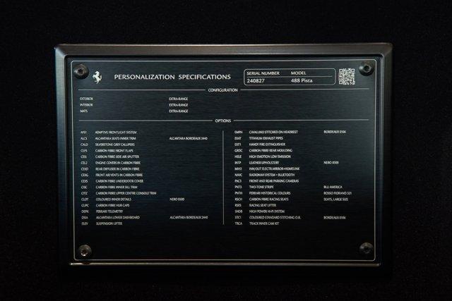 Ferrari 488 Pista- FERRARI CERTIFIED PRE-OWNED - FERRARI POWER WARRANTY TO 10/31/27 -- Rosso Fiorano over Nero - Two Owners - Very Low Miles - Pristine Condition - Many Fine Options - Expertly Maintained by Our Factory Trained Technicians - Ferrari Power Warranty to 10/31/27 - Complimentary Ferrari Genuine Maintenance Service to 1/30/26 -Factory Options:- Suspension Lifter- Ferrari Historical Color- Racing Stripe in Argento Nurburgring and Blu America- Carbon Fiber Front Air Vents- Carbon Fiber Front Flaps- Carbon Fiber Side Air Splitters- Carbon Fiber Engine Covers- Carbon Fiber Rear Diffuser- Carbon Fiber Rear Moulding- Carbon Fiber Underdoor Covers- Carbon Fiber Wheel Caps- Carbon Fiber Upper Center Console- Carbon Fiber Inner Sill Trim- Carbon Fiber Racing Seats- Racing Seat Lifter- Grigio Silverstone Brake Calipers- Leather Upholstery in Nero- Alcantara Lower Dashboard in Bordeaux- Alcantara Inner Seat Trims in Bordeaux- Cavallino Stitched to Headrests in Bordeaux- Stitching in Bordeaux- Colored Inner Details in Nero- High Power HiFi Sound System- Ferrari Telemetry- Track Inner Cameras Kit- Titanium Exhaust Pipes- Adaptive Frontlight System (AFS)- Inner and Outer Electrochromic Mirrors with HomeLink- Radio Navigation System with Bluetooth- Front and Rear Parking Cameras- Fire Extinguisher- High Emotion Low Emission (HELE) SystemIf you are in the market for a Ferrari 488 Pista, please call or email us today.This Ferrari has passed a multi-point inspection performed by our factory trained technicians, and has been enrolled in the Ferrari Approved Certified Pre-Owned Program. The Certified program makes available up to two years of additional Ferrari Approved Warranty coverage. Please see dealer for more details.