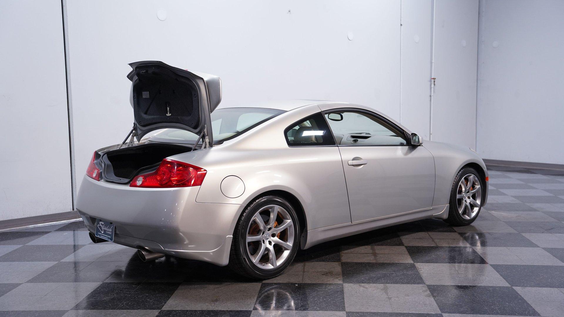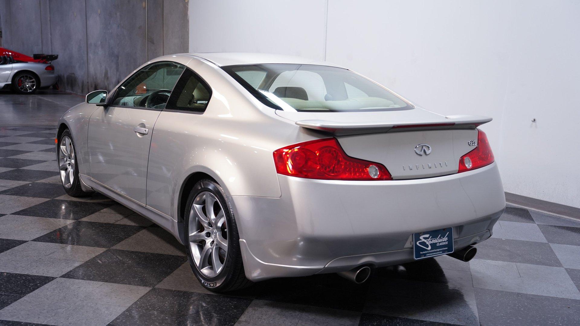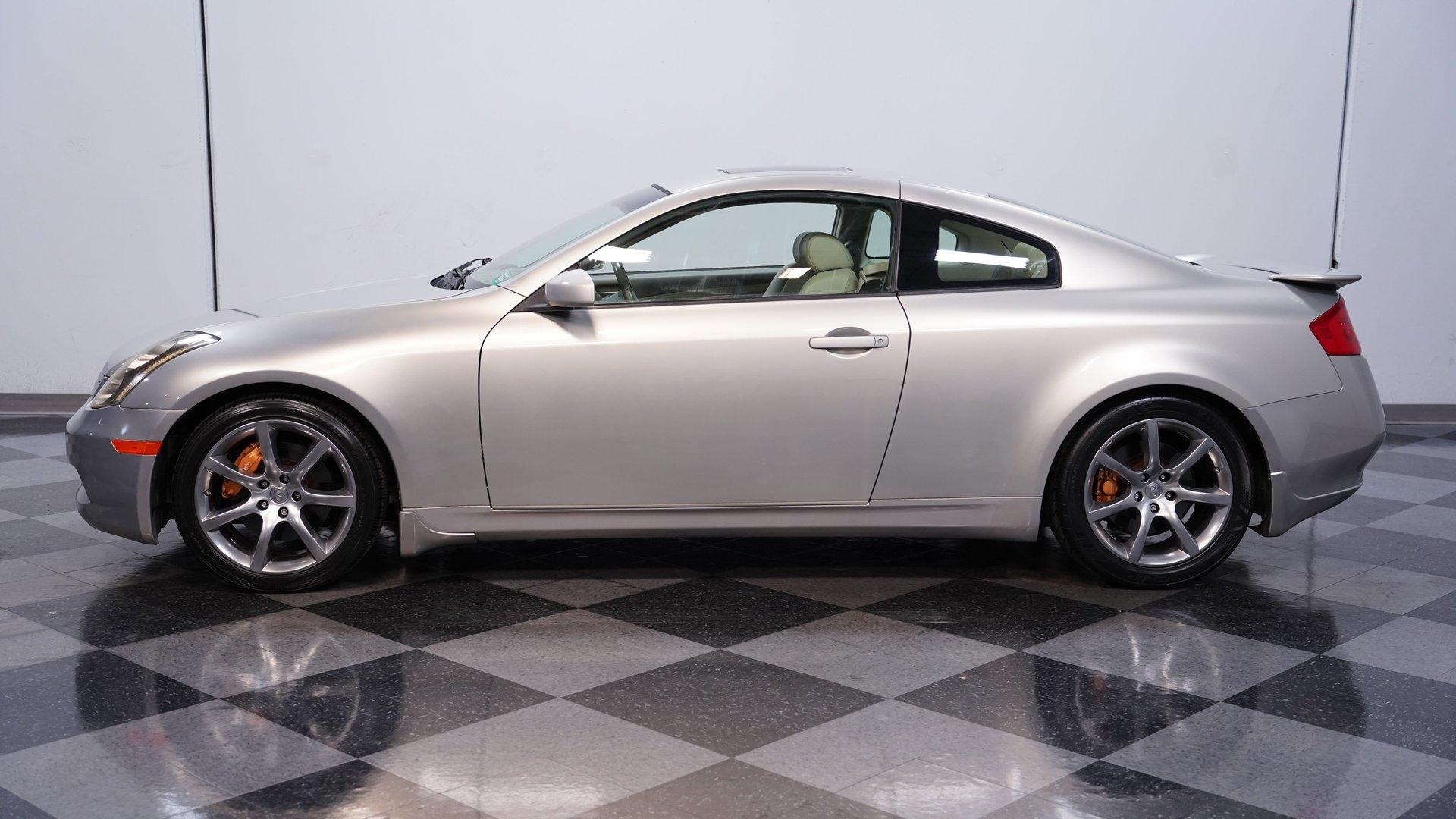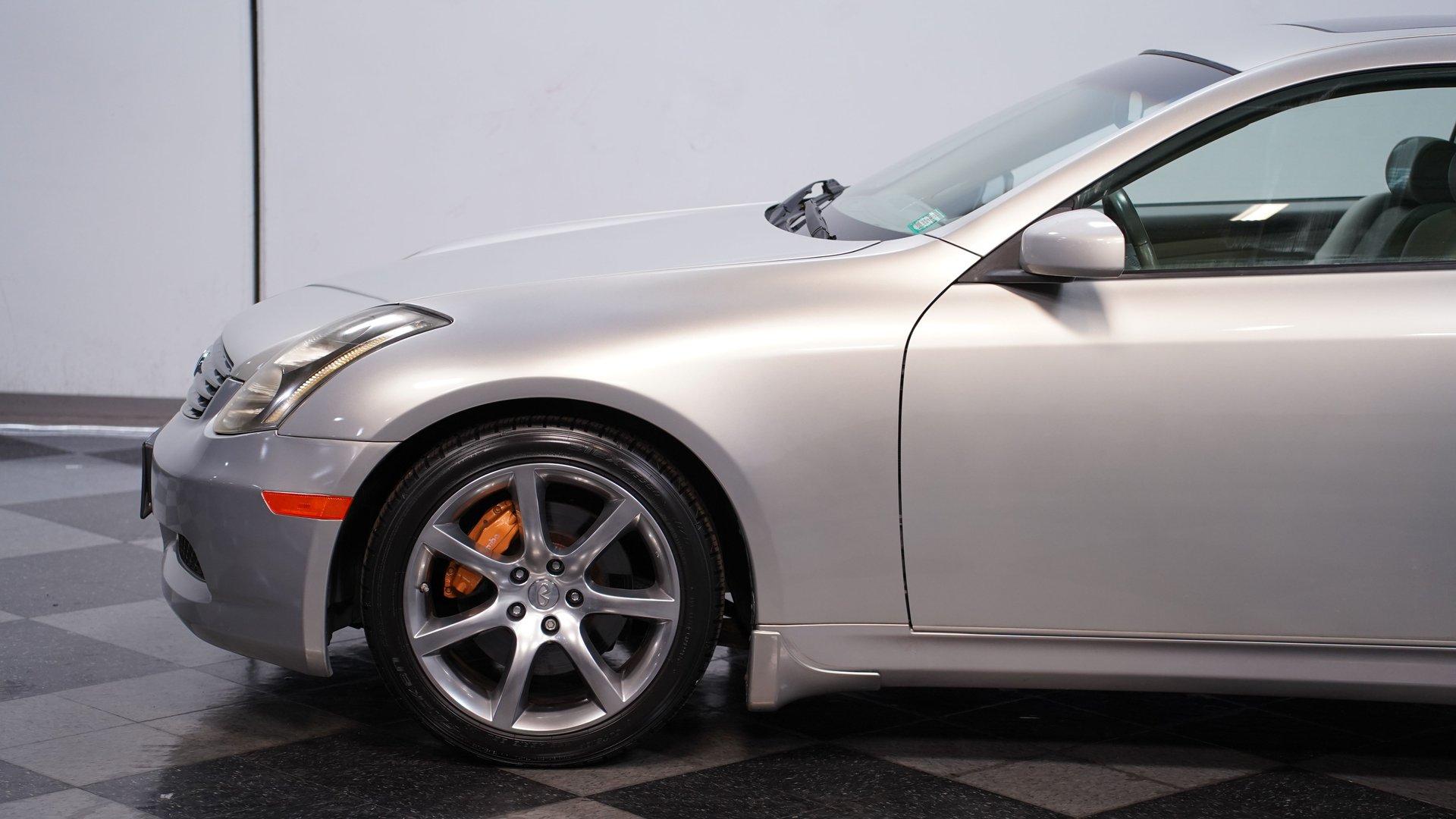 Sleek, fun, and sporty, this 2004 Infiniti G35 Coupe might be two decades old on paper, but with just 6,743 actual miles from its one and only owner, this sports coupe has aged like the automotive child of Keanu Reeves and Halle Berry. Decked out in its believed original Desert Platinum paint, it is about as pristine an example as you will ever find of Infiniti's first-generation G-Series. Inside, we find an almost-new-looking Frost/Desert Platinum leather interior. A center console separates a pair of plush, power, and heated bucket seats, while a three-spoke, power-assisted wheel sits just ahead of an orange-hued analog gauge cluster featuring a 160 mph speedometer and 8,000 rpm tachometer. Power windows, locks, mirrors, and sunroof, along with a telescopic wheel, air conditioning, cruise control, and an AM/FM/CD/Cassette stereo system, offer all the modern amenities anyone could want from a turn-of-the-century luxury sports car. Under the hood, we find a naturally aspirated 3.5-liter DOHC V-6 engine. This VQ35 comes with a lightweight aluminum block and heads foundation that, from the factory, made an impressive 280 horsepower and 270 pound-feet of torque. That power is routed through a tried-and-true six-speed manual transmission before being sent out to the factory rear end. 18-inch wheels shod in Falken rubber stand ready to put those ponies to the pavement whenever you are. HIGHLIGHTS: 6,743 Actual Miles Yes 6,743 Actual Miles One Owner Believed Original Desert Platinum Paint Believed Original Body Panels 3.5 Liter DOHC VQ V6 Aluminum Block and Heads Six Speed Manual Factory Rear End 18 Inch Wheels Brembo Power Disc Brakes Independent Suspension Power Steering Leather Interior Power Sunroof Power Locks Power Windows Power Mirrors Power Seats Heated Seats AM/FM/CD/Cassette Two Keys Valet Key Original Window Sticker Owner's Manual This 2004 Infiniti G35 Coupe rides on a fully-independent suspension, while power Brembo brakes sit at all four corners to scrub off speed whenever necessary. This ultra-low-mileage, one-owner car comes with two keys, a valet key, its owner's manual, and its original window sticker. So, if you missed out the first time around, this twenty-one-year-old car has barely been broken in to the point where you'll think you're stuck in the Matrix. Thankfully, this car exists in the real world, but it won't be here long so don't wait, call today!