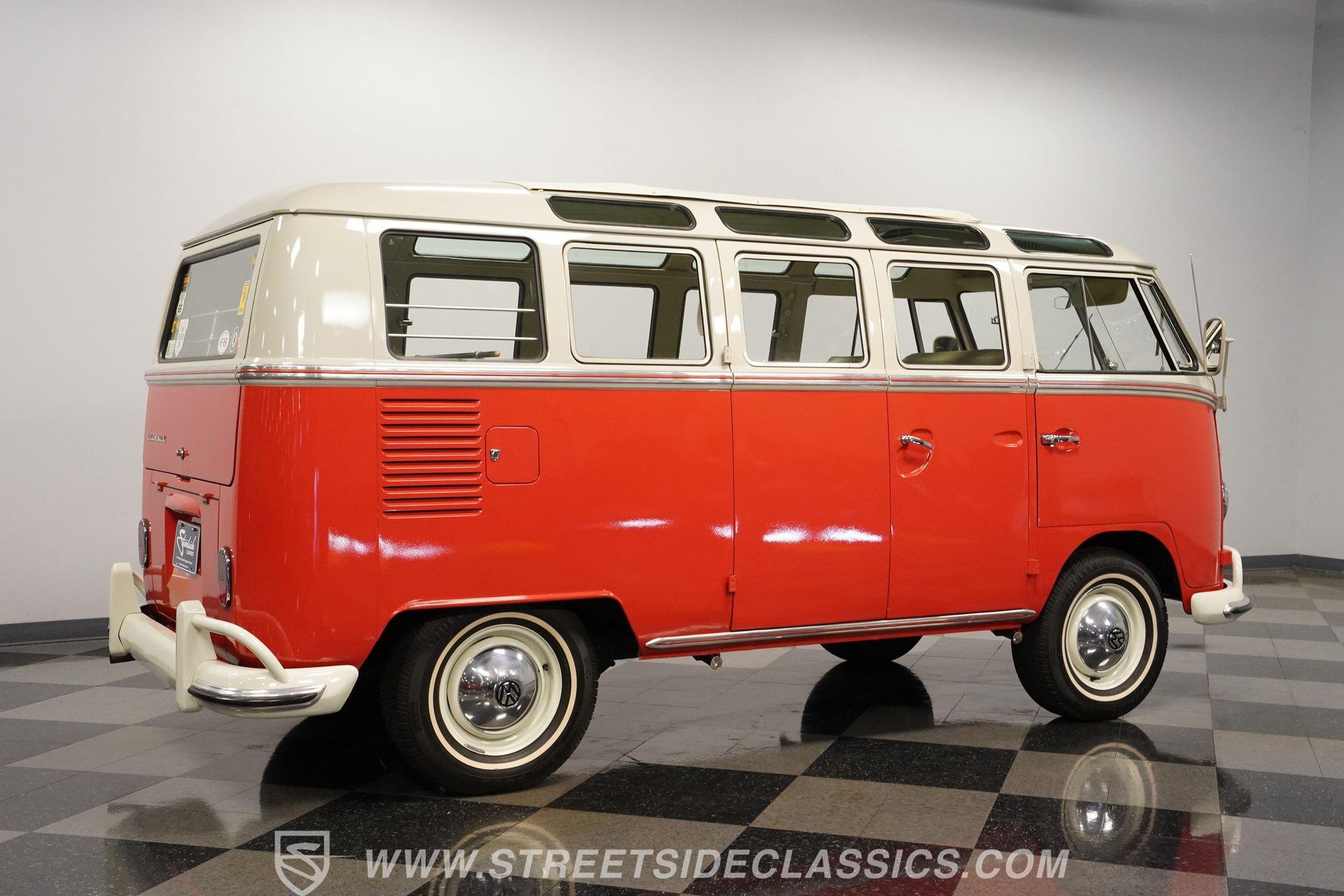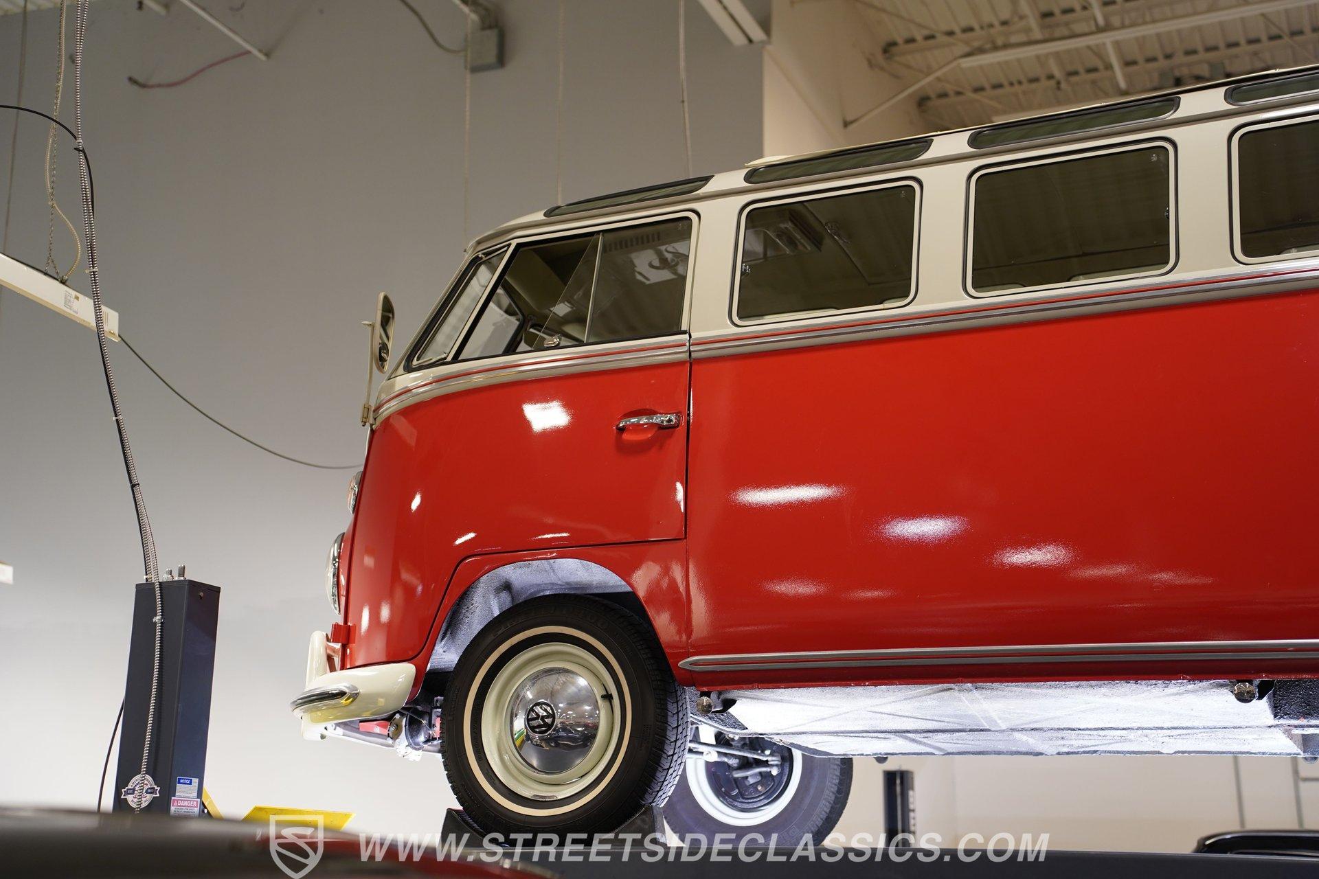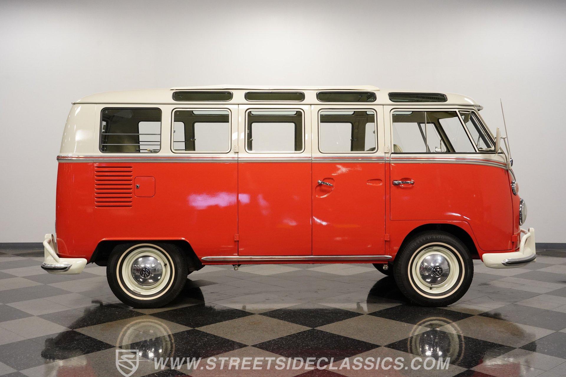 As a bona fide automotive symbol for an entire counterculture, this 1964 Volkswagen Type 2 21-Window Deluxe is about as iconic a ride as can be, and its distinctive configuration makes it even more so. The combination of its factory-correct, two-tone paint job and the open-air feeling conveyed by its multitude of windows gives you the impression that it was teleported into the present from its original era while transporting a group of sightseers across exotic territory. It's a very nice, fresh-looking presentation of a beloved classic, with well-aligned body panel gaps, doors that open and shut just as smoothly as they did when it first debuted more than 60 years ago, and brightwork that's been restored to top form. Climb inside, and you'll be greeted by an interior that has been treated to the same level of care, with vinyl-clad bench seating that shows only slight wear, including the rear row, which may still be wearing its original cover. Take a look around and you'll see well-fitted door panels and rubber matting that's in great shape. Up front, the instrument panel houses a VDO gauge that displays its readings through a clear lens, and to the right of it, you'll find a period-correct AM radio that stands ready to be called upon to provide an era-appropriate audio experience. You'd have to search high and low for quite some time to find a VW bus that drives as nicely as this one does. A glance at the engine compartment offers the first clue that it has also received plenty of attentive care, where you'll find its air-cooled 1500-cc powerplant sitting in the center of a nicely maintained bay. Fed by a factory-correct single-barrel carburetor, it really runs great, starting up promptly via a manual choke and idling smoothly. The accompanying 4-speed manual transmission shifts through the gears with no issues at all, and the clutch action is surprisingly smooth. When you're out on the road, this classic tracks arrow-straight, and the manual steering is more precise than you'd rightfully expect from a VW of its era. HIGHLIGHTS: PERIOD-CORRECT 1500-CC ENGINE WITH UPGRADED HEADS 1-BARREL CARBURETOR 4-SPEED MANUAL TRANSMISSION DRUM BRAKES 14" FACTORY-STYLE WHEELS FACTORY-CORRECT SEALING WAX RED AND BEIGE PAINT SUNROOF FACTORY-CORRECT SILVER BEIGE VINYL INTERIOR BENCH SEATING AM RADIO RESTORATION RECEIPTS AND PHOTOS INCLUDED Displaying all the earmarks of a very high-level restoration that has left it with outstanding curb appeal and excellent drivability, this 1964 Volkswagen Type 2 21-Window Deluxe cruises on a set of factory-correct 14" wheels wrapped with Pirelli tires still showing plenty of tread. It's perfectly positioned to provide plenty of future, fun-filled miles for its next lucky owner. Call today!