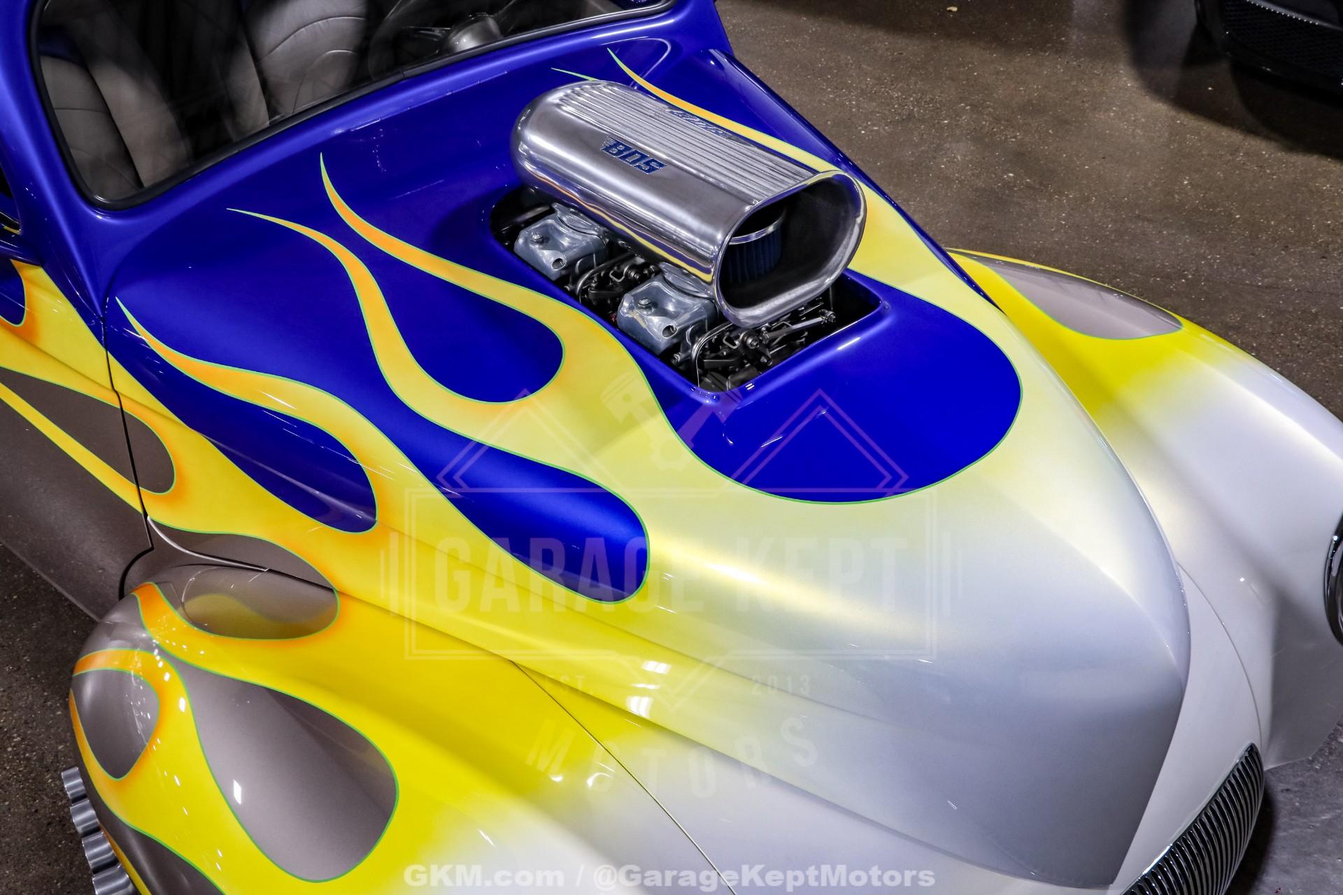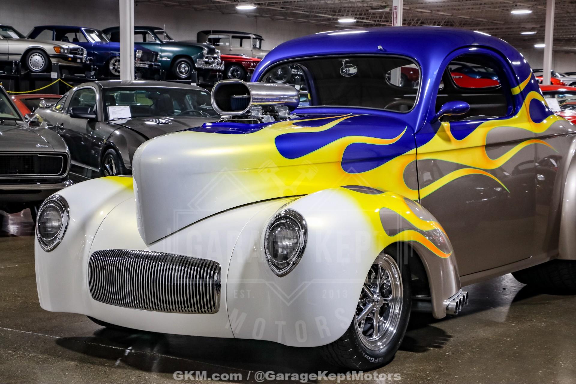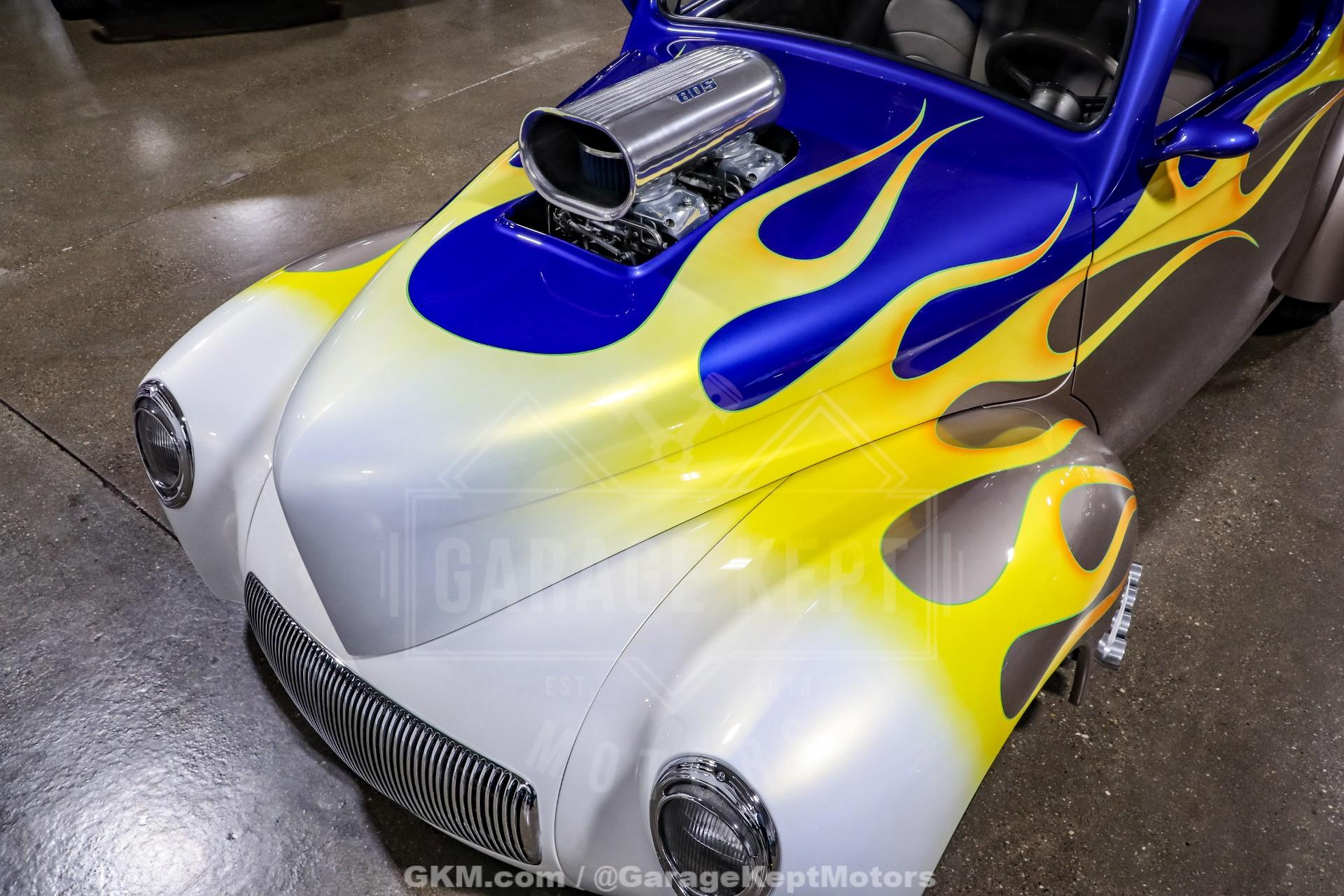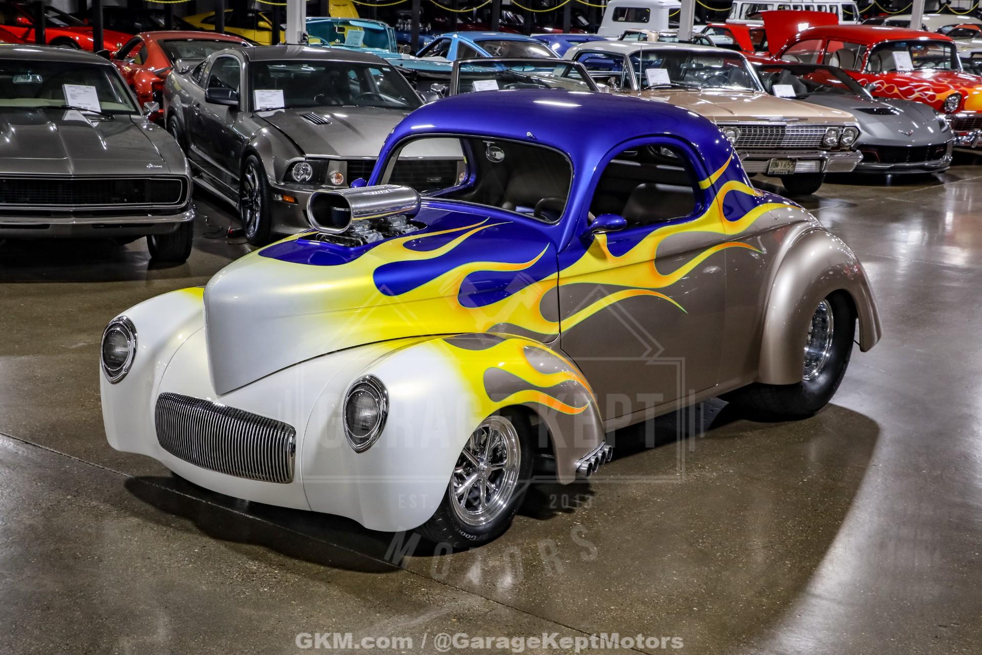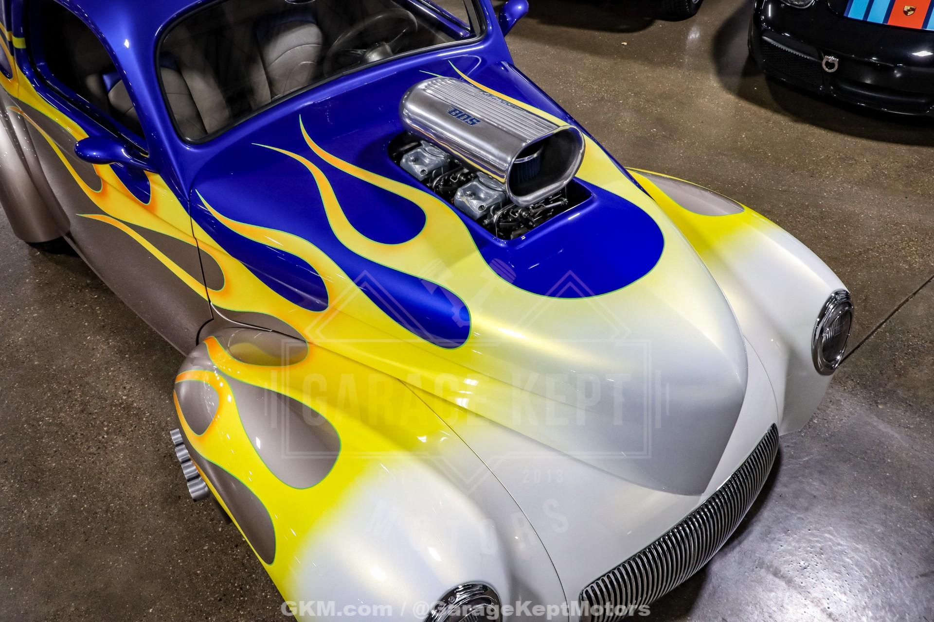 1941 Willys Coupe Street Rod- 540ci Supercharged Merlin V8- BDS 8-71 Supercharged- TH400 Three Speed Automatic Transmission- 9" Rear End- 4 Wheel Disc Brakes- Coilover Suspension- Vintage AC- Two Tone Blue and Silver With Yellow Flames- Tan InteriorThis 1941 Willys Coupe Street Rod is a head-turning, full-blown hot rod built for those who love vintage style with modern muscle and it doesn't disappoint. Under its sleek fiberglass Willys-style body sits a massive 540 ci Merlin V8, supercharged with a BDS 8-71 blower feeding dual Demon four-barrel carbs, sending immense torque through a TH400 three-speed automatic and a sturdy 9" rear end. The result: raw, honest power wrapped in classic '40s hot-rod attitude.The exterior dazzles in a striking two-tone blue and silver finish, complete with yellow flame accents a nod to traditional gasser and street-rod roots. The body sits on a boxed and reinforced custom frame, with shaved handles, dual side mirrors, and front-fender exhaust outlets that highlight both craftsmanship and performance intent. Underneath, adjustable coil-over suspension and four-wheel disc brakes give the car real drivability and stopping power far beyond what the original Willys could have offered.Step inside and you're greeted with a tan-upholstered interior featuring comfortable bucket seats, a tilt steering column, Vintage Air conditioning, power windows, and full AutoMeter instrumentation including boost, oil pressure, and temperature gauges. The trunk even carries a finished interior and subtle Willys badging, showing that this build spares no detail, blending function and show quality.Titled as a 1941 Willys, this street rod stands not only as a powerful cruiser but as a showcase piece of craftsmanship and hot-rod heritage. If you've been dreaming of a classic coupe with modern performance one that roars to life with raw power yet turns heads with retro flair this Willys Coupe Street Rod is a rare opportunity to own something truly special.