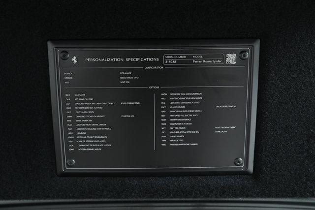 Ferrari Roma Spider- FRONT END PPF -- FERRARI CERTIFIED PRE-OWNED - AVAILABLE EXTENDED FERRARI WARRANTY -- Grigio Silverstone over Rosso Ferrari - One Owner - Very Low Miles - Pristine Condition - Many Fine Options - Sold as New by Our Dealership - Expertly Maintained by Our Factory Trained Technicians - Ferrari Factory Warranty to 5/20/28 - Complimentary Ferrari Genuine Maintenance Service to 5/20/32 -Factory Options:- Magneride Dual Mode Suspension- Classic Paint Color- Carbon Fiber LED Steering Wheel- Diamond Polished Forged Wheels- Red Brake Calipers- Scuderia Ferrari Shields- Ventilated Full Electric Seats- Daytona Style Seats- Cavallino Stitched to Headrests in Charcoal- Special Stitching in Charcoal- Colored Inner Details in Rosso Ferrari- Central Part of Seats in Leather- High Power HiFi Sound System- Smartphone Interface- Wireless Smartphone Charger- Surround View- Rear Radar- Advanced Front Driving Camera- Electrochromic Rearview Mirror- HomeLink- Embroidered Mats with Logo- Aluminum Driver and Passenger Footrests- Soft Top in Black Tailored Fabric- Black Tailpipe TipsIf you are in the market for a Ferrari Roma Spider, please call or email us today.This Ferrari has passed a multi-point inspection performed by our factory trained technicians, and has been enrolled in the Ferrari Approved Certified Pre-Owned Program. The Certified program makes available up to two years of additional Ferrari Approved Warranty coverage. Please see dealer for more details.