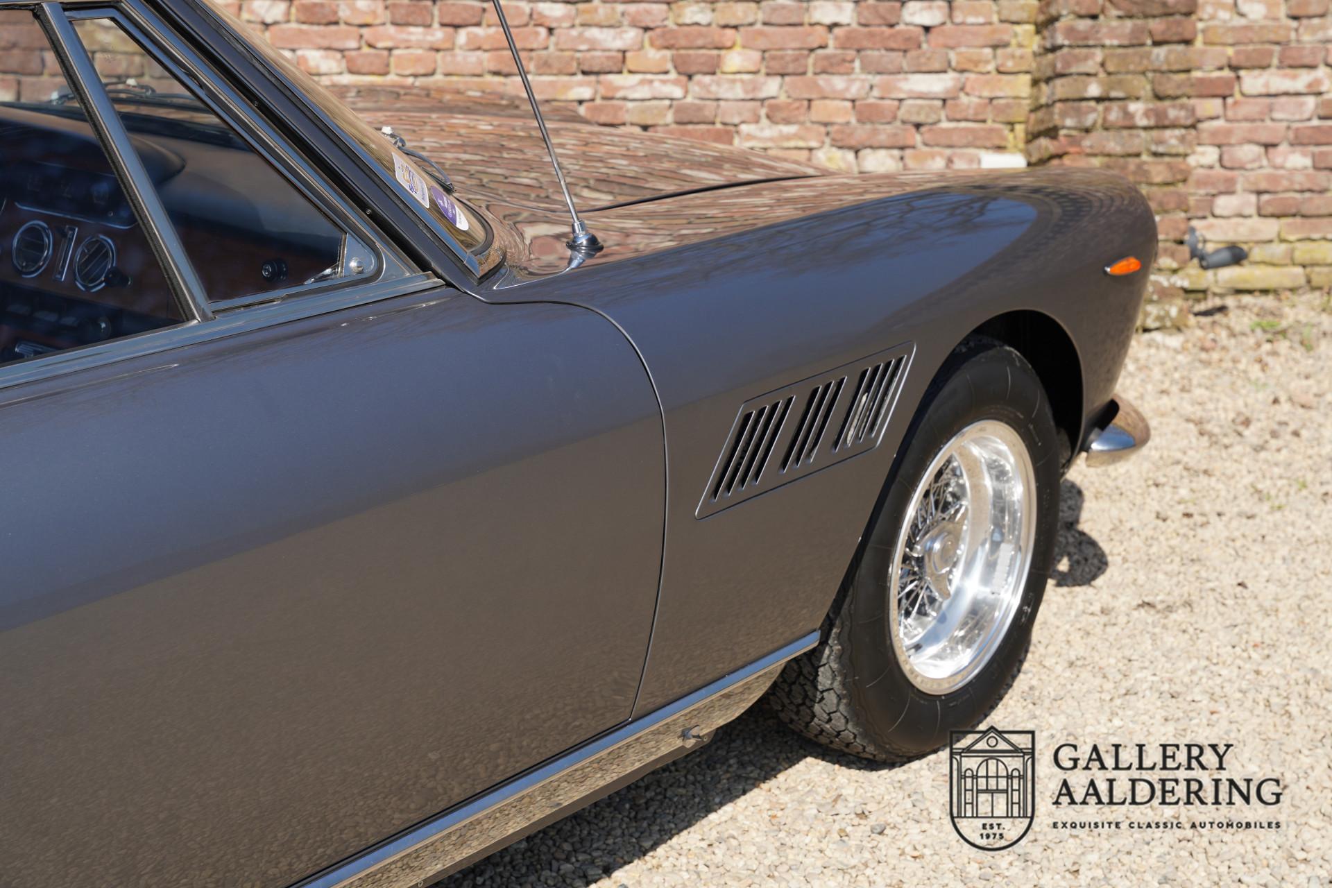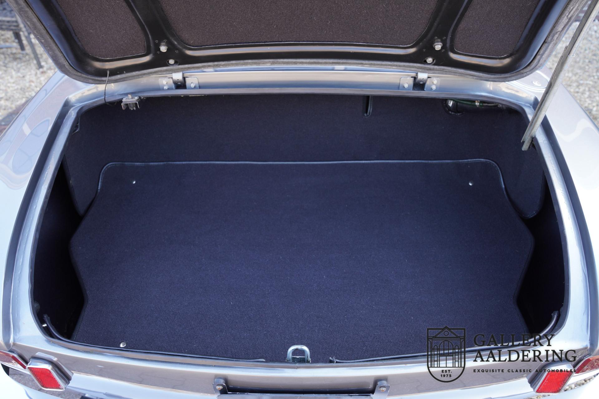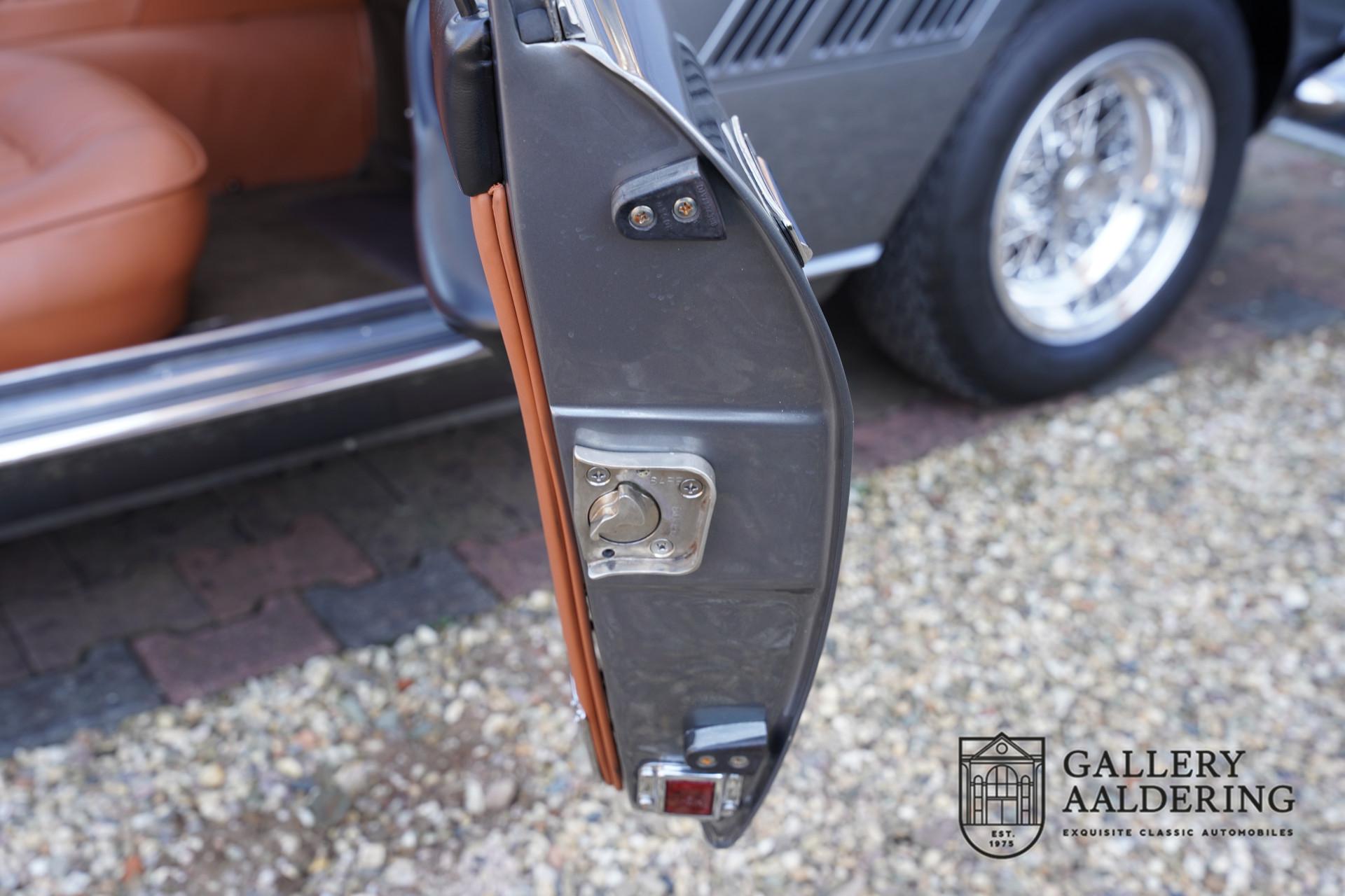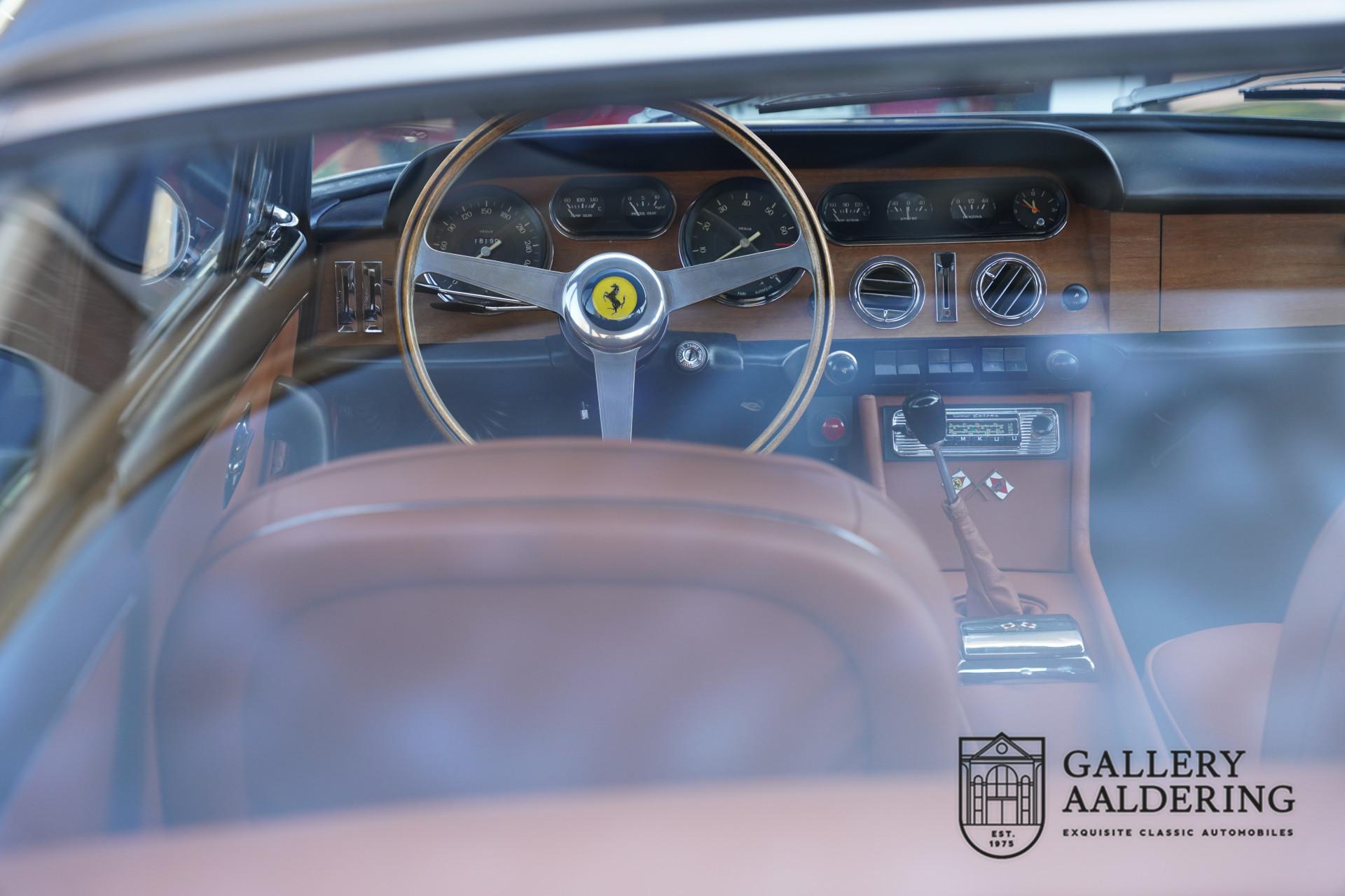 The interior was completely restored at the same time as the rest of the car. No expense has been spared to give the interior of the Ferrari the right look. Incidentally, the natural-colored leather is again the same color as how the car was delivered to the first owner in 1965. The carpets, door panels and other parts have also been beautifully restored, creating a wonderful atmosphere in the interior. Naturally, all controls and meters function perfectly.