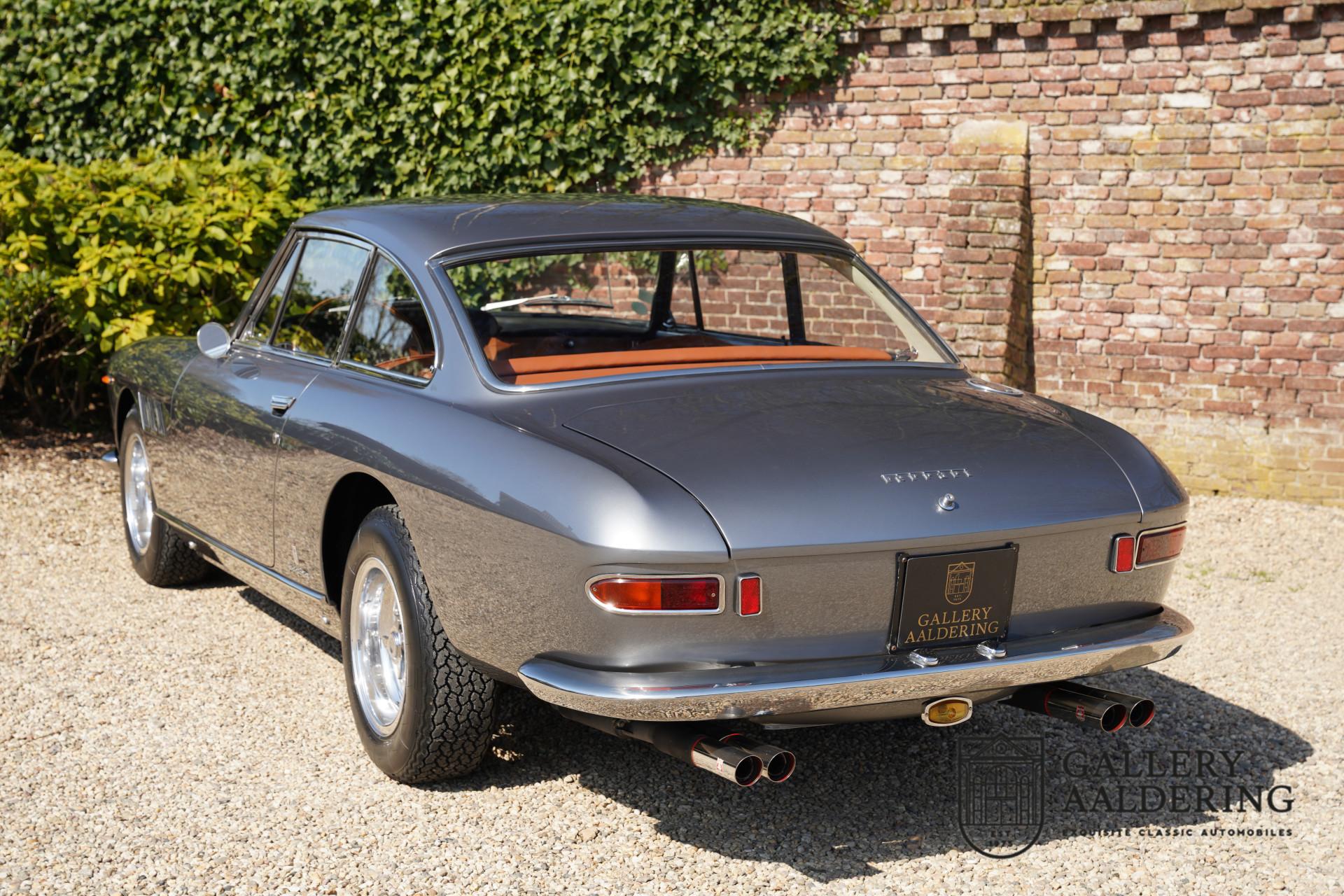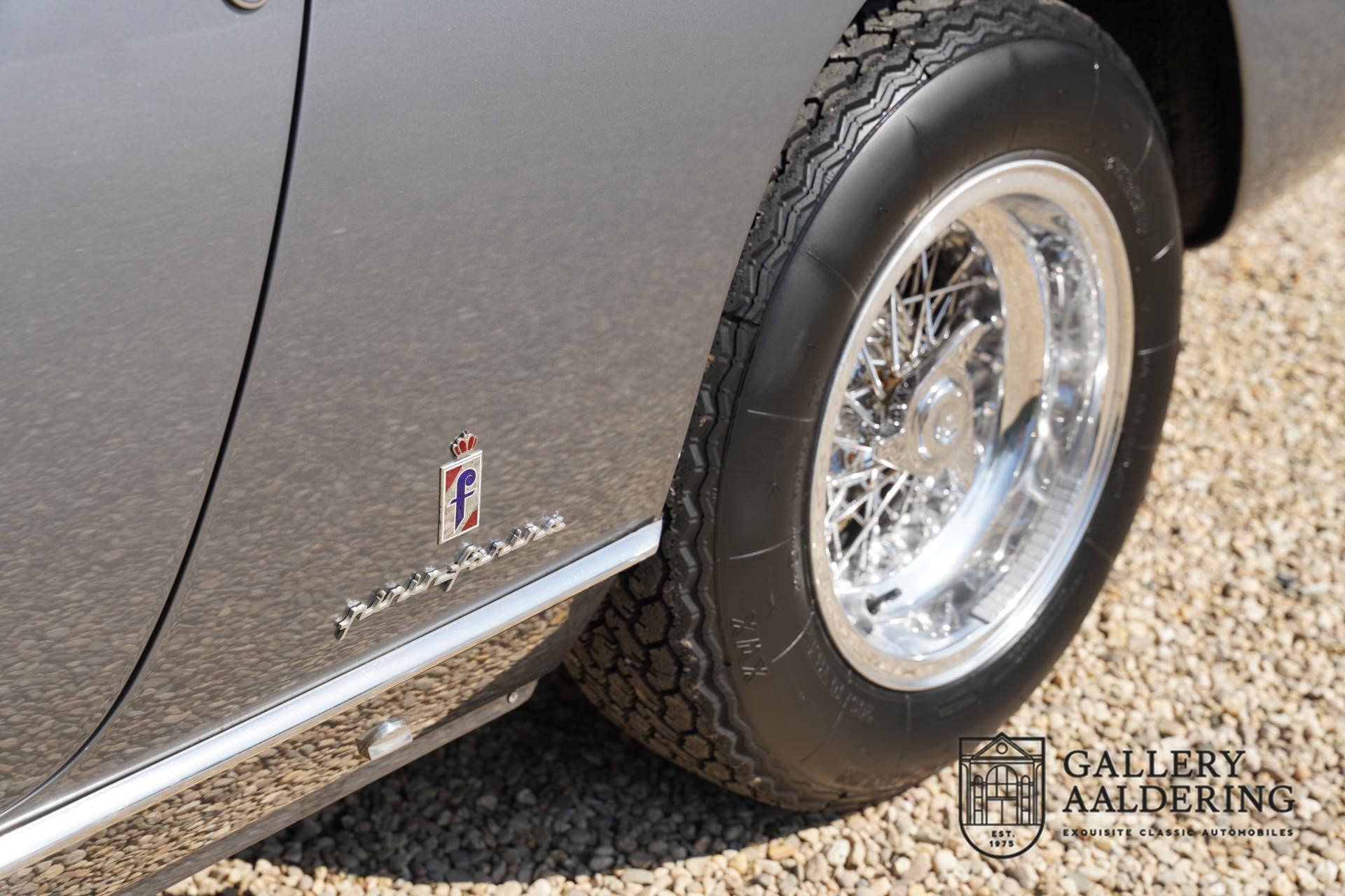 The stylish gray 330 GT you see here dates from 1965. 'Grigio Fumo' not only looks great on the Ferrari, it is also the color in which the car left the factory. The body is in a beautifully restored condition with beautiful panel fittings and beautiful even seams between the sheet metal. The paintwork is in excellent condition and the same applies to chrome parts, as well as rubbers, windows and lighting parts. The beloved Borrani wheels are also very beautiful.