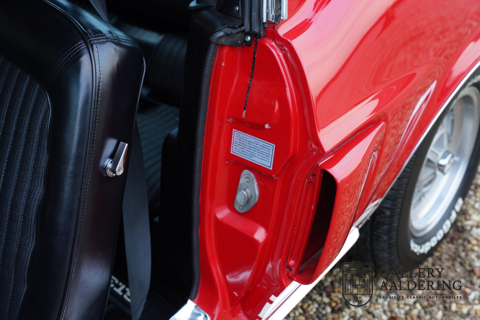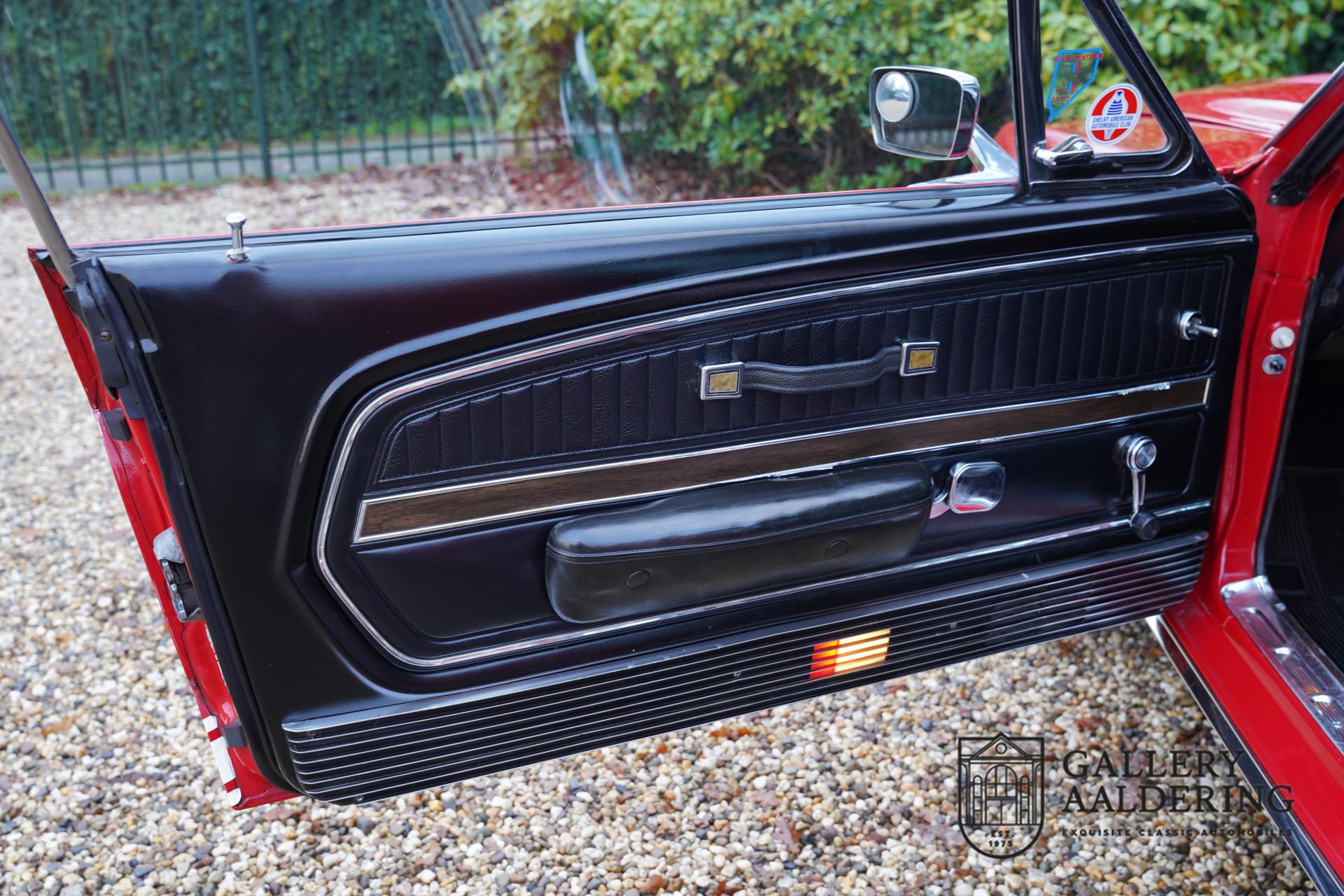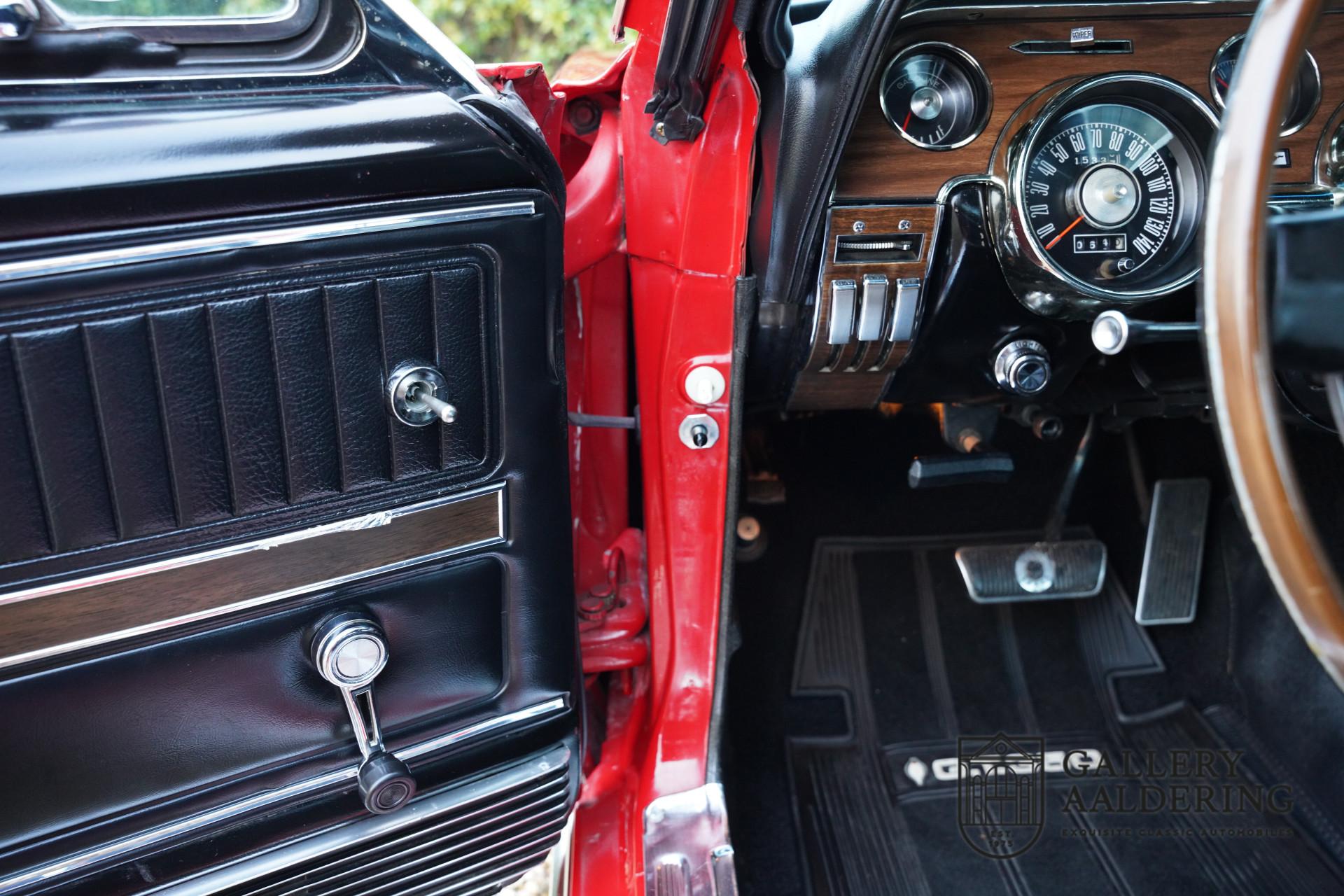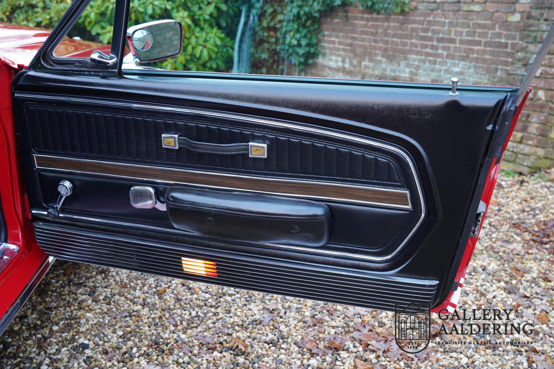 The example offered here, a stunning red 1968 Shelby GT350, is the ultimate specimen in a fantastic color scheme and in excellent condition. Painted in the eye-catching and classic Candy Apple Red and adorned with original Cobra logos, this car exudes both pure power and elegance. The bodywork has been perfectly restored, featuring the signature Shelby details such as the lightweight hood with air vents, the optional ten-spoke wheels, and the original striping. The details are spot-on, ensuring that this example has the correct appearance, which is so important for a car of this caliber.