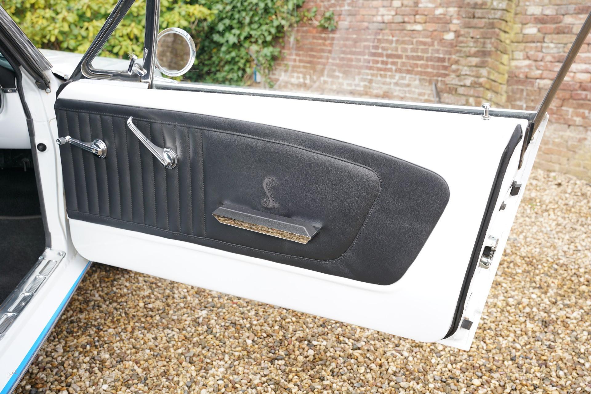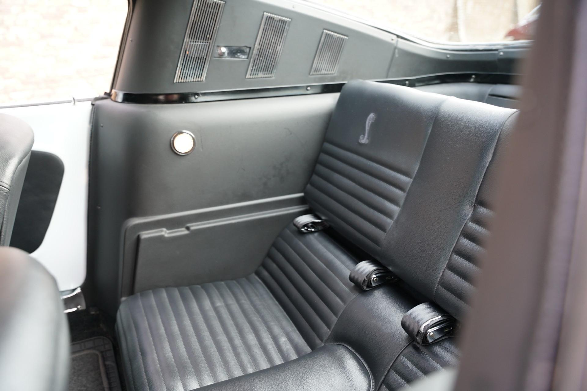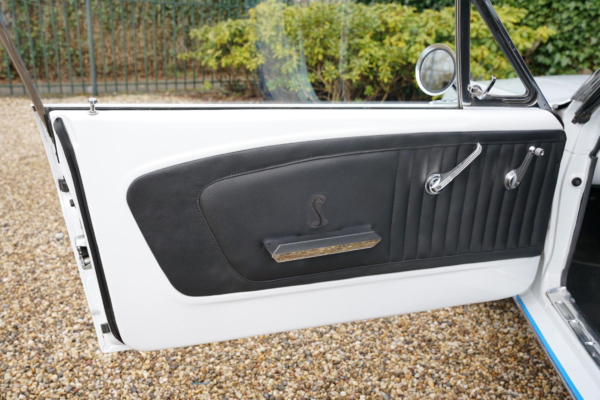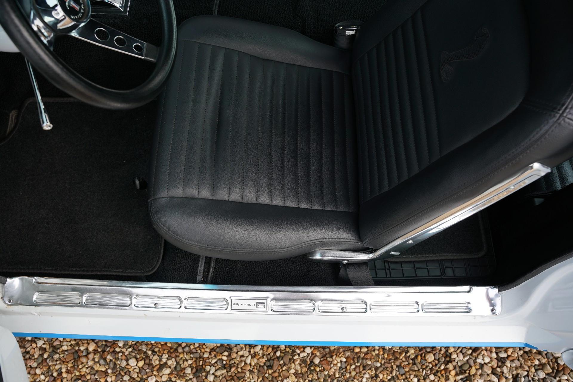 The interior has been completely reupholstered and is in new condition. The seats are upholstered in black leather. It is also striking that the seats are embroidered with the Cobra logo, a nice reference to the faster versions that were produced by Caroll Shelby. The car is of course equipped with new carpets that are also in new condition and fit perfectly everywhere. The instruments and controls all function as they should and also look beautiful. The dashboard is neatly cared for and the top has also been reupholstered. It forms a beautiful whole with a very nice appearance. The door panels have also been completely reupholstered and look beautiful.