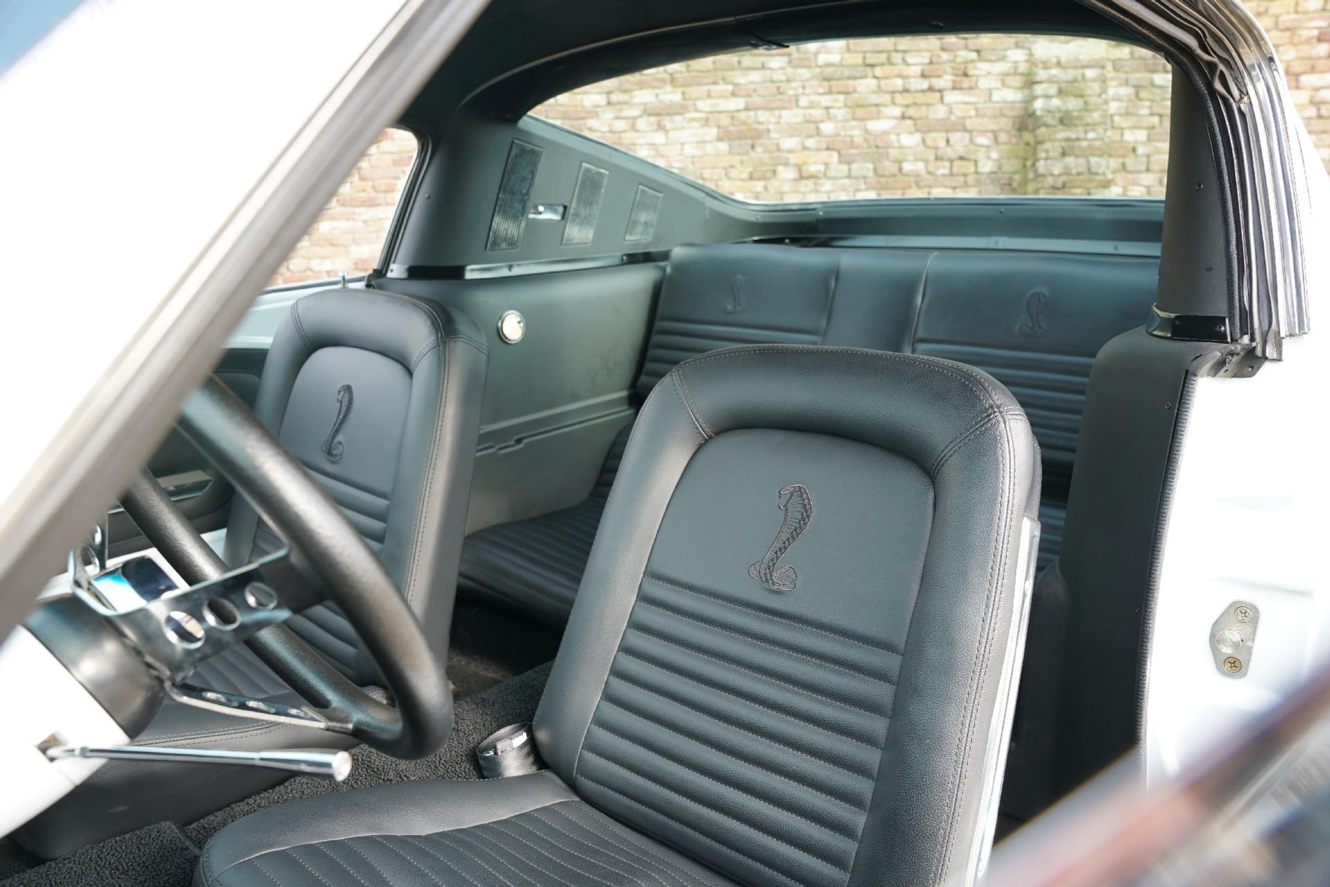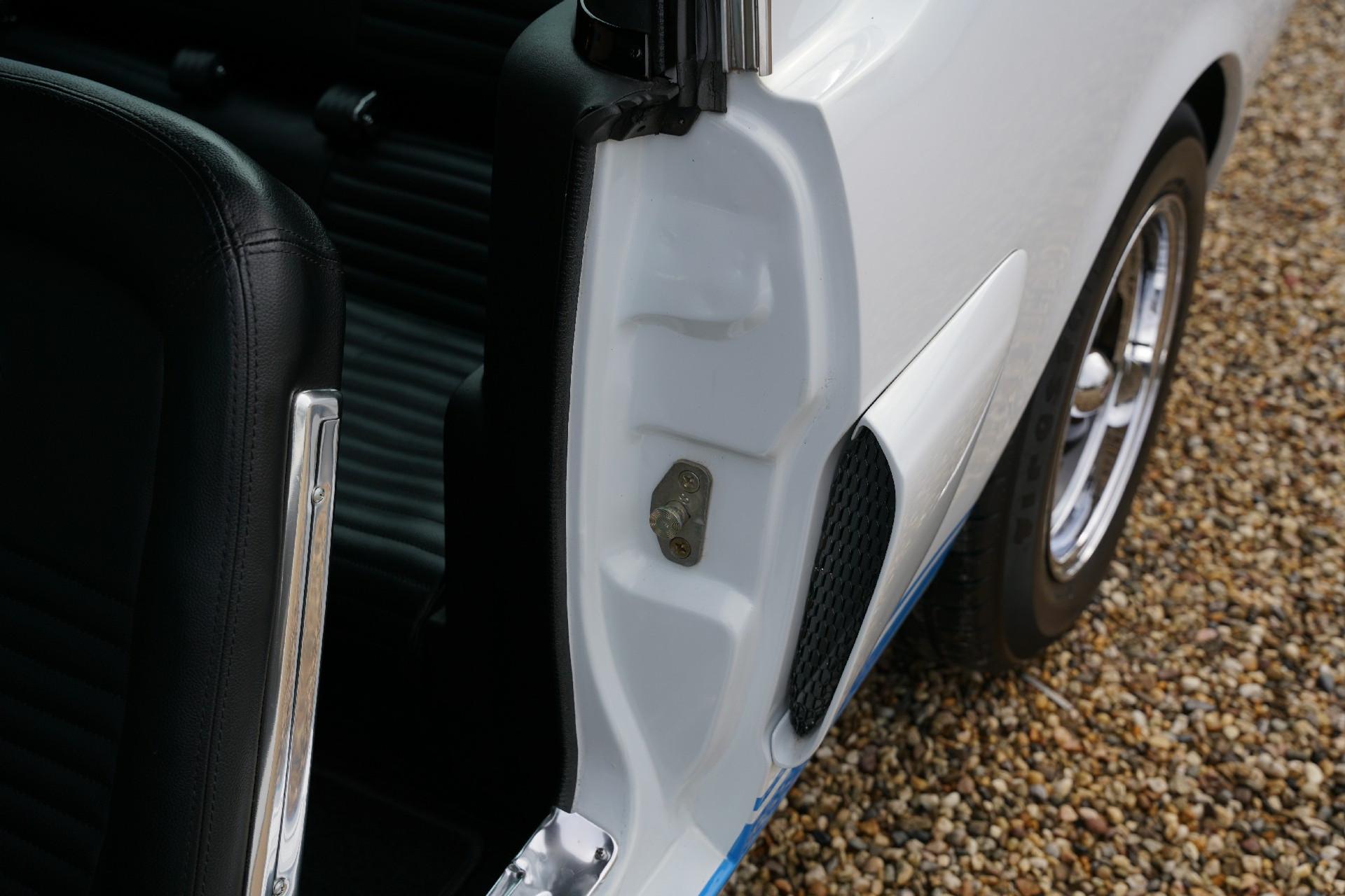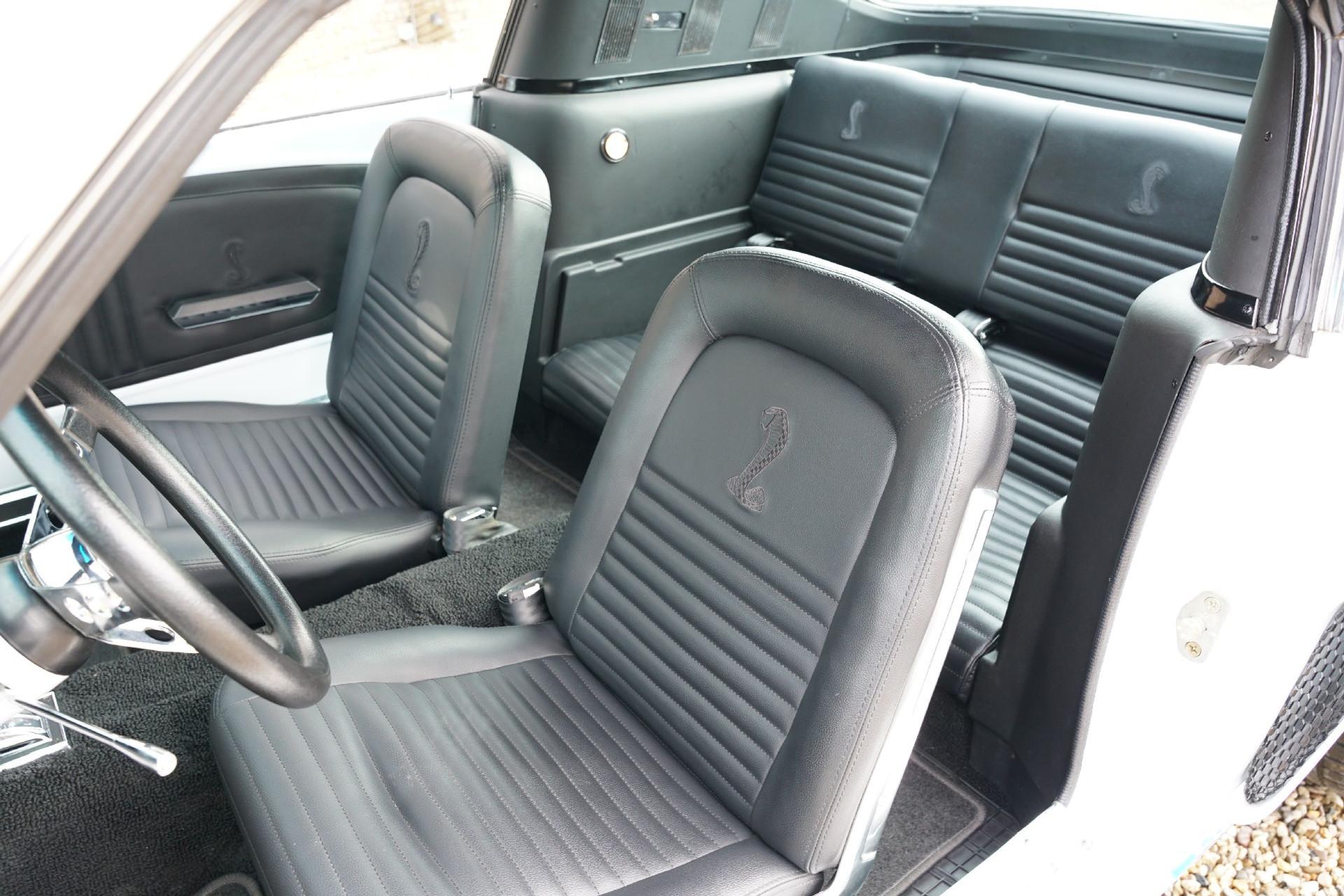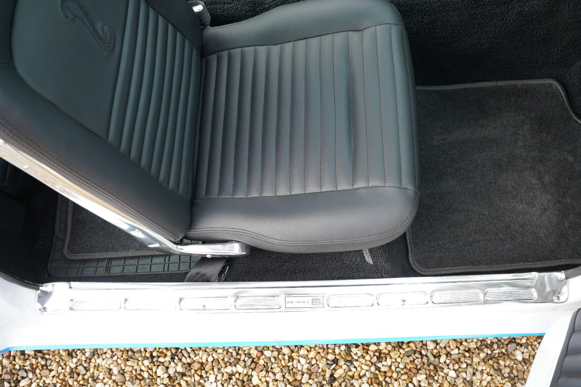 The interior has been completely reupholstered and is in new condition. The seats are upholstered in black leather. It is also striking that the seats are embroidered with the Cobra logo, a nice reference to the faster versions that were produced by Caroll Shelby. The car is of course equipped with new carpets that are also in new condition and fit perfectly everywhere. The instruments and controls all function as they should and also look beautiful. The dashboard is neatly cared for and the top has also been reupholstered. It forms a beautiful whole with a very nice appearance. The door panels have also been completely reupholstered and look beautiful.