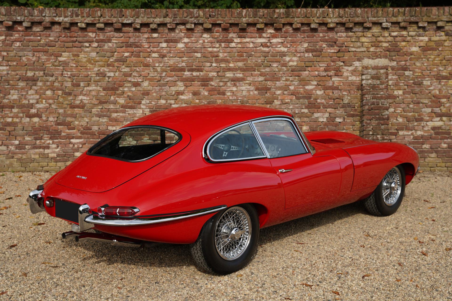 About fifteen years ago, this E-type was restored down to the smallest detail and to the highest level. The previous owner owned the car for a very long time. The E-type is finished in Carmen Red, over a black leather interior. Beautiful paintwork adorns the E-type, the bodywork of which is also in formidable condition under the paint. The fits are fantastic, doors and hinged parts close optimally. Literally beautiful chrome completes the exceptional condition of this car.
