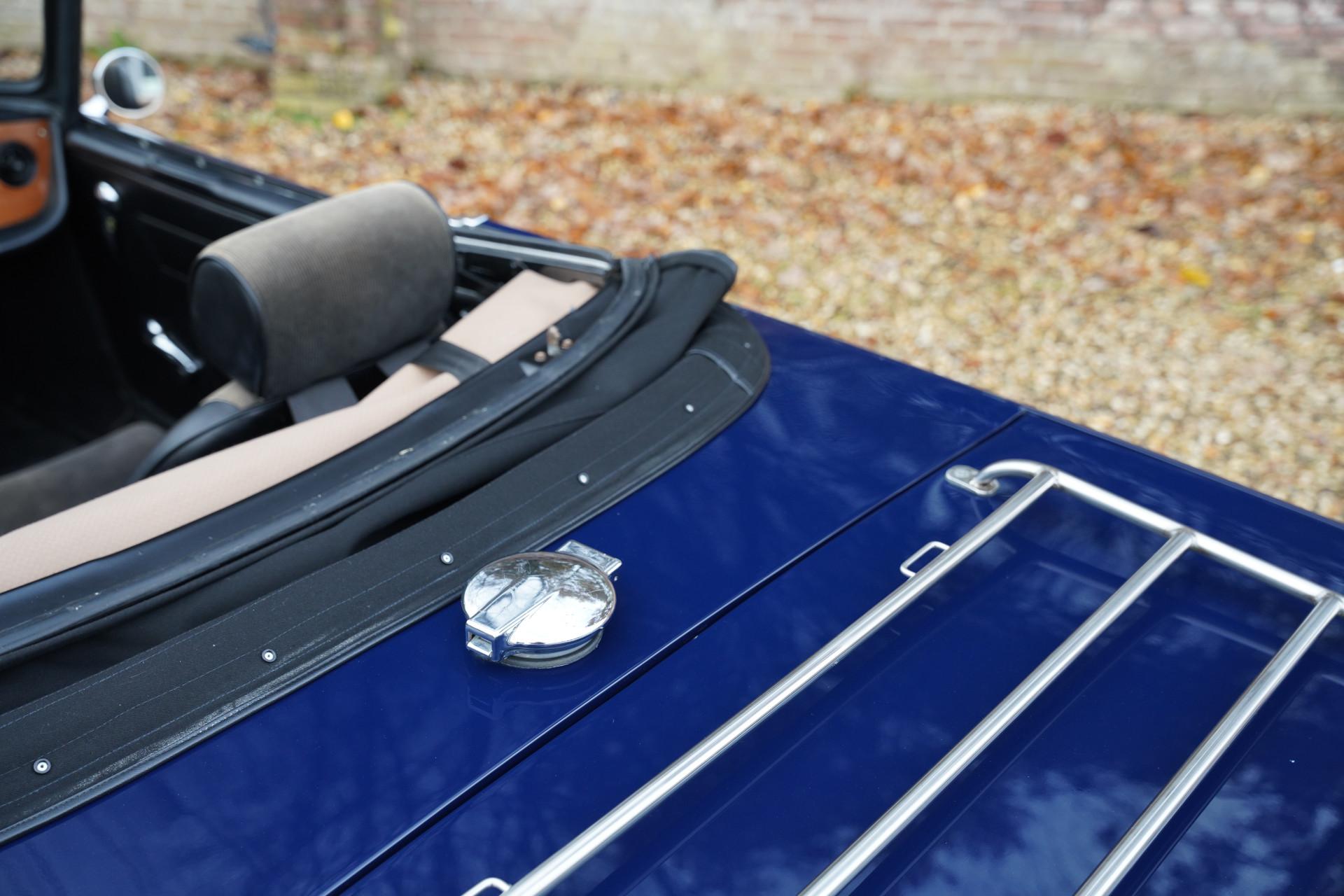 Inside there are very neat, lovely age-correct bucket seats upholstered in corduroy and vinyl. The wooden dashboard and the Smiths instruments are in a very fine state of maintenance. All instruments work as intended. We also should not forget to mention the particularly tidy Sonnenland hood.