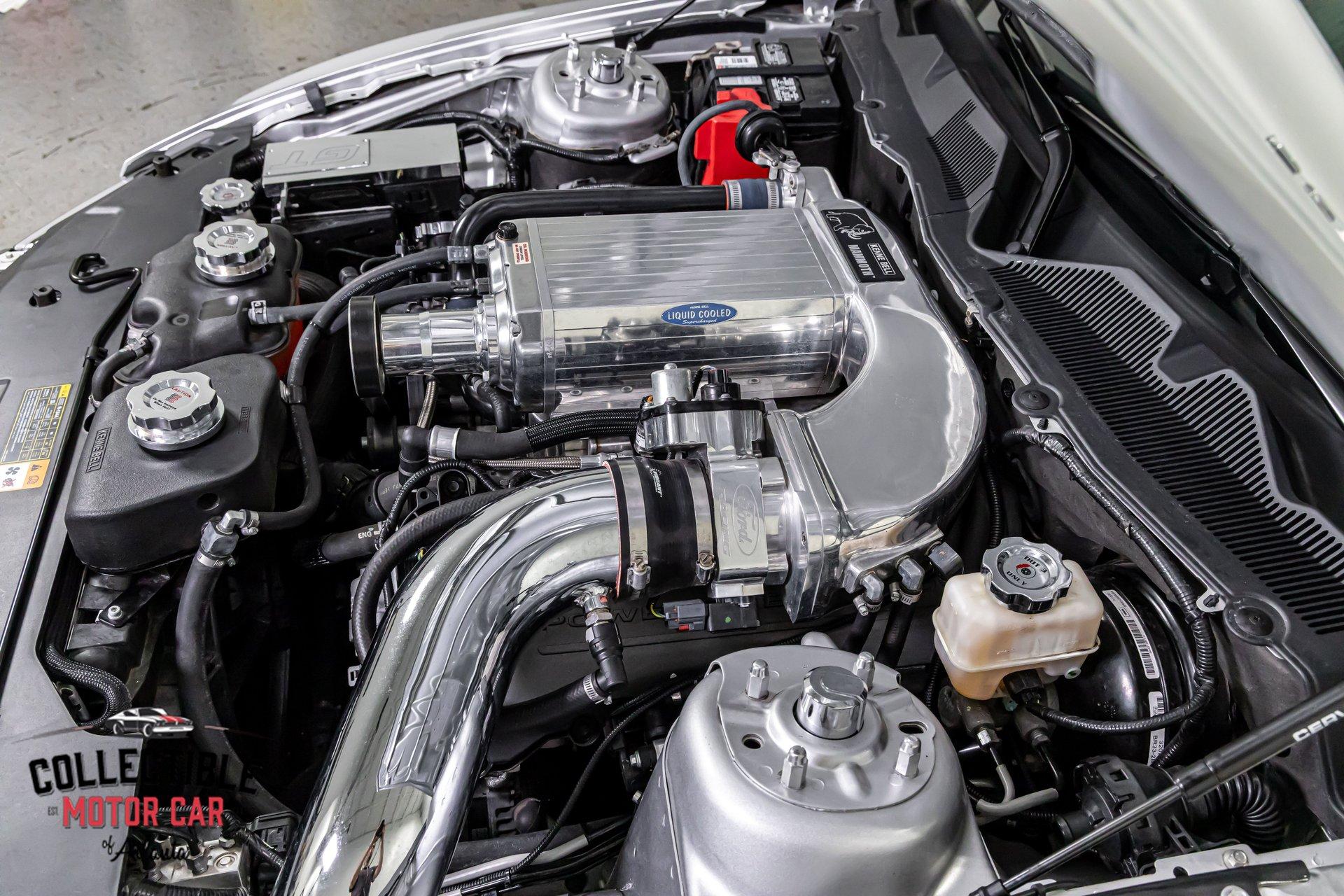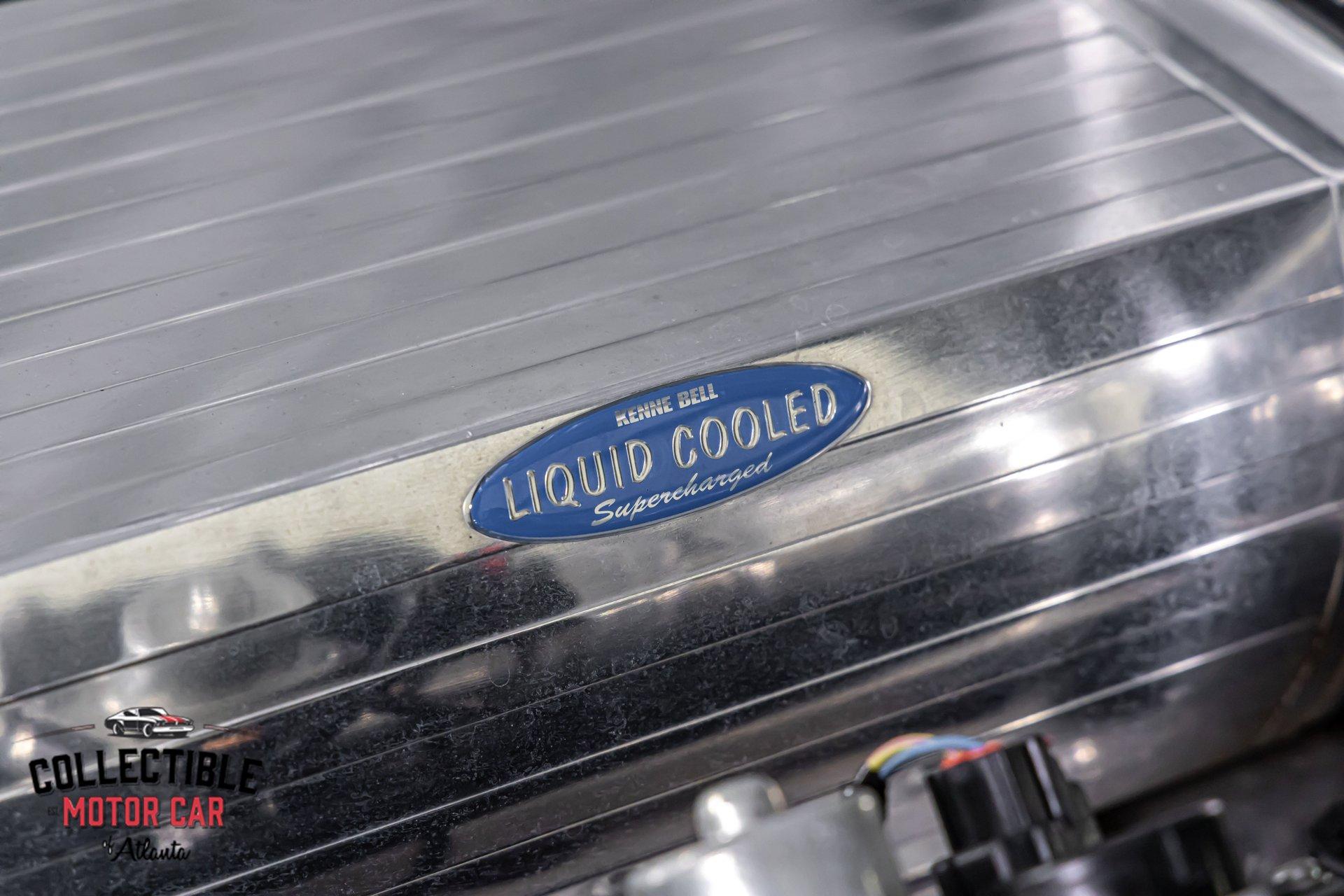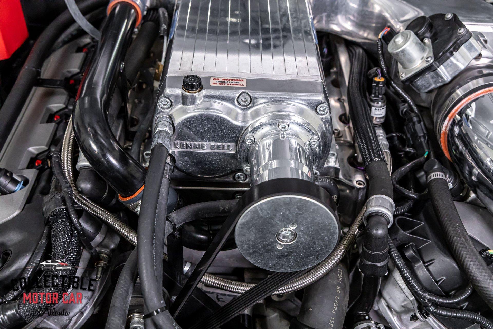Under the Cervinis ram-air hood sits the factory 5.0L Coyote V8, now topped with a polished, liquid-cooled Kenne Bell Mammoth 2.8L supercharger tuner kit and cool-air intake. Supporting hardware is exactly what you want to see on a properly engineered blown Coyote: