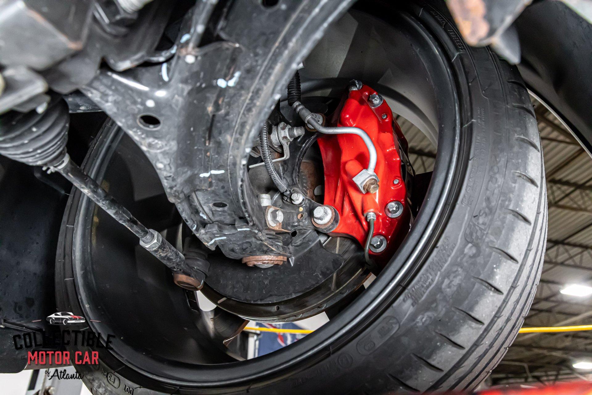 Visible behind the spokes are upgraded brakes with big red multi-piston calipers and drilled rotors, adding both stopping power and visual impact. The underside photos show a clean, tidy chassis with the exhaust, suspension, and driveline components in excellent condition.