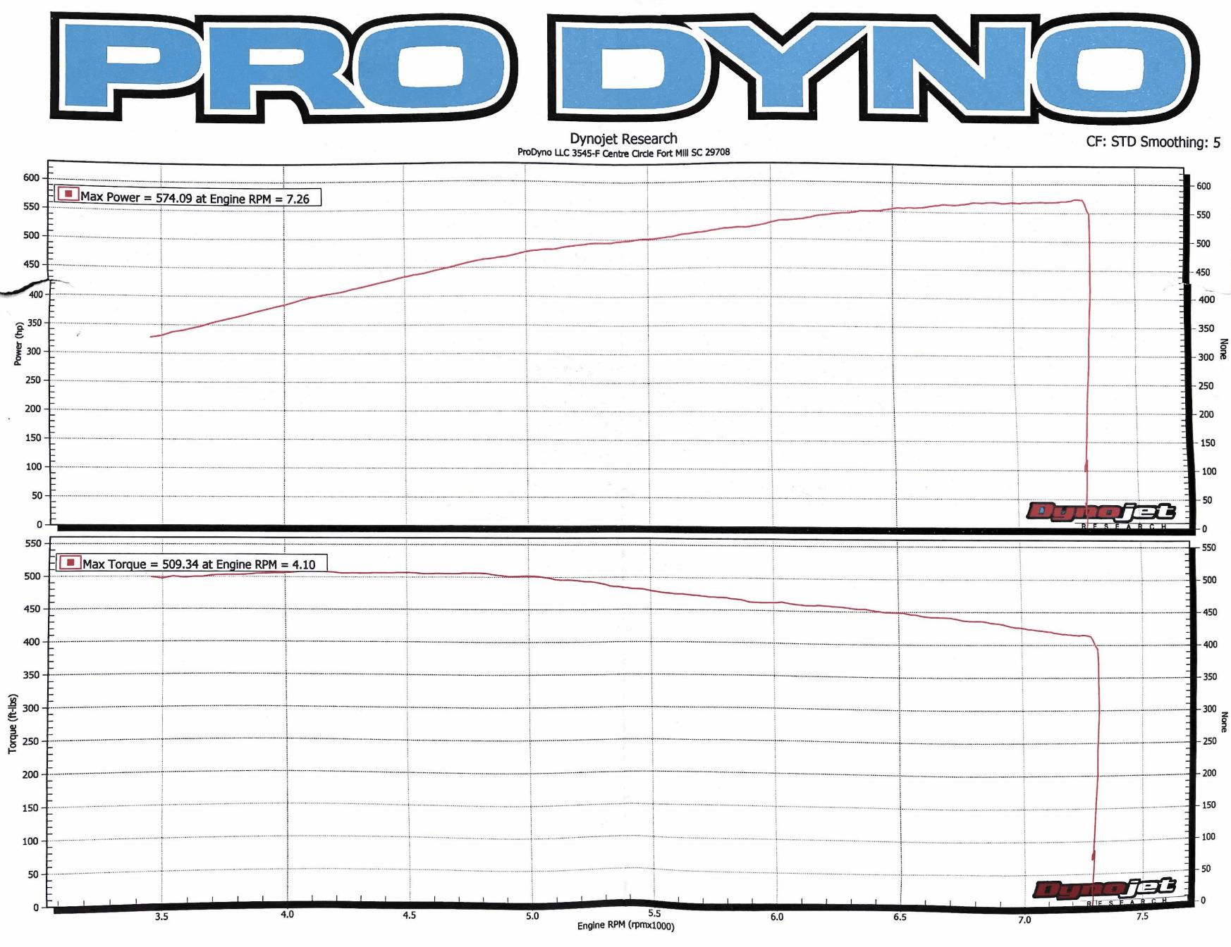 Dyno sheet documenting 574 RWHP and 509 lb-ft of torque