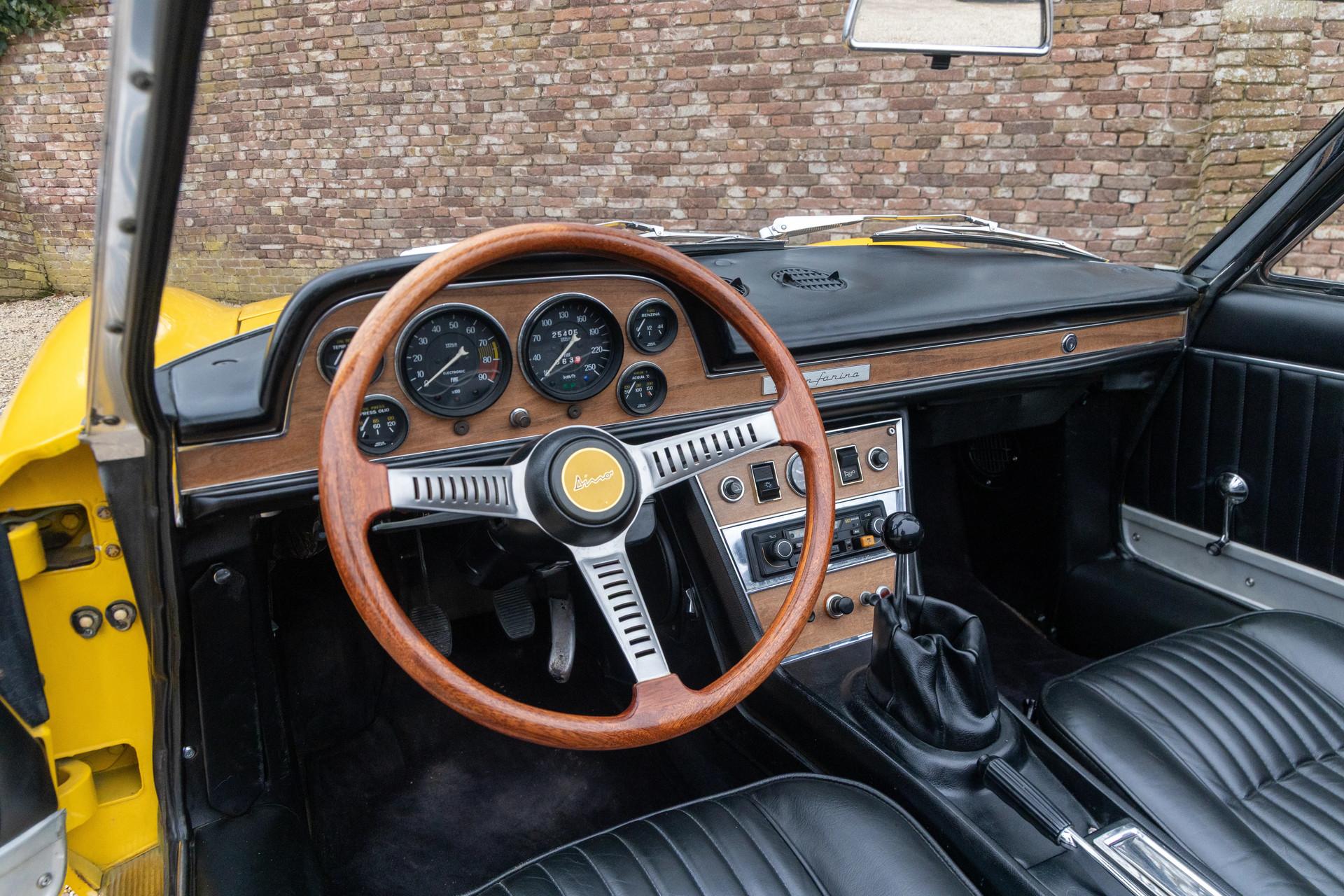 The design comes from Pininfarina and it shows immediately. A low nose, slender hips, a subtle crease along the flanks, and a stance that radiates tension even at rest. The color combination on this example, a distinctly period-correct late-1960s shade paired with a black interior, completes the picture. It's not loud, but it is unmistakably expressive. This is the kind of car people walk around more than once before getting in.